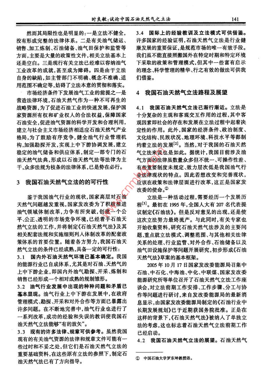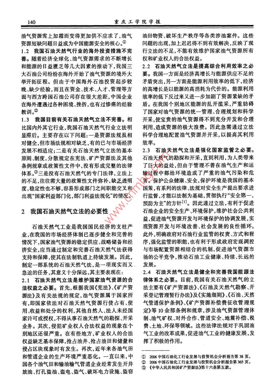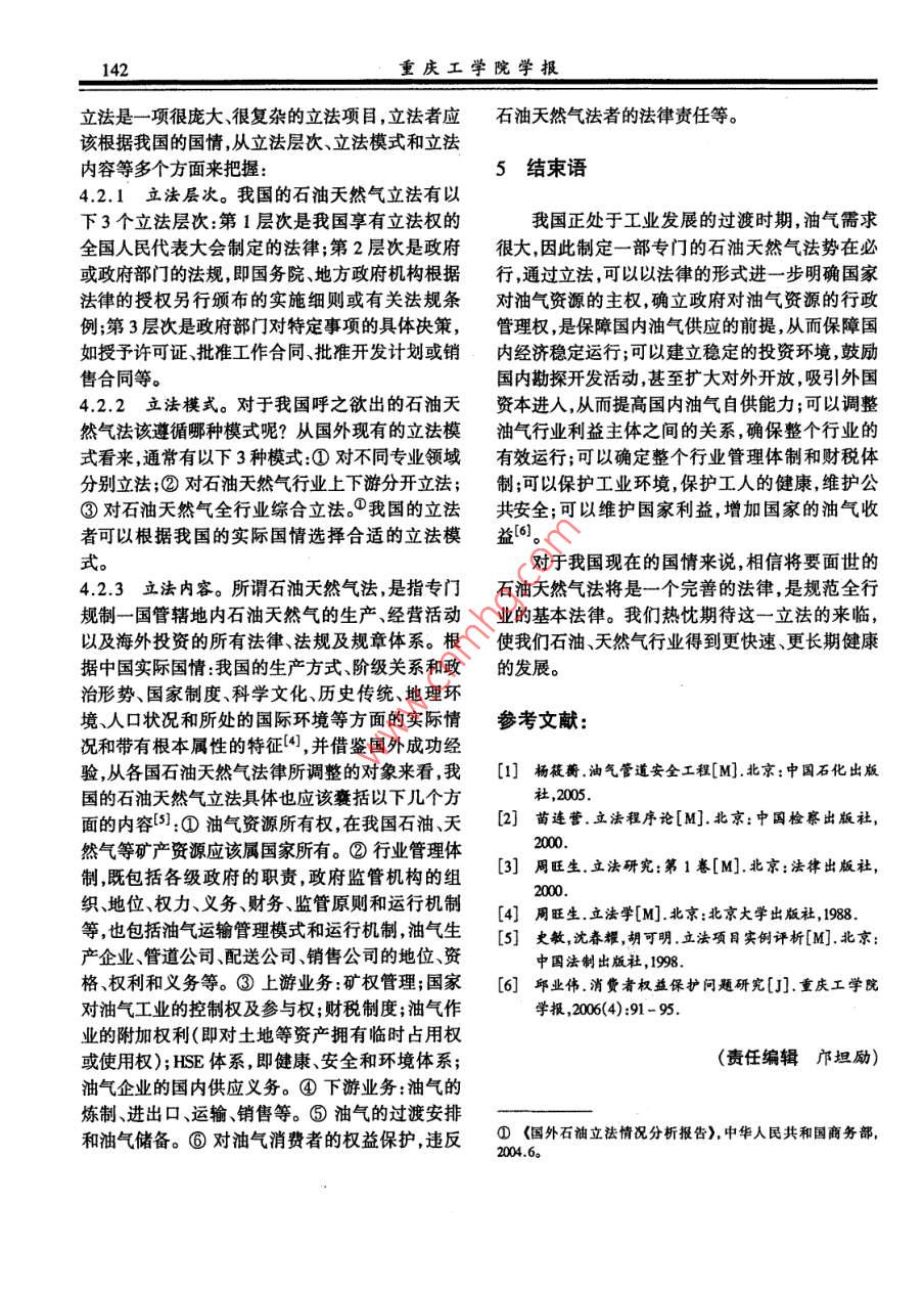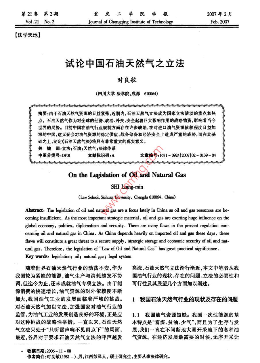 第21卷第2期重慶工學(xué)院學(xué)報(bào)2007年2月Vol 21 No. 2Joumal of Chongqing Institute of TechnologyFeb.2007【法學(xué)天地】試論中國(guó)石油天然氣之立法時(shí)良敏(四川大學(xué)法學(xué)院成都610064摘要:由于石油天然氣資源的日益緊張近期內(nèi),石油天然氣立法成為國(guó)家立法活動(dòng)的重點(diǎn)和熱點(diǎn)。石油天然氣作為對(duì)全球的經(jīng)濟(jì)政治外交、安全起著巨大影響作用的戰(zhàn)略物資影響著當(dāng)今世界的局勢(shì)。目前中國(guó)在油氣行業(yè)規(guī)制方面存在許多缺陷,在對(duì)進(jìn)口油氣資源依賴(lài)程度日益加深的中國(guó)這無(wú)疑會(huì)對(duì)油氣資源的穩(wěn)定供應(yīng)、戰(zhàn)備儲(chǔ)備和經(jīng)濟(jì)安全上造成嚴(yán)重的威脅,而在此基礎(chǔ)之上,制定《石油天然氣法》將具有非常重大的現(xiàn)實(shí)意義。關(guān)鍵詞:立法;石油;天然氣;法律體系中圖分類(lèi)號(hào):DF0l文獻(xiàn)標(biāo)識(shí)碼:A文章編號(hào):1671-0924(2007)02-0139-04On the Legislation of Oil and Natural GasSHI Liang-minLaw School, Sichuan University, Chengdu 610064, China)Abstract: The legislation of oil and natural gas are a focus lately in China as oil and gas resources are becoming insufficient. As the most important strategic material, oil and gas are exerting huge influence on theglobal economy, politics, diplomatism and security. There are many flaws in the present regon con-ceming oil and natural gas in China. As China depends heavily on imported oil and gas these days, theseflaws will constitute a great threat to a secure supply, strategic storage and economic security of oil and natral gas. Therefore, the legislation of"Law of Oil and Natural Gas" has great practical significanceKey words: legislation; oil; natural gas; legal system隨著世界石油天然氣行業(yè)的動(dòng)蕩不安,作為高漲,石油天然氣立法漸行漸近,本文中筆者從我我國(guó)較為緊缺的能源,油氣生產(chǎn)與消耗越發(fā)不協(xié)國(guó)油氣行業(yè)的現(xiàn)狀存在的問(wèn)題、立法的必要性和調(diào)但迄今為止,還未成就油氣專(zhuān)項(xiàng)立法。由于能可行性及其展望幾個(gè)方面加以闡述。源消費(fèi)的快速增長(zhǎng),油氣資源的對(duì)外依賴(lài)度不斷加大,我國(guó)油氣工業(yè)的發(fā)展面臨著嚴(yán)峻的挑戰(zhàn)。1我國(guó)石油天然氣行業(yè)的現(xiàn)狀及存在的問(wèn)題對(duì)石油天然氣加以立法,加強(qiáng)國(guó)家對(duì)油氣行業(yè)的監(jiān)管,為油氣工業(yè)的發(fā)展創(chuàng)造良好的環(huán)境正是應(yīng)1.1我國(guó)油氣資源短缺。我國(guó)一次性能源的基對(duì)這種挑戰(zhàn)的戰(zhàn)略性舉措。一直以來(lái),石油天然本特點(diǎn)是“富煤、貧油、少氣”,而且為了生存與發(fā)氣立法只處于“只聽(tīng)雷聲響不見(jiàn)雨點(diǎn)下”的局面,展我們一直在不間斷地大量開(kāi)采地下的各種油最近,各界對(duì)于要求石油天然氣立法的呼聲越發(fā)氣資源。在經(jīng)濟(jì)發(fā)展最需要的時(shí)候,無(wú)序開(kāi)采讓收稿日期:2006-11-0作者簡(jiǎn)介:時(shí)良敏(1981-)男江西彭澤人,碩士研究生,主要從事法律研究。重慶工學(xué)院學(xué)報(bào)油氣資源雪上加霜而變得更加供不應(yīng)求了,油氣油田物資、破壞生產(chǎn)秩序等各類(lèi)涉油案件。這些資源短缺問(wèn)題日益成為中國(guó)能源安全的核心問(wèn)題的出現(xiàn)加上遲遲得不到有效解決反映了現(xiàn)1.2我國(guó)石油天然氣行業(yè)的海外投資措施不完行立法的不足,不能有效維護(hù)國(guó)家油氣資源所有善。隨著經(jīng)濟(jì)全球化、油氣資源需求的不斷增長(zhǎng)權(quán)和礦業(yè)權(quán)人的合法權(quán)益和能源的日益匱乏等幾大因素的推動(dòng)下我國(guó)三2.,2石油天然氣立法是提高綜合利用效率之必大石油公司紛紛在海外開(kāi)始了油氣資源的境外大要。我國(guó)一方面是經(jīng)濟(jì)高增長(zhǎng)與能源供應(yīng)不足的舉開(kāi)拓征程。但由于中國(guó)海外石油投資起步較矛盾突出,另一方面是能源利用效率的低下,經(jīng)濟(jì)晚、缺少經(jīng)驗(yàn),而且在資金、技術(shù)、人才管理等方的高增長(zhǎng)是以能源的高消耗為代價(jià)的。能源利用面與西方跨國(guó)石油公司存在很大差距,中國(guó)企業(yè)效率的低下反過(guò)來(lái)又進(jìn)一步加劇了資源緊缺的矛在海外遭遇過(guò)各種困境、挫折,也有過(guò)慘痛的經(jīng)驗(yàn)盾。在我國(guó)個(gè)別地區(qū)能源的亂開(kāi)濫采,嚴(yán)重妨礙教訓(xùn)了國(guó)家對(duì)油氣資源的統(tǒng)一管理、合理規(guī)劃和科學(xué)1.3我國(guó)目前有關(guān)石油天然氣立法不完善。相開(kāi)采,使寶貴的油氣資源得不到充分開(kāi)發(fā)和合理比國(guó)內(nèi)外其它行業(yè),我國(guó)石油天然氣行業(yè)立法明利用造成資源的極大浪費(fèi)。因此急需通過(guò)立法顯滯后。主要存在以下問(wèn)題:一是資源法規(guī)雖相科學(xué)合理地配置油氣資源并開(kāi)采,以提高其利用對(duì)健全,但市場(chǎng)法規(guī)相對(duì)缺乏,有的已與市場(chǎng)經(jīng)濟(jì)效率。發(fā)展不相適應(yīng);二是有關(guān)石油天然氣立法的基本2.、3石油天然氣立法是強(qiáng)化國(guó)家監(jiān)管之必要。原則制度,分散規(guī)定在憲法、礦產(chǎn)資源法及其他石