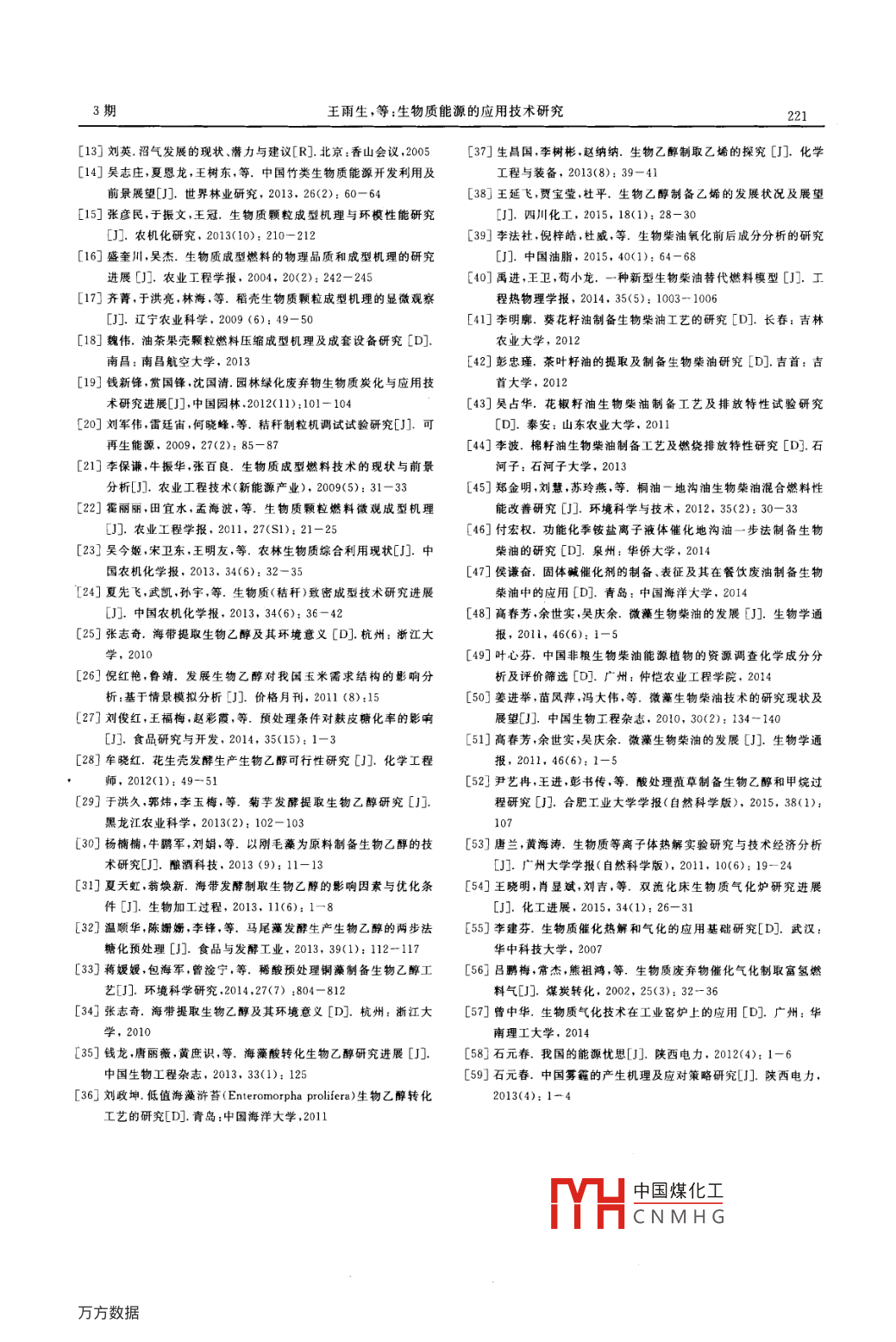 青島農(nóng)業(yè)大學學報(自然科學版)32(3):215~221,2015Journal of Qingdao Agricultural University(Natural Science)文章編號:1674-148X(2015)03-0215-07生物質(zhì)能源的應用技術(shù)研究王雨生,傅建祥(青島農(nóng)業(yè)大學學報編輯部,山東青島266109)摘要:化石能源的日益緊缺及其衍生的環(huán)境污染問題越來越嚴重。生物質(zhì)能源的開發(fā)和應用,以其可再生性和環(huán)保性,越來越受到人們的重視。就目前的應用現(xiàn)狀來看,其應用形態(tài),主要分為固態(tài)生物質(zhì)能源、液態(tài)生物質(zhì)能源和氣態(tài)生物質(zhì)能源三種。采用物理方法的生物質(zhì)固態(tài)成型技術(shù)的優(yōu)勢在于設(shè)備簡單,生產(chǎn)工藝簡便,利用方式簡潔,但也同樣存在著加工方式粗放,能源轉(zhuǎn)換效率低下等劣勢。液態(tài)生物質(zhì)能源能夠直接替代現(xiàn)在化石能源的可能性最大,但是它的生產(chǎn)工藝復雜,專業(yè)化集成度較高,推廣有一定的限制。氣態(tài)生物質(zhì)能源利用最廣泛,主要有氣化發(fā)電和農(nóng)用沼氣等方式。存在的主要利用瓶頸就是氣態(tài)生物質(zhì)當中含有多種雜質(zhì),去除雜質(zhì)的方法缺乏。經(jīng)過研究發(fā)現(xiàn),雖然生物質(zhì)能源的發(fā)展受到一些限制,但是隨著其利用技術(shù)的進步和現(xiàn)代經(jīng)濟社會的發(fā)展,生物質(zhì)能源的開發(fā)和利用前景很廣闊關(guān)鍵詞:固態(tài)生物質(zhì)能源;液態(tài)生物質(zhì)能源;氣態(tài)生物質(zhì)能源中圖分類號:TK6文獻標識碼:ADOI:10.3969/J.ISSN.1674-148X.2015.03.012Research on the application of biomass energyWANG Yusheng, Fu JianxiangEditorial Department of Journal of Qingdao Agricultural University, Qingdao 266109, China)Abstract: It was more and more serious for the increasingly shortage of fossil and its derivative of the environmental pollution. More attentions were paid on the development and application of biomass energy forits renewable and environmental protection. According to the current application status, the applicationforms of biomass energy could be divided into solid, liquid and gaseous. The advantages of solid biomassenergy produced by physical method were of simple equipments, processing technology and utility patternwhile the shortages were of low energy conversion efficiency and processing pattern. The fossil energy wasmost likely to be replaced by liquid biomass energy, while the application of the latter was limited for itcomplex processing pattern and high professional integration. Gaseous biomass energy was used mostwidely as gasification power generation and agricultural biogas. The main problem was that there weremany impurities in gaseous biomass energy and lack of impurities removing methods. According to the investigation, although the development of biomass energy is limited in some aspects, the prospects for ex-ploitation and utilization of biomass energy are great with the progress of the utility technology and development of modern economic society.Key words: solid biomass energy; liquid biomass energy; gaseous biomass energy隨著經(jīng)濟的迅速發(fā)展,人們對能源的依賴程度源。近百年來,全球各國不同程度的對化石能源進越來越高。但人們也越來越清醒的認識到,以煤、石行了過渡性開采,化石能源的枯竭已是遲早之事,已油、天然氣為主的化石能源儲量有限,是不可再生能不能滿足人類飛速發(fā)展的需求。而且化石能源的集收稿日期:2014-09-20基金項目:青島市農(nóng)村生物質(zhì)能源產(chǎn)業(yè)化發(fā)展現(xiàn)狀與對策(13-1-3-139-12-(3)-H中國煤化工作者簡介:王雨生(1979-),男,山東即墨人,碩士,講師,研究方向為生物質(zhì)能源的應用CNMHG通訊作者:傅建祥,E-mail:jxf2239@163.com216青島農(nóng)業(yè)大學學報(自然科學版)32卷中大量消耗,對人類居住的環(huán)境造成嚴重的污染,引先進的流化床反應器、循環(huán)流化床反應器、真空熱裂發(fā)全球氣溫升高,從而影響了生態(tài)環(huán)境。因此能源解反應器等生物質(zhì)制備設(shè)備。3-4美國在生物質(zhì)氣緊缺問題、環(huán)境污染問題已成為當今世界必須面對化發(fā)電方面處于世界領(lǐng)先地位,發(fā)電量已超過其利解決的重要問題,開發(fā)新的可再生綠色能源便成為用風能、太陽能、地熱能發(fā)電的總和。1980年,美各國面臨的重要課題。世界能源發(fā)展已進入新一輪國提出以生物柴油代替化石柴油戰(zhàn)略,2005年成為戰(zhàn)略調(diào)整期。生物質(zhì)能源是目前人類可利用綠色世界第一燃料乙醇生產(chǎn)大國。。巴西長期以來將推可再生能源之一,世界能源委員會將生物質(zhì)能源列廣乙醇燃料作為國家重要能源政策之一。美國和巴為可再生能源的首選。生物質(zhì)能源分布廣泛,幾乎西是世界上最大的燃料乙醇生產(chǎn)國。處處都有,各國對生物質(zhì)能源的開發(fā)與利用早已如1.2.2國內(nèi)研究現(xiàn)狀火如茶的展開了,有些技術(shù)已經(jīng)產(chǎn)業(yè)化我國生物質(zhì)直燃發(fā)電和氣化發(fā)電已逐步實現(xiàn)了產(chǎn)業(yè)化燃料乙醇技術(shù)正在起步應用,已建成燃料乙1生物質(zhì)能源概述醇示范廠;生物柴油技術(shù)已進入產(chǎn)業(yè)示范階段;大中1.1生物質(zhì)能源的生成機理型制氣工程工藝技術(shù)已日趨成熟。生物質(zhì)的直接、生物質(zhì)能源是地球上最普遍的一種可再生能間接液化生產(chǎn)液體燃料技術(shù)準備進行工業(yè)示范源,它