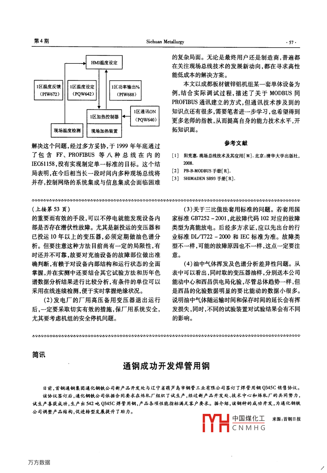第34卷第4期川冶金Vol 34 No 42012年8月Sichuan metallurgyAug.,2012文章編號(hào):1001-5108(2012)04-0054-04PROFIBUS與 MODBUS通訊應(yīng)用史劍(攀鋼集團(tuán)成都板材有限責(zé)任公司,四川成都610300)【摘要】本文以介紹攀鋼集團(tuán)成都板材連續(xù)熱鍍鋅鋁機(jī)組某一單體設(shè)備功能為引子,以實(shí)例重點(diǎn)介紹RROFIBUS與 MODBUS通訊協(xié)議的建立。【關(guān)鍵詞】熱鍍鋅鋁 PROFIBUS MODBUS【中圖分類號(hào)】TP273【文獻(xiàn)標(biāo)識(shí)碼】ATHE COMMUNICATION APPLICATION OF PROFIBUSBETWEEN MODBUSShi JiCold Strip Mill of PANZHIHUa iron STEEL Co., Chengdu 610300, Sichuan, ChiAbstract] This article introduced the device of continuous hot-dip galvanizing aluminum line, andbased on example PROFIBUS and MODBUS communicationKey words] hot-dip galvanizing aluminum, PROFIBUS, MODBUS1前言工處理環(huán)節(jié)多、全線張力控制嚴(yán)格、對(duì)生產(chǎn)的連續(xù)性要求高。成都板材連續(xù)熱鍍鋅鋁生產(chǎn)線按工藝可劃分為由于全線工藝復(fù)雜,其中焊機(jī)、糾偏裝置、鋅層入口段、清洗段、光整和拉矯段、出口段四大部分。測(cè)厚儀涂油機(jī)等單體設(shè)備均是由不同的公司單獨(dú)入口段分為上下兩通道交替運(yùn)行,以保證帶鋼在整設(shè)計(jì)及設(shè)備成套。絕大多數(shù)單體設(shè)備均采用同一種個(gè)機(jī)組的連續(xù)運(yùn)行,包括開(kāi)卷機(jī)焊機(jī)、張力輥、人口通訊協(xié)議,例如 PROFIBUS通訊協(xié)議其中某一套單活套等清洗段和光整拉矯段總稱為工藝段其作用體設(shè)備中采用兩種通訊協(xié)議,分別為 PROFIBUS和是對(duì)帶鋼進(jìn)行清洗退火涂鍍、光整、拉矯、表面涂 MODBUS協(xié)議,本文重點(diǎn)介紹如何將這兩種協(xié)議融層處理等,主要包括張力輥、電解清洗、立式退火爐合在同一設(shè)備中。鋅/鋅鋁鍋、氣刀、鍍后冷卻、光整機(jī)、拉矯機(jī)、臥/立式輥涂機(jī)、感應(yīng)加熱爐等;出口段同樣分為兩個(gè)通道2 PROFIBUS現(xiàn)場(chǎng)總線運(yùn)行,兩通道均迅速對(duì)帶鋼進(jìn)行卷取,保證生產(chǎn)的連PROFIBUS是一種國(guó)際化、開(kāi)放式、不依賴于設(shè)續(xù),主要包括出口活套、張力輥、卷取機(jī)等。整個(gè)熱備生產(chǎn)商的現(xiàn)場(chǎng)總線標(biāo)準(zhǔn)。廣泛適用于制造業(yè)自動(dòng)鍍鋅鋁機(jī)組的特點(diǎn)是生產(chǎn)線長(zhǎng)傳動(dòng)設(shè)備多帶鋼加化、流程工業(yè)自中國(guó)煤化工海其他領(lǐng)域CNMHG作者簡(jiǎn)介:史劍,男,現(xiàn)在成都板材從事熱鍍鋅鋁機(jī)組設(shè)備管理工作。第4期Sichuan Metallurgy55·自動(dòng)化。1996年3月15日批準(zhǔn)為歐洲標(biāo)準(zhǔn),PRO- MODBUS已經(jīng)成為國(guó)家標(biāo)準(zhǔn)GBT19582-2008。FIBUS產(chǎn)品在世界市場(chǎng)上已被普遍接受,市場(chǎng)份額MODBUS協(xié)議是應(yīng)用于電子控制器上的一種占?xì)W洲市場(chǎng)首位。通用語(yǔ)言。通過(guò)此協(xié)議,控制器相互之間、控制器經(jīng)PROFIBUS由三個(gè)兼容部分組成,即 PROFIBUS由網(wǎng)絡(luò)(例如以太網(wǎng))和其他設(shè)備之間可以通信。DP( Decentralized Periphery)、 PROFIBUS-PA它已經(jīng)成為一通用工業(yè)標(biāo)準(zhǔn)。有了它,不同廠商生( Process Automation)、 PROFIBUS-FMs( Fieldbus產(chǎn)的控制設(shè)備可以連成工業(yè)網(wǎng)絡(luò),進(jìn)行集中監(jiān)控。Message Specification)此協(xié)議定義了一個(gè)控制器能認(rèn)識(shí)使用的消息結(jié)構(gòu),其中此套單體設(shè)備主要采用 PROFIBUS-DP而不管它們是經(jīng)過(guò)何種網(wǎng)絡(luò)進(jìn)行通信的。它描述了的通信模式。 PROFIBUS-DP是一種高速低成本通控制器請(qǐng)求訪問(wèn)其他設(shè)備的過(guò)程,如何回應(yīng)來(lái)自其信,用于設(shè)備級(jí)控制系統(tǒng)與分散式LO的通信。他設(shè)備的請(qǐng)求,以及怎樣偵測(cè)錯(cuò)誤并記錄。它制定PROFIBUS提供了三種數(shù)據(jù)傳輸類型:了消息域格局和內(nèi)容的公共格式。(1)用于DP和FMS的RS485傳輸;當(dāng)在 MODBUS網(wǎng)絡(luò)上通信時(shí),此協(xié)議決定了每(2)用于PA的IEC1158-2傳輸個(gè)控制器需要知道它們的設(shè)備地址,識(shí)別按地址發(fā)(3)光纖。出來(lái)的消息,決定要產(chǎn)生何種行動(dòng)。如果需要回應(yīng),我們采用的是第一種數(shù)據(jù)傳輸類型,由于DP控制器將生產(chǎn)反饋信息并用 MODBUS協(xié)議發(fā)出與FMS系統(tǒng)使用了同樣的傳輸技術(shù)和統(tǒng)一的總線在其他網(wǎng)絡(luò)上,包含了 MODBUS協(xié)議的消息轉(zhuǎn)換為訪問(wèn)協(xié)議,因而,這兩套系統(tǒng)可在同一根電纜上同時(shí)在此網(wǎng)絡(luò)上使用的幀或包結(jié)構(gòu)。這種轉(zhuǎn)換也擴(kuò)展了操作。RS-485傳輸是 PROFIBUS最常用的一種傳根據(jù)具體的網(wǎng)絡(luò)解決節(jié)地址、路由路徑及錯(cuò)誤檢測(cè)輸技術(shù)。這種技術(shù)通常稱之為H2。采用的電纜是的方法。屏蔽雙絞銅線。其傳輸速率在9.6Kbi/s~12M4 PROFIBUS于 MODBUS建立通訊bit/s之間,每分段最多可接32個(gè)站(不帶中繼),當(dāng)分段站超過(guò)32個(gè)時(shí),必須使用中繼器用以連接各總41系統(tǒng)設(shè)備線段串聯(lián)的中繼器一般不超過(guò)3個(gè),如圖1所示。本套單體設(shè)備共分為四個(gè)區(qū),每個(gè)區(qū)設(shè)溫度表(