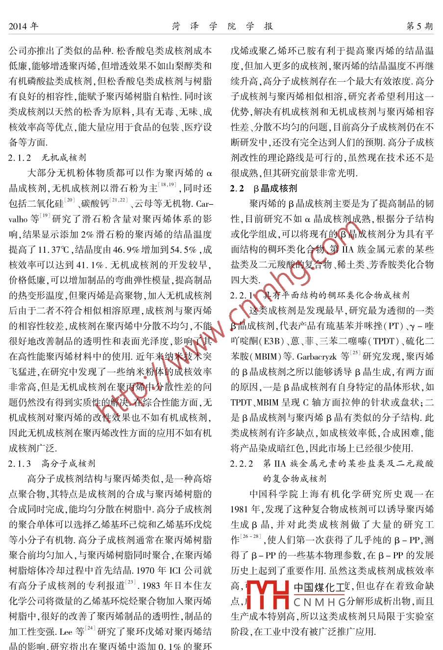 第36卷第5期菏澤學(xué)院學(xué)報(bào)2014年10月Vol 36 No 5Journal of Heze UniversitOct.2014章編號(hào):1673-2103(2014)05-0044-05聚丙烯成核劑研究進(jìn)展李麗(菏澤學(xué)院化學(xué)化工系,山東菏澤274015)摘要:聚丙烯的改性在其實(shí)際生產(chǎn)應(yīng)用中有重要作用.在聚丙烯中添加成核劑可以改善聚丙烯的物理機(jī)械性能,達(dá)到聚丙烯改性的目的.介紹了聚丙烯成核劑的作用機(jī)理,以及聚丙烯的α晶成核劑和β晶成核劑的特點(diǎn)、作用效果及對(duì)聚丙烯性能的影響關(guān)鍵詞:聚丙烯;α晶成核劑;β晶成核劑中圖分類號(hào):TQ325.14文獻(xiàn)標(biāo)識(shí)碼:A基于聚丙烯成核劑的作用機(jī)理,要求聚丙烯的引言高性能成核劑必須具備如下的條件:1)成核劑能夠聚丙烯是主要的塑料品種之一,屬于半結(jié)晶樹均勻地分散在聚丙烯熔體中;2)聚丙烯成核劑的熔脂,具有良好的耐熱、耐化學(xué)藥品、易加工成型、機(jī)械點(diǎn)要比聚丙烯自身的熔點(diǎn)高;3)聚丙烯成核劑在聚性能好等優(yōu)良特性,其結(jié)晶度、晶型及球晶的尺寸大丙烯的熔點(diǎn)溫度附近不發(fā)生分解,成核劑具有良好小都會(huì)直接影響到聚丙烯制品的使用性能目前,通的熱穩(wěn)定性;4)聚丙烯成核劑能夠吸附聚丙烯的鏈用塑料工程化進(jìn)程飛速發(fā)展,對(duì)聚丙烯制品的性能段,使聚丙烯能夠以成核劑作為晶核快速生長(zhǎng)要求越來越高,因此,作為高分子材料改性助劑的成成核劑的加人改變了聚丙烯的性能,使產(chǎn)品的核劑的作用就越來越重要.成核劑可以改善結(jié)晶速某些性能得到優(yōu)化,不僅可以改善產(chǎn)品的透明度、光率,細(xì)化晶粒,改變聚丙烯的微觀形態(tài),提高制品的潔度等外觀形貌,而且可以使產(chǎn)品更加耐熱,不發(fā)生抗沖擊性、透明性等,而使聚丙烯具有更多的特性和熱變形,抗沖擊強(qiáng)度提高,減少單位制品材料用量,功能,從而擴(kuò)大聚丙烯的應(yīng)用范圍節(jié)約生產(chǎn)成本.同時(shí),結(jié)晶溫度的升高,提高了成型1聚丙烯成核劑的作用機(jī)理及功能速度,縮短了加工時(shí)間,降低了操作成本,提高了材料的可加工性.成核劑是聚合物的改性助劑,能夠促進(jìn)結(jié)晶,在聚合物的結(jié)晶過程中起到晶核作用".在聚丙烯中聚丙烯成核劑的類別加入成核劑,加熱至熔融狀態(tài),成核劑在熔體中為聚聚丙烯樹脂結(jié)晶時(shí)可形成α、β、γ、δ和擬六方5丙烯結(jié)晶提供所需的晶核,使體系本身的均相成核種不同的晶型,其中常見的是聚丙烯的α和β晶型,變成異相成核,增加了體系內(nèi)晶核的數(shù)目,使生成的其余3種晶型不穩(wěn)定,日前沒有非常有效的方法獲球晶的高度均一,形成細(xì)小且致密的球晶顆粒成核得這3種晶型在本文中,依據(jù)成核劑誘導(dǎo)生成的聚劑的加入,改變了球晶的尺寸大小,使聚丙烯克服成丙烯的晶型的不同,著重介紹α晶成核劑、β晶成核核困難而在較高溫度下就可以成核,結(jié)晶速度快,生劑這兩種類型的成核劑成的球晶數(shù)目多,尺寸小,分布均勻球晶可以規(guī)整21中國(guó)煤化工地生長(zhǎng)CNMHG以誘導(dǎo)聚丙烯生成熱*收稿日期:2014-09-15作者簡(jiǎn)介:李麗(1987-),女,山東菏澤人,助教,碩士,研究方向:材料性能.2014年李麗:聚丙烯成核劑研究進(jìn)展第5期穩(wěn)定最好的α晶型晶體,聚丙烯的成核劑中α晶成散性很差,影響使用效果,所以使用前必須研磨.核劑研究較成熟,工業(yè)品種多.按照α晶成核劑自 Khanna等2研究發(fā)現(xiàn),這類成核劑在誘導(dǎo)聚丙烯身的化學(xué)結(jié)構(gòu)可分為有機(jī)成核劑、無機(jī)成核劑和高成核時(shí),聚丙烯的側(cè)甲基會(huì)排列在成核劑的苯環(huán)上分子成核劑聚丙烯分子鏈與苯環(huán)相互作用,聚丙烯在成核劑的2.1.1有機(jī)成核劑表面生長(zhǎng).近年來該類成核劑發(fā)展迅速,中國(guó)石油蘭1)山梨醇類成核劑州化工研究中心的LH001羧酸鹽類增剛型成核劑山梨醇類成核劑是通過醇醛縮合反應(yīng)制備的,和日本DC公司的MIK-122系列羧酸鋁鹽成核劑與聚丙烯有很好的相容性,且能明顯改善制品的透等對(duì)聚丙烯的增剛改性效果都非常顯著1明性、剛性、表面光澤度及其他熱力學(xué)性能.山梨醇3)有機(jī)磷酸鹽類成核劑類成核劑價(jià)格低廉,作為成核劑的成核效果非常好,有機(jī)磷酸鹽類成核劑是由相應(yīng)的取代苯酚或取是銷量最大、使用最廣泛的有機(jī)成核劑美國(guó) Millik-代雙酚與三氯氧磷反應(yīng),生成芳基磷酸酯的氯化物en公司經(jīng)過30多年的研究,開發(fā)出了三代山梨醇然后再經(jīng)水解、成鹽制備而成的.這類成核劑無味且類成核劑,三代產(chǎn)品的區(qū)別在于成核劑的取代基不熱穩(wěn)定性良好,與聚丙烯有良好相容性,可以提高聚同.它們分別是苯環(huán)上不帶取代基的二芐叉山梨醇丙烯的光學(xué)性能和物理機(jī)械性能,尤其是增剛效果(DBS,牌號(hào) Millad3905),苯環(huán)對(duì)位被基團(tuán)取代的二非常顯著.有機(jī)磷酸鹽類成核劑在20世紀(jì)80年代(對(duì)甲基苯亞甲基)山梨醇(MDBS,牌號(hào)初投放市場(chǎng),代表產(chǎn)品是日本旭電化公司開發(fā)的Mld3940)和苯環(huán)臨位被基團(tuán)取代的二(3,4-二NA系列芳基磷酸酯類成核劑,經(jīng)歷了雙(2,4-二甲基苯亞甲基)山梨醇( DMDBS,牌號