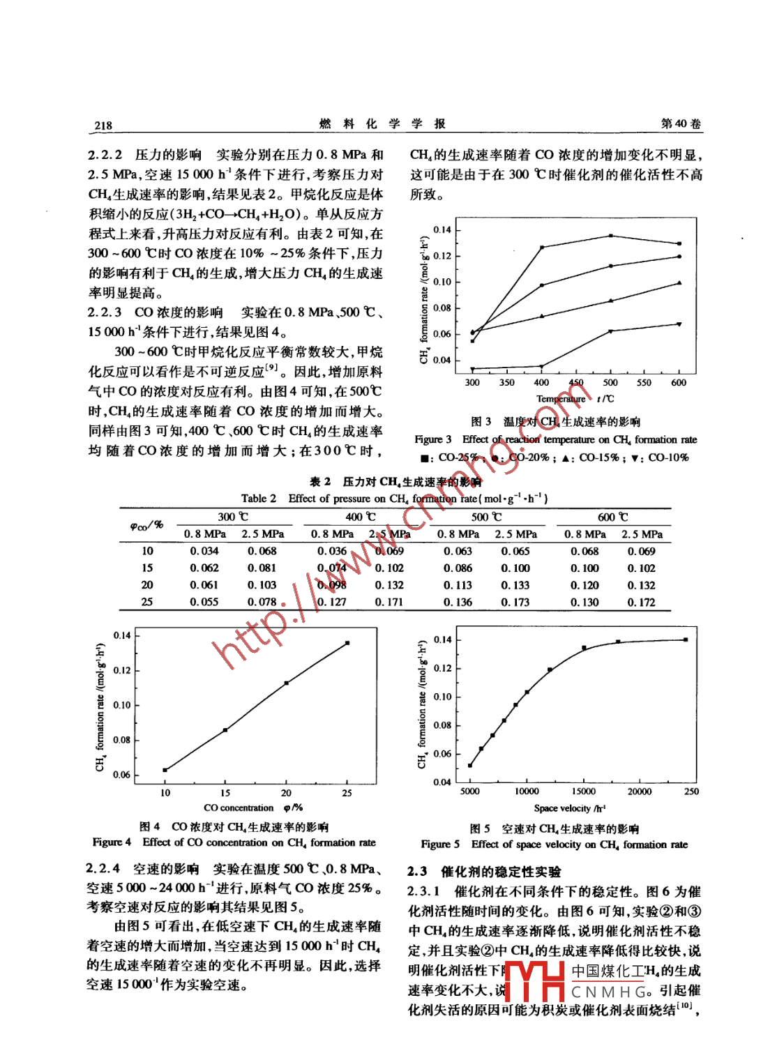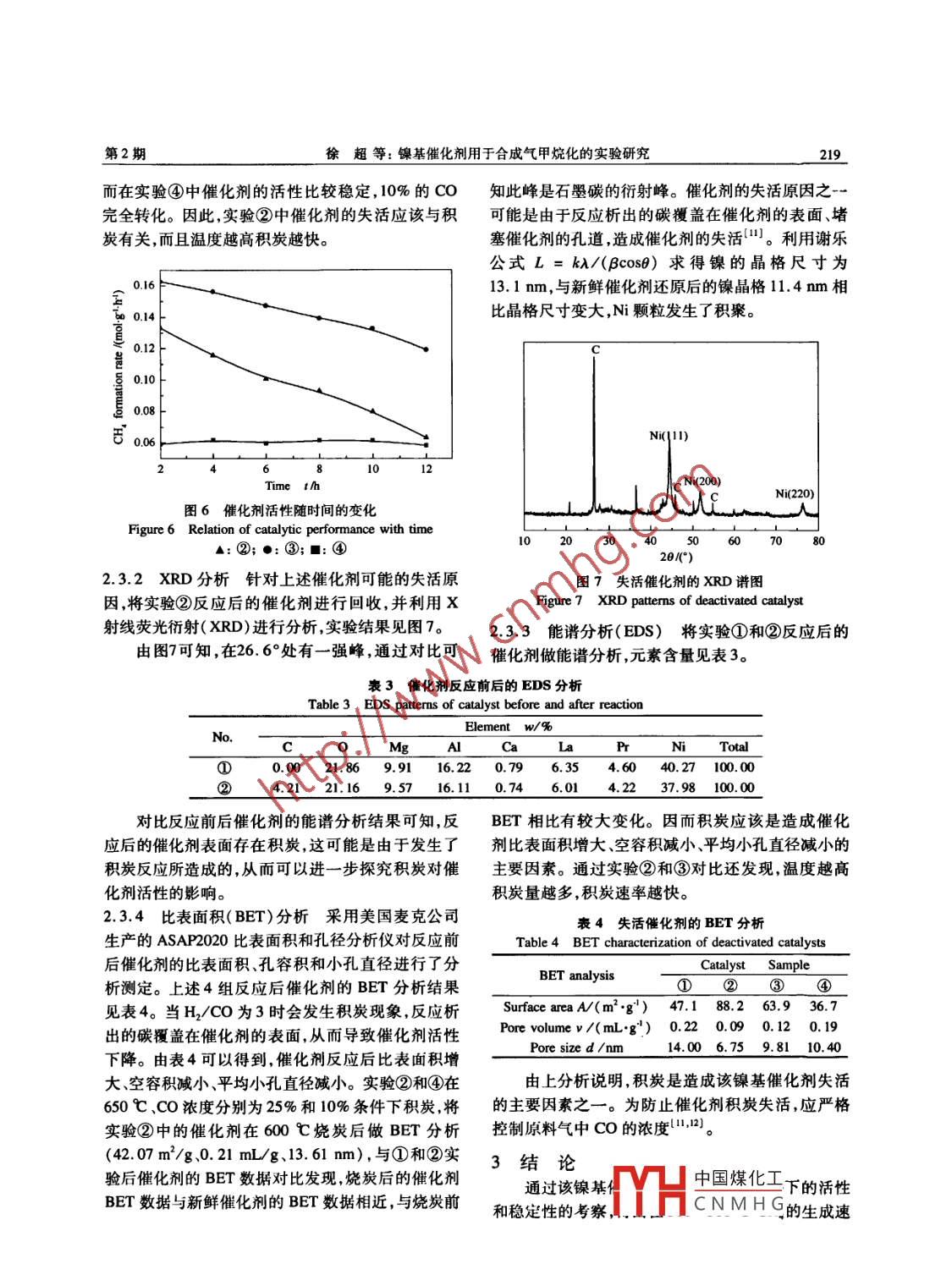 第40卷第2期燃料化學(xué)學(xué)報(bào)Vol, 40 No. 22012年2月Jourmal of Fuel Chemistry and technologyFeb.2012文章編號(hào):0253-2409(2012)02021605鎳基催化劑用于合成氣甲烷化的實(shí)驗(yàn)研究徐超,王興軍,胡賢輝,陳雪莉,王輔臣(華東理工大學(xué)煤氣化教育部重點(diǎn)實(shí)驗(yàn)室,上海200237)摘要:實(shí)驗(yàn)基于工業(yè)用鎳基甲烷化催化劑,分別考察了操作溫度、原料氣CO濃度、操作壓力、空速等對(duì)合成氣(CO濃度5%-25%)甲烷化反應(yīng)的影響,并分析∫造成催化劑失活的因素。結(jié)果表明,在300-500℃CH4的生成速率隨著溫度的升高、壓力的增大、CO濃度的增加而增大。但CO的濃度不能過(guò)高,當(dāng)H2CO≤3時(shí)催化劑的催化活性會(huì)逐步下降。通過(guò)XRD、EDS等分析結(jié)果得知催化劑表面存在積炭,催化劑的失活跟積炭有關(guān),通過(guò)進(jìn)一步的對(duì)照實(shí)驗(yàn)和BET分析表明,積炭的速率與反應(yīng)溫度有關(guān),溫度越高積炭速率越快關(guān)鍵詞:合成氣;甲烷化;鎳基催化劑中圖分類號(hào):TQ546文獻(xiàn)標(biāo)識(shí)碼:AStudy on the syngas methanation of nickel-based catalystXU Chao, WANG Xing-jun, HU Xian-hui, ChEn Xue-li, WANG Fu-chenKey Laboratory of Coal Gasification of Ministry of EducationEast China Universiry of Science and Technology, Shanghai 200237, ChinaAbstract: The experiment was conducted based on an industrial nickel-based catalyst. The effects of operatingtemperature, feed ratio, and operating pressure on the methanation and the factors for the catalyst deactivationwere investigated. The results indicate that the formation rate of CHa increases with operating temperaturepressure, and co concentration. But the concentration of Co can not be excessive, because the activity ofcatalyst will gradually decrease if H2/CO<3. The carbon deposit is found on the surface of deactivated catalystby X-Ray Diffraction(XRD)and Energy Dispersive Spectrometer(EDS )analyses. It can be concluded that thedeactivation of catalyst may be related to the surface carbon deposition. The bet surface area analysis shows thatthe rate of carbon deposition is related to the reaction temperature, and the higher the temperature, the faster thecokingKey words: syngas; methanation; nickel-based catalyst利用煤炭制備天然氣既符合中國(guó)“十一五”規(guī)鎳基催化劑容易積炭穩(wěn)定性差,尤其是在高劃綱要中的能源清潔利用要求,又能滿足日益增長(zhǎng)濃度CO的甲烷化反應(yīng)中會(huì)發(fā)生CH分解和CO歧的天然氣市場(chǎng)需求,還可作為中國(guó)能源結(jié)構(gòu)調(diào)整的化反應(yīng),生成的表面碳不能及時(shí)跟活性氫發(fā)生反應(yīng)一個(gè)重要方向。煤制天然氣主要有直接法和間而積聚后析出,析出的碳覆蓋在催化劑表面造成催接法12。間接法是先將煤氣化成合成氣(主要成分化劑的失活,文獻(xiàn)[6]提到一般在H2CO≤3CoH2)然后通過(guò)變換反應(yīng)和甲烷化反應(yīng)生成時(shí)鎳基催化劑就會(huì)積炭為此針對(duì)甲烷化反應(yīng)過(guò)程CH。對(duì)于間接法合成氣的甲烷化是整個(gè)工藝的關(guān)中催化劑的穩(wěn)定性進(jìn)行了考察。鍵,雖然甲烷化早已在工業(yè)上應(yīng)用,但多用于合成氨廠原料氫氣中少量CO(C濃度<5%)的脫除,對(duì)1實(shí)驗(yàn)部分于較高濃度CO(CO濃度>10%)甲烷化的研究比取自合成氨廠的鎳基甲烷化催化劑,為灰黑色較少,而且僅限于提高城市煤氣熱值的研究。本實(shí)圓柱體(q5×4~5mm),堆密度1.1-1.3g/mL,比驗(yàn)基于工業(yè)上鎳基甲烷化催化劑,對(duì)含高濃度CO表面積58m2/g,含鎳30%負(fù)載于yAl2O3載體,并(C濃度高達(dá)20%)的合成氣進(jìn)行甲烷化實(shí)驗(yàn),考含少量的堿土金屬和稀土以提高其熱穩(wěn)定性和抗積察溫度、壓力、CO濃度等操作條件對(duì)合成氣甲烷化炭能力。的影響。11催化劑的活性評(píng)價(jià)實(shí)驗(yàn)流程見圖1。實(shí)驗(yàn)收稿日期:201103-17;修回日期:20110626。基金項(xiàng)目:中央高?;究蒲袠I(yè)務(wù)費(fèi)專項(xiàng)資金。中國(guó)煤化工聯(lián)系作者:王興軍,E-mail: wxje ecus咖d,c。作者簡(jiǎn)介:徐超(1985-),男,山東濟(jì)寧人,碩士研究生,主要從事合成氣甲烷化方面的研究,CNMHG2期徐超等:鎳基催化劑用于合成氣甲烷化的實(shí)驗(yàn)研究采用等溫積分反應(yīng)器并由程序升溫控制儀控制溫其中CO的濃度為10%~25%、實(shí)驗(yàn)溫度300度,原料氣由鋼瓶提供(氣體純度>99.9%),并由質(zhì)600℃、壓力0.8~25MPa。將催化劑研磨成80量流量計(jì)控制流量,尾氣流量由皂膜流量計(jì)計(jì)量,尾120目的顆粒,并與同目數(shù)的石英砂按1:5體積混氣成分由氣相色譜儀分析。原料氣組成為CO、H2,合,實(shí)驗(yàn)空速15000h以消除內(nèi)外擴(kuò)散的影響。圖1甲烷化實(shí)驗(yàn)流程示意圖Figure 1 Methanation experimental flowI-feed gas cylinders; 2-relief pressure valve; 3-mass flow controller; 4-check valve: 5-isothermal integral reactor6-condensation separator: 7-pressure regulator valve; 8-gas chromatograph; 9-soap-bubble flow-meter1.2催化劑的程序升溫還原實(shí)驗(yàn)(TPR)采用的鎳存在。而峰較寬是由于NO與載體yAl2O3TPR分析儀進(jìn)行催化劑的程序升溫還原實(shí)驗(yàn)。稱結(jié)合的緊密程度不同,結(jié)合的越緊密所需的還原溫取20mg催化劑樣品裝入石英玻璃管,調(diào)節(jié)氮?dú)饬鞫仍礁?。為使鎳充分還原并結(jié)合活性考評(píng)實(shí)驗(yàn)量為60mL/min,設(shè)定程序升