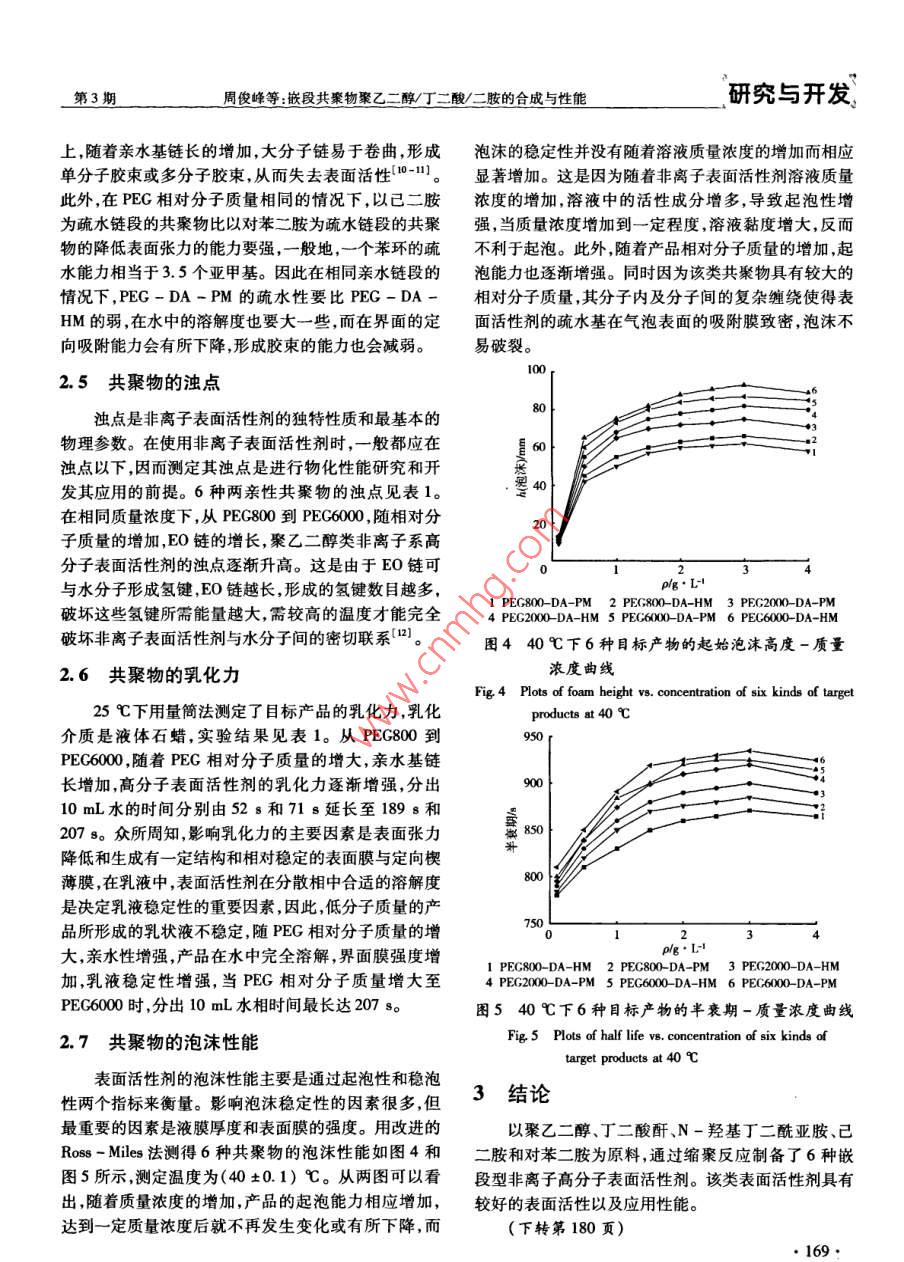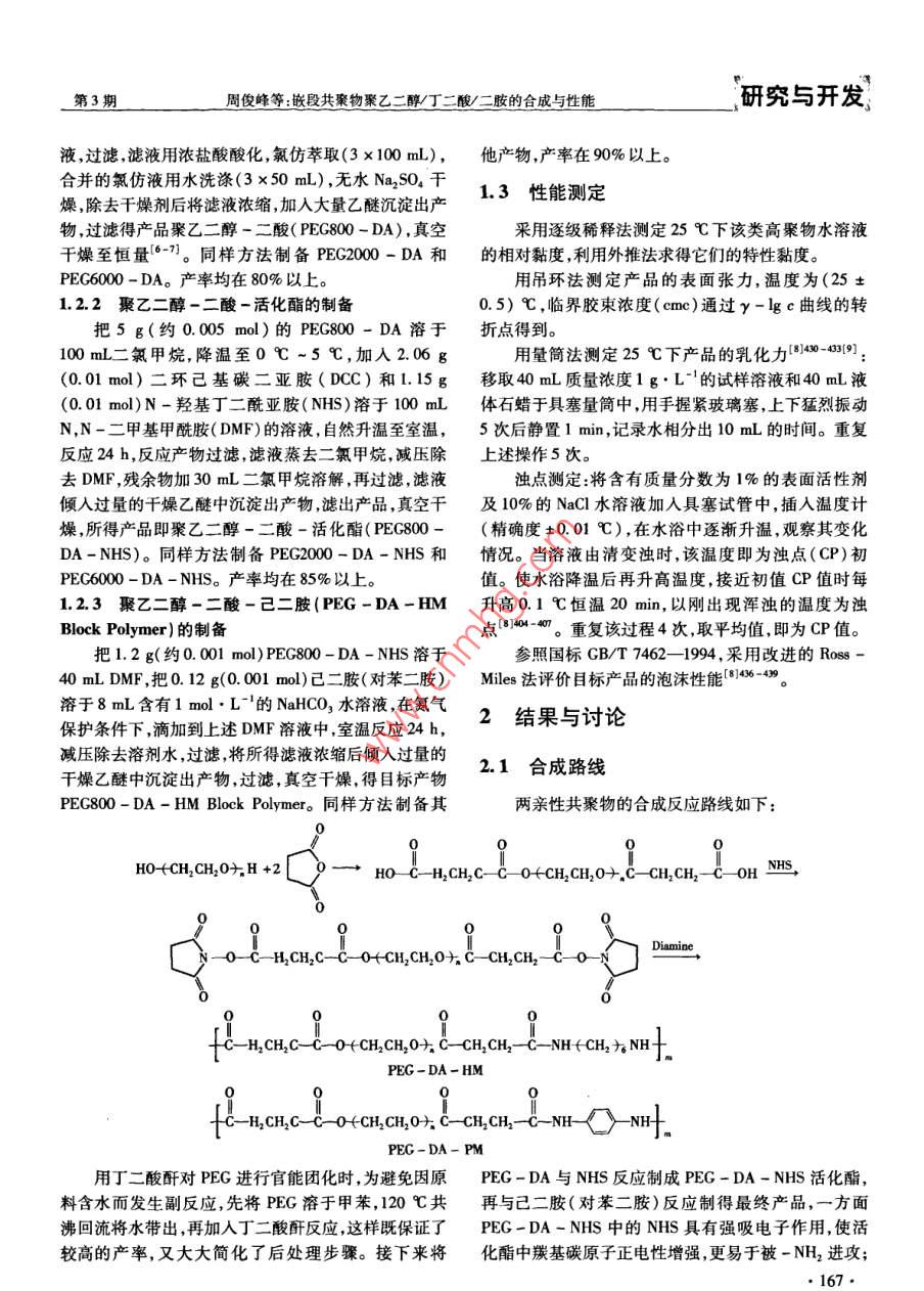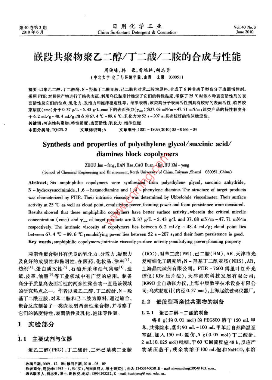 第40卷第3期日用化學工業(yè)Vol 40 No. 3010年6月China Surfactant Detergent Cosmetics嵌段共聚物聚乙二醇/丁二酸/二胺的合成與性能周俊峰,韓豪,曹端林,胡志勇(中北大學化工與環(huán)境學院,山西太原030051)摘要:以聚乙二醇、丁二酸酐、N-羥基丁二酰亞胺、己二胺和對苯二胺為原料,合成了6種非離子型高分子表面活性劑。采用FTR對目標產物進行了結構表征,利用烏氏黏度計確定了它們的特性黏度,考察了25℃時該6種表面活性劑的表面活性及它們的濁點乳化力發(fā)泡力和泡沫穩(wěn)定性等。結果表明該類高分子表面活性劑具有較好的表面活性臨界膠束濃度(cm)介于0.37g~5.43g/L,cmc下的表面張力(y。)為37.68mN/m-47.71mN/m;該類產品的特性黏度介于62mL/g-48.4mL/g;濁點為674℃-89.6℃;乳化力為52s~207s;具有較好的泡沫穩(wěn)定性。關鍵詞:兩親性共聚物;特性黏度;表面活性;乳化力;泡沫性能中圖分類號:TQ423.2文獻標識碼:A文章編號:1001-1803(2010)03-0166-04Synthesis and properties of polyethylene glycol succinic acid/diamines block copolymersZHOU Jun-feng, HAN Hao, CAO Duan-lin, HU Zhi-yongSchool of Chemical Engineering and Environment, North University of China, Taiyuan, Shanxi 030051, China)Abstract: Six amphiphilic copolymers were synthesized from polyethylene glycol, succinic anhydrideN-hydroxysuccinimide, 1, 6-hexanediamine and 1, 4-phenylene diamine. The structure of target productswas characterized by FTIR. Their intrinsic viscosity was determined by Ubbelohde viscosimeter. Their surfacectivity at 25C as well as cloud point, emulsifying power, foaming power and foam persistence were measuredResults showed that these amphiphilic copolymers have better surface activity, wherein the critical micelleconcentration(cmc)and yeme of target products are 0. 37 g/L-5. 43 g/L and 37 68 mN/m-47. 71 mN/mrespectively. The intrinsic viscosity of copolymers lies between 6. 2 mL g-48. 4 mLg; cloud point liebetween 67. 4C-89 6 C; emulsifying power lies between 52 s-207s; and their foam persistence is goodKey words: amphiphilic copolymers; intrinsic viscosity; surface activity emulsifying power; foaming property兩親性聚合物具有優(yōu)良的乳化力、分散力、凝聚力(DCC)、對苯二胺(PM)、己二胺(HM),AR,天津市光及良好的成膜性和黏附性在醫(yī)藥化妝品涂料(、復精細化工研究所;N-羥基丁二酰亞胺(NHS),AR,紡織(、蛋白質改性、石油開采和油氣集輸、造上海晶純試劑有限公司。FTR-7600傅里葉紅外光紙、皮革、油墨等工業(yè)領域中有廣泛的應用。制備譜儀(KBr壓片法),天津港東科技發(fā)展有限公司高分子質量高表面活性的兩親性聚合物一直是該領域JK99D全自動張力儀,上海中晨數(shù)字技術設備有限公的研究熱點之一。作者以聚乙二醇、丁二酸酐、N-羥司;烏式黏度計(內徑0.57mm),上海起航玻璃儀器廠?;《啺贰Ρ蕉泛图憾窞樵?通過縮合、聚合反應制備了一類嵌段型兩親性聚合物,并考察了1.2嵌段型兩親性共聚物的制備它們的黏度特性、表面活性及乳化泡沫等性能。1.21聚乙二醇一二酸的制備1實驗部分將8g(約0.01mol)的PEG800溶于150mL甲苯,共沸除水,蒸出90mL~100mL甲苯后自然降溫至1主要試劑與儀器室溫,加人150mL氯仿、5g(0.05mol)丁二酸酐2mL(0.025mol)吡啶,于60℃回流反應48h,反應產聚乙二醇(PEG)、丁二酸酐、二環(huán)己基碳二亞胺物減壓蒸干,殘余物溶于100mL飽和 NaHCO3水溶收稿日期:2009-12-06;修回日期:2010-03-0作者簡介:周俊峰(1983-),男(漢)河南漯河人,碩士研究生電話:13453146058,E-mal;zhoujunfeng0395@163.com。通訊聯(lián)系人:胡志勇博士,副教授,電話:13994293212,E-mnil: huzhong@nue.cdu,c周俊峰等:嵌段共聚物聚乙二醇丁二酸/二胺的合成與性能研究與開發(fā)液,過濾濾液用濃鹽酸酸化,氯仿萃取(3×100mL),他產物,產率在90%以上。合并的氯仿液用水洗滌(3×50mL),無水Na2SO4干燥除去干燥劑后將濾液濃縮加入大量乙醚沉淀出產1.3性能測定物,過濾得產品聚乙二醇-二酸(PEG800-DA),真空采用逐級稀釋法測定25℃下該類高聚物水溶液干燥至恒量6-7。同樣方法制備PEG200-DA和的相對黏度,利用外推法求得它們的特性黏度。PEG6000-DA。產率均在80%以上。用吊環(huán)法測定產品的表面張力,溫度為(25±1.2.2聚乙二醇-二酸-活化酯的制備0.5)℃,臨界膠束濃度(cm)通過y-lgc曲線的轉把5g(約0.005mol)的PEG800-DA溶于折點得到100mL二氯甲烷,降溫至0℃~5℃,加入2.06g用量筒法測定25℃下產品的乳化力340-019(0.01mol)二環(huán)己基碳二亞胺(DC)和1.15g移取40mL質量濃度1g·L的試樣溶液和40mL液(0.01mol)N-羥基丁二酰亞胺(NHS)溶于100m體石蠟于具塞量筒中,用手握緊玻璃塞,上下猛烈振動N,N-二甲基甲酰胺(DMF)的溶液,自然升溫至室溫,5次后靜置lmin,記錄水相分出10mL的時間。重復反應24h,反應產物過濾,濾液蒸去二氯甲烷,減壓除上述操作5次。去DMF,殘余物加30mL二氯甲烷溶解,再過濾,濾液濁點測定:將含有質量分數(shù)為1%的表面活性劑傾入過量的干燥乙醚中沉淀出產物濾出產品,真空干及10%的NaCl水溶液加入具塞試管中,插入溫度計燥,所得產品即聚乙二醇-二酸一活化酯(PEG800-(精確度±0.01℃),在水浴中逐漸升溫,觀察其變化DA-NHS)。同樣方法制備PEG2000-DA-NHS和情況。當溶液由清變濁時,該溫度即為濁點(CP)初PEC6000-DA-NHS。產率均在85%以上。值。使水浴降溫后再升高溫度,接近初值CP值時每1.2.3聚乙二醇一二酸-己二胺(PEG-DA-HM升高0.1℃恒溫20min,以剛出現(xiàn)渾濁的溫度為濁Block Polymer)的制備點。重復該過程4次,取平均值,即為CP值把1.2g(約0.001mol)PEG800-DA-NHS溶于參照國標GBT7