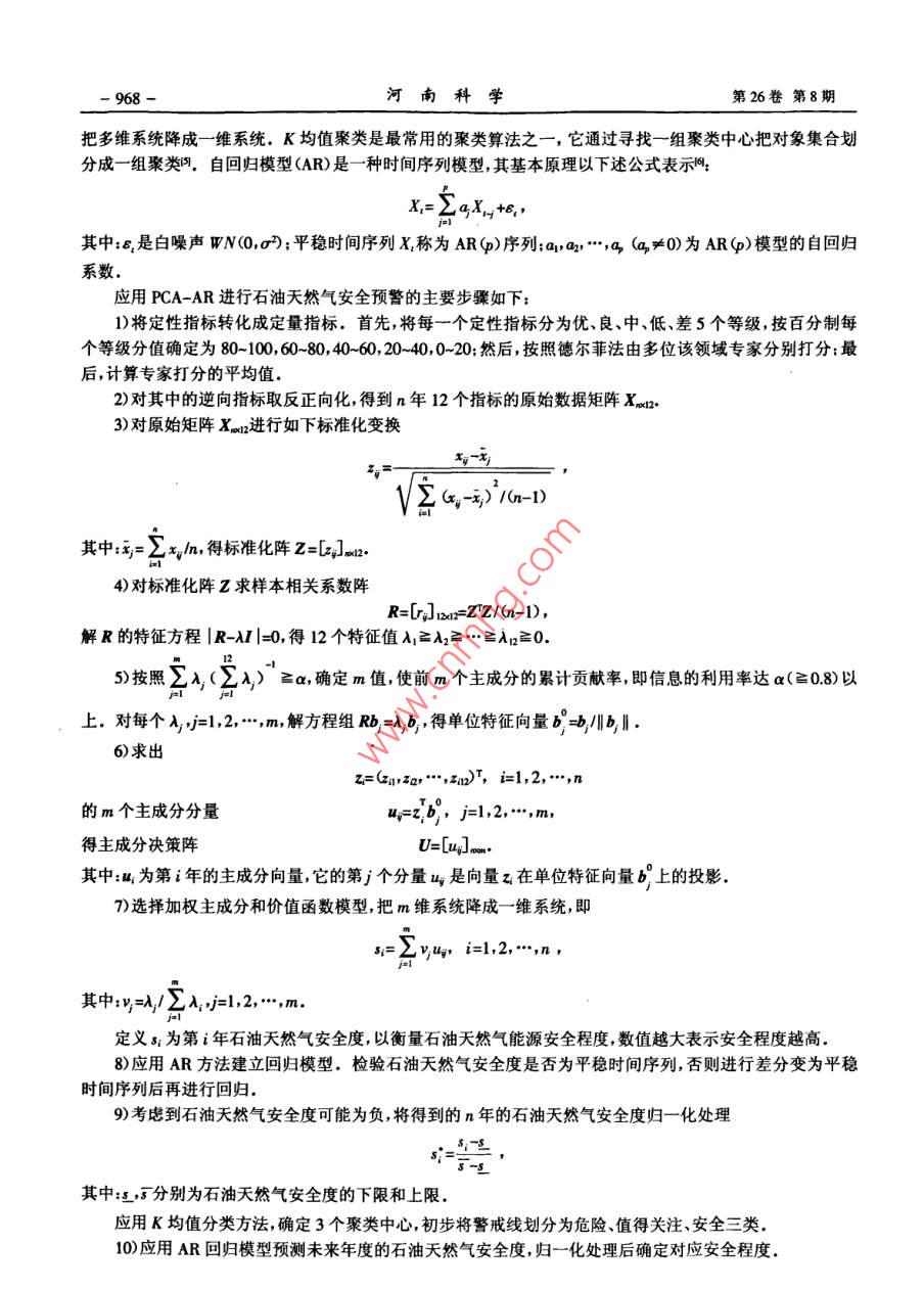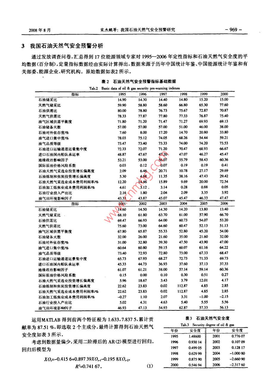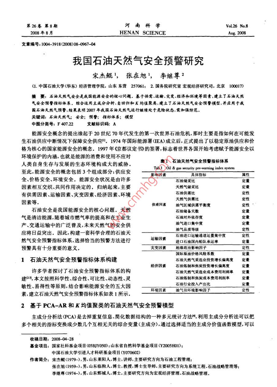 第26卷第8期河南科學(xué)008年8月HENAN SCIENCE文章編號(hào):10043918(2008)08-0967-04我國石油天然氣安全預(yù)警研究宋杰鯤,張?jiān)谛?李繼尊2(1.中國石油大學(xué)(華東)經(jīng)濟(jì)管理學(xué)院,山東東營257061:2.國務(wù)院研究室宏觀經(jīng)濟(jì)研究司,北京10007)摘要:石油天然氣安全是我國能源安全的核心問題?;诠┬?、運(yùn)輸、災(zāi)變、經(jīng)濟(jì)和環(huán)境等因素,建立了石油天然氣安全預(yù)警指標(biāo)體系。綜合運(yùn)用主成分分析、自回歸和K均值聚類,建立了石油天然氣安全預(yù)警模型,并應(yīng)用于我國石油天然氣預(yù)警,結(jié)果表明2007年我國石油天然氣運(yùn)行繼續(xù)處于危險(xiǎn)狀態(tài),需加強(qiáng)防范關(guān)鍵詞:石油天然氣;安全;預(yù)警;指標(biāo)體系;模型中圖分類號(hào):F40722文獻(xiàn)標(biāo)識(shí)碼:A能源安全概念的提出緣起于20世紀(jì)70年代發(fā)生的第一次世界石油危機(jī),那時(shí)主要是指如何在可能發(fā)生石油供應(yīng)中斷情況下保障安全供應(yīng).1974年國際能源署(EA成立后,正式提出了以穩(wěn)定原油供應(yīng)和價(jià)格為核心的國家能源安全的概念,1997年京都議定書》的簽署標(biāo)志著世界各國開始考慮賦予能源安全以環(huán)境保護(hù)的內(nèi)涵,也就是能源的消費(fèi)和使用不應(yīng)對(duì)人類自身生存與發(fā)展的生態(tài)環(huán)境構(gòu)成大的威脅表1石油天然氣安全預(yù)警指標(biāo)體系Tab 1 Oil gas security pre-warning index system至此,能源安全的概念包括3個(gè)組成部分:供應(yīng)安彰響因素具體指標(biāo)全、價(jià)格安全、環(huán)境安全.能源安全狀況是由許多石油儲(chǔ)采比定量因素相互交織、共同作用決定的,歸納起來,主要天然氣儲(chǔ)采比定量有供需因素、運(yùn)輸因素、災(zāi)變因素、經(jīng)濟(jì)因素、環(huán)境石油供需比定性因素等天然氣供需比供衙因素油氣區(qū)域供需平衡度定性石油安全是我國能源安全的核心問題,天然石油儲(chǔ)備天數(shù)定量氣是清潔能源隨著城市燃?xì)饴实奶岣吆驮诠I(yè)生石油對(duì)外依存度定量產(chǎn)、交通運(yùn)輸中的廣泛普及,未來天然氣的安全供油氣進(jìn)口集中度定量定性應(yīng)將日益突出,因此,構(gòu)建一套科學(xué)合理的石油天油氣品質(zhì)等級(jí)石油進(jìn)口運(yùn)輸通道運(yùn)量集中度定↑然氣安全預(yù)警指標(biāo)體系,選擇恰當(dāng)?shù)念A(yù)警方法進(jìn)行運(yùn)輸因素進(jìn)口石油國內(nèi)船隊(duì)承運(yùn)率預(yù)警具有十分重要的意義災(zāi)變因素地緣政治影響因子國際原油價(jià)格風(fēng)險(xiǎn)系數(shù)定量石油天然氣安全預(yù)警指標(biāo)體系構(gòu)建石油天然氣采選業(yè)投資增長偏離度定量經(jīng)濟(jì)因素石油煉制和焦炭投資增長偏離度定量許多學(xué)者探討了石油安全預(yù)警指標(biāo)體系的構(gòu)石油天然氣采選業(yè)成本費(fèi)用利潤率定量建習(xí),本文按照科學(xué)性、綜合性、可比性、動(dòng)態(tài)性、靈石油煉制和焦炭成本費(fèi)用利潤率定量敏性、易得性等原則,結(jié)合影響能源安全的五大因石油行業(yè)投入產(chǎn)出比環(huán)境因素油氣田環(huán)境影響因子定性素,建立石油天然氣安全預(yù)警指標(biāo)體系如表1所示2基于PCA-AR和K均值聚類的石油天然氣安全預(yù)警模型主成分分析法(PCA)是去掉重復(fù)信息、簡(jiǎn)化數(shù)據(jù)結(jié)構(gòu)的一種多元統(tǒng)計(jì)方法,利用主成分分析法可以把多個(gè)相關(guān)的指標(biāo)變換成少數(shù)幾個(gè)互相無關(guān)的綜合變量(主成分),通過選擇適當(dāng)?shù)闹鞒煞謨r(jià)值函數(shù)模型,可以收稿日期:2008-0428基金項(xiàng)目:國家社科基金項(xiàng)目(05BJY050);山東省自然科學(xué)基金項(xiàng)目(Y2005Ho1);中國石油大學(xué)引進(jìn)人才科研基金項(xiàng)目(Y070602)作者簡(jiǎn)介:宋杰鯤(1979-),男,山東萊陽人,博士,講師,主要研究方向?yàn)槭凸こ坦芾韽堅(jiān)谛?1959-),男,山東臨朐人,博士,教授,博士生導(dǎo)師,主要研究方向?yàn)橄到y(tǒng)工程、石油戰(zhàn)略管理等;李繼尊(1974-),男,山東鄄城人,博土,主要研究方向?yàn)楹暧^經(jīng)濟(jì)管理、石油戰(zhàn)略管理-968河南科學(xué)第26卷第8期把多維系統(tǒng)降成一維系統(tǒng),K均值聚類是最常用的聚類算法之一,它通過尋找一組聚類中心把對(duì)象集合劃分成一組聚類閃,自回歸模型(AR)是一種時(shí)間序列模型,其基本原理以下述公式表示間:XX其中:E是白噪聲WN(O,o);平穩(wěn)時(shí)間序列X稱為AR(p)序列a,a…,q(a≠0)為AR(p)模型的自回歸系數(shù)應(yīng)用PCA-AR進(jìn)行石油天然氣安全預(yù)警的主要步驟如下:1)將定性指標(biāo)轉(zhuǎn)化成定量指標(biāo),首先,將每一個(gè)定性指標(biāo)分為優(yōu)、良、中、低、差5個(gè)等級(jí),按百分制每個(gè)等級(jí)分值確定為80-100,60-80,40-60,20-40,0-20;然后,按照德爾菲法由多位該領(lǐng)域?qū)<曳謩e打分;最后,計(jì)算專家打分的平均值2)對(duì)其中的逆向指標(biāo)取反正向化,得到n年12個(gè)指標(biāo)的原始數(shù)據(jù)矩陣X-n,3)對(duì)原始矩陣X2進(jìn)行如下標(biāo)準(zhǔn)化變換(x-x1)/(n-1)其中:=∑xhm,得標(biāo)準(zhǔn)化陣z=L]4對(duì)標(biāo)準(zhǔn)化陣Z求樣本相關(guān)系數(shù)陣R=[J=zz/(