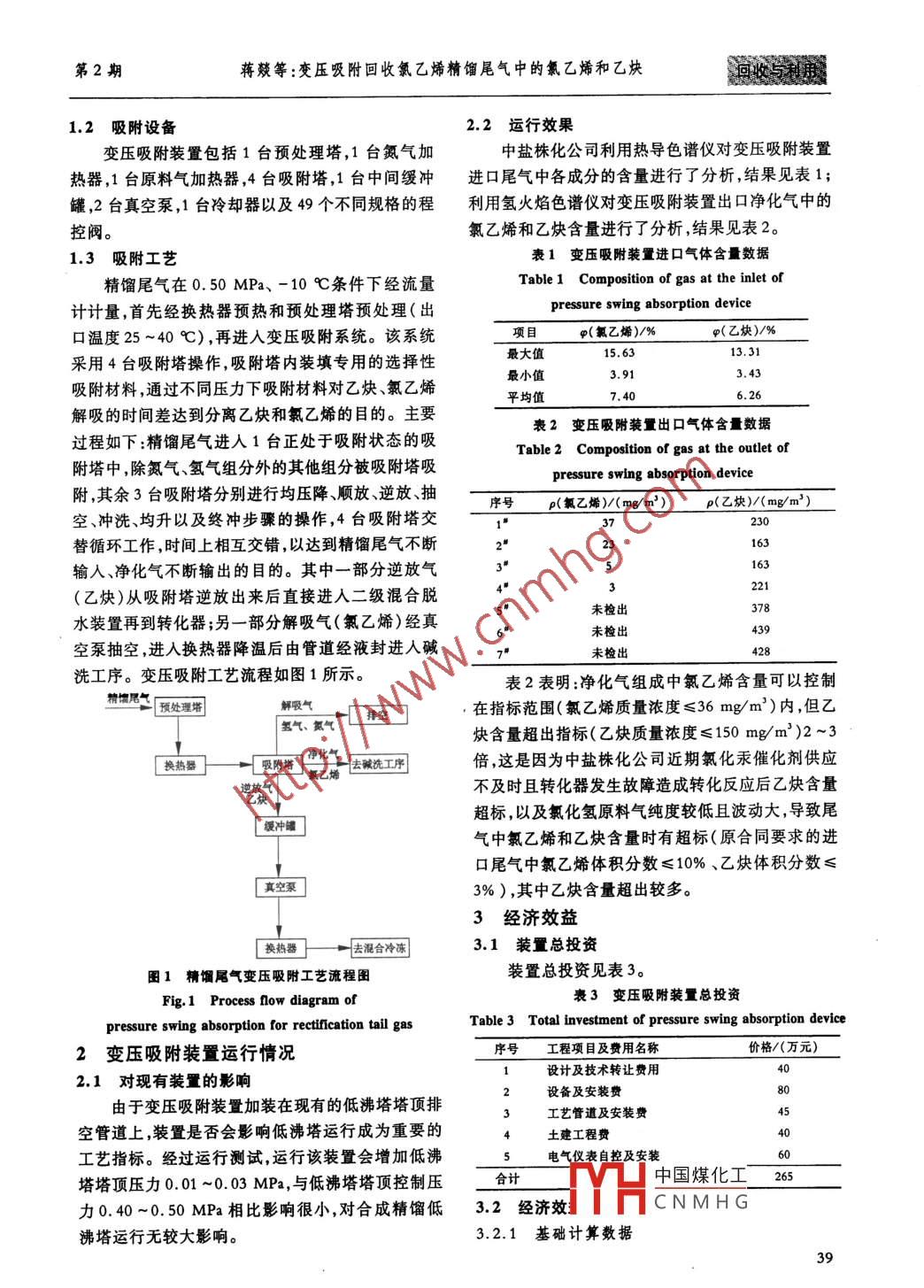 第42卷第2期聚氯乙烯Vol. 42, No.22014年2月Polyvinyl ChlorideFeb. , 2014變壓吸附回收氯乙烯精餾尾氣中的氯乙烯和乙炔蔣燚",劉超亮,易超(中鹽湖南株洲化工集團(tuán)有限公司,湖南株洲412004)[關(guān)鍵詞]氯乙烯;變壓吸附;精餾尾氣;乙炔;經(jīng)濟(jì)效益[摘要]介紹了采用變壓吸附回收氯乙烯精餾尾氣中氯乙烯和乙炔的工藝流程,并對變壓吸附裝置運(yùn)行過;程中出現(xiàn)的問題提出了解決方案。以中鹽湖南株洲化工集團(tuán)有限公司10萬VPVC生產(chǎn)裝置計(jì),每年可回收乙炔氣132 664 m' ,回收氯乙烯單體246. 48 t,產(chǎn)生的經(jīng)濟(jì)效益約200萬元。[中圖分類號] TQ325.5[文獻(xiàn)標(biāo)志碼] B[文章編號] 1009 -7937(2014)02 -0038 -03Recycling vinyl chloride and acetylene containedin VCM rectification tail gas by pressure swing adsorptionJIANG Yi, LIU Chaoliang, YI Chao( Hunan Zhuzhou Chemical Industry Group Co.,Ltd. ,CNSG ,Zhuzhou 412004 , China)Key words: vinyl chloridc; pressure swing adsorption; rectifcaton tail gas; acetylene; economicbenefitAbstract: The process fow. of pressure swing adsorption( PSA) for recycling vinyl chloride andacetylene contained in VCM rectification tail gas was introduced. Measures to solve the problems 0C-curred during operation of PSA were proposed. Taking the 100 kt/a PVC production plant of HunanZhuzhou Chemical Industry Group Co.,Ltd. as an example, 132 644 m' of acetylene and 246. 48 tonsof vinyI chloride could be recovered per year, and nearly 2 million RMB¥economic benefits could bebrought per year.中鹽湖南株洲化工集團(tuán)有限公司(以下簡稱中染環(huán)境。因此,中鹽株化公司考慮在1套10萬Va鹽株化公司)擁有3套10萬Va PVC生產(chǎn)裝置,生PVC裝置上采用變壓吸附裝置回收精餾尾氣中的乙產(chǎn)能力為30萬Va。生產(chǎn)工藝采用電石法,氯乙烯炔和氯乙烯氣體,提高乙炔和氯乙烯的回收效率。精餾尾氣中乙炔和氯乙烯含量較高。在采用變壓吸1變 壓吸附回收氯乙烯和乙炔工藝附裝置回收乙炔和氯乙烯之前,中鹽株化公司采用1.1吸附原理傳統(tǒng)的顆?;钚蕴课焦に嚮厥找胰埠吐纫蚁?3變壓吸附技術(shù)利用吸附劑的特性,將原料氣在臺活性炭吸附裝置輪換進(jìn)行吸附、解吸和再生操作,一定壓力下通過吸附劑床層,原料氣中的高沸點(diǎn)組操作復(fù)雜,勞動強(qiáng)度大。由于在吸附過程中須使用分(乙炔、氯乙烯、二氧化碳等)被選擇性吸附,低沸大量的溫、熱空氣和氮?dú)?所以能耗高,運(yùn)行費(fèi)用高,點(diǎn)組分(氮?dú)?、氫?作為凈化氣由吸附塔出口排但活性炭吸附裝置的處理效率不高,經(jīng)處理后的尾出,經(jīng)尾排閥調(diào)節(jié)后排空。然后在減壓下解吸被吸氣中仍含有體積分?jǐn)?shù)為3%左右的氯乙烯氣體。按附的組分(乙炔、氯乙烯及二氧化碳等),解吸氣回中鹽株化公司30萬V/aPVC產(chǎn)能計(jì),每年因吸附不收利用,同時(shí)使吸附劑獲得再生,以進(jìn)行下一次吸附完全排放的氯乙烯超過820 t,既浪費(fèi)資源,又嚴(yán)重污分離。中國煤化工●[收稿日期] 2013-08 -28[作者簡介]蔣簌(1981-) ,男,助理工程師,畢業(yè)于湖南大學(xué)化工專業(yè),.MYHcNMHG限公司pvcr工藝員。38第2期蔣燚等:變壓吸附回收氯乙烯精餾尾氣中的氯乙烯和乙炔1.2 吸附設(shè)備2.2運(yùn)行效果變壓吸附裝置包括1臺預(yù)處理塔,1臺氨氣加中鹽株化公司利用熱導(dǎo)色譜儀對變壓吸附裝置熱器,1臺原料氣加熱器,4臺吸附塔,1臺中間緩沖進(jìn)口尾氣中各成分的含量進(jìn)行了分析,結(jié)果見表1;罐,2臺真空泵,1臺冷卻器以及49個(gè)不同規(guī)格的程利用氫火焰色譜儀對變壓吸附裝置出口凈化氣中的控閥。氯乙烯和乙炔含量進(jìn)行了分析,結(jié)果見表2。1.3吸附工藝表1變壓吸附裝置進(jìn)口氣體含量數(shù)據(jù)精餾尾氣在0.50 MPa、-10 C條件下經(jīng)流量Table1 Compoition of gas at the inlet of計(jì)計(jì)量,首先經(jīng)換熱器預(yù)熱和預(yù)處理塔預(yù)處理(出pressure swing absorption device口溫度25~40 C),再進(jìn)人變壓吸附系統(tǒng)。該系統(tǒng)項(xiàng)目φ(氯乙烯)/%中(乙炔)/%最大值15.6313.31采用4臺吸附塔操作,吸附塔內(nèi)裝填專用的選擇性吸附材料,通過不同壓力下吸附材料對乙炔、氯乙烯最小值3.913.43平均值7.406.26解吸的時(shí)間差達(dá)到分離乙炔和氯乙烯的目的。主要表2變壓吸附裝置出口氣體含量數(shù)據(jù)過程如下:精餾尾氣進(jìn)入1臺正處于吸附狀態(tài)的吸Table2 Composition of gas at the outlet of附塔中,除氮?dú)?、氫氣組分外的其他組分被吸附塔吸附,其余3臺吸附塔分別進(jìn)行均壓降、順放、逆放、抽序號p(氯乙烯)/(mg/m' )p(乙炔)/(mg/m')空、沖洗、均升以及終沖步驟的操作,4臺吸附塔交37230替循環(huán)工作,時(shí)間上相互交錯(cuò),以達(dá)到精餾尾氣不斷23163輸人、凈化氣不斷輸出的目的。其中一部分逆放氣221(乙炔)從吸附塔逆放出來后直接進(jìn)入二級混合脫未檢出.378水裝置再到轉(zhuǎn)化器;另一部分解吸氣(氯乙烯 )經(jīng)真未檢出439空泵抽空,進(jìn)入換熱器降溫后由管道經(jīng)液封進(jìn)人堿428洗工序。變壓吸附工藝流程如圖1所示。表2表明:凈化氣組成中氯乙烯含量可以控制精情甩二預(yù)處理塔解吸氣在指標(biāo)范圍(氯乙烯質(zhì)量濃度≤36 mg/m')內(nèi),但乙氣、復(fù)氣L持空炔含量超出指標(biāo)(乙炔質(zhì)量濃度≤150 mg/m')2~3換熱器一+[ 吸附塔J8去映洗工序倍,這是因?yàn)