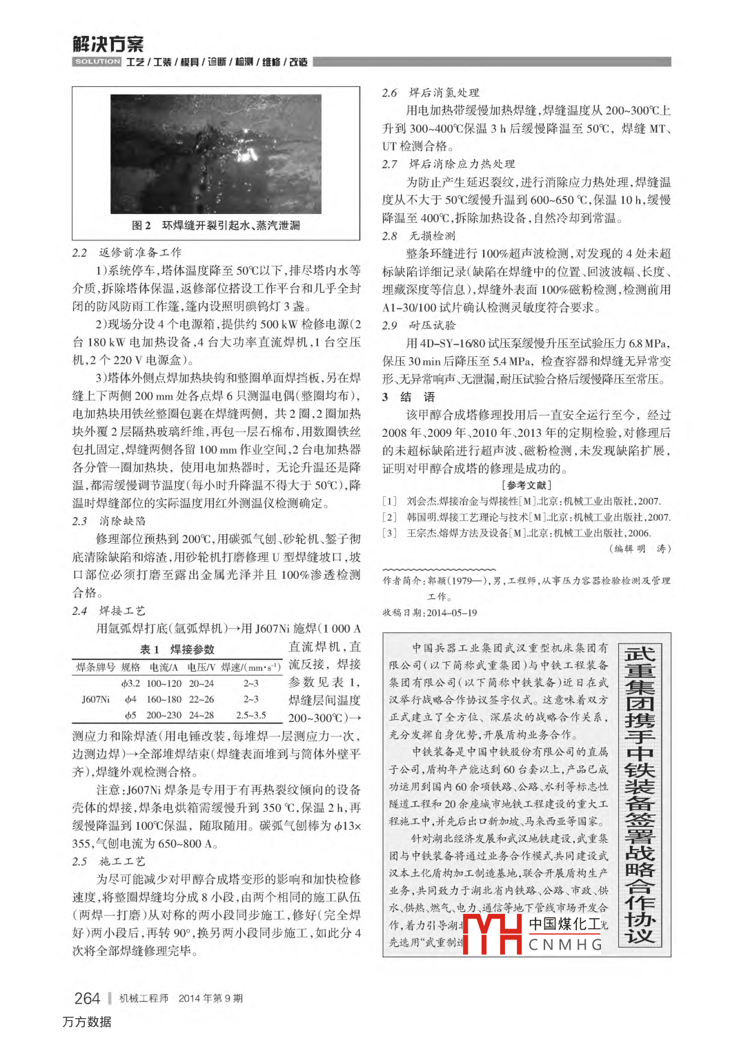 解快盲案工芝/工裝/模具/詮斷/粒測(cè)/維/改造 SOLUTION甲醇合成塔的修理與檢驗(yàn)郭穎,方燕然(巨化集團(tuán)公司壓力容器檢測(cè)站,浙江衢州324004)摘要:分析了甲醇合成塔環(huán)焊縫裂紋成因,提出了修理方案和施工工藝,旨在為同類設(shè)備維修和檢驗(yàn)檢測(cè)提供參考以保證設(shè)備的安全穩(wěn)定運(yùn)行。關(guān)鍵詞:甲醇合成塔;環(huán)焊縫;裂紋;修理;檢驗(yàn)中圖分類號(hào):TH49文獻(xiàn)標(biāo)志碼:B文章編號(hào):1002-2333(2014)09-0263-02Repair and Test of Methanol Synthasis TowerGUO Ying, FANG Yanran(Pressure Vessel Test Station, Juhua Group Corporation, Quzhou 324004, China)Abstract: This paper analyzes the causes of weld crack ring methanol synthesis tower, puts forward repair plan andconstruction process, to provide the reference for the similar equipment repair and inspection, to ensure the safe and stableoperation of equipmentKey words: ethanol synthesis tower; girth weld; crackle; repair; test0引言1容器基本資料某公司甲醇合成塔設(shè)計(jì)壓力(殼程管程)為56/56MPa;設(shè)計(jì)溫度(殼合成氣是甲醇生產(chǎn)的關(guān)鍵設(shè)程管程)為280280℃;工作壓力(殼程管程)為5454MPa;一鍋爐給水蒸汽管板備,2008年1月巡檢發(fā)工作溫度(殼程、管程)為270280℃;材質(zhì)為筒體現(xiàn)該塔二樓筒體環(huán)焊縫20 MnMonis5,上下球形封頭16Mo3,換熱管SAF2205處(圖1)發(fā)生大量飽和厚度為筒體4660mm,上下球形封頭48mm,換熱管開裂焊縫水蒸汽泄漏,泄漏部位d4×2mm;介質(zhì)(殼程管程)為鍋爐給水、蒸汽/合成氣鍋爐給水蒸汽一單管板總長(zhǎng)約200m,停車檢觸媒;制造目期為2002年5月;容器直徑為2900m。查后發(fā)現(xiàn)泄漏部位分布2容器環(huán)焊縫裂紋原因分析及對(duì)策數(shù)條間斷裂紋,裂紋已2.1原因分析經(jīng)穿透筒體環(huán)焊縫。對(duì)該容器自2002年8月投用至2008年1月筒體環(huán)焊1甲合成塔結(jié)構(gòu)及筒體進(jìn)行壁厚測(cè)定,厚縫泄開裂,運(yùn)行了5年多,該容器筒體材質(zhì)開裂部位度值在正常范圍內(nèi),隨20 MnMoni55為低合金高強(qiáng)鋼,焊接性能不佳,開裂的部后進(jìn)行超聲波、磁粉檢測(cè),發(fā)現(xiàn)該環(huán)縫的其他部位也存在位為殼程(蒸汽側(cè))筒體環(huán)焊縫為40mm和60mm對(duì)接不同程度的線性缺陷,在有嚴(yán)重缺陷的環(huán)縫部位用電鉆焊接接頭,其中60mm為固定管板處筒體厚度。焊接殘余對(duì)準(zhǔn)缺陷鉆出一定深度的小孔,證實(shí)了環(huán)縫內(nèi)側(cè)存在裂應(yīng)力大,焊縫容易產(chǎn)生再熱裂紋和延遲裂紋,而且在使用紋,于是決定委托南京化學(xué)工業(yè)公司化工機(jī)械廠對(duì)整條過(guò)程中筒體的熱脹冷縮,使筒體環(huán)焊縫產(chǎn)生巨大的應(yīng)力環(huán)焊縫進(jìn)行修理。環(huán)焊縫逐漸開裂引起水、蒸汽泄漏,如圖2所示。紋占所有故障制動(dòng)梁的17.25%。如果圓弧處修磨過(guò)多的藝管控要求,能夠保證制動(dòng)梁的檢修質(zhì)量及車輛運(yùn)行安全。話,會(huì)使圓弧處由于受力過(guò)大造成梁架斷裂,給鐵路運(yùn)行[參考文獻(xiàn)]安全帶來(lái)極大隱患。[1]鐵道部鐵路貨車制動(dòng)裝置檢修規(guī)則[M].北京:中國(guó)鐵道出版3改進(jìn)建議社,2008為避免以上問(wèn)題的出現(xiàn),應(yīng)對(duì)制動(dòng)梁梁架檢修要求[2]鐵道部鐵路貨車廠修規(guī)程[M]北京:中國(guó)鐵道出版社,201進(jìn)行細(xì)化。應(yīng)從梁架中心線考慮,為避免出現(xiàn)端頭磨修過(guò)[3]鐵道部鐵路貨車典型故障匯編[M]北京鐵道部運(yùn)輸局裝備部多現(xiàn)象,建議單邊磨削深度不超過(guò)3mm。若裂紋修磨[41鐵道部鐵路貨車檢修技術(shù)[M北京:中國(guó)鐵道出版社,20043mm仍存在,則梁架報(bào)廢,制動(dòng)梁報(bào)廢。(編輯明濤)4結(jié)論通過(guò)對(duì)比新版廠修及制規(guī)關(guān)于制動(dòng)梁梁架R6~R8mm作者簡(jiǎn)介:高永發(fā)(中國(guó)煤化工輛驗(yàn)收工作。處裂紋修磨的規(guī)定,對(duì)修磨深度問(wèn)題進(jìn)行了分析,完善工收稿日期:201405CNMHG機(jī)械工程師2014年第9期|263解快盲案SOLUTION工藝/工裝/模具/詮斷/測(cè)/組餡/改造2.6焊后消氫處理用電加熱帶緩慢加熱焊縫,焊縫溫度從200~300℃C上升到300~400℃保溫3h后緩慢降溫至50℃,焊縫MT、UT檢測(cè)合格。2.7焊后消除應(yīng)力熱處理為防止產(chǎn)生延遲裂紋,進(jìn)行消除應(yīng)力熱處理,焊縫溫度從不大于50℃緩慢升溫到600~650℃,保溫10h,緩慢圖2環(huán)焊縫開裂引起水、蒸汽泄漏降溫至400℃,拆除加熱設(shè)備,自然冷卻到常溫。2.8無(wú)損檢測(cè)2.2返修前準(zhǔn)備工作整條環(huán)縫進(jìn)行100%超聲波檢測(cè),對(duì)發(fā)現(xiàn)的4處未超1)系統(tǒng)停車,塔體溫度降至50℃以下,排盡塔內(nèi)水等標(biāo)缺陷詳細(xì)記錄(缺陷在焊縫中的位置、回波波幅、長(zhǎng)度介質(zhì),拆除塔體保溫,返修部位搭設(shè)工作平臺(tái)和幾乎全封埋藏深度等信息),焊縫外表面100%磁粉檢測(cè),檢測(cè)前用閉的防風(fēng)防雨工作篷,篷內(nèi)設(shè)照明碘鎢燈3盞A1-30100試片確認(rèn)檢測(cè)靈敏度符合要求2)現(xiàn)場(chǎng)分設(shè)4個(gè)電源箱,提供約500kW檢修電源(22.9耐壓試驗(yàn)臺(tái)180kW電加熱設(shè)備,4臺(tái)大功率直流焊機(jī),1臺(tái)空壓用4D-SY-1680試壓泵緩慢升壓至試驗(yàn)壓力68MPa,機(jī),2個(gè)220V電源