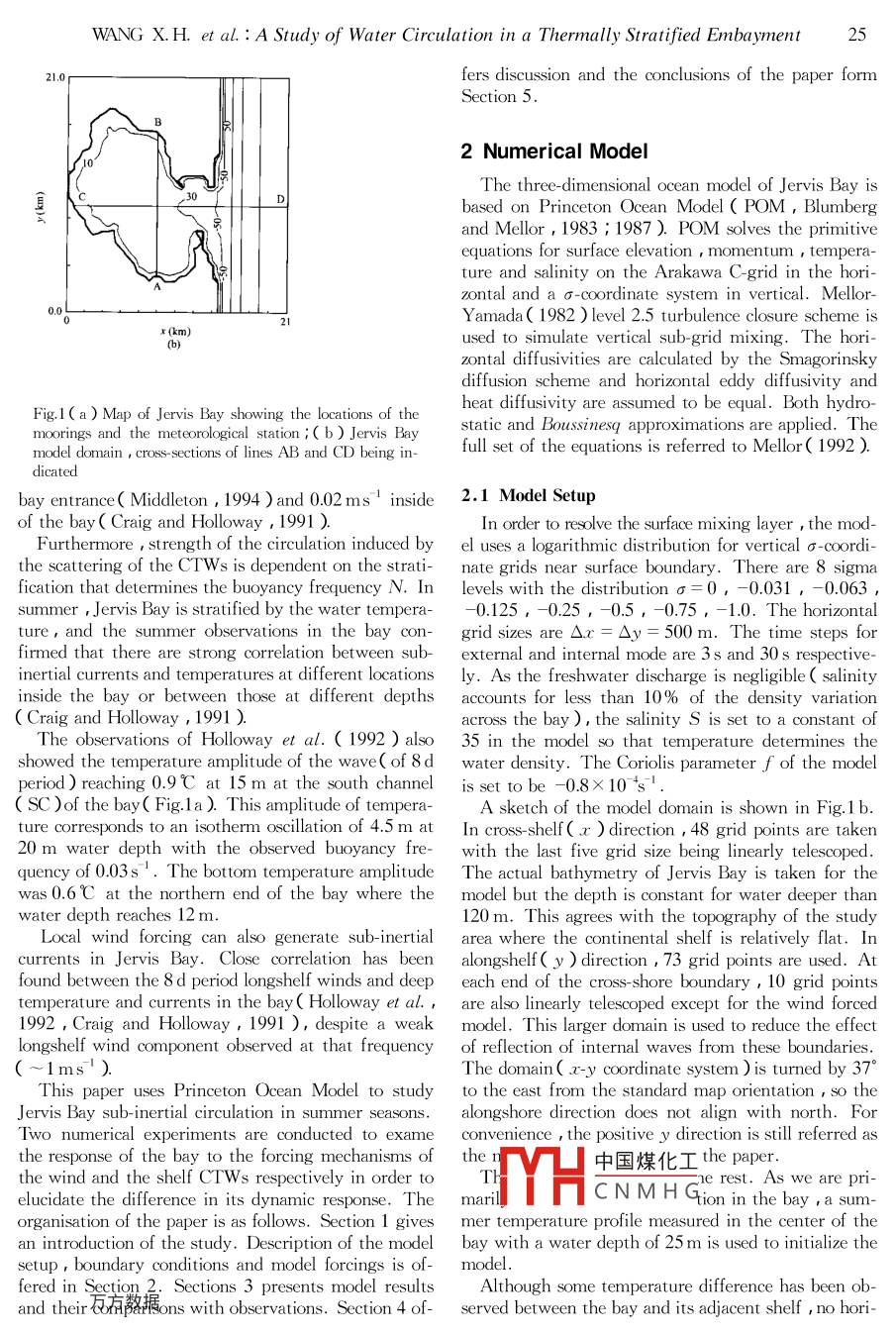 Journal of Ocean University of Qingdao ( Oceanic and Coastal Sea Research )ISSN 1671-2463 April 302003 ,Vol.2 ,No.1 pp.24-34httpE ] /1ww. ouC. edu. ci JlbyvL ]E-mail :xbynvb@ mail.0ulC. edu. cnA Numerical Study of Water Circulation in A ThermallyStratified EmbaymentWANG x. H.!), WANG x. L.2)1 ) School of Geography and Oceanography , University Colle , ADFA , University of New South Wales ,Canberra ACT 2600 , Australia2 ) Department of Mechanics , Zhejiang University , Hangzhou 310029 , P. R. China( Received July 22 2002 ; acepted February 28 2003 )Abstract Princeton Ocean Model is used to study the response of Jervis Bay , NSW , Australia , to the local wind and remoteshelf coastal trapped wave( CTW )forcings in summer seasons when the water column is stratified by the water temperature.The study has revealed that the response of bay to the wind forcing is the generation of the wind driven currents and the in-ternal Kelvin waves( IKW ). However , both temperature and flow sub- inertial oscillations in the bay are weaker than thosefrom the observations and the correlation between the modeled and observed low frequency currents is low. In response tothe forcing of CTWs on the adjacent shelf , IKWs are also established in the bay and amplitudes of sub inertial oscillations oftemperature and currents agree better with the observations. It can be concluded that sub inertial baroclinic flows in the bayis dominantly forced by remote CTW on the shelf adjacent to Jervis Bay during thermally stratified summer seasons.Key words Princeton Ocean Model ; water circulation ; stratified embayment ;Jervis BayNumber ISSN 1671-2463 2003 )01-24-11waves( CTW ) have been observed propagating towardsthe north along the Australian East Coast. The peri-1 Introductionods of these waves are of 6- -10d( Church et al. , 1986a,The sub- inertial circulation in coastal embayment b ).and its exchange with the open shelf waters can haveThe scattering of the coastal trapped waves nearimportant environment consequences. An example of Jervis Bay can be decoupled by a barotropic CTW andsuch a system is Jervis Bay ,a small semi closed embay-a baroclinic internal Kelvin wave( Middleton , 1994 ). .ment located on the East Coast of Australia. The bay Craig and Holloway ( 1991 ) have shown that flowis approximately 15 km long and 8 km wide with argenerated inside the bay by a barotropic forcing on thearea of 124 km2. The averaged depth of the bay is 15m shelf is insignificant , but an internal Kelvin wave withand is connected to the continental shelf through an a period of 8d can force a stronger baroclinic flow inopening which is 3.75 km wide and 40m deep( Fig.1 ). the bay. The amplitude of this decoupled internalThe adjacent continental shelf gradually increases itsKelvin wave on the shelf is around 0.1 ms' near thedepth to 120m within a distance of 5 km offshore , and口人AYthe rest of the shelf remains flat until 20 km offshorewhere the shelf break starts.Based on observations ,Holloway et al.( 1992 )have1 LOCATIONwshown that Jervis Bay is a low energy environment withNEan energy peak at a sub- inertial frequency of 8 days insummer. Tidal currents in the bay are weak with M2being the dominant tidal constituent with current中國煤化工4speeds of 0.07 ms”near the bay entrance and less than0.01 ms”in the northern reaches of the bay. One ofHCNMHGthe mechanisms in forcing the sub-inertial circulation20in the bay is the scattering of the coast trapped wavesue gug morgon the adjacent continental shelf. The coastal trappeda)* Correspondinghubor. Tel 0061-02 -62688473E-mail :hua. wing@ adfa. edu. auWANG X.H. et al. : A Study of Water Circulation in a Thermally Stratified Embayment2521.0fers discussion and the conclusions of the paper formSection 5.2 Numerical Model/10'The three-dimensional ocean model of Jervis Bay isj3based on Princeton Ocean Model ( POM , Blumbergand Mellor , 1983 ; 1987 ). POM solves the primitiveequations for surface elevation,momentum,tempera-ture and salinity on the Arakawa C-grid in the hori-zontal and a σ-coordinate system in vertical. Mellor-0.021Yamada( 1982 ) level 2.5 turbulence closure scheme isx (km)(b)used to simulate vertical sub-grid mixing. The hori-zontal diffusivities are calculated by the Smagorinskydiffusion scheme and horizontal eddy diffusivity andFig.1(a) Map of Jervis Bay showing the locations of theheat diffusivity are assumed to be equal. Both hydro-static and Boussinesq approximations are applied. Themoorings and the meteorological station;( b) Jervis Baymodel domain , cross sections of lines AB and CD being in-full set of the equations is referred to Mellor( 1992 ).dicatedbay entrance( Middleton , 1994 )and 0.02 ms 1 inside 2.1 Model Setupof the bay( Craig and Holloway , 1991 ).In order to resolve the surface mixing layer , the mod-Furthermore strength of the circulation induced by el uses a logarithmic distribution for vertical σ coordi-the scattering of the CTWs is dependent on the strati-nate grids near surface boundary. There are 8 sigmafication that determines the buoyancy frequency N. In levels with the distribution σ=0,-0.031,-0.063 ,summer ,Jervis Bay is stratified by the water tempera--0.125 , -0.25 , -0.5 , -0.75,-1.0. The horizontalture, and the summer observations in the bay con- grid sizes are△x= Oy= 500m. The time steps forfirmed that there are strong correlation between sub-external and internal mode are 3s and 30 s respective-inertial currents and temperatures at different locations ly. As the freshwater discharge is negligible ( salinityinside the bay or between those at different depthsaccounts for less than 10% of the density variation( Craig and Holloway , 1991 ).across the bay ), the salinity S is set to a constant ofThe observations of Holloway et al. ( 1992 ) also 35 in the model so that temperature determines theshowed the temperature amplitude of the wave(of 8d water density. The Coriolis parameter f of the modelperiod ) reaching 0.9C at 15m at the so