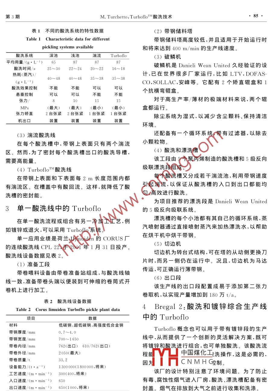 第40卷第3期鋼鐵Vol. 40,No. 32005年3月Iron and SteeMarch 2005TurbofloTM酸洗技術(shù)M. Turchetto(達(dá)涅利威恩聯(lián)合公司)摘要:TurbofloTM是Danieli 公司高效、優(yōu)質(zhì)帶鋼加工的獨(dú)創(chuàng)技術(shù)(Danieli專利),速度達(dá)400 m/min。 除了具有優(yōu)質(zhì)酸洗效果外,Turboflo(tm)還具有設(shè)備利用率高、維修計(jì)劃減少、環(huán)境影響小的特點(diǎn)。介紹了該項(xiàng)技術(shù),并且已經(jīng)安全、令人滿意地安裝在CORUSljmuiden廠的連續(xù)酸洗線和Bregal2酸洗鍍鋅綜合生產(chǎn)線上,并且取得了極好的效果。中國(guó)唐山鋼鐵公司將安裝兩條DanieliTurboflorM酸洗線。關(guān)鍵詞: Turboflo;酸洗;技術(shù)中圖分類號(hào): TG335. 5+5文獻(xiàn)標(biāo)識(shí)碼: A文章編號(hào): 0449-749X(2005 )03-0083-04TurbofloTM Pickling Technology(Danieli Wean United)Abstract: TurbofloTM is Danieli original technology ( Danieli patent) for efficient and quality strip processing atspeeds up to 400 m/ min. In addition to high-quality pickling results, T urboflo offers high plant availability , reducedmaintenance programmes and low environmental impact. This paper describes the technology ,and its safe and satis-factory installation onto the continuous pickling line at Corus ljmuiden works and the combined pickling and galvani-zing line Bregal 2,and the excellent results achieved. Two additional Danieli Turboflo pickling lines will be installedat Tangshan lron and Steel in China.Key words: Turboflo; pickling; technology在熱軋過(guò)程中及熱軋過(guò)程之后,帶鋼表面會(huì)形洗;成氧化鐵皮或氧化物。氧化物是由于在高溫下帶(2)帶有直通酸槽的湍流酸洗;鋼接觸空氣和水的結(jié)果。形成的化合物有FeO,(3)帶有封閉型酸槽的推拉式湍流酸洗。Fe2O3和FesO4。軋制帶鋼表面的氧化鐵皮應(yīng)在帶Danieli Wean United 對(duì)所有上述工藝持有專鋼進(jìn)行進(jìn)-步加工之前去除。利權(quán)和/或商標(biāo)權(quán)。去除氧化鐵皮可采用不同的方法:(1)對(duì)于生產(chǎn)能力小和某些特殊鋼,可采用機(jī)1 TurbofloTM概 念械方法(例如噴丸);對(duì)于氧化鐵皮的快速、高溶解速率,下面的參(2)分別采用鹽酸或硫酸進(jìn)行化學(xué)處理。數(shù)具有決定性意義:在絕大多數(shù)情況下,氧化鐵皮是用化學(xué)法(酸(1)自由基金屬表面,即至金屬基體的氧化鐵洗工藝)去除的。其主要是將帶鋼浸入酸槽,以化皮的最佳裂紋組織;學(xué)還原法去除氧化鐵皮。目前,幾乎所有酸洗生產(chǎn)(2)可能的快速擴(kuò)展。線都是使用鹽酸作為酸洗介質(zhì)。原因是:除了這兩個(gè)參數(shù)外,該流程還可以用受到下列(1)可快速溶解氧化鐵皮,很少浸蝕母材;因素影響的質(zhì)量傳遞系數(shù)確定:(2)酸洗時(shí)間較短;(1)相界面的酸的高動(dòng)態(tài)能;(3)經(jīng)酸洗的帶鋼外觀光亮;(2)帶鋼和酸的溫度;(4)鹽酸易于再生;(3)游離酸所占比例,(5)操作成本低。中國(guó)煤化工中對(duì)這些參數(shù)進(jìn)行了多年來(lái),酸洗工藝經(jīng)歷了顯著的變革。今天的專MHCNMHG.現(xiàn)代酸洗線一般利用下面其中- -個(gè)工藝流程:(1)裸露基金屬表面(裂紋組織)(1)帶有半淺式封閉型酸槽的懸垂式控制酸酸洗段前面的DanieliWeanUnited張力矯直聯(lián)系人:楊秋霜,女,高級(jí)工程師;E-mail: Q. Yang@ danchina. com; .修訂日期: 2004-11-1884●鋼鐵第40卷機(jī)(破鱗機(jī))主要具有兩項(xiàng)功能:①改善帶鋼平直度;②在至金屬基體的氧化鐵皮層形成了最佳、均Ss配達(dá)涅利威恩張力矯直機(jī)(破鱗機(jī))勻裂紋組織。、酸溫85t720C HTCTurboflorM酸洗段中的帶鋼完全水平位置使帶680C20 |610C HTd鋼能提供高張力,這樣,在張力矯直機(jī)和酸洗段之間僅需要一個(gè)輥式張緊裝置。1號(hào)槽2號(hào)槽3 號(hào)槽4號(hào)槽5號(hào)槽.(2)可能的快速擴(kuò)展2 130只要酸浸入氧化鐵皮的裂紋組織直至金屬基體,才能有可能快速擴(kuò)展。為此,在裂紋中的空氣30或在濕帶鋼的情況,水中含有的空氣被酸所取代。501015在深池或淺池的酸洗系統(tǒng)中,在無(wú)動(dòng)態(tài)能的情HCL(g:心川) .況下,僅通過(guò)擴(kuò)散來(lái)進(jìn)行此置換過(guò)程。圖2酸洗時(shí)間圖TurbofloM技術(shù)在進(jìn)入帶鋼的上面和下面,通Fig. 2 Pickling time diagram過(guò)直接注入酸可加快此過(guò)程。(3)在相界區(qū)酸的高動(dòng)態(tài)能對(duì)于酸洗線來(lái)說(shuō),這意味著1號(hào)酸洗槽可在此在相界區(qū).酸的高動(dòng)態(tài)能是通過(guò)足夠的酸洗池濃度下運(yùn)行。概念實(shí)現(xiàn)的。借助于酸洗槽中的常用酸洗液階梯法(將再生每個(gè)酸洗槽是由每個(gè)約2m長(zhǎng)的多個(gè)酸洗池酸添加到最后一個(gè)酸洗槽),可實(shí)現(xiàn)降低Fe濃度和和專門(mén)的槽蓋組成,酸洗池之間的液流見(jiàn)圖1。提高游離酸濃度。由于采用此概念,通過(guò)帶鋼的行走速度,可以最佳游離酸濃度是借助于四級(jí)酸洗液階梯法使酸在帶鋼上下表面形成激烈紊流。帶鋼速度高會(huì)產(chǎn)生高湍流,從而產(chǎn)生較高的質(zhì)實(shí)現(xiàn)的,見(jiàn)圖2。當(dāng)然,本工藝最重要的是根據(jù)酸輸送量,借助量傳輸速率。帶鋼低速產(chǎn)生低湍流,因此質(zhì)量傳輸于與酸的梯流相反的帶鋼可能最佳地隔離各個(gè)酸速率也低。洗槽。(4)帶鋼和酸的溫度在梯度壓力降有效時(shí),回流與高速帶鋼相關(guān)?!翱赡艿目焖贁U(kuò)展”和相