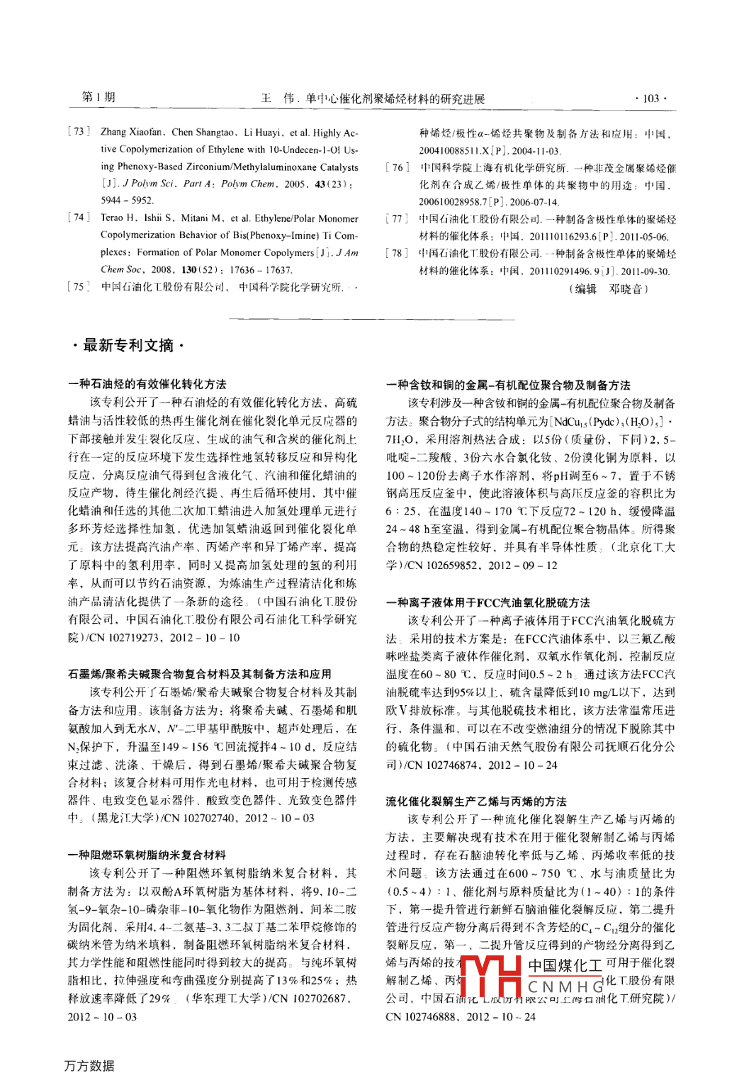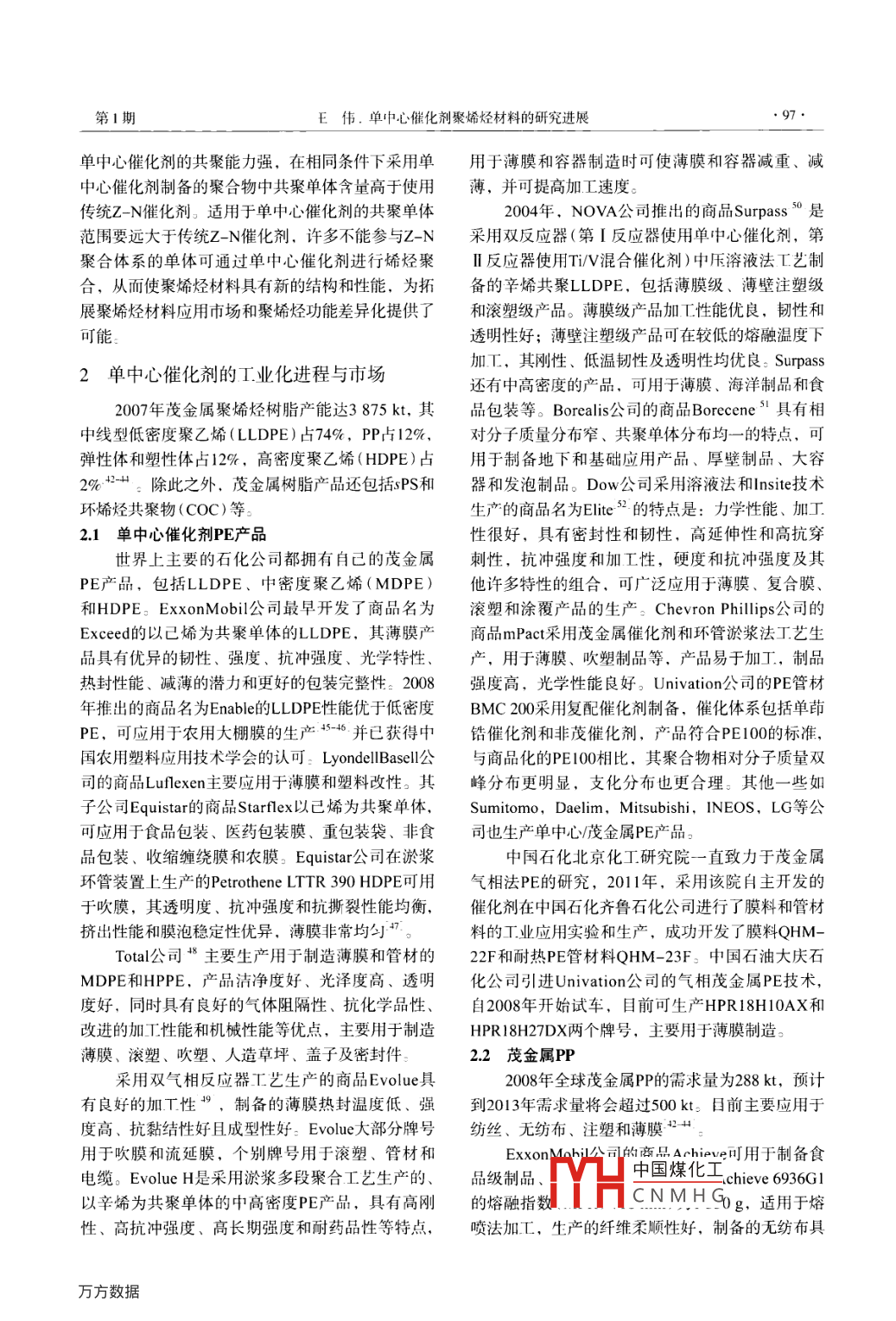 石由2013年第42卷第1期PETROCHEMICAL TECHNOLOGY●95.單中心催化劑聚烯烴材料的研究進(jìn)展王偉(中國(guó)石化北京化T.研究院,北京100013)[摘要]綜述「茂金屬催化劑、非茂金屬催化劑和后過(guò)渡金屬催化削等單中心催化體系的研究進(jìn)展,同時(shí)介紹了一些使用非配位聚合方法(如開(kāi)環(huán)易位聚合)合成特殊結(jié)構(gòu)聚烯烴的研究:著重介紹了基于這類催化劑的聚烯烴材料工業(yè)生產(chǎn)的情況,總結(jié)歸納了各公同生產(chǎn)的單中心催化劑聚烯烴產(chǎn)品并闡述了它們的結(jié)構(gòu)和用途,對(duì)具有強(qiáng)大潛在市場(chǎng)而術(shù)T.業(yè)化的產(chǎn)品(如功能化聚烯烴)進(jìn)行「論述:對(duì)我國(guó)單中心催化劑和聚烯烴材料術(shù)來(lái)的發(fā)展提出了展望。單中心催化劑的研究與開(kāi)發(fā)將促進(jìn)聚烯烴產(chǎn)品的差異化和升級(jí)換代:[關(guān)鍵詞]單中心催化劑:聚烯烴;聚乙烯;聚丙烯;高附加值樹(shù)脂[文章編號(hào)] 1000- 8144(2013)01 - 0095 - 09 .中圖分類號(hào)] TQ322[文獻(xiàn)標(biāo)志碼] AProgress in the Research of Polyolefin Materials with Single Site CatalystsWang Wei(SINOPEC Beijing Research Institute of Chemical Industry. Beiing 100013. China )[ Abstract] The researches of single-site catalysts, namely metallocene catalysts ,non-metallocenecatalysts and late transition metal catalysts, for olefin polymerization were reviewed. The synthesisof some special polyolefins by non-coordination polymerization (e.g. ring-opening metathesispolymerization) was also involved. Some commercially available polyolefn materials based on thesekinds of catalysts were focused on. The types,structures and applications of the polyolefin resins weresummarized. And the uncommercialized functional polyolefins which had strong potential market valuewere also discussed. The development trends of polyolefins based on the single-site catalysts wereproposed.[ Keywords] single-site catalyst; polyolefin; polyethylene; polypropylene; high value-added resin聚烯烴是日常生活中最重要的合成聚合物材建議。料。近年來(lái),具有新型功能、高附加值的聚烯烴材1單中心催化劑料逐漸引起研究人員的關(guān)注。催化劑技術(shù)決定了聚烯烴的發(fā)展,從傳統(tǒng)的Ziegler- -Natta (Z-N)催化劑1957年研究者發(fā)現(xiàn)’,在Et,Al或Et,AICI存在.到茂金屬催化劑、非茂金屬催化劑和后過(guò)渡金屬催時(shí),二氯二茂鈦(Cp2TiCl)可催化乙烯聚合,但聚化劑,烯烴聚合發(fā)展的歷史就是烯烴催化劑發(fā)展的合活性太低,不符合工業(yè)應(yīng)用的要求。直至1980年歷史。催化劑技術(shù)是聚烯烴工.業(yè)的命脈,與傳統(tǒng)Sinn等41發(fā)現(xiàn),采用甲基鋁氧烷(MAO)為助催化的Z-N催化劑相比,茂金屬及其他均相催化劑具有劑時(shí),茂金屬催化乙烯聚合的活性可大幅提高。此更優(yōu)秀的聚合行為,可賦予聚烯烴材料獨(dú)特的結(jié)構(gòu)后,茂金屬催化烯烴聚合的研究不斷有新的突破。和性能2Kaminsky等s]合成出可用于聚合等規(guī)聚丙烯的橋本文綜述了烯烴聚合單中心催化劑的研究進(jìn)聯(lián)手性茂金屬中"箱幾升用手性茂鈦催中國(guó)煤化工展,介紹了單中心催化劑的工業(yè)化進(jìn)程和主要相關(guān)[收稿日期]2TYHC NM H G12- 10-12。產(chǎn)品及其市場(chǎng),對(duì)可能使用單中心催化劑生產(chǎn)的潛i作者簡(jiǎn)介]王偉(1969-),男.北京市人,博士,高級(jí)工程在產(chǎn)品進(jìn)行了展望,并對(duì)這方面的研究開(kāi)發(fā)提出了師.電話010 - 59202604.電郵wang.bjhy@sinopec com:●96●PETROCHEMICAL TECHNOLOGY2013年第42卷化劑,首次采用丙烯單體合成出了熱塑性彈性體;稱為“類Cp配體”Coates等7利用非橋聯(lián)茂金屬催化劑合成了立體嵌Dow公司30-31發(fā)現(xiàn),在烯烴聚合催化體系中段聚丙烯(PP)。同時(shí)使用兩種非茂催化劑(一種共聚能力很強(qiáng),另單茂金屬或半茂金屬化合物是指帶有--.個(gè)環(huán)- -種幾乎不能共聚),通過(guò)引人“鏈穿梭劑”可形戊二烯基或其衍生物的過(guò)渡金屬化合物。1986年,成既含剛性的乙烯均聚鏈段,又含柔性的共聚鏈段Ishihara等8-9. 采用單茂金屬催化劑合成了間規(guī)聚苯的多嵌段結(jié)構(gòu)聚合物。Klosin等 32設(shè)計(jì)了一種新型乙烯(sPS); 1990年, Dow公司和Exxon公司幾乎非茂催化劑,并稱該催化劑在耐溫性、高溫活性、同時(shí)申請(qǐng)了關(guān)于“限制幾何構(gòu)型”催化劑(CGC)共聚性以及聚合物相對(duì)分子質(zhì)量方面已全面超越在烯烴聚合應(yīng)用的專利10; 1991年, Dow公司12CGC催化劑。中請(qǐng)了帶烷氧基的單茂金屬用于烯烴聚合催化劑的除上述IVB族金屬和鐵、鎳等后過(guò)渡金屬的專利,但聚合活性并不高; 1998年, Nomura等 13:化合物,II B族的鈧、鑭系稀土元素以及過(guò)渡金屬發(fā)現(xiàn),帶芳氧基的單茂金屬催化劑的乙烯聚合活性釩、鉻也常用于烯烴聚合。釩催化劑除用于生產(chǎn)乙遠(yuǎn)高FDow公司的帶烷氧基單茂金屬催化劑。該研丙三元橡膠之外,還有很多新興的用途33-34;鉻是究組14-15.5 把這類催化劑的用途大大擴(kuò)展,實(shí)現(xiàn)了多.Phillips催化劑的主要成分,有機(jī)鉻化合物催化劑不種單體的聚合和共聚,甚至使- - 些傳統(tǒng)不可聚合的僅可生產(chǎn)烯烴的低聚物和齊聚物,也可催化烯烴聚單體也能與乙烯共聚,如環(huán)已烯[6l。 其他比較典合得到高相對(duì)分子質(zhì)量的聚