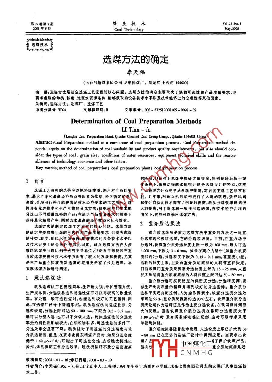 第27卷第5期煤炭技術(shù)val.27,No.s2008年5月Coal TechnologyMay,20089選煤技術(shù)隘不不不不成選煤方法的確定;李天福(七臺(tái)河精煤集團(tuán)公司龍湖洗煤廠,黑龍江七臺(tái)河154600) .摘要 :選煤方法是制定選煤工藝流程的核心問題。選煤方法的確定主要取決于煤的可選性和產(chǎn)品質(zhì)量要求,也要考慮煤的種類、粒度、地區(qū)水資源條件、能夠獲取的設(shè)備技術(shù)水平以及技術(shù)經(jīng)濟(jì)上的合理性等其他因素。關(guān)鍵詞:選煤方法;選煤廠;選煤工藝中圖分類號(hào):TD94文獻(xiàn)標(biāo)識(shí)碼:B文章編號(hào):1008- 8725(2008)05 - 0098 -02Determination of Coal Preparation MethodsLI Tian- fu(Longhu Coal Preparntion Plant, Qitaihe Cleaned Coal Croup Comp. ,Qitaihe 154600,China)Abstract:Coal Preparation method is a core isue of coal preparation process. Coal Preparation method de-pends largely on the determnination of coal washability and product quality requirements, but also should con-sider the types of coal, grain size, conditions of water resources, equipment technical skills and the reason-ableness of technology economic and other factors.Key words : method of coal preparation; coal preparation plant; coal preparation process的限制,但是對(duì)于原煤中塊矸含量很多,特別是矸石易于泥0前言化條件下,采用動(dòng)篩跳汰機(jī)排矸也是選煤設(shè)計(jì)的特點(diǎn),這樣選煤工藝流程的選撣應(yīng)以原料煤性質(zhì)、用戶對(duì)產(chǎn)品的要可以將泥巖矸石盡早從系統(tǒng)中排出,對(duì)后續(xù)主選工藝非常有求、最大產(chǎn)率和最高經(jīng)濟(jì)效益等因素為依據(jù),科學(xué)確定簡單、利。 近年來,對(duì)跳汰機(jī)的結(jié)構(gòu)進(jìn)行了大量的改進(jìn),數(shù)控風(fēng)閥高效、合理可行并且能夠滿足技術(shù)經(jīng)濟(jì)要求的工藝流程。選和排矸自動(dòng)化技術(shù)都有了明顯的提高,跳汰分選效率得到很擇具有先進(jìn)技術(shù)和生產(chǎn)可靠的分選方法;根據(jù)用戶的要求能大的提高 ,對(duì)于易選和一般性可選的煤,在技術(shù)經(jīng)濟(jì)合理的分選出不同質(zhì)量規(guī)格的產(chǎn)品;在滿足產(chǎn)品質(zhì)量要求的前提下情況下,仍然可以采用選煤方法。獲得最大精煤產(chǎn)率,同時(shí)力求最高的經(jīng)濟(jì)效益和社會(huì)效益。2重介質(zhì)選煤法選煤方法是制定選煤工藝流程的核心問題。選煤方法的確定主要取決于煤的可選性和產(chǎn)晶質(zhì)量要求,也要考慮煤重介質(zhì)選煤法是重力選煤方法中重要的方法之一適宜.的種類、粒度、地區(qū)水資源條件、能夠獲取的設(shè)備技術(shù)水平以分選難選和極難選煤,它的分選粒級(jí)寬。 目前,在重力場中及技術(shù)經(jīng)濟(jì)上的合理性等其他因素。跳汰選煤方法在大多分選時(shí) 塊煤重介質(zhì)分選粒度上限一般為300 mm,最大可達(dá)數(shù)國家煤炭分選比例中占有主導(dǎo)地位,但是近年來我國在重1 000 mm,下限為3~6 mm。如果在離心力場中(如重介質(zhì)旋介質(zhì)選煤規(guī)模和技術(shù)水平方面有了較大的發(fā)展和提高,尤其流器內(nèi))分選, ,分選粒度下限為0.15-0.2 mm,甚至更小些。是三產(chǎn)品重介質(zhì)旋流器選煤的應(yīng)用更是有了長足進(jìn)展。本給料的粒度 上限,主要由重介質(zhì)旋流器的人料管直徑?jīng)Q定,文就選煤方法進(jìn)行闡述。目前末煤用重介質(zhì)旋流器分選粒度上限為13~ 25 mm,大直徑無壓給料重介質(zhì)旋流器的人料粒度上限可達(dá)50- 80 mm。1跳汰選煤法重介質(zhì)分選可實(shí)現(xiàn)穩(wěn)定的低密度分選,分選精度高,能跳汰選煤法工藝流程簡單、生產(chǎn)能力強(qiáng)、維護(hù)管理方便、夠生產(chǎn) 出高質(zhì)量的精煤并得到較好的分選指標(biāo)。重介質(zhì)分生產(chǎn)成本低分選極易選和易選性煤可以獲得較高的數(shù)量效選易 于實(shí)現(xiàn)自動(dòng)控制,人為操作因素小,塊煤分選機(jī)分選效率。在處理一般可選性煤時(shí),也能達(dá)到較好的工藝指標(biāo),因率可達(dá)95%,重介質(zhì)旋流器約達(dá)90%左右。塊煤重介質(zhì)分選此,在選煤廠設(shè)計(jì)中普遍采用。跳汰選煤法的適應(yīng)性強(qiáng),分機(jī)無論 是作為選矸還是作為主要分選設(shè)備,在我國都得到很選粒級(jí)寬,分選上限可達(dá)50~ 100 mm,下限為0.3-0.5 mm,大的發(fā)展。但是塊煤重介質(zhì)分選機(jī)在排矸分選密度大于既可以分級(jí)人選,也可以不分級(jí)人選。跳汰選煤法的分選效1.80g/cm’時(shí),重介質(zhì)懸浮液難以配制,這時(shí)可以考慮采用率受給料性質(zhì)影響較大,在細(xì)粒物料多、可選性差的條件下,單 段跳汰機(jī)。分選效率會(huì)顯著下降。眺汰機(jī)對(duì)于易選煤的分選精度與重重介質(zhì)旋流器隨著技術(shù)發(fā)展,人選粒度上限已擴(kuò)大到38介質(zhì)選相當(dāng),但是,在要求出低灰精煤產(chǎn)品時(shí),如果分選密度~80 mm,已在更多的選煤廠設(shè)計(jì)中得到應(yīng)用。當(dāng)要求出塊低于1.40g/cm'時(shí),可能由于可選性變難,造成眺汰機(jī)難以煤產(chǎn)中國煤化工劃于保護(hù)塊煤產(chǎn)品,操作,無法保證正常分選效果。跳汰機(jī)排研不受分選密度高但有重介質(zhì)旋流器是近YHCNMHG收稿日期:2008 - 01- 16;修訂日期:2008-03-19作者簡介:李天福(1962-),男,遼寧遼中人,工程師,1991