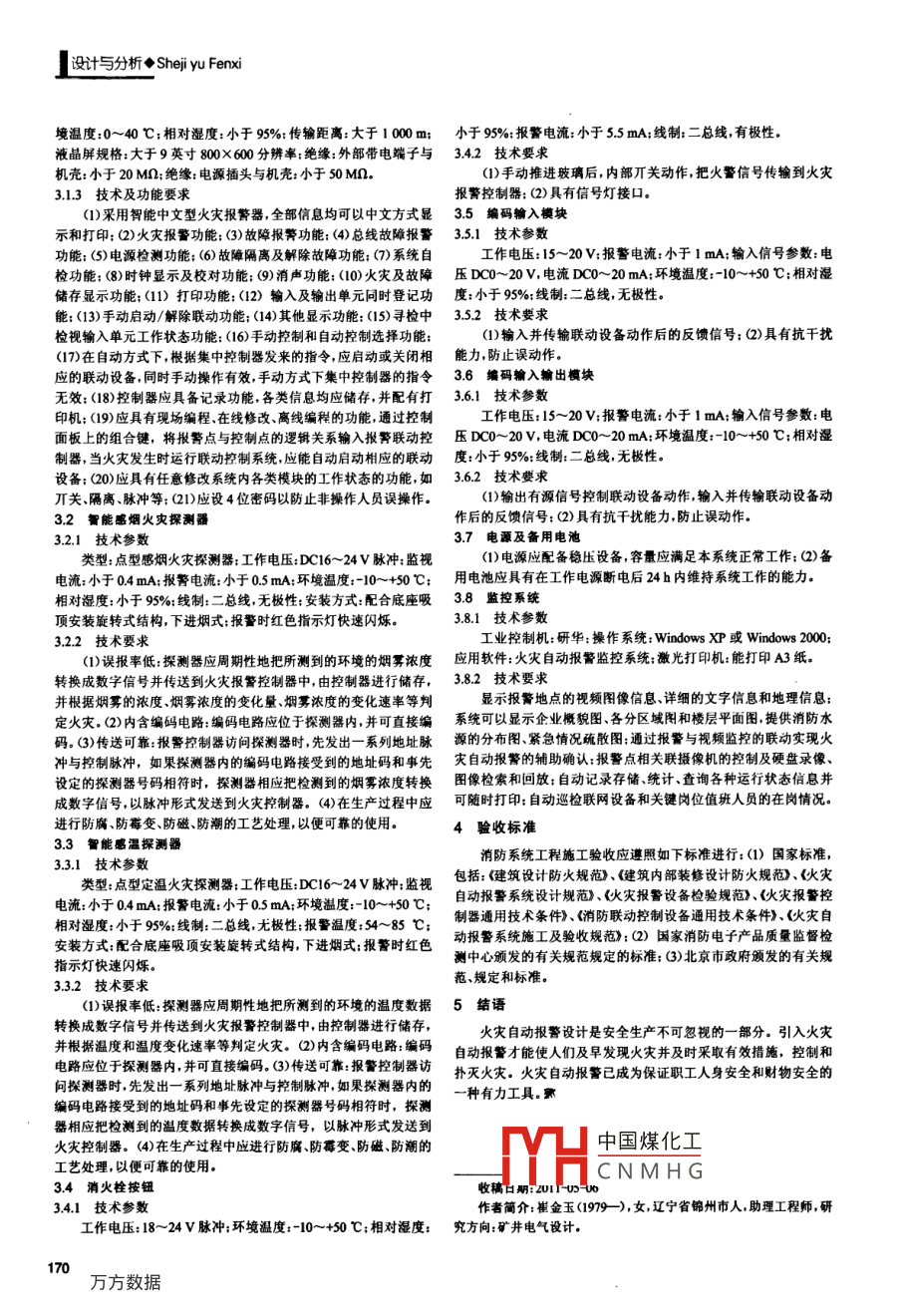 Sheji yu fenxi◆設(shè)計(jì)與分析淺析水煤漿廠消防系統(tǒng)設(shè)計(jì)崔金玉(北京中煤科工集團(tuán)天地科技股份有限公司開采設(shè)計(jì)事業(yè)部,北京100013)摘要:通過(guò)對(duì)目前一家選煤廠消防系統(tǒng)具體實(shí)例的分析,提出了消防系統(tǒng)在安全生產(chǎn)中的必要性。詳細(xì)介紹了整個(gè)設(shè)計(jì)理念提出了應(yīng)極早重視應(yīng)用火災(zāi)自動(dòng)報(bào)警系統(tǒng)的建議關(guān)鍵詞:火災(zāi)自動(dòng)報(bào)警:煤礦;設(shè)計(jì)1工程消防概況消防控制系統(tǒng)由中文智能火災(zāi)報(bào)警控制器、CRT圖形顯示本工程為集中式聯(lián)網(wǎng)型火災(zāi)報(bào)警及消防控制系統(tǒng),全廠設(shè)置屏、打印機(jī)、應(yīng)急廣播設(shè)備、消防直通對(duì)講電話、UP不間斷電源及套火災(zāi)自動(dòng)報(bào)警系統(tǒng),分別對(duì)輸煤走廊原料煤倉(cāng)轉(zhuǎn)載站、制漿備用電源等組成車間、藥劑車間、機(jī)修車間、儲(chǔ)漿罐、各主要變配電室、電纜夾層、主消防設(shè)備平面布置圖如圖1所示。要電纜溝、控制室等場(chǎng)地的火災(zāi)危險(xiǎn)實(shí)施監(jiān)控消防控制中心設(shè)在制漿車間中心二層。根據(jù)全廠總平面布置在機(jī)修車間、添加劑復(fù)配車間維修配電倉(cāng)庫(kù)設(shè)區(qū)域報(bào)警器,放在添加劑復(fù)配車間:在破碎車間、破碎車間至六號(hào)轉(zhuǎn)載棧橋及六號(hào)轉(zhuǎn)載站至制漿車間棧橋設(shè)岡域報(bào)警器,放在破碎車間;其氽入儲(chǔ)煤皮消防控制塞帶棧橋及原煤倉(cāng)設(shè)區(qū)域報(bào)警器,放在原煤倉(cāng)上配電室。各區(qū)域控制器通過(guò)總線控制方式接入到消防控制中心集中報(bào)警控制器上,形成全廠火災(zāi)報(bào)警控制系統(tǒng)2功能要求圖1消防控制室平面圖21消防配電及電纜線路、敷設(shè)方式l一火災(zāi)報(bào)警控制器2—消防聯(lián)動(dòng)控制器3—聯(lián)動(dòng)備用電源4-廣播本工程消防電源為兩部分:一部分為消防泵房用電設(shè)備配電主機(jī)柜5一消防電話主機(jī)6-CRT示器7一雙電源切換箱另外一部分為消防控制電源8一電視墻9—監(jiān)控控制臺(tái)消防泵房用電為一級(jí)負(fù)荷,采用雙電源供電。電源引自破碎車控制系統(tǒng)控制方式為手動(dòng)控制通過(guò)聯(lián)動(dòng)控制臺(tái)可實(shí)現(xiàn)對(duì)消火間破碎車間有2臺(tái)變壓器,分別為消防水泵供電。因?yàn)榇讼辣盟缁鹣到y(tǒng)自動(dòng)噴水滅火系統(tǒng)火災(zāi)應(yīng)急廣播、火災(zāi)應(yīng)急照明疏散房由本廠區(qū)自己提供所以其設(shè)備電源用電量及電纜敷設(shè)由廠區(qū)指示等的監(jiān)視及控制火災(zāi)發(fā)生時(shí)可手動(dòng)/切斷非消防電源自己統(tǒng)一考慮(1)對(duì)消火栓系統(tǒng)的監(jiān)視與控制:設(shè)置消火栓起泵按鈕。當(dāng)發(fā)生消防控制電源亦采用雙回路供電。電源引自制漿車間低壓變火災(zāi)時(shí)可通過(guò)按動(dòng)消火栓起泵按鈕啟動(dòng)消防泵,并發(fā)出報(bào)警信號(hào)電所低壓變電所有9臺(tái)變壓器消防控制電源由其中2臺(tái)獨(dú)立提至相關(guān)區(qū)域報(bào)警器及消防控制室,并在消防控制室報(bào)警控制器上顯示起泵按鈕的位置。消防泵啟動(dòng)后將啟泵信號(hào)反饋至消防控制室消防設(shè)備電源電纜采用NHYN型電力電纜,電纜沿涂防火同時(shí)將消防泵運(yùn)行信號(hào)反饋至消火栓處(現(xiàn)場(chǎng)消火栓指示燈點(diǎn)亮)涂料的金屬線槽敷設(shè)或穿金屬管敷設(shè)應(yīng)急照明回路采用NHBV消防泵既可以在消防控制室聯(lián)動(dòng),又可以在消防泵房就地自動(dòng)/手型導(dǎo)線穿金屬管敷設(shè)穿管敷設(shè)線路沿墻、地面現(xiàn)澆樓板內(nèi)暗敷,動(dòng)控制啟停.消防控制室具有啟動(dòng)控制優(yōu)先權(quán)消防泵的啟動(dòng)停止在不燃燒體結(jié)構(gòu)層內(nèi),且保護(hù)層厚度不小于30mm,明敷或吊頂內(nèi)運(yùn)行信號(hào)及故障信號(hào)送至消防控制室,并在聯(lián)動(dòng)控制臺(tái)上顯示敷設(shè)時(shí)鋼管涂防火涂料保護(hù)。(2)火災(zāi)確認(rèn)后應(yīng)切斷有關(guān)部位的非消防電源22火災(zāi)應(yīng)急照明(3)消防應(yīng)急廣播:在消防控制室設(shè)有消防應(yīng)急廣播盤。消防火災(zāi)應(yīng)急照明包括事故照明和疏散照明。應(yīng)急廣播回路按建筑防火分區(qū)分路,當(dāng)發(fā)生火災(zāi)時(shí),消防控制室值在變電所配電室、消防水泵等有人員工作的地方要設(shè)事故照班人員可根據(jù)火災(zāi)發(fā)生的區(qū)域,自動(dòng)或手動(dòng)進(jìn)行切換控制技相鄰防火分區(qū)接通應(yīng)急廣播揚(yáng)聲器進(jìn)行應(yīng)急廣播明如制漿車間變電所、消防控制室、破碎車間變電所、添加劑復(fù)配車間配電室、儲(chǔ)漿罐配電室、水泵房、原煤倉(cāng)配電室等設(shè)事故照明,3主要設(shè)備技術(shù)參數(shù)及要求火災(zāi)時(shí)持續(xù)工作的備用照明時(shí)間≥180min,照度不低于正常照明31智能型火災(zāi)報(bào)警控制器(聯(lián)動(dòng)型)31柜體型式:琴臺(tái)式在提供人員疏散的場(chǎng)所應(yīng)設(shè)疏散標(biāo)志與疏散通道照明如皮帶機(jī)柜應(yīng)能容納