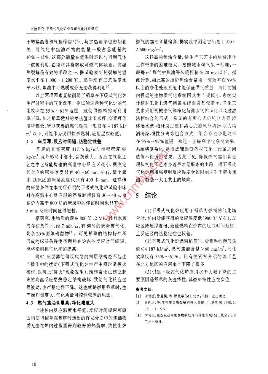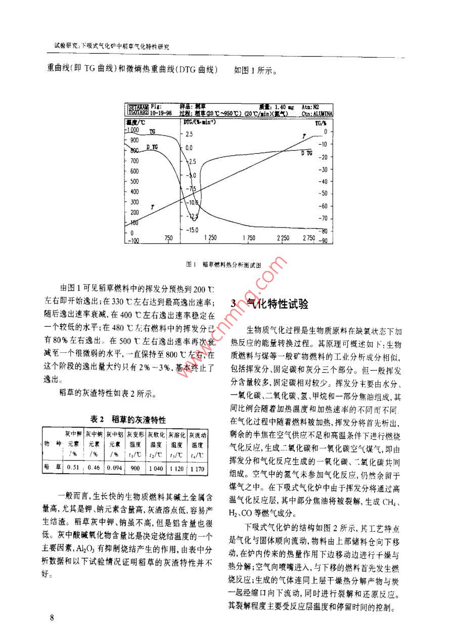 文章編號(hào): 1016988(2001 )04 0007.040下吸式氣化爐中稻萆氣化特性研究楊亞平(東南大學(xué)熱能工程研究所。南京210018)擒要:以肉種管號(hào)時(shí)下吸式空飛發(fā)生爐中稻草的氣化試驗(yàn)為基礎(chǔ)分析了其氣化特性和生產(chǎn)1.藝特性.關(guān)鍵詞:4草;下吸式氣化妒;燃科特性;灰渣特性:反應(yīng)溫度中圖分類號(hào):TK43+.6" 11文獻(xiàn)標(biāo)識(shí)碼:AStudy of Straw’s Casification Characteristicsin Downdraft Gas GeneratorYANG Ya ping(Southreust [niovrsily, Nanjing 210018, China)Abstract: By the test of gasification straw in 1Wo difrent downdraft gas generators, the gasifnca-:icn characteristics of straw and lechnology features have been analyzd.Key words: straw; downdraft gas generator; fuel characterisrics; slag characteristics; tempera-ture. n reaction region外生物質(zhì)氣化技術(shù)米說(shuō),國(guó)內(nèi)的技術(shù)起點(diǎn)較低.采用1序言的技術(shù)簡(jiǎn)單。最具代表性的足在國(guó)內(nèi)北方地區(qū)普遍采用的下吸式空氣發(fā)生爐氣化工藝,因其工藝流程生物質(zhì)是世界第四大能源,它對(duì)全世界一次能和系統(tǒng)設(shè)備簡(jiǎn)單,投資成本低,操作技術(shù)易掌握,在深的貢獻(xiàn)約占14%.在我國(guó), 生物質(zhì)占一次能源總市場(chǎng)上:具有一定的競(jìng)爭(zhēng)力.量的33%:是僅次于煤的第二大能源。同時(shí),我國(guó)但是,近年該產(chǎn)品在向南方地區(qū)推1”中卻遇到是農(nóng)在大國(guó).作為農(nóng)業(yè)生產(chǎn)的副產(chǎn)品,農(nóng)作物秸桿是了相當(dāng)?shù)碾y度,究其原因主要足稻草的燃料特性和生物質(zhì)資源的重要組成部分,從可持續(xù)發(fā)展的角度灰漣特性比較特殊..來(lái)看,稻稈是可再生而且潔凈的能源資源,將在未來(lái)的能源結(jié)構(gòu)中起到重要作用。2稻草的燃料特性和灰渣特性據(jù)聯(lián)合國(guó)環(huán)境規(guī)劉署(UNEP)報(bào)道,世界上種植的各種谷物每年可提供秸稈17億t。我國(guó)的各類稻草及其半焦的燃料特性見(jiàn)表I(分析基):農(nóng)作物秸稈資源十分豐富,總產(chǎn)量達(dá)7億多1,其中稻卓為2.3億占總量的33%之多。表1稻草及其半焦的燃燒特性在我國(guó)農(nóng)村秸稈氣化主要是為了解決廣“大農(nóng)戶.水分灰分揮發(fā)分周定明HNST0Qea生活燃料的能源問(wèn)題,兼顧環(huán)境保護(hù)。因此相對(duì)國(guó)1%/%/% 1 /% /%1% j19%[/%↓1% (wm用畢.7914.3567.6114.254.337.070. 760.21|34 4193 260.1收姆7期:2001 0803率里: .874.7811.089.27 0.6113.45 0.7|970.9作者覽介:場(chǎng)亞平(1952-).男.削教授、從事熱能工程鐵域科研工但藝發(fā)表學(xué)術(shù)論文20多篇采用熱重法試驗(yàn)得到的稻草在加熱過(guò)程中的熱試糧研兗:下吸式氣化護(hù)中鵬草氣化特性研究重曲線(即TG曲線)和微熵?zé)嶂厍€(DTG曲線)如圖1所示。樣品:草質(zhì)量:1.40g At:2i 12079210-19-98 過(guò)程:湘草C20C -950C) (20C/inX氮) CEn: ALIMTNA溫座/心不/不min)G/%1000 ct2-8且他k .07002.5-3600. 500-40. 400. 3001-10.-60t 20-70 tL-10050r -15.01250175022502750 -90」圖1帽草燃料熱分析測(cè)試圖由圖1可見(jiàn)稻草燃料中的揮發(fā)分預(yù)熱到200 C左右即開(kāi)始逸出;在330C左右達(dá)到最高逸出速率;3氣化特性試驗(yàn)隨后逸出速率衰減,在400 C左右逸出速率穩(wěn)定在-個(gè)較低的水平;在480心左右燃料中的揮發(fā)分已生物質(zhì)氣化過(guò)程是生物質(zhì)原料在缺氧狀態(tài)下加有80%左右逸出。在500 C左右逸出速率再次衰熱反應(yīng)的能量轉(zhuǎn)換過(guò)程。其原理可概述如下:生物減至一個(gè)很微弱的水平,一直保持至800七左右,在質(zhì)燃料與媒等- -般礦物燃料的工業(yè)分析成分相似,這個(gè)階段的逸出量大約只有2%-3%,基本終止了包括揮發(fā)分、固定碳和灰分三個(gè)部分。但一般揮發(fā)逸出。分含量較多,固定碳相對(duì)較少。揮發(fā)分主要由水分、稻草的灰渣特性如表2所示。一氧化碳、二氧化碳、氫、甲烷和一部分焦油組成,其間比例會(huì)隨著加熱溫度和加熱速率的不同而不同表2稻草的灰渣特性在氣化過(guò)程中隨著燃料被加熱,揮發(fā)分將首先析出,灰中鮮灰中鈉灰中鋁灰變形灰軟化|灰溶化灰流動(dòng)剩余的半焦在空氣供應(yīng)不足和高溫條件下進(jìn)行燃燒物種:元素元素元肅溫度|溢度詛度溫度氣化反應(yīng),生成二氧化碳和一氧化碳空氣煤氣,即由/% ! /%| 1% n/E 42/C t/t t/t揮發(fā)分和氣化反應(yīng)生成的-氧化碳、氧化碳共同看草0.51 | 0.46 0.094 900 1040 1120 1170 |組成。空氣中的氮?dú)馕磪⒓託饣磻?yīng),仍然余留于煤氣之中。在下吸式氣化爐中由于揮發(fā)分將通過(guò)高-般而言,生長(zhǎng)快的生物質(zhì)燃料其賊土金屬含溫氣化反應(yīng)層,其中部分焦油將被裂解,生成CH4、量高,尤其是鉀、鈉元素含量高,灰渣溶點(diǎn)低,容易產(chǎn)H2.CO等燃?xì)獬煞?。生結(jié)渣。稻草灰中鉀、鈉雖不高,但是鋁含量也很下吸式氣化妒的結(jié)構(gòu)如圖2所示,其工藝特點(diǎn)低?;抑兴釅A氧化物含量比是決定燒結(jié)溫度的一個(gè)是氣化 與固體順向流動(dòng),物料由上部?jī)?chǔ)料倉(cāng)向下移主要因素,AL2Oz有抑制燒結(jié)產(chǎn)生的作用,由表中分動(dòng),在爐內(nèi)傳來(lái)的熱量作用下邊移動(dòng)邊進(jìn)行干燥與析數(shù)據(jù)和以下試驗(yàn)情況證明稻草的灰渣特性并不熱分解;空氣向噴嘴進(