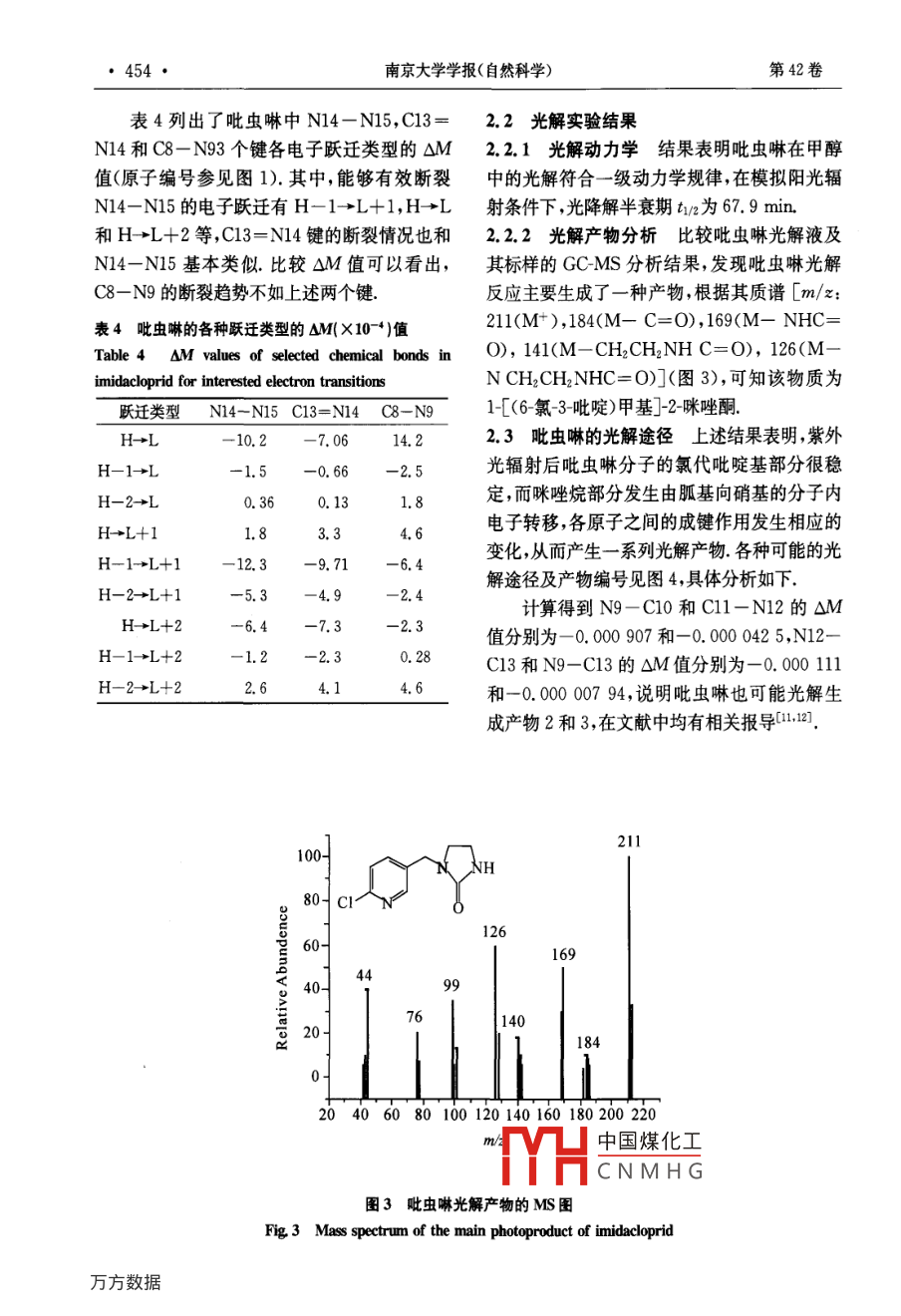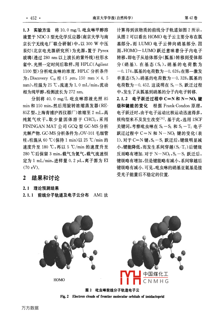 第42卷第5期南京大學(xué)學(xué)報(bào)(自然科學(xué))VoL. 42, No 52006年9月JOURNAL OF NANJING UNVERSITY2006(NATURAL SCIENCES)吡蟲啉在甲醇中的光解研究秦元斌,展漫軍,楊曦(污染控制與資源化研究國家重點(diǎn)實(shí)驗(yàn)室,南京大學(xué)環(huán)境學(xué)院,南京,210093)摘要:根據(jù)分子軌道理論,借助半經(jīng)驗(yàn)分子軌道計(jì)算方法研究吡蟲啉可能的的光解途徑,發(fā)現(xiàn)硝基亞氨基是接受光子能量后最不穩(wěn)定的位置并預(yù)測了各種可能的光解產(chǎn)物以300W中壓汞燈(A>280nm)為光源,實(shí)驗(yàn)發(fā)現(xiàn)吡蟲啉在甲醇溶劑中的光解符合一級動(dòng)力學(xué)規(guī)律,其主要降解產(chǎn)物為1(6氯-3吡啶)甲基]2咪唑酮.實(shí)驗(yàn)結(jié)果與理論預(yù)測結(jié)果吻合,從而提出了吡蟲啉可能的光解途徑.關(guān)鍵詞:吡蟲啉,光解,反應(yīng)機(jī)理,分子軌道理論中圖分類號:X52Photolysis of Imidacloprid in MethanolQin Yuan-Bin, Zhan Man-Jun, Yang XiState Key Laboratory of Pollution Control and Resource Reuse, School of the EnvironmentNanjing University, Nanjing, 210093, China)Abstract: In this paper, we predicted the photolysis pathways of imidacloprid by semiempirical molecular orbitaltheoretical computations. Firstly, we obtained the main transition styles of imidacloprid at A> 280 nm byConfiguration Interaction. Then we calculated the value of AM in these transition styles. The results showed thatthe bonds of N14-N15, C13=Nl4 and C8-N9 of imidacloprid tended to break. On the other hand, photodegradation behaviors of imidacloprid in methanol were studied under irradiation of a 300 W medium pressure mercury lamp(>280 nm). The primary degradation of imidacloprid followed a pseudo-first-order kinetics in methanol, and thephotodegradation half life of imidacloprid in methol is about 67. 9 min. The main photoproduct of imidacloprid wasdetermined as 1-[(6-chloro-3-pyridinyl)methylF-2-imidazolidone by GC/MS. The results of theoretical prediction a-greed well with the experimental conclusions, which suggested that semiempirical molecular orbital theoretical computations could betially applied to predict the photolysis pathways of organic contaminations.Key words: imidacloprid, photolysis, reaction mechanism, molecular orbital theory吡蟲啉( imidacloprid,結(jié)構(gòu)式見圖1)是一廣譜、高效而得到了廣泛應(yīng)用.因此,吡蟲啉種新型的硝基亞甲基類高效殺蟲劑,因其低毒、及其降解產(chǎn)物的環(huán)境行為與安全性評價(jià)也日益中國煤化工CNMHG基金項(xiàng)目:國家自然科學(xué)基金(50578074,20207004),國家科技攻關(guān)計(jì)劃重天項(xiàng)目(2003BA808A7)收稿日期:2006-01-20通訊聯(lián)系人,E-mail;yangxi@nju.edu.cn第5期秦元斌等:吡蟲啉在甲醇中的光解·451·引起關(guān)注.光解是吡蟲啉在環(huán)境中的重要M=2∑C4(A)C(B)S。(k=;,j)歸趨途徑之一,然而這方面的研究并不多,尤其缺乏對光解歷程的深入了解.本文首先應(yīng)用分子軌道(MO)理論預(yù)測了式中C(A)和C與(B)為第k個(gè)分子軌道吡蟲啉可能的光解途徑然后通過實(shí)驗(yàn)研究了中原子A的原子軌道P和原子B的原子軌道q吡蟲啉的光解動(dòng)力學(xué),鑒定了其主要的光解產(chǎn)的系數(shù),Sm為p和q之間的重疊積分物結(jié)合實(shí)驗(yàn)和理論預(yù)測結(jié)果,提出了吡蟲啉可對于有機(jī)物的光解來說,從第i個(gè)MO到能的光解途徑.第j個(gè)MO的單電子躍遷造成了鍵的削弱或增強(qiáng).相應(yīng)地,有22:12019△M=(M,-M)/225 24 HHH如果△M值為負(fù)值,表示光激發(fā)后,分子HH中的A-B鍵可能會(huì)斷裂;反之,原子A和B則有成鍵的趨勢9H對于化合物的光解來說,光激發(fā)后,并不是H18只有從最高已占據(jù)軌道(HOMO到最低未占據(jù)軌道(LUMO的單電子躍遷,其他MO之間14∠O1的躍遷也有可能發(fā)生,甚至可能在光激發(fā)過程中起主要作用本文采用組態(tài)相互作用的方法,考慮了4個(gè)已占據(jù)軌道( occupied orbital)和3016個(gè)未占據(jù)軌道( unoccupied orbita),并得到了相應(yīng)的各個(gè)MO的躍遷類型和系數(shù),定量地分圖1吡蟲啉的結(jié)構(gòu)式和原子編號Fig 1 Structure and atomic serial numbering of析了各種躍遷類型在整個(gè)CI態(tài)中所占的比重imidacloprid由于自由基(如OH)的單電子占據(jù)軌道(SOMO中的未成對電子既可以和芳香族有機(jī)1實(shí)驗(yàn)部分物的最高已占據(jù)分子軌道(HOMO作用,又可以和最低未占據(jù)分子軌道(LUMO作用,根據(jù)1.1理論預(yù)測方法所有分子結(jié)構(gòu)優(yōu)化和量前線分子軌道理論,定義如下自由基反應(yīng)描述子化學(xué)參數(shù)均采用分子軌道軟件包( MOPAC)符:中的AM1算法,由輸出文件直接得到分子的(C10M0)2+(C1M0)2}(3)生成能、分子軌道能級和原子凈電荷等參數(shù)輸A BONDS, ENPART, VECTORS, MECI,式中C100和C110分別表示HOMO和C.L.=7,C'S等關(guān)鍵詞得到鍵級、鍵能、原子LUMO中原子軌道i的系數(shù).對于激發(fā)態(tài)分軌道特征矢量以及各CI態(tài)( Configuration子,Interaction state)中各個(gè)MO躍遷的類型和系fR=∑{CxM0)2+(CM嗎)2)(4)數(shù)將優(yōu)化后的分子構(gòu)型輸入 Hyperchem7軟式中C∞M和CM表示兩個(gè)SOMO中件采用AMl算法計(jì)算單電子各躍遷能級以原=甘子的f值大小可以及相應(yīng)的自旋多重性紫外吸收波長和振子強(qiáng)表度CNMH紅太陽集團(tuán))純度第k個(gè)分子軌道中原子A和原子B的大于98%,甲醇(色譜純,Teda公司),CHCl3Mulliken重疊布居數(shù)M定義為:(分析純)·452·南京大學(xu
