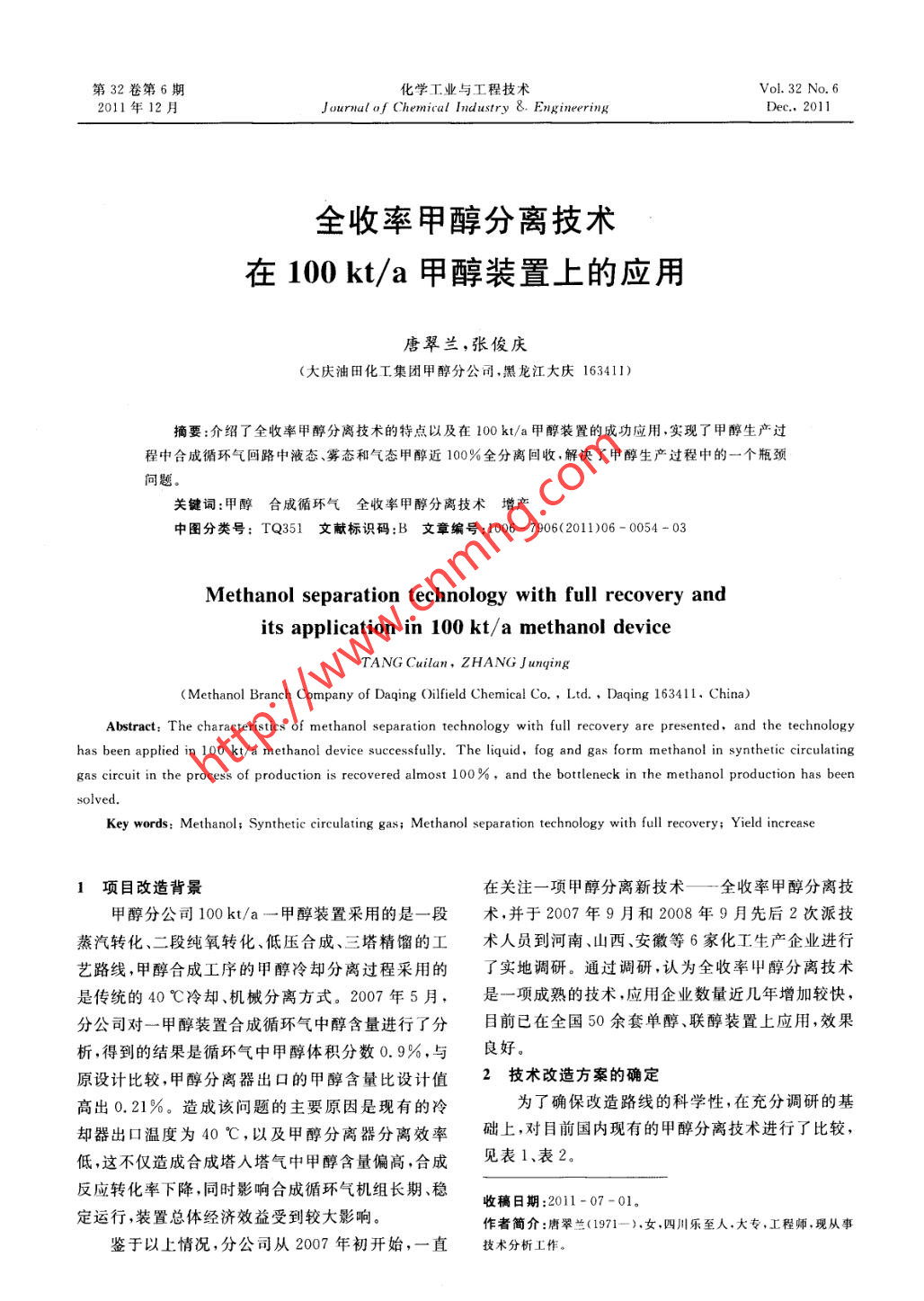 第32卷第6期化學(xué)工業(yè)與工程技術(shù)Vol.32 No. 62011年12月J ournal of Chemical Industry &. EngineeringDec., 2011全收率甲醇分離技術(shù)在100kt/a甲醇裝置.上的應(yīng)用唐翠蘭,張俊慶(大慶油田化工集團(tuán)甲醇分公司,黑龍江大慶163411)摘要:介紹了全收率甲醇分離技術(shù)的特點(diǎn)以及在100 kt/a甲醇裝置的成功應(yīng)用,實(shí)現(xiàn)了甲醇生產(chǎn)過(guò)程中合成循環(huán)氣回路中液態(tài)、霧態(tài)和氣態(tài)甲醇近100%全分離回收,解決了甲醇生產(chǎn)過(guò)程中的一個(gè)瓶頸問(wèn)題。關(guān)鍵詞:甲醇合成循環(huán)氣全收率甲醇分離技術(shù) 增產(chǎn)中圖分類號(hào): TQ351文獻(xiàn)標(biāo)識(shí)碼:B 文章編號(hào):1006 - 7906(2011)06 - 0054 -03Methanol separation technology with full recovery andits application in 100 kt/a methanol deviceTANG Cuilan, ZHANG J unqing(Methanol Branch Company of Daqing Oilfield Chemical Co.,Ltd. ,Daqing 163411. China)Abstract: The characteristics of methanol separation echnology with full recovery are presented, and the technologyhas been applied in 100 kt/a methanol device sceessfully. The liquid, fog and gas form methanol in synthetic circulatinggas circuit in the process of production is recovered almost 100%,and the bottleneck in the methanol production has beensolved.Key words: Methanol; Synthetic circulating gas; Methanol separation technology with full recovery; Yield increase1項(xiàng)目改造背景在關(guān)注一項(xiàng)甲醇分離新技術(shù)一-全收率甲醇分離技甲醇分公司100kt/a-甲醇裝置采用的是一段術(shù),并于2007年9月和2008年9月先后2次派技蒸汽轉(zhuǎn)化、二段純氧轉(zhuǎn)化、低壓合成、三塔精餾的工術(shù)人員到河南、山西、安徽等6家化工生產(chǎn)企業(yè)進(jìn)行藝路線,甲醇合成工序的甲醇冷卻分離過(guò)程采用的了實(shí)地調(diào)研。通過(guò)調(diào)研,認(rèn)為全收率甲醇分離技術(shù)是傳統(tǒng)的40 C冷卻、機(jī)械分離方式。2007 年5月,是一項(xiàng)成熟的技術(shù),應(yīng)用企業(yè)數(shù)量近幾年增加較快,分公司對(duì)一甲醇裝置合成循環(huán)氣中醇含量進(jìn)行了分目前已在全國(guó)50余套單醇、聯(lián)醇裝置上應(yīng)用,效果析得到的結(jié)果是循環(huán)氣中甲醇體積分?jǐn)?shù)0.9%,與原設(shè)計(jì)比較,甲醇分離器出口的甲醇含量比設(shè)計(jì)值2技術(shù)改造方案的確定高出0.21%。造成該問(wèn)題的主要原因是現(xiàn)有的冷為了確保改造路線的科學(xué)性,在充分調(diào)研的基卻器出口溫度為40C,以及甲醇分離器分離效率礎(chǔ)上,對(duì)目前國(guó)內(nèi)現(xiàn)有的甲醇分離技術(shù)進(jìn)行了比較,低,這不僅造成合成塔人塔氣中甲醇含量偏高,合成見表1、表2。反應(yīng)轉(zhuǎn)化率下降,同時(shí)影響合成循環(huán)氣機(jī)組長(zhǎng)期、穩(wěn)收稿日期:2011-07-01.定運(yùn)行,裝置總體經(jīng)濟(jì)效益受到較大影響。作者簡(jiǎn)介:唐翠蘭(1971- ),女,四川樂(lè)至人.大專,工程師,現(xiàn)從事鑒于以,上情況,分公司從2007年初開始,一直技術(shù)分析工作。.唐翠蘭等全收率甲醇分離技術(shù)在100kt/a甲醇裝置上的應(yīng)用表1各種甲醇分離 器性能、原理效果比較名稱結(jié)構(gòu)原理分離范圍分離精度分離效率醇分出口氣醇(液+霧+氣),%體積分?jǐn)?shù).%導(dǎo)分、旋分、絲網(wǎng)液態(tài)甲醇和較大顆機(jī)械式醇分?jǐn)r截慣性分離粒霧狀甲醇≥0.1 pm .<80>0.8超濾式醇分.導(dǎo)分、旋分、絲網(wǎng)攔慣性分離$液態(tài)甲醇和較小顆≥0.01 pm<85>0.6截.濾芯過(guò)濾濾芯過(guò)濾粒霧狀甲 醇液態(tài)甲醇十霧狀甲冷凍分離旋分、絲網(wǎng)攔截深冷分離醇+氣態(tài)甲醇≥0.01 μm>850.12~0.18全收率醇分導(dǎo)分、旋分、絲網(wǎng)攔慣性分離 液態(tài)甲醇十霧狀甲 近 100%~99< <0.07截、高效吸收吸收分離醇 +氣態(tài)甲醇全分離表2-甲醇合成系統(tǒng)分離技術(shù)改造技術(shù)方案比較序號(hào)比較項(xiàng)目冷凍分離系統(tǒng)常規(guī)的水洗分離系統(tǒng)全收率甲醇分離系統(tǒng)1設(shè)備數(shù)量1臺(tái)分離器,2臺(tái)冷凍水1臺(tái)分離器,2臺(tái)注水泵,1 臺(tái)分離器,2臺(tái)注水泵,1臺(tái)泵、2臺(tái)換熱器、1臺(tái)溴化1臺(tái)貯水罐貯水罐鋰制冷機(jī)2占地面積,m23005土建工程量多少消耗少量除鹽水和電,循環(huán)水4公用工程需求量需增加循環(huán)水、蒸汽、電、消耗少量除鹽水和電耗量因水冷溫度放寬而有所儀表風(fēng)等消耗降低5操作控制點(diǎn)數(shù)量/個(gè)126操作難度較大較小較小.7出口液相甲醇體積分?jǐn)?shù),%8730~407(8出口氣相甲醇體積分?jǐn)?shù),% 0.12).40.07.9精 餾過(guò)程蒸汽消耗不增加粗甲醇含量低,增加了燕不增加,且節(jié)約萃取水用量汽消耗10氣相出口帶液情況無(wú)時(shí)有發(fā)生1建設(shè)周期/年.0.512 總投資/萬(wàn)元1 30020040013 運(yùn)行成本/萬(wàn)元2514年甲醇增產(chǎn)/t5 0001 5003 50015 年效益/萬(wàn)元60081316 投資回收期/年2.17 ..7o.50增產(chǎn)量少,投資少,建設(shè)增產(chǎn)明顯,效益較好,但周期短,效益不明顯,回 增產(chǎn)明顯,效益好,建設(shè)周 期17綜合評(píng)價(jià)建設(shè)周期長(zhǎng),投資大,運(yùn)收的粗甲醇含量過(guò)低,對(duì) 短,投資少,運(yùn)行費(fèi)用低,投資行費(fèi)用高.投資回收期長(zhǎng)精餾的影響較大,適合于 回收期短煤制甲