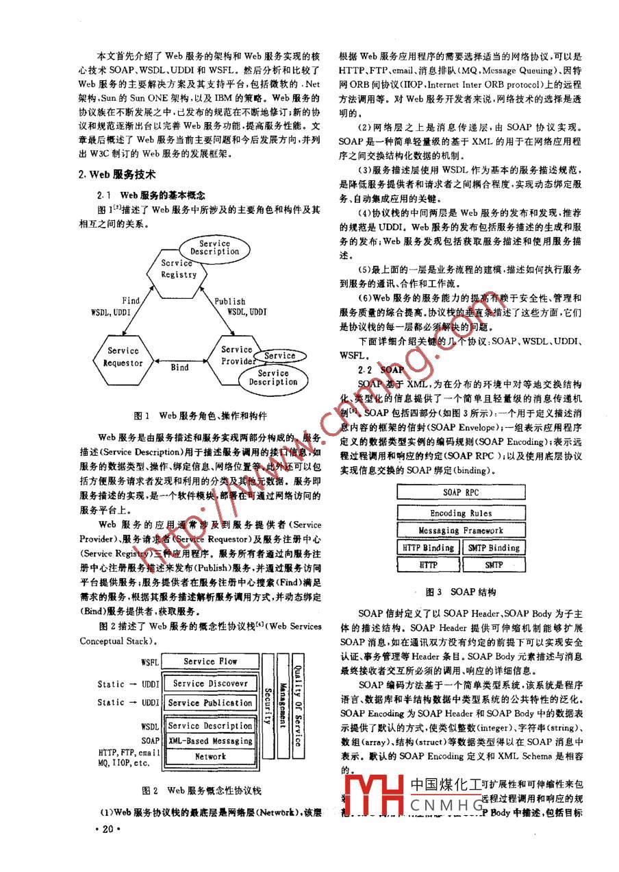 計算機科學2004Vol. 31N2.4Web服務技術的分析*)羅玲'白曉穎2(清華大學計算機科學與技術系北京 100084)有要Web服務提出了一種新的分布式環(huán)境中應用系統(tǒng)的集成模式,并基于XML標準定義了一組簡單、開放的協(xié)議規(guī)范。它的主要目標就是構筑一個通用的平臺無關、語言無關的技術層,以實現(xiàn)各種異構平臺上的應用間的互連互通。文聿首先介紹了Web 服壽架構以及該架構中的角色和操作,分析了Web 服務技術系列的標準協(xié)議SOAP/WSDL/UDDI/WSFL,并討論和比較了主要的Web服務的解決方案和支撐平臺。Web服務是不斷發(fā)展的休系,Web服務技術還不成熟,文章分析了Web服務在服務質量、安全、性能等方面存在的技術問題,以及今后主要發(fā)展方向。關鍵詞Web 服務,XML可擴展置標語言,SOAP簡單對象訪問協(xié)議, WSDL Web服務描述語言,UDDI統(tǒng)一描述、發(fā)現(xiàn)和集成,WSFL Web服務流語言而AA Survey of Web Services TechnologyLUO Ling' BAI Xiao-Ying'(Department of Computer Science and Technology. Toinghua University, Being 10084)Abstract Web Services technology introduces a new model for application integration in a distibuted environment.To support the model, a set of simple and open protocols and standards are defined based on XML. The objective isto establish a universal technical layer independent of hardware/sofware platforms and programming languages, andthus to enforce intercommunication and interoperationmong Web applications. The paper first reviews Web ServiceArchitecture and the roles and operations involved. It then analyzes Web Service Protocol Stack, including SOAP/WSDL/UDDI/WSFL. The paper also dsusses and compares major vendor solutions and platorms supporting WebServices. The paper finally analyzes the existing problems, such as quality . security and performance, and points outthe directions for future research and development.Keywords Web Services, XML (Extensible Markup Language). SOAP (Simple Obiect Access Protocol), WSDL(Web Services Description Language), UDDI (Universal Description, Discovery and Integration), WSFL (WebServices Flow Language)的RMI等)相比,采用Web服務技術的解決方案具有以下優(yōu)1.概述點:Internet技術的廣泛普及和迅速發(fā)展極大地促進了Web.松散耦合性.采用Web服務技術,客戶端不需在程序應用的發(fā)展.其目標是最大限度地實現(xiàn)各種網(wǎng)絡資源的共享,中 綁定連接對象,而是動態(tài)獲取服務端的地址,動態(tài)建立連接向用戶提供更豐富的資源、更方便快捷的信息交互。由于各種和獲取服務。 只要服務調用的界面不變, Web服務地址或服Web應用軟/硬件平臺的干差萬別,開發(fā)語言、通信協(xié)議和數(shù)務 實現(xiàn)方式的變化對調用者都是透明的。這種松敞耦合關系據(jù)交換的格式也不盡相同,如何提高異構的網(wǎng)絡結點之間的提高了基于Web服務架構建立的系統(tǒng)的靈活性和可擴展性。互操作能力成為實現(xiàn)Web應用的互連互通、降低系統(tǒng)集成代.簡單性。 Web 服務采用XML技術定義其協(xié)議棧,價的關鍵。Web服務技術就是為了更簡單更有效地解決這一XML 是開放環(huán)境下數(shù)據(jù)描述標準,它的簡單性、可擴展性和問題而產(chǎn)生的。規(guī)范化使Web服務的實現(xiàn)比傳統(tǒng)的實現(xiàn)技術更簡單高效,并Web服務由W3C聯(lián)盟制定的-系列標準組成,用來促且便于設計 .開發(fā)集成和維護業(yè)務系統(tǒng)。進跨平臺的程序間的通信4,它基于HTTP等網(wǎng)絡傳輸協(xié).高度可集成性。Web服務采取簡單易理解的標準Web議,采用結構化的信息建模語言XML,定義了信息交換協(xié)議協(xié)議作 為服務界面和協(xié)議描述的規(guī)范,屏蔽了不同平臺的差SOAP(Simple Object Acess Protocol,簡單對象訪向協(xié)議)、異,而且對于用CORBA、DCOM、EJB等不同技術實現(xiàn)的組服務描述規(guī)范WSDL (Web Service Description Language,件 都能夠高度地集成。Web服務描述語盲)、服務發(fā)布注冊機制UDDI(Universal.規(guī)范性.由于使用規(guī)范的XML格式描述服務,Web服Description ,Discovery end Integration.統(tǒng)- - 描述發(fā)現(xiàn)集成)、務具有較強的機器可理解性,易于程序實現(xiàn)動態(tài)的發(fā)現(xiàn)、連接以及描述Web服務工作流的WSFL(WebServicesFlow和調用異地服務。language . Web服務工作流語言)。目前,針對Web服務的服●開放性和行業(yè)支持。Web服務基于XML,建立了開放務質量、安全性、可靠性、事務處理、路由等方面的協(xié)議都在不的 協(xié)議族和技術規(guī)范,并得到工業(yè)界的廣泛支持.大型軟件公斷的研究和完善中。中國煤化工!開發(fā)者快速創(chuàng)建和與傳統(tǒng)的分布式計算技術(如DCOM、CORBA以及Java部署VIYHCNMHG# )國家科技攻關項目:奧運會信息系統(tǒng)集成酬試總體方案及粲成測鋱管理平臺的預價(041500).尹理鑰士耕死生. 由曉穎:講師?!?9.本文首先介紹了Web服務的架構和Web服務實現(xiàn)的核根據(jù) Web服務應用程序的衢要選擇適當?shù)木W(wǎng)絡協(xié)議,可以是心技術SOAP、WSDL.UDDI和WSFL.然后分析和比較了HTTP.FTP vemail.消息排隊(MQ ,Message Queuing).因特Web服務的主要解決方案及其支持平臺,包括微軟的.Net網(wǎng) ORB間協(xié)議(IOP , Internet Inter ORB protocol) 上的遠程架構,Sun的Sun ONE架構以及IBM的策略。Web 服務的方法調用等。 對Web服務開發(fā)者來說,網(wǎng)絡技術的選擇是透協(xié)議族在不斷發(fā)展之中,已發(fā)布的規(guī)范在不斷