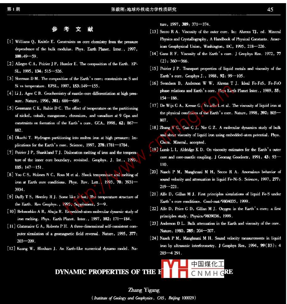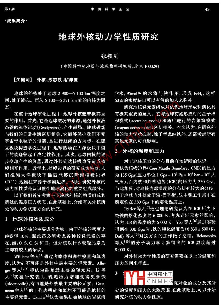 第1期中國科學(xué)基金成果簡介地球外核動(dòng)力學(xué)性質(zhì)研究張毅剛(中國科學(xué)院地質(zhì)與地球物理研究所,北京100029)[關(guān)鍵詞]外核,液態(tài)鐵,粘滯度地球的外核處于地球29005100km深度之含水,95ml%的水將與鐵作用,形成FeH2,這樣間,處于液態(tài)。而從51006371km處的內(nèi)核為固60%的密度缺口可以有氫的加入來彌補(bǔ)態(tài)研究地核輕元素組成對認(rèn)識地球形成和演化具在整個(gè)地球演化過程中,地球外核起著極其重有極其重要的意義。它與地球初始形成時(shí)的星子堆要的作用。首先,它是地球磁場的來源,通過外核液積模式( accretion model)和隨后進(jìn)行的巖漿海模式態(tài)鐵的流體運(yùn)動(dòng)(G∞ dynamo),產(chǎn)生磁場。地球磁場( magma ocean model)密切相關(guān)。本文認(rèn)為,在研究外與我們的日常生活密切相關(guān),它能夠保護(hù)我們不受核的動(dòng)力學(xué)狀態(tài)時(shí),除了考慮純鐵外,還需考慮所有宇宙帶電粒子的侵襲,是進(jìn)行航海的方向標(biāo)。在建其他元素的可能影響。立板塊構(gòu)造學(xué)說過程中,地球磁場在大洋板塊中留2外核的溫度和壓力下的痕跡曾起了決定性作用。其次,地球內(nèi)核的逐步冷卻產(chǎn)生的熱量,通過外核到達(dá)核幔邊界造成核對于地核壓力的分布目前有較清晰的認(rèn)識幔相互作用。近年來,核幔邊界的研究成為熱點(diǎn),人般認(rèn)為核幔邊界( Core Mantle boundary,CMB)的壓力們推測大洋板塊下插后能夠沉降到核幔邊界為135cpa(壓力單位1cpa=10Pa=10bar≈104大D’),地幔柱來源于核幔邊界。因此,研究外核的氣壓),而內(nèi)核和外核邊界(ICB)的壓力為330Gpao動(dòng)力學(xué)性質(zhì)是認(rèn)識整個(gè)地球演化的重要組成部分。與此相反,對地核內(nèi)部溫度的分布卻有較大的分歧。以下我們首先考察一下地球外核的物質(zhì)組成和由于地球內(nèi)外核處于液固平衡,故主要工作集中在所處的溫度壓力狀態(tài),在此基礎(chǔ)上,介紹有關(guān)外核所確定鐵在330cpa下的熔化溫度上處的動(dòng)力學(xué)狀態(tài)方面的研究Poirier等人通過理論研究認(rèn)為在ICB壓力下1地球外核物質(zhì)成分純鐵的熔化溫度約6000K,考慮到輕元素的影響,認(rèn)為ICB的溫度約為500K。Yo0等人8通過實(shí)驗(yàn)地球外核的主要成分為鐵。由于外核的密度比得到在30cpa時(shí),鐵的熔化溫度為(6830±500)K。純鐵輕10%,因此還必須考慮各種較輕元素的存Dy等人9對這方面的工作做了總結(jié)。 Belonoshko在,如:0,s,C,S和H。但外核以什么較輕元素為等人0的分子動(dòng)力學(xué)計(jì)算得出的LB溫度超過主卻有較大的爭議8000K。Williams等人通過考察體積彈性模量和氧逸對外核動(dòng)力學(xué)性質(zhì)的研究需要在以上的溫度和度,認(rèn)為硅不可能是外核中最主要的輕元素。Ale壓力區(qū)間來考慮。gre等人(2,卻認(rèn)為硅是最主要的輕元素。L等人4實(shí)驗(yàn)研究表明,硫隨壓力增加變得更親鐵中國煤化( siderophile),有可能是外核最主要的輕元素。GesCNMHG究對象的成分及其所mann等人5的工作表明硅和氧均不可能是地核的處的溫度和壓力的大致范圍,在此基礎(chǔ)上,可以開始主要輕元素。 Okuchile6認(rèn)為如果初始地球的巖漿海研究外核的動(dòng)力學(xué)性質(zhì)。本文于1999年7月29日收到中國科學(xué)基金2000年外核處于不斷的流動(dòng)狀態(tài),動(dòng)力學(xué)性質(zhì)包括擴(kuò)夠使該系統(tǒng)的粘滯度到107Pa·s。但在外核溫度和散系數(shù)、粘滯度、熱導(dǎo)率、電導(dǎo)率等,其中最主要的動(dòng)壓力下該系統(tǒng)的行為是否仍然如此現(xiàn)在無法知道。力學(xué)性質(zhì)是粘滯度。粘滯度反映的是物質(zhì)流動(dòng)快慢近期的理論計(jì)算表明S對液態(tài)鐵的粘滯度影響不方面的性質(zhì),主要有2種,即剪切粘滯度( shear vis-大121,而0甚至?xí)档虵eO系統(tǒng)的粘滯度2cosy和體粘滯度( bulk viscosity)。剪切粘滯度是模研究流體流動(dòng)與電磁場相互作用的學(xué)科叫做磁擬外核地核發(fā)電機(jī)的基本參數(shù)2。體粘滯度則流體力學(xué)( magnetohydrodynamics)為研究地核發(fā)電主要應(yīng)用于考察物質(zhì)對地震波的吸收。機(jī)的具體過程,需要解一系列復(fù)雜的非線性偏微分目前,地球外核粘滯度的具體數(shù)值存在很大的方程。其中所要考慮的力包括科里奧利力、粘滯力爭議1對前人的研究做了概要性總結(jié)。各和洛倫茲力。其中粘滯力和科里奧利力的相對重要種估計(jì)方法所得結(jié)果的差異達(dá)到104級。這些結(jié)果性可以用 Ekman數(shù)來表達(dá)。 Ekman數(shù)的定義為可以分為2種,一種是通過各種方法進(jìn)行理論計(jì)算,v/(2),其中為粘滯度,p為流體密度為地球另一種則是實(shí)際觀測。旋轉(zhuǎn)速度,L為流體厚度。通過計(jì)算表明在外核中首先在剪切粘滯度方面,通過各種液態(tài)金屬理相對于科里奧利力,粘滯力可以忽略不計(jì)。外核處論計(jì)算得出的值大約為10-2Pa·sl4-16。最近,De于一種小尺度的循環(huán)和紊流狀態(tài),而不是大尺度的Wjs!使用 first-principle分子動(dòng)力學(xué)方法計(jì)算了液整體循環(huán)。外核液態(tài)鐵較小的粘滯度還對進(jìn)行地核態(tài)鐵在外核條件下的剪切粘滯度。他們使用的方法發(fā)電機(jī)( geodynamo)的模擬造成了很