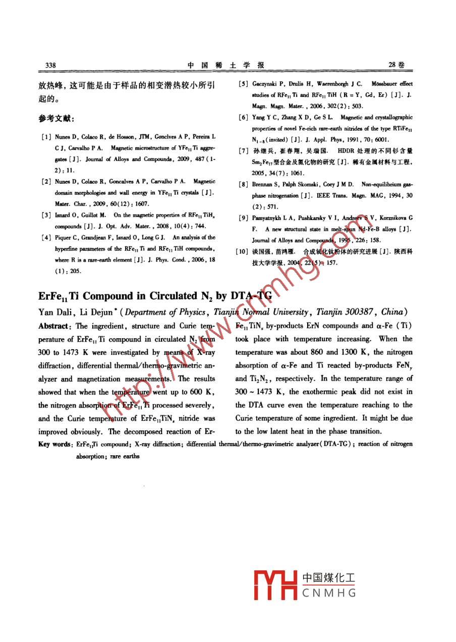 第28卷第3期國(guó)稀土學(xué)報(bào)2010年6月JOURNAL OF THE CHINESE RARE EARTH SOCIETYErFe1T化合物在流動(dòng)氮?dú)夥罩械牟顭釤嶂胤治鰢?yán)達(dá)利,李德軍(天津師范大學(xué)物理系,天津300387)摘要:通過(guò)X射線衍射(XRD)、差熱熱重( DTA-TG)聯(lián)用儀以及磁測(cè)量等手段研究了EFe1T化合物在流動(dòng)氮?dú)夥諒氖覝?-300K)到1473K升溫過(guò)程中成分、結(jié)構(gòu)及居里溫度等變化行為。結(jié)果表明,溫度為600K左右時(shí), ErFeu Ti化合物吸氮反應(yīng)最劇烈,吸氮以后化合物的居里溫度Tc有明顯提高。當(dāng)溫度較高時(shí), ErFen Ti可能部分分解為ErN,aFe(T)。afe和們分別在860和130K左右發(fā)生吸氮反應(yīng),生成FeN,和T2N2。在整個(gè)升溫過(guò)程中,DTA曲線未因樣品升溫至某成分的居里點(diǎn)發(fā)生而出現(xiàn)明顯放熱峰,這可能是因?yàn)闃悠返南嘧儩摕彷^小所引起的。關(guān)鍵詞: ErFe T化合物:x射線衍射;差熱熱重分析( DTA-TG);吸氮反應(yīng);稀土中圖分類號(hào):TG113;0482文獻(xiàn)標(biāo)識(shí)碼:A文章編號(hào):1000-43431(2010)03-035-04近來(lái),在對(duì)新型稀土鐵金屬間化合物的研究的比例,在充入氬氣的真空電弧爐中進(jìn)行熔煉,試中,主要集中在2:17型的RE2Fet和1:12型的樣反復(fù)熔煉4次以保證成分均勻。采用美國(guó)PynsREFe12-M,兩個(gè)系列。大量的實(shí)驗(yàn)研究表明, Diamond DTA-TG熱重/差熱聯(lián)用分析儀研究樣品REFe2(RE為稀土)化合物是不存在的,只有在加及其氮化物的熱穩(wěn)定性及可能的相變。將 ErFeuti入作為致穩(wěn)元素的第三方元素(M=Ti,Cr,V,M母合金破碎成小于38m的粉末,取2.36mg的等)之后,系統(tǒng)才能形成穩(wěn)定的具ThMn2型結(jié)構(gòu)的粉末樣品在室溫下放入 DTA-TG分析儀的樣品盤REFe12,M,化合物,其中 REFen T因其較好的磁中,從進(jìn)氣管充人高純度的N2,氣壓約為10Pa晶各向異性和較高的居里溫度尤為引人注意。從室溫(-300K)開(kāi)始以10℃mn的升溫速率升研究發(fā)現(xiàn)3-,在此類化合物中,引入間隙原子溫至1473K,升溫結(jié)束后,樣品仍在N2的保護(hù)下(如H,N,C等)或采用其他元素(如A,Ca,Si冷卻至室溫,取出粉末。用X射線衍射儀對(duì)DTA等)部分替代鐵,可能會(huì)加大Fe-Fe間的距離,改TG測(cè)試前后的粉末樣品進(jìn)行測(cè)量,以確定樣品的善其磁性能特別是居里溫度及磁晶各向異性。目相成分及晶體結(jié)構(gòu)與晶格參數(shù)。采用振動(dòng)樣品磁前,對(duì)REFe1T化合物的吸氮研究已有一些報(bào)強(qiáng)計(jì)(SM)在弱場(chǎng)(40kAm2)下測(cè)量DATG測(cè)道,但是對(duì)REFe1T化合物的熱穩(wěn)定性及最佳試前后樣品的熱磁曲線。吸氮溫度的研究還不多為了研究EHn1的熱穩(wěn)2結(jié)果與討論從室溫(約300K)升溫到1473K進(jìn)行差熱-熱重圖1為ErFe1T樣品粉末在流動(dòng)的氮?dú)夥諊鶧TA-TG)測(cè)試,并用X射線衍射和磁測(cè)量手段來(lái)中進(jìn)行 DTA-TG測(cè)試前后的X射線衍射圖,下部研究差熱熱重( DTA-TG)測(cè)試前后樣品的結(jié)構(gòu)成分別示出 ErFe t的 JCPDS卡片的衍射峰位分及居里溫度等變化行為。DTA-TG測(cè)試前(吸氮前)的ErFe1T粉末樣品的X1實(shí)驗(yàn)射線衍射圖譜可以看出樣品主相為ThMn12型結(jié)構(gòu),有少量aFe和Ti相,而且可能因?yàn)闃悠肺唇?jīng)過(guò)退將純度均高于99.95%的Er,Fe,T按照預(yù)定火處理等原因造成圖譜上存在許多“毛刺”和較高收稿日期:2010-01-12;修訂日期:2010-04-07M凵中國(guó)煤化工基金項(xiàng)目:國(guó)家自然科學(xué)基金資助項(xiàng)目(50872094);天津師范大學(xué)青年CNMHG作者簡(jiǎn)介:嚴(yán)達(dá)利(1983-),男,碩士,助理實(shí)驗(yàn)師;研究方向:磁學(xué)與磁性材料通訊聯(lián)系人(E-mail: jejunI@ mail. tinu.edu,cm中國(guó)稀土學(xué)報(bào)28卷After nitrogen absorption0.4787mm,晶胞體積為V=0.34527mm3??梢?jiàn)氮化后的樣品晶胞參數(shù)較氮化前均有所增長(zhǎng),這與X射線衍射峰向小角偏移是一致的如圖2給出了 ErFe T樣品和經(jīng) DTA-TG測(cè)試后的ErFe1TN2樣品在低場(chǎng)(40kAm1)下的熱磁Before nitrogen absorption曲線,從中可以得到ErFe1T的居里溫度T約為527K; ErFe TiN的居里溫度Tc約為548K。從前的研究表明, RFelITiN,化合物居里溫度比RFeT高是由于在氮化時(shí)氮原子擇優(yōu)進(jìn)入REFe1T的某些晶位,增大了最近鄰FeFe原子間距,從而引圖1ErPe1T粉末樣品DATG測(cè)試前后的x射線多晶起了FeFe交換作用的增強(qiáng)°。Yang等。報(bào)道Er粉末衍射譜Fe1T化合物居里點(diǎn)為530K, ErFe, TiN,化合物Fig. 1 X-ray powder diffraction pattem of ErFen Ti sample be居里點(diǎn)為610K。與之前相比,本實(shí)驗(yàn)中ErFe1fore and after DTA-TGTN,居里溫度偏低,可能是因?yàn)閷?shí)驗(yàn)條件不一樣(如所加氮?dú)鈮簭?qiáng)、升溫程序等)導(dǎo)致樣品吸氮量的背底。經(jīng)過(guò)擬合計(jì)算,得出其晶胞參數(shù)為a=不一樣所致。0.8479mm,c=0.4782mm,晶胞體積為V=圖3給出了在流動(dòng)氮?dú)夥罩袠悠窂氖覝?約0.34384nm3。從粉末樣品DATG測(cè)試后(吸氮300K)升溫到1473K過(guò)程吸放熱情況DTA以及樣后)的X射線衍射譜中可看出樣品(用Ee1TN,品的質(zhì)量(TG)及其微分(DTG)隨溫度變化的關(guān)表示具有同樣的ThMn型菱方晶體結(jié)構(gòu)(峰型沒(méi)系。一般說(shuō)來(lái),稀土鐵系合金粉末的氮化過(guò)程分變化),但衍射峰向小角度有一些偏移,且個(gè)別衍為