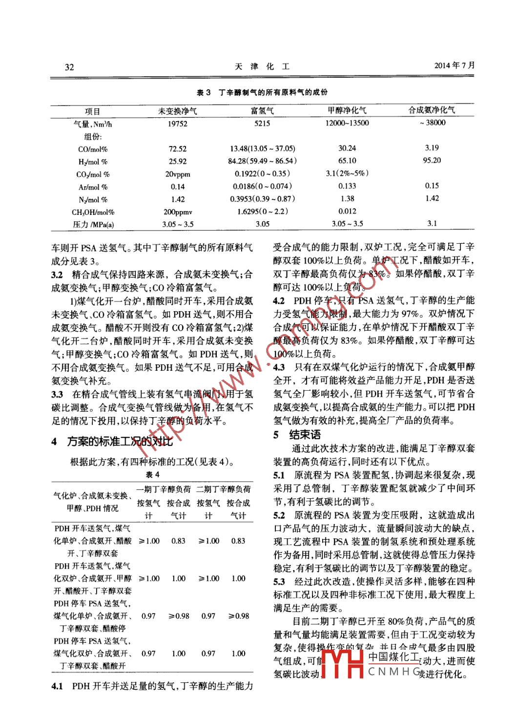 第28卷第4期天津化工Vol 28 No 42014年7月Tianjin Chemical IndustryJul. 2014·科研與生產(chǎn)丁辛醇合成氣及氫氣改造方案研究和選擇任兆平張衛(wèi)波(天津渤化永利化工股份有限公司,天津300420)摘要:目前,永利化工新區(qū)正處于丁辛醇擴(kuò)建裝置的投料試車階段,結(jié)合煤氣化現(xiàn)有負(fù)荷條件下,合成氨甲醇裝置進(jìn)行技術(shù)改造,保證丁辛醇雙套裝置高負(fù)荷運(yùn)行。關(guān)鍵詞:氫氣;精合成氣;負(fù)荷;洗滌;凈化氣doi:10.3969/ssn.1008-1267201404.011中圖分類號:TQ22312文獻(xiàn)標(biāo)志碼:B文章編號:1008-1267(2014)04-0030-031改造前氫氣合成氣來源簡介2改造存在的問題及解決方案來自合成氨變換裝置的變換氣和未變換氣經(jīng)21送丁辛醇的產(chǎn)品氣質(zhì)量問題過低溫甲醇洗裝置將氣體中絕大部分的CO2H2S目前,送往丁辛醇的產(chǎn)品氫氣為997%以上脫除干凈,之后進(jìn)入到變壓吸附裝置(簡稱PSA)。(CO2工況下),精合成氣的CO含量48%~49%,N2變壓吸附的基本原理是利用吸附劑對吸附質(zhì)小于2%,HC為10~1.05;其他雜質(zhì)微量。在不同分壓下有不同的吸附容量,并且在一定壓力經(jīng)過與丁辛醇分廠交流得知:產(chǎn)品氫氣中的下對被分離的氣體混合物的各組分又有選擇吸附CO會使雜醇增加,最終丁辛醇產(chǎn)品質(zhì)量下降;精合的特性,加壓吸附除去原料氣中雜質(zhì)組分,減壓脫成氣中的HS含量會引起催化劑中毒,要求在01附這些雜質(zhì)而使吸附劑獲得再生。因此,采用多個(gè)10%以下,其他雜質(zhì)如氮?dú)?、二氧化碳、等均為惰性吸附?循環(huán)地變動(dòng)所組合的各吸附床壓力,就可氣體,對丁辛醇的產(chǎn)品質(zhì)量沒有太大影響,這也為以達(dá)到連續(xù)分離氣體混合物的目的下一步產(chǎn)品氣來源上提供了前提條件變壓吸附裝置分為兩個(gè)系統(tǒng),一個(gè)系統(tǒng)為提氫22送丁辛醇的產(chǎn)品氣量來源問題段,另一各系統(tǒng)為預(yù)處理系統(tǒng)。提氫系統(tǒng)是將來自合成氨的PSA裝置滿負(fù)荷設(shè)計(jì)生產(chǎn)能力為酸脫變換氣脫除其中的甲醇、一氧化碳和二氧化碳16920Nmh的氫氣和26880Nmh的精合成氣,而等雜質(zhì),以得到氫純度≥99%合格產(chǎn)品氫氣送目前PSA制氫實(shí)際能力為21820Nm3h往丁辛醇裝置。預(yù)處理系統(tǒng)是將來自酸脫未變換氣而兩套丁辛醇裝置在100%負(fù)荷情況下:以及來自一氧化碳冷箱的粗氫氣脫除其中的甲醇、精合成氣220002=44000Nm/h氧化碳和二氧化碳等雜質(zhì)而得到精合成氣。由于氫氣11500×2=23000Nm/h精合成氣中的氫碳比偏小,因此從制氫后引一股氫很顯然,氫氣以及合成氣的氣量均不能滿足丁氣進(jìn)行氫碳比的調(diào)節(jié),從而使精合成氣的氫碳比達(dá)辛醇的需要。到丁辛醇要求指標(biāo)后送往丁辛醇。如圖1所示。221氫氣來源目前,永利化工已經(jīng)與渤化石化簽訂協(xié)議,采糖臺成氣購PDH(丙烷脫氫)項(xiàng)目的副產(chǎn)氫氣,但由于PDH開工晚于丁辛醇二期,所以當(dāng)前還不能解決現(xiàn)在氫氣供應(yīng)不足的問題,合成氨PSA裝置就算超負(fù)荷運(yùn)行也就只能滿足產(chǎn)品氫氣的需求,而對于精合成氣酸配未變換氣FA預(yù)處理中的配氫量則無法滿足。酸脫變換氣FA氧丁辛醇一期由于精凵中國煤化工要求其他雜質(zhì)不會對丁CNMHG又考慮酸脫出收稿日期:201403-03第28卷第4期任兆平等:丁辛醇合成氣及氫氣改造方案研究和選擇口的變換氣中的氫氣含量為95.2%,氮?dú)?43%,二72%,實(shí)際CO供應(yīng)量僅為2677Nm}h。即使把未氧化碳含量0001%硫化氫含量01×10%以下,能變換氣產(chǎn)能發(fā)揮110%,C0供應(yīng)量仍的較大的缺口。夠滿足丁辛醇精合成氣的需要,為此,在酸脫變換2222甲醇凈化后合成氣氣出口去PSA裝置的管線上加了一股富氫氣去精甲醇酸脫出口的合成氣各組分H165.54%;N2合成氣總管上用來給精合成氣進(jìn)行粗配,由丁辛醇1.37%);CO2961%;CO2.71%分廠進(jìn)行精配,以保證氫碳比合格這股合成氣由于含有二氧化碳近3%,作為丁2.2.2精合成氣來源辛醇的精合成氣會使丁辛醇的能耗增加很多;把這2221合成氨凈化后未變換氣股甲醇合成氣和一氧化碳冷箱的富氫氣并入PSA在現(xiàn)有的流程中精合成氣的主要來源是酸脫預(yù)處理中后,FA預(yù)處理能力不足,需要增加吸附的未變換氣以及來自一氧化碳冷箱的粗氫氣,未變塔和相應(yīng)的程控閥門。還要增加較大的投資。更關(guān)換氣生產(chǎn)能力本身的上限為110%,同時(shí)受變換氣鍵的是PSA周邊沒有安裝塔器和程控閥門的位置,負(fù)荷的影響其兩者關(guān)系見表1。因此這一處理方案仍然行不通。表1經(jīng)過討論研究,甲醇酸脫可以把合成氣中的未變換相對應(yīng)的氣量相應(yīng)變換系統(tǒng)相對應(yīng)的氣量CO2基本能脫除干凈,那這股氣體也可不經(jīng)過PSA系統(tǒng)負(fù)荷(洗滌后)最小負(fù)荷(洗滌后)預(yù)處理直接進(jìn)行配氣,這樣就解決了PA預(yù)處理110%4136288738工序的能力瓶頸,能夠達(dá)到精合成氣的要求。但甲100%38608醇合成氣中就缺少了CO2組分,為此,可以在CC72.5%壓縮機(jī)中間抽氣中有52MPa的產(chǎn)品CO2,把CO2配80%入甲醇合成氣中補(bǔ)充甲醇合成氣中缺少的CO2成70%份。這部分CO2中含總硫?yàn)?×10%以下。但已超過50%2306761994了甲醇合成允許的總硫含量,可以通過精脫硫的方表2為合成氨裝置在酸脫工序的