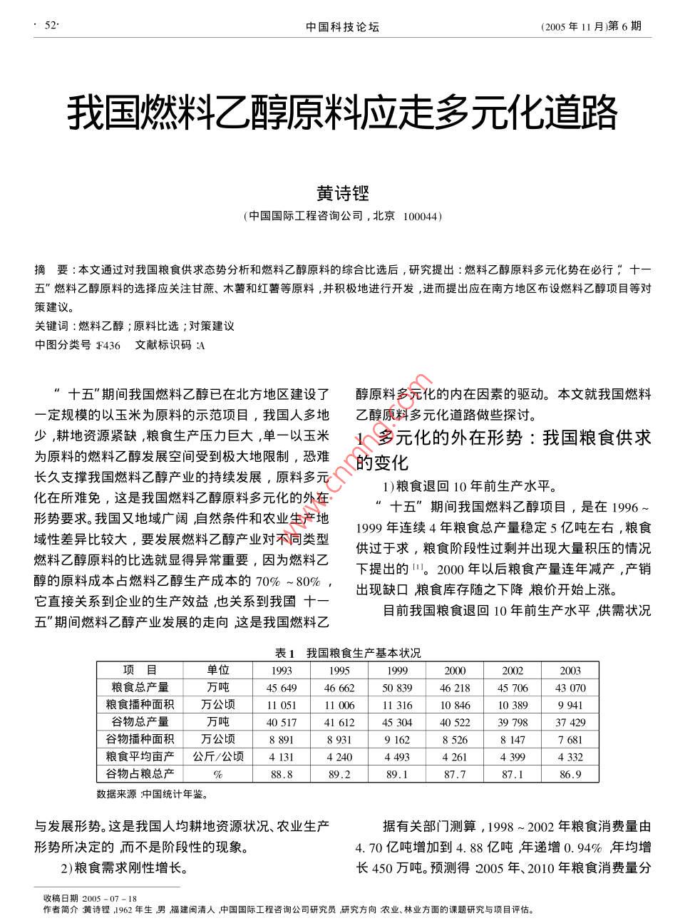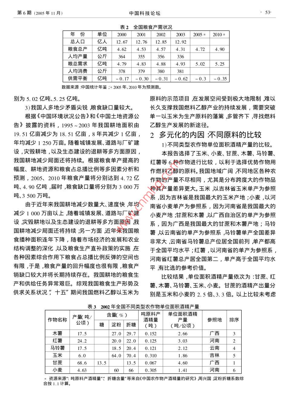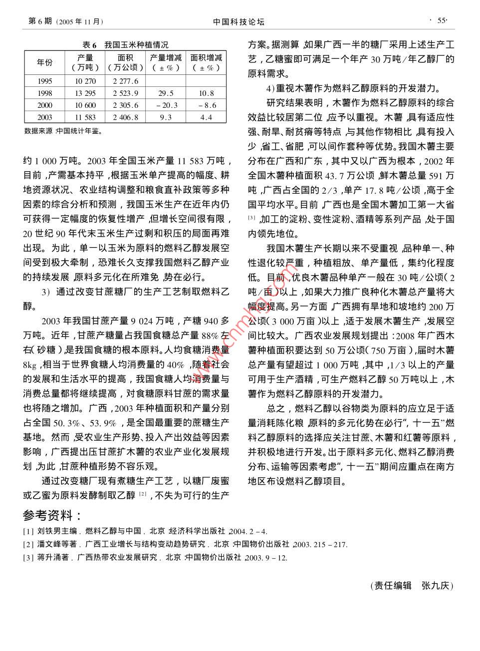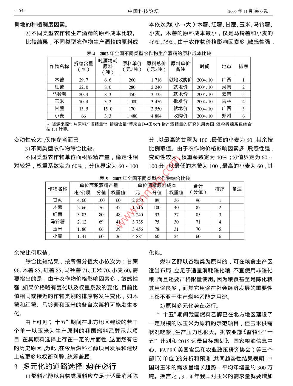 中國科技論壇(2005年11月)第6期我國燃米乙醇原米應(yīng)走多元化道路黃詩鏗(中國國際工程咨詢公司,北京100044)摘要∶本文通過對我國糧食供求態(tài)勢分析和燃料乙醇原料的綜合比選后,研究提岀∶燃料乙醇原料多元化勢在必行;十·五”燃料乙醇原料旳選擇應(yīng)關(guān)注甘蔗、木薯和紅瞽等原料,并積極地進(jìn)行開發(fā),進(jìn)而提岀應(yīng)在南方地區(qū)布設(shè)燃料乙醇項目等對策建議關(guān)鍵詞:燃料乙醇;原料比選;對策建議中圖分類號F436文獻(xiàn)標(biāo)識碼:A十五”期間我國燃料乙醇已在北方地區(qū)建設(shè)了醇原料多元化的內(nèi)在因素的驅(qū)動。本文就我國燃料一定規(guī)模的以玉米為原料的示范項目,我國人多地乙醇原料多元化道路做些探討。少,耕地資源緊缺,糧食生產(chǎn)壓力巨大單一以玉米1多元化的外在形勢:我國糧食供求為原料的燃料乙醇發(fā)展空間受到極大地限制,恐難的變化1)糧食退回10年前生產(chǎn)水平化在所難免,這是我國燃料乙醇原料多元化的外在十五”期間我國燃料乙醇項目,是在1996形勢要求。我國又地域廣闊自然條件和農(nóng)業(yè)生產(chǎn)地域性差異比較大,要發(fā)展燃料乙醇產(chǎn)業(yè)對不同類型1999年連續(xù)4年糧食總產(chǎn)量穩(wěn)定5億噸左右,糧食供過于求,糧食階段性過剩并出現(xiàn)大量積壓的情況燃料乙醇原料的比選就顯得異常重要,因為燃料乙下提出的。2000年以后糧食產(chǎn)量連年減產(chǎn),產(chǎn)銷醇的原料成本占燃料乙醇生產(chǎn)成本的70%~80%它直接關(guān)系到企業(yè)的生產(chǎn)效益也關(guān)系到我國十出現(xiàn)缺口糧食庫存隨之下降糧價開始上漲目前我國糧食退回10年前生產(chǎn)水平供需狀況五"期間燃料乙醇產(chǎn)業(yè)發(fā)展的走向這是我國燃料乙表1我國糧食生產(chǎn)基本狀況單位糧1食總產(chǎn)量萬噸45466625083946218457043070糧食播種面積萬公頃l1051110061131610846103899941谷物總產(chǎn)量萬噸4051741612453044052237429谷物播種面積萬公頃889189319162852681477681糧食平均畝產(chǎn)公斤/公頃413142404493426143994332谷物占糧總產(chǎn)89.287.787.186.9數(shù)據(jù)來源中國統(tǒng)計年鑒。與發(fā)展形勢。這是我國人均耕地資源狀況、農(nóng)業(yè)生產(chǎn)據(jù)有關(guān)部門測算,1998~2002年糧食消費量由形勢所決定的而不是階段性的現(xiàn)象4.70億噸增加到4.88億噸年遞增.94%年均增2)糧食需求剛性增長。長450萬噸。預(yù)測得2005年、2010年糧食消費量分收稿日期2005-07-18作者簡介黃詩鏗,1962年生男福建閩清人中國國際工程咨詢公司研究員研究方向農(nóng)業(yè)、林業(yè)方面的課題研究與項目評估。第6期(2005年11月)中國科技論壇表2全國糧食產(chǎn)需狀況年份單位20002001200220032005*2010總?cè)丝趦|人12.6712.7612.8512.92糧食總產(chǎn)億噸4.624.534.574.31472490人均產(chǎn)量公斤336糧總需求億噸4.794.83人均消費公斤378379380381供需平衡億噸-00.30-0.31數(shù)據(jù)來源中國統(tǒng)計年鑒;2005年、2010年為預(yù)測數(shù)。別為5.02億噸、5.25億噸原料的示范項目在發(fā)展空間受到極大地限制難以3)我國人多地少矛盾尖銳糧食缺口量較大。長久支撐我國燃料乙醇產(chǎn)業(yè)的持續(xù)發(fā)展,需要突破根據(jù)《中國環(huán)境狀況公告》和《中國土地資源公單一以玉米為生產(chǎn)原料的藩籬多管齊下,尋找燃料告》披露的資料,1995~2003年我國耕地面積由乙醇生產(chǎn)發(fā)展的新途徑。19.51億畝減少為18.51億畝,8年共減少1億畝,2多元化的內(nèi)因不同原料的比較年均減少1250萬畝。隨著城鎮(zhèn)發(fā)展、道路與廠礦建1)不同類型農(nóng)作物單位面積酒精產(chǎn)量的比較。設(shè),災(zāi)毀耕地,以及生態(tài)建設(shè)的退耕等多方面原因本報告選擇了玉米、小麥、甘蔗、木薯、馬鈴薯、我國耕地減少局面還將持續(xù)。根據(jù)糧食單產(chǎn)提高的紅薯等6種作物進(jìn)行比較,以利于選擇優(yōu)勢作物用幅度、耕地資源和糧食占總播比例等多因素分析和作燃料乙醇的原料。我國地域廣闊不同地區(qū)各種農(nóng)預(yù)測,20052010年糧食產(chǎn)量將分別達(dá)到4.72億作物的產(chǎn)量不盡相同,尤其是分布跨度大的作物品噸、4.90億噸,屆時,糧食缺口量將分別為3000萬種其產(chǎn)量差異更大。玉米以吉林省玉米單產(chǎn)為參照噸、3500萬噸系,因為吉林省是我國最大的玉米產(chǎn)地;小麥,以河由于近年來我國耕地減少數(shù)量大、速度快年均南省小麥單產(chǎn)為參照系,因為河南省是我國最大的減少1000萬畝以上,隨著城鎮(zhèn)發(fā)展、道路與廠礦建小麥產(chǎn)地甘蔗和木薯以廣西自治區(qū)的單產(chǎn)為參照設(shè)災(zāi)毀耕地以及生態(tài)建設(shè)的退耕等多方面原因我系,因為廣西是我國最大的甘蔗和木薯產(chǎn)地;馬鈴國耕地減少局面還將持續(xù)另一方面近年來我國糧薯以云南省的單產(chǎn)為參照系馬鈴薯單產(chǎn)全國差異食播種面積連年下降,隨著市場經(jīng)濟(jì)的發(fā)展和農(nóng)業(yè)非常大,云南省馬鈴薯總產(chǎn)位居全國前列單產(chǎn)都高結(jié)構(gòu)調(diào)整的深化以及糧食生產(chǎn)直補(bǔ)政策的實施在于全國平均水平;紅薯,以河南省的單產(chǎn)為參照系各種因素綜合作用下糧食占總播比例反彈的空間也河南省紅薯總產(chǎn)居全國第二,單