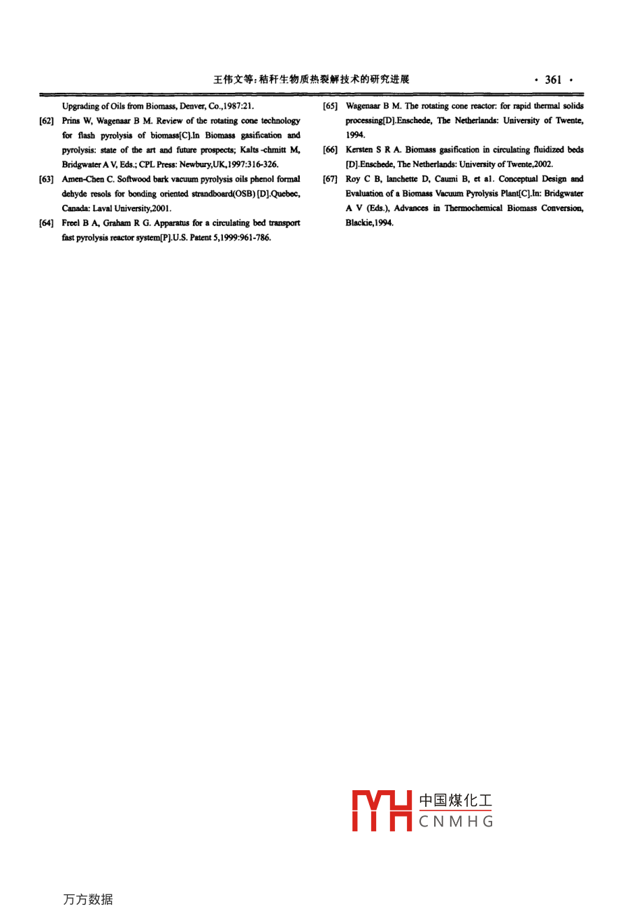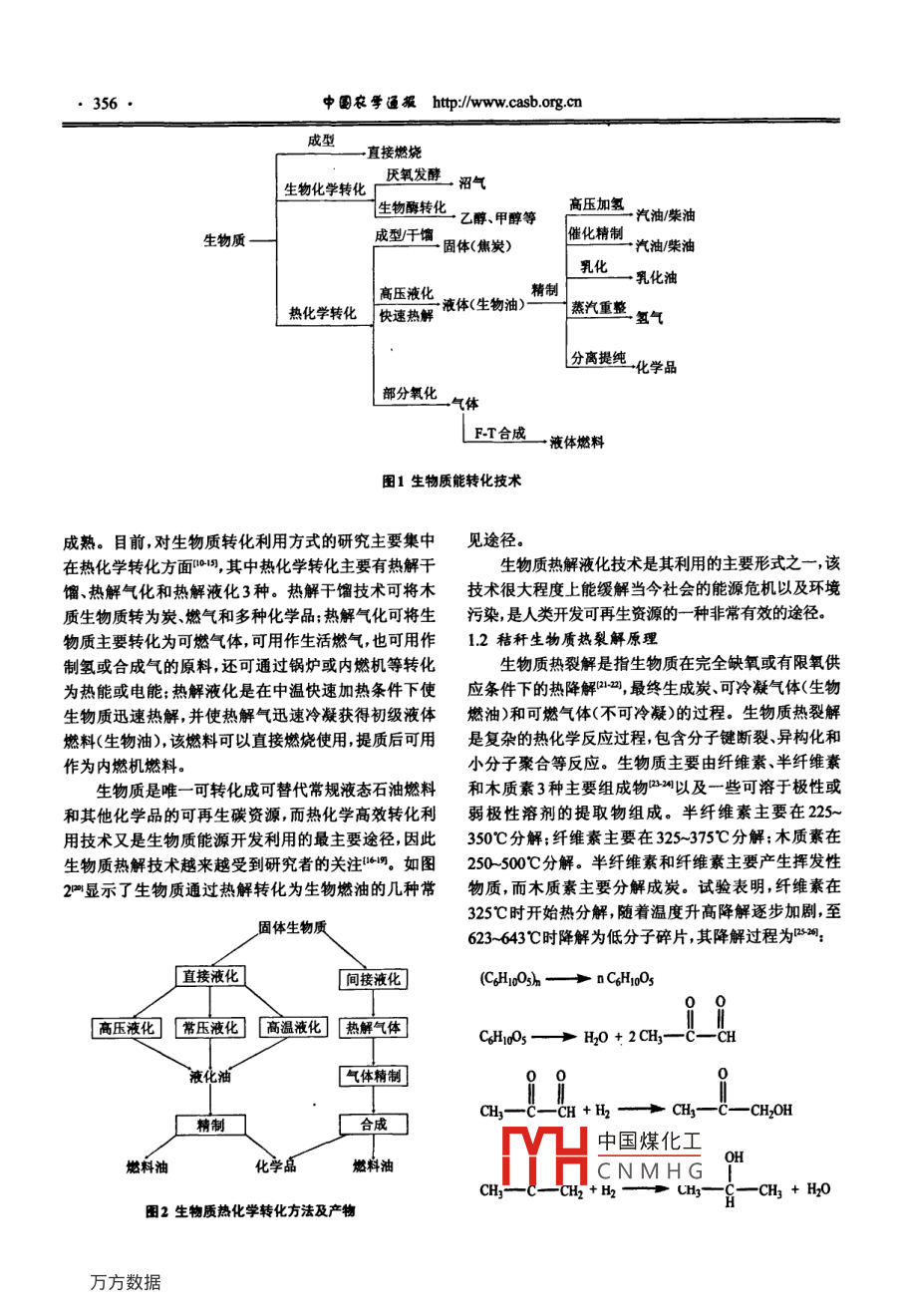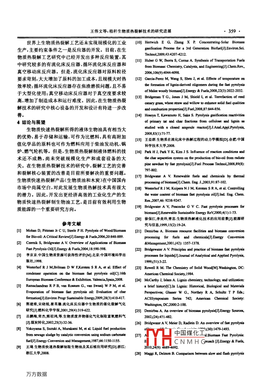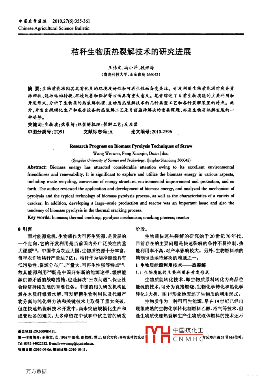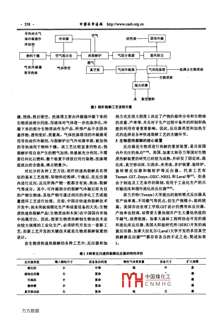 中國歡學(xué)逼擺2010,27(6):355361Chinese Agricultural Science Bulletin秸稈生物質(zhì)熱裂解技術(shù)的研究進(jìn)展王偉文,馮小芹,段繼海(青島科技大學(xué),山東青島266042)摘要:生物質(zhì)能源因其具有優(yōu)良的環(huán)境友好性和可再生性而備受關(guān)注。開發(fā)利用生物質(zhì)能源對廢棄資源回收、能源結(jié)構(gòu)轉(zhuǎn)換、環(huán)境改善和保護(hù)等方面具有重大意義。筆者綜述了目前生物質(zhì)能的主要利用和開發(fā)形式,分析了生物質(zhì)的熱裂解機(jī)理、生物質(zhì)熱裂解技術(shù)的幾種典型工藝和各種裂解裝置的特點(diǎn)。此外,開發(fā)出規(guī)?;a(chǎn)和成套設(shè)備的熱裂解工藝是目前亟待解決的重要課題,亦是生物質(zhì)熱解發(fā)展的一種趨勢。關(guān)鍵詞:生物質(zhì);熱裂解;熱裂解機(jī)理;裂解工藝;反應(yīng)器中圖分類號:TQ91文獻(xiàn)標(biāo)志碼:A論文編號:20102596Research Progress on Biomass Pyrolysis Techniques of StrawWang Weiwen, Feng Xiaoqin, Duan Jihai(Qingdao University of Science and Technology, Qingdao Shandong 266042)Abstract: Biomass energy has attracted consle attention owing to its excellent environmentalfriendliness and renewability. It is significant to explore and utilize the biomass energy in various aspects,including waste recycling, conversion of energy structure, environmental improvement and protection, and soforth. The author reviewed the application and development of biomass energy, and analyzed the mechanism ofpyrolysis and the typical technology of biomass pyrolysis process, as well as the characteristics of a variety ofcracker. In addition, developing a large-scale production and reactor was an important issue and also thetendency of biomass pyrolysis in the thermal cracking processKey words: biomass; thermal cracking: pyrolysis mechanism; cracking process; reactor0引言階段。面對能源危機(jī),生物質(zhì)作為可再生資源,是發(fā)展的生物質(zhì)快速熱裂解的研究始于20世紀(jì)70年代。一個(gè)走向,它的開發(fā)利用是當(dāng)前國內(nèi)外廣泛關(guān)注的重目前存在的主要問題是快速裂解的條件不易控制,熱犬課題。中國作為農(nóng)業(yè)大國,生物質(zhì)資源十分豐富,能利用率不高,對產(chǎn)率影響較大。另外,生物燃料油的每年農(nóng)作物秸稈產(chǎn)量達(dá)7億t。秸稈作為潔凈能源具有精制也是亟待解決的難題之一。低污染性、資源分布廣、產(chǎn)量大、可再生性強(qiáng)等特點(diǎn),1生物質(zhì)能源利用技術(shù)—熱裂解故其能源利用既是中國開拓新的能源途徑、緩解能1.1生物質(zhì)能的主要利用和開發(fā)形式源供需矛盾的戰(zhàn)略措施,也是解決“三農(nóng)問題”、保證社生物質(zhì)能轉(zhuǎn)化技術(shù),即生物質(zhì)原料轉(zhuǎn)化為高品位會經(jīng)濟(jì)持續(xù)發(fā)展的重要任務(wù)。中國的相關(guān)研發(fā)機(jī)構(gòu)雖能源的技術(shù),可分為直接燃燒、生物化學(xué)轉(zhuǎn)化和熱化學(xué)然在木質(zhì)纖維素水解、可發(fā)酵糖生物利用以及代謝產(chǎn)轉(zhuǎn)化3大類。圖1形象地表述了生物質(zhì)的利用形式物分離與純化等方法和關(guān)鍵技術(shù)上取得了重大突破生物質(zhì)作為一種可再生能源,早在19世紀(jì)已經(jīng)出但在快速熱裂解技術(shù)開發(fā)中,尚未突破規(guī)模化生產(chǎn)和現(xiàn)很成熟的生物化學(xué)轉(zhuǎn)化制燃料乙醇、沼氣等技術(shù),但成套設(shè)備的難關(guān),大多停留在中試和中試之前的研發(fā)是生物質(zhì)快速熱裂解生產(chǎn)生物質(zhì)液體燃料的技術(shù)還不中國煤化工第一作者簡介:王偉文,女,1968年出生,副教授,博士,研究方向:多相流體的流動CNMH區(qū)鄭州略3號61信箱Tel: 0532-84022752, E-mail: wwwang@qust.edu.cn收稿日期:20100906,修回日期:20101011356中國農(nóng)學(xué)逼報(bào)htp:/www.casb.org.cn直接燃燒生物化學(xué)轉(zhuǎn)化厭氧發(fā)酵沼氣生物酶轉(zhuǎn)化高壓加氫乙醇、甲醇等汽油柴油生物質(zhì)成型/干餾催化精制固體(焦炭)汽油/柴油乳化乳化油高壓液化精制熱化學(xué)轉(zhuǎn)化」「快速熱解液體(生物油)蒸汽重整L分離提純化學(xué)品部分氧化氣體LF合成一液體燃料圖1生物質(zhì)能轉(zhuǎn)化技術(shù)成熟。目前對生物質(zhì)轉(zhuǎn)化利用方式的研究主要集中見途徑在熱化學(xué)轉(zhuǎn)化方面,其中熱化學(xué)轉(zhuǎn)化主要有熱解干生物質(zhì)熱解液化技術(shù)是其利用的主要形式之一,該餾、熱解氣化和熱解液化3種。熱解干餾技術(shù)可將木技術(shù)很大程度上能緩解當(dāng)今社會的能源危機(jī)以及環(huán)境質(zhì)生物質(zhì)轉(zhuǎn)為炭燃?xì)夂投喾N化學(xué)品;熱解氣化可將生污染,是人類開發(fā)可再生資源的一種非常有效的途徑物質(zhì)主要轉(zhuǎn)化為可燃?xì)怏w可用作生活燃?xì)庖部捎米?2秸稈生物質(zhì)熱裂解原理制氫或合成氣的原料還可通過鍋爐或內(nèi)燃機(jī)等轉(zhuǎn)化生物質(zhì)熱裂解是指生物質(zhì)在完全缺氧或有限氧供為熱能或電能;熱解液化是在中溫快速加熱條件下使應(yīng)條件下的熱降解,最終生成炭、可冷凝氣體(生物生物質(zhì)迅速熱解,并使熱解氣迅速冷凝獲得初級液體燃油)和可燃?xì)怏w(不可冷凝)的過程。生物質(zhì)熱裂解燃料(生物油)該燃料可以直接燃燒使用,提質(zhì)后可用是復(fù)雜的熱化學(xué)反應(yīng)過程包含分子鍵斷裂、異