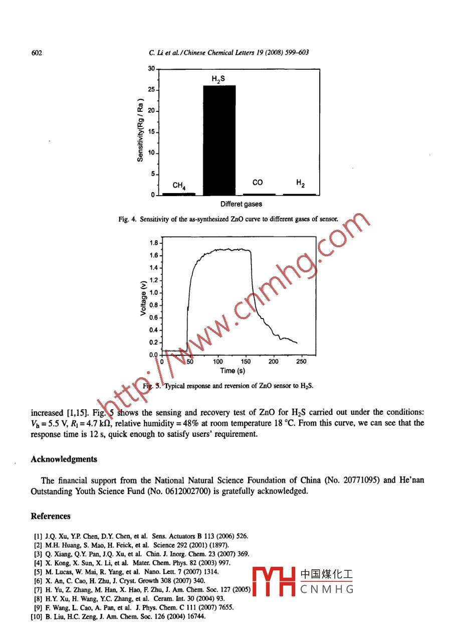 Availableonlineatwww.sciencedirect.CHINESESciencedirectCHEMICALLETTERSELSEVIERChinese Chemical Letters 19(2008)599-603www.elseviercom/locate/ccletFabrication and gas sensing property of honeycomb-like ZnoChao Li K, Zhi Shuo Yu, Shao Ming Fang Huan Xin WangYang Hai Gui, Jia Qiang Xu, Rong Feng Chen 6Henan Province Key Laboratory of Surface Interface Science, Zhengzhou University of Light IndustryZhengzhou 450002, ChinaHenan Academy of Science, Zhengzhou 450002, ChinaReceived 20 December 2007AbstractWe report the structural characterization and proposed formation mechanism of honeycomb-like ZnO conglomerationsfabricated by direct precipitation method. X-ray diffraction(XRD), energy-disperse X-ray spectrometry(EDS), scanning electronmicroscopy(SEM)showed that the as-prepared Zno calcined at 700C were micron sphere particles with honeycomb-likestructure. In the UV-vis absorbing spectrum, it was observed that there is a new additional absorption band at 260 nm, and it waspeculated that the absorption may be caused by defects on the surface and interface of honeycomb-like ZnO. The as-productsshowed high sensitivity and short response time to sulfured hydrogen gas. These results demonstrate that honeycomb-like Znoconglomerations are very promising materials for fabricating H2s gas sensorsC 2008 Chao Li. Published by Elsevier B V. on behalf of Chinese Chemical Society. All rights reservedKeywords: ZnO; Precipitation; Honeycomb-like; Gas sensing propertyAs an important wide band-gap semiconductor, zinc oxide(Zno)has unique applications [1-l1, 15] in catalysts,sensors, piezoelectric transducers and actuators, and photovoltaic and surface acoustic wave devices. Because the sizeand morphology of Zno have great effects on its properties and applications, various size and morphology of Znocrystals such as wires [2, 3], tubes [4, 5], rods [5, 6], belts [7], prisms [8], towers [9], dandelions [10] and combs [11]innano-or microscales have been fabricated by various physical and chemical techniques. These unique morphologiesand structures may have particular applications in nano-or microscale optoelectronic devices, sensors, and networks[2-11, 15]. In this work, honeycomb-like Zno conglomerations were prepared by direct precipitation method for thefirst time and it was found that the sensors based on the samples showed high sensitivity and short response time tosulfured hydrogen H2S gasIn a typical synthesis process, 6 g zinc powder and 923 mL dilute sulfuric acid (0.05 mol)were mixed togetherunder vigorous stiring. The temperature was kept at 60C. After the dilute sulfuric acid was depleted completely, thereaction of zinc and dilute sulfuric acid stopped, and then 230 mL ammonia solution(0. 2 mol/L)was added to theresulting solution drop by drop under continuous stirring. The produced gray-white precipitates were collected andCorresponding author at: Henan Province Key Laboratory of Surface InterfaceYH中國煤化工 ght Industry, ZhengzE-mail address: zzulilc @zzuli edu cn(C. LiCNMHG1001-8417/S-see front matter C 2008 Chao Li. Published by Elsevier B V. on behalf of Chinese Chemical Society. All rights reserveddoi:10.1016 cclet.200803.032C. Li et aL Chinese Chemical Letters 19(2008)599-603washed repeatedly with ethanol and distilled water, and then the product was dried in an oven at 100"C for 10 h. Thefollowing calcination procedure was carried out at 700C for 1 h. All the chemicals were of analytical grade andwithout further purificationFor fabrication of honeycomb-like ZnO, the molar ratio of Zn and H2SO4 was 2 1, in which Zn was excessive. withthe reaction proceeding, the dilute sulfuric acid was depleted completely. In the process, the surface of the excessivezinc powder was partly dissolved and the new-formed surface had relative high activity, which was unstable and easilybonded with other atoms. What's more, the release of hydrogen left small holes on the excessive zinc powder, whichcan serve as nuclei sites and pinning centers sticking the other atoms to the zinc surface. It was noticed that thehoneycomb-like ZnO conglomerations cannot be obtained when Zn was not excessive. After the addition of ammoniasolution,Zn"in solution was transformed to Zn(OH)2 and attached easily on the active surface of excessive zinc thusformed Zn/Zn(OH)2 composite particles. During calcination, Zn(OH)2 decomposed to Zno at the temperature of125C [12], and then Zn/Zn(OH transformed to Zn/Zno composite particle. Since Zn has a low melting point of419C[12], it was believed that honeycomb-like ZnO were formed by the thermal evaporation of the Zn core from zn/Zno particle during the increase of calcination temperature. With the thermal evaporation of Zn core, somesublimation of Zn powders may randomly attach on the ZnO shell and immediately oxidized because they were veryactive, and so, the surface of honeycomb-like Zno conglomerations were be with a variety of irregular pores andsurface defectsThe as-prepared samples were characterized by XRD (D/MAX-BA, Rigaku, using Cu Ka,A=0.15418 nm), SEM(JEM-5600 electron microscopes with EDS), UV-vis absorption spectrum(T6 spectrophotometer, Beijing PurkinGeneral Instrument Co, Ltd ) The typical SEM images of as-synthesized ZnO are given in Fig. 1. By abovesynthesization procedure, honeycomb-like ZnO samples were obtained, Fig. 1(a) shows the typical honeycomb-likeZno conglomeration is a porous micron sphere with a variety of irregular pores and surface defects, which isanalogous to real honeycomb. The enlarged images of the surface of the honeycomb-like sphere are shown in Fig. 1(b)and(c). Careful observation can reveal that the bore diameters rang from hundreds of nanometers to several tensnanometersThe XRD pattern of the ZnO sample is shown in Fig. 2. The diffraction peak positions in the XRD spectrum of theproducts can be indexed to a pure hexagonal Zno wurtzite structure with lattice constants a=3. 24982(9)A,c=5.20661(15)A(JCPDS No 36-1451). No peak due to other phases is dete