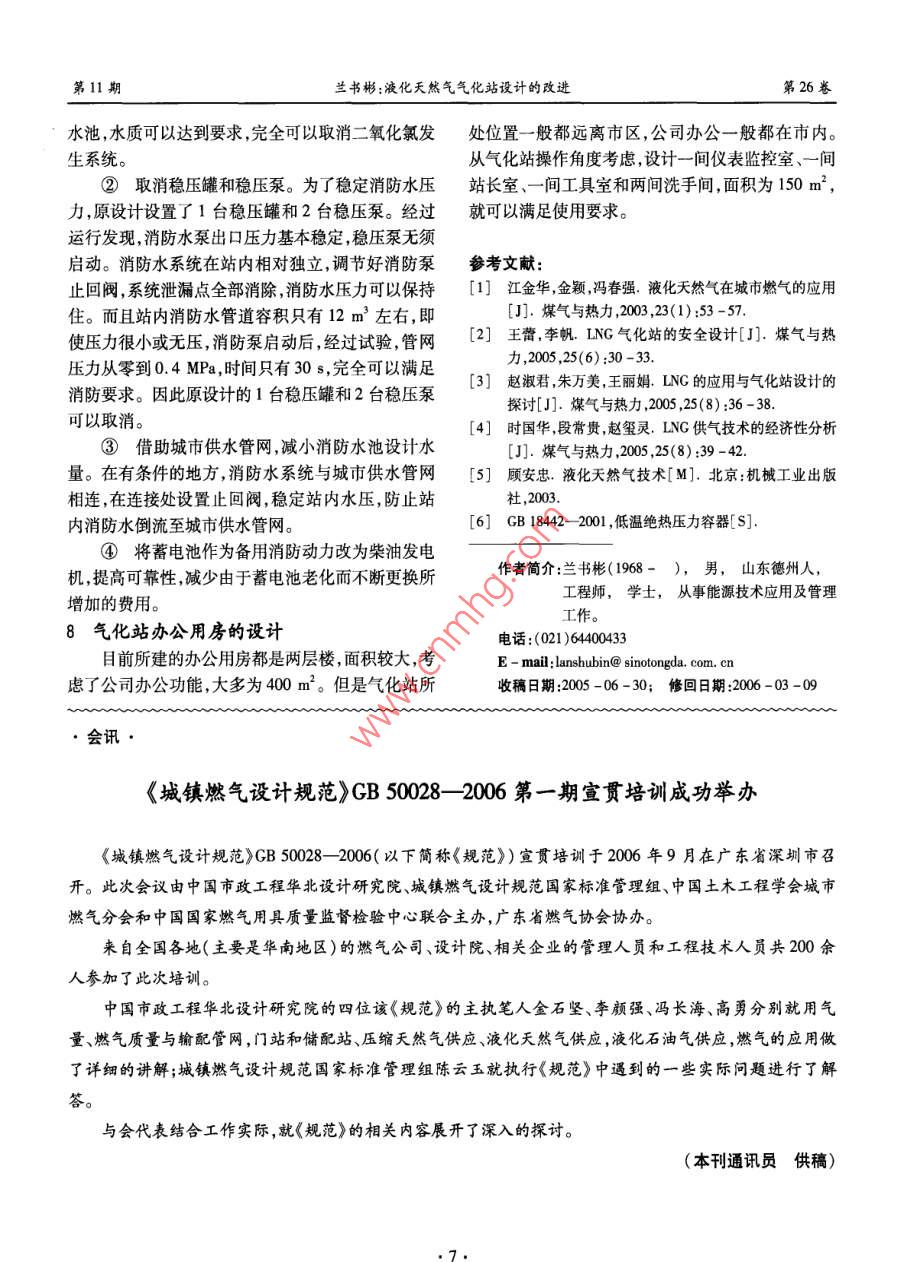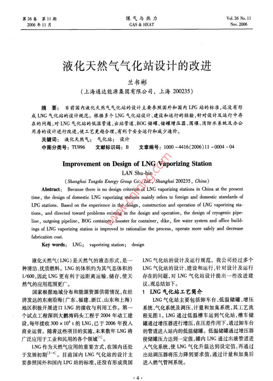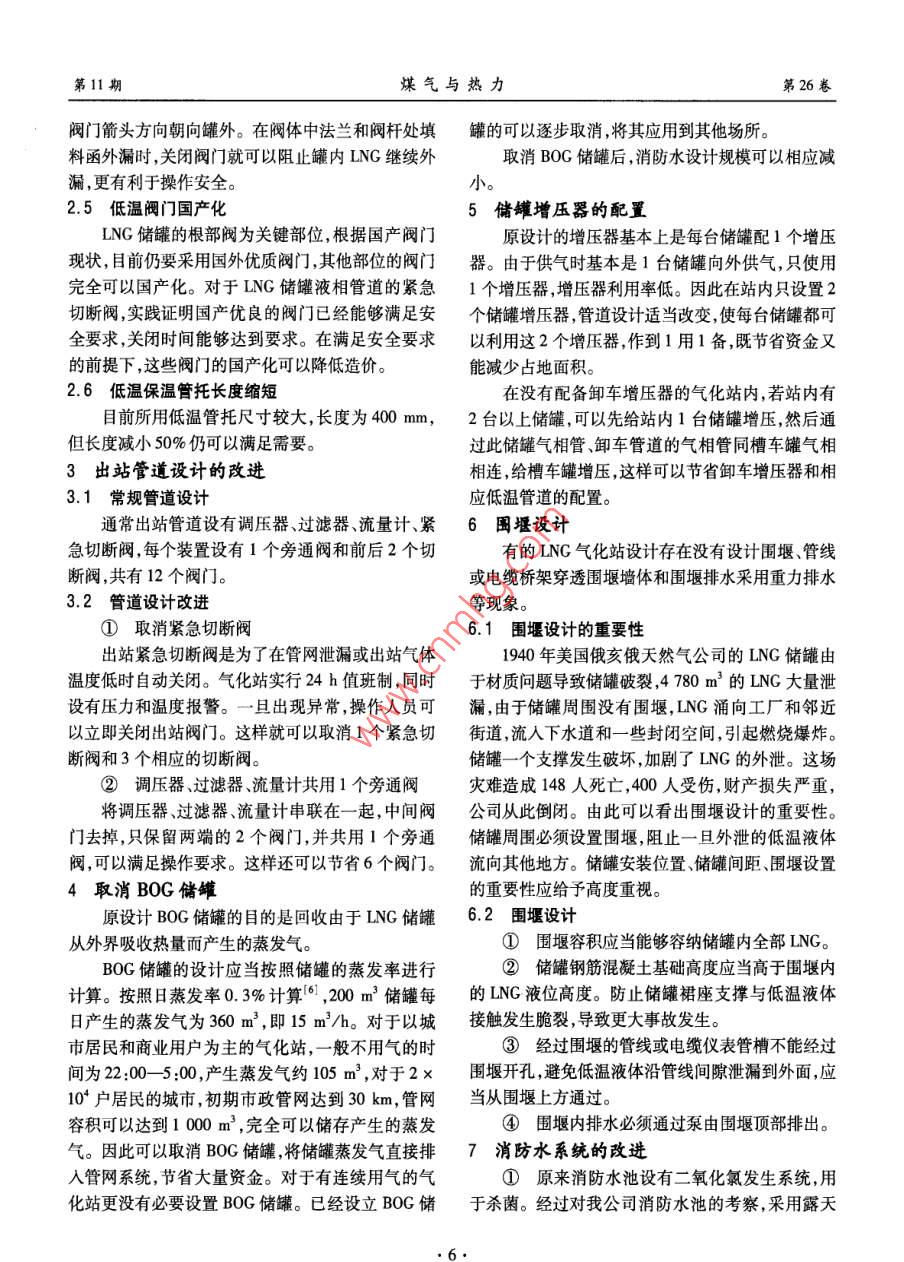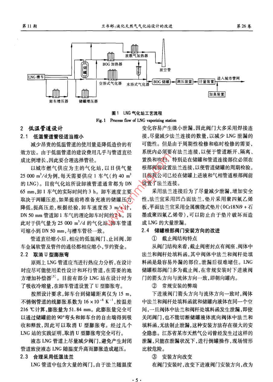 第26卷第11期煤氣與熱力 Vol. 26 No. 112006年11月 GaS HEATNov.2006液化天然氣氣化站設計的改進蘭書彬(上海通達能源集團有限公司,上海200235)摘要:目前國內(nèi)液化天然氣氣化站的設計主要參照國外和國內(nèi)LPG站的標準,還沒有形成LNG氣化站的設計規(guī)范。根據(jù)多個LNG氣化站設計、建設和運行的經(jīng)驗,針對設計及運行中存在的問題,對LNG氣化站的低溫管道、出站管道BOG儲罐、儲罐增壓器、圍堰、消防水系統(tǒng)及辦公用房的設計進行改進,使工藝更趨合理,有利于安全運行和減少造價。關鍵詞:液化天然氣;氣化站;設計中圖分類號:TU996文獻標識碼:B文章編號:1000-4416(2006)11-0004-04 Improvement on Design of LNG Vaporizing Station LAN Shu-bin Shanghai Tongda Energy Group Co., Lutd., Shanghai 200235, China) Abstract: Because there is no design criterion of LNG vaporizing stations in China at the present time, the design of domestic LNG vaporizing stations mainly refers to foreign and domestic standards of LPG stations. Based on the experience in the design, construction and operation of LNG vaporizing sta- tions, and directed toward problems existing in the design and operation, the design of cryogenic pipe- line, outgoing pipeline, BOG container, booster for container, dike, fire water system and office build- ings of LNG vaporizing station is improved to rationalize the process, operate more safely and decrease fabrication cost. Key words: LNG; vaporizing station; design液化天然氣(LNG)是天然氣的液態(tài)形式,是一g氣化站的設計及運行規(guī)范。我公司經(jīng)過多個種清潔、優(yōu)質(zhì)燃料。LNG的體積約為其氣態(tài)體積的LNG氣化站的設計、建設和運行,針對設計及運行1/600,因此LNG更有利于遠距離運輸、儲存,天存在的問題,對LNG氣化站設計提出一些改進建然氣的應用范圍更廣。議,現(xiàn)總結如下。國家根據(jù)地域分布和能源資源供需情況,在經(jīng)1g氣化站工藝簡介濟發(fā)達的東南沿海(廣東、福建、浙江、山東和上海)LNG氣化站主要包括卸車臺、低溫儲罐、增壓地區(qū)積極開展進口LNG的接收與利用工作。第一系統(tǒng)、氣化系統(tǒng)及調(diào)壓、計量和加臭系統(tǒng),其工藝流個試點工程深圳大鵬灣碼頭工程于2004年動工建程見圖1。LNG通過低溫槽車運到氣化站,槽車儲設,每年接收300×104t的LNG,已于2006年入罐通過增壓器進行增壓,在壓差作用下,通過卸車臺商業(yè)運營。隨著這些項目的實施,未來數(shù)年LN將的管道進入站內(nèi)的低溫儲罐。低溫儲罐通過增壓器廣泛應用于工業(yè)和民用的各個領域。使儲罐壓力達到一定值,罐內(nèi)LNG通過出液管道進LNG作為天然氣應用的重要方式,在國內(nèi)還處人氣化系統(tǒng),使LNG氣化升溫達到設定值,再通過于發(fā)展初期2-4目前國內(nèi)LNG氣化站的設計主出站調(diào)壓器將壓力降到要求值,通過計量和加臭后要參照國外和國內(nèi)LPG站的標準還沒有形成我國進入燃氣管網(wǎng)系統(tǒng)。第11期蘭書彬:液化天然氣氣化站設計的改進第26卷皿放散氣加熱器g加熱器放空管NG槽車空浴式氣化器水浴式氣化器BOG儲罐調(diào)壓裝置計量裝置進入城市管加臭裝置卸車增壓器儲罐增壓器圖1LNG氣化站工藝流程 Fig. Process flow of LNG vaporizing station2低溫管道設計變化容易產(chǎn)生微小泄漏,因此閥門大多采用焊接連2.1低溫管道管徑適當縮小接,盡量減少法蘭連接的數(shù)量,以減少LNG泄漏的減少昂貴的低溫管道的使用量是降低造價的有可能性。但是由于周期性檢修和臨時檢修的需要,效方法。由于低溫管道的建設費用幾乎與管道直徑系統(tǒng)內(nèi)必須要有法蘭連接,以便于管道斷開、隔離、成比例增長,因此要合理選擇管徑。置換和吹掃。特別是在儲罐和管道連接部位必須在以城市燃氣供應為主的氣化站,以日供氣量根部閥前設置法蘭連接,以便管道儲罐的周期檢驗。25000m3/d為例,每天需要供應1車氣(約40m目前我公司已經(jīng)在儲罐上進液和氣相管道根部閥前的LNG)。目前氣化站所設卸液管道通常都為DN設置了法蘭連接。65mm,卸1車氣的實際時間約3h。卸車速度主要采用法蘭連接后為了盡量減少泄漏,增加安全取決于兩罐壓差,如果提前將準備充液的儲罐壓力性,法蘭宜采用凹凸面法蘭,墊片采用聚四氟乙烯降低,提高壓差,根據(jù)經(jīng)驗,卸車速度按3m/s計板,平面法蘭宜采用金屬纏繞式墊片(Cr8Ni9+石DN50mm管道卸1車氣的理論卸車時間約2h。因墨或聚四氟乙烯帶),可以防止由于墊片破壞而造此對于供氣量為25000m3/d的氣化站,卸車管道成LNG的大量泄漏??煽s小到DN50mm,與槽車管徑一致。2.4儲罐根部閥門安裝方向的改進管道直徑縮小后,相應的低溫閥門、止回閥、卸①截止閥結構特點車金屬軟管及管件的通徑都相應縮小,節(jié)約資金。從閥門結構來看,截止閥密封點有閥座、閥體中2.2取消U型膨脹彎法蘭和閥桿處填料函,其中閥體中法蘭和閥桿處填原則上LNG管道應當進行熱應力分析,在設計料函是最容易外漏的部位,泄漏后很難堵住。LNG時應盡可能使用柔性設計和環(huán)行管道,在需要的地儲罐根部閥門多為截止閥,在常規(guī)安裝時下進液閥方增加補償器(5。目前有部分LNG站在設計時為門的箭頭方向與流體方向一致,即朝向罐內(nèi)。了吸收冷縮量,在卸車管道設置了U型膨脹彎。②常規(guī)安裝的弊端按照設計要求,卸車臺到儲罐距離僅為15m,下進液閥門箭頭方向與流體方向一致時,閥體不