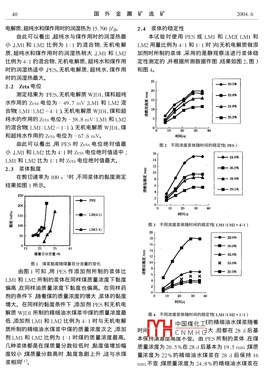 2004.6國(guó)外金屬礦選礦精細(xì)油水煤漿漿體特性研究劉萬(wàn)峰劉樹華1付曉恒3摘要利用幾種表面活性劑及其電解質(zhì)制備了精細(xì)油水煤漿并主要針對(duì)漿體的流變特性及其穩(wěn)定性進(jìn)行了研究。關(guān)鍵詞油水煤漿流變性穩(wěn)定性添加劑序言本次研究中采用以下四種添加劑添加劑PES非離子表面活性劑LM1和LM2及無(wú)機(jī)電解質(zhì)眾所周知煤漿技術(shù)是潔凈煤技術(shù)的一項(xiàng)重要wDl。按不同比例將煤、輕質(zhì)柴油、添加劑和水混內(nèi)容。精細(xì)油水煤漿三元混合燃料克服了油煤漿的合制漿制成的漿體成分如表1~表3所示。黏度高、成本高以及水煤漿熱值低的缺點(diǎn)。因而目表1用PES+wDl添加劑制成的漿體成分前國(guó)內(nèi)外對(duì)油水煤三元混合燃料的研究日益高漲煤質(zhì)量/%油質(zhì)量/%水質(zhì)量/%添加劑質(zhì)量/%該三元混合燃料有著廣闊的發(fā)展前景。本文主要制備了一種輕油、水和精細(xì)煤粉三元混合燃料對(duì)于液56.819.2態(tài)混合燃料其流變性、穩(wěn)定性是至關(guān)重要的,它們53.8決定著燃料的霧化和燃燒特性。因此文中重點(diǎn)研表2用LMI與LMx4:1添加劑制成的漿體的成分究了三元混合體系的流變性和穩(wěn)定性。煤質(zhì)量濃度油質(zhì)量濃度水質(zhì)量濃度添加劑質(zhì)量濃度1試驗(yàn)物料和方法24.055.419.31.1試驗(yàn)物料18.71,3試驗(yàn)中采用大同煤樣。精細(xì)油水煤漿所用藥品29.517.8有表面活性劑PES表面活性劑LM1、表面活性劑LM2、無(wú)機(jī)電解質(zhì)WJDl和無(wú)機(jī)電解質(zhì)WJD2。研表3用LM與LMx1:1添加劑制成的漿體成分究中還應(yīng)用了輕質(zhì)柴油、自來(lái)水和超純水。煤質(zhì)量/%油質(zhì)量/%水質(zhì)量/%添加劑質(zhì)量/%20.520.31.2試驗(yàn)方法52.418.3先將一定比例的添加劑、水和柴油的混合物在17.71,3高速攪拌器中攪拌一定時(shí)間使其充分乳化攪拌3段時(shí)間后再將一定質(zhì)量的精細(xì)煤粉加入攪拌數(shù)分鐘后即形成油水煤漿。制漿完畢用 Haake旋轉(zhuǎn)黏度計(jì)測(cè)其流體黏度繪出精細(xì)煤漿黏度分析圖。將制2試驗(yàn)結(jié)果備好的煤漿放入一容器內(nèi)靜置采用靜置觀察法進(jìn)2.1潤(rùn)濕熱行穩(wěn)定性的測(cè)定。用微熱量?jī)x SETARAMC8OD測(cè)測(cè)定結(jié)果為超純水與煤作用時(shí)的潤(rùn)濕熱為出其選用藥劑與原有藥劑與煤作用熱量所發(fā)生的變11中國(guó)煤化工、超純水、煤作用時(shí)的化。用Zeta電位儀分析選用的藥劑與煤作用時(shí)電潤(rùn)氵CNMHGLM比例為4:1的混位的變化情況。合物、無(wú)機(jī)電解質(zhì)、超純水和煤作用時(shí)的潤(rùn)濕熱為1.3油水煤漿成份16.346J/gM1和IM比例為1:1的混合物無(wú)機(jī)1.北京礦冶研究總院2.華北電力大學(xué)保定)3.中國(guó)礦業(yè)大學(xué)北京)國(guó)外金屬礦選礦2004.6電解質(zhì)超純水和煤作用時(shí)的潤(rùn)濕熱為15790J/2,4漿體的穩(wěn)定性由此可以看出超純水與煤作用時(shí)的潤(rùn)濕熱最本試驗(yàn)對(duì)使用PES或LM1和LM2(LM1和小JMI和LM2比例為1:1的混合物、無(wú)機(jī)電解LM2用量比例為4:1和1:1時(shí))與無(wú)機(jī)電解質(zhì)做添質(zhì)、超純水和煤作用時(shí)的潤(rùn)濕熱稍大,LMI和LM2加劑時(shí)所制的漿體采用的是靜觀察法進(jìn)行漿體穩(wěn)比例為4:1的混合物、無(wú)機(jī)電解質(zhì)、超純水和煤作用定性測(cè)定的并根據(jù)所測(cè)數(shù)據(jù)作圖結(jié)果如圖2、圖3時(shí)的潤(rùn)濕熱適中PES無(wú)機(jī)電解質(zhì)、超純水煤作用和圖4。時(shí)的潤(rùn)濕熱最大2,2eta電位測(cè)定結(jié)果為ES無(wú)機(jī)電解質(zhì)WJDl煤和超純20%水作用的Zeta電位為-49.7mVM1和LM2混248%合物L(fēng)M1:LM2=4:1)無(wú)機(jī)電解質(zhì)WJDl煤和超純水的作用的Zeta電位為-58.8mV:LM1和LM2262%的混合LMI:LM2=1:1)無(wú)機(jī)電解質(zhì)WJDl煤和超純水作用的Zeta電位為-67.6mV。時(shí)間由此可以看出,用PES時(shí)Zeta電位絕對(duì)值最圖2不同濃度漿體隨時(shí)間的穩(wěn)定性(PES)小M和LM2比為4:1時(shí)Zeta電位絕對(duì)值適中24.0%LM1和LM2比為1:1時(shí)Zeta電位絕對(duì)值最大。2.3漿體黏度在剪切速率為100s-1時(shí)不同漿體的黏度測(cè)定結(jié)果如圖1所示。295%LM(4:1)時(shí)間圖3不同濃度漿體隨時(shí)間的穩(wěn)定性LM1:LM2=4:1)LM(:1)一300%煤量百分含量/32.0%圖1煤漿黏度隨煤量百分含量的變化X35.0%由圖1可知用PES作添加劑所制的漿體比LMI和LM2所制的漿體在同樣煤質(zhì)量濃度下黏度偏高在同樣油質(zhì)量濃度下黏度也偏高。在同樣藥劑的條件下隨著煤的質(zhì)量濃度的增大漿體的黏度增大。在同樣的黏度條件下添加劑PES和無(wú)機(jī)電時(shí)間l解質(zhì)wJDl所制的精細(xì)油水煤漿中煤的質(zhì)量濃度最圖4不同濃度漿體隨時(shí)間的穩(wěn)定性LM:LM2=1:1)低添加劑LM1和LM2比例為4:1時(shí)與無(wú)機(jī)電解質(zhì)所制的精細(xì)油水煤漿中煤的質(zhì)量濃度次之添加時(shí)rv山中國(guó)煤化工的精細(xì)油水煤漿隨著CNMHG大但都在28d后基劑LM1和LM2比例為1:1時(shí)煤的質(zhì)量濃度最高。本保持清澈層高度個(gè)變。田PS所制的漿體在煤幾種漿體都是在煤質(zhì)量分?jǐn)?shù)較低時(shí)黏度值增加幅質(zhì)量濃度為20.5%在28d后基本為19.5mm煤質(zhì)度較小煤質(zhì)量