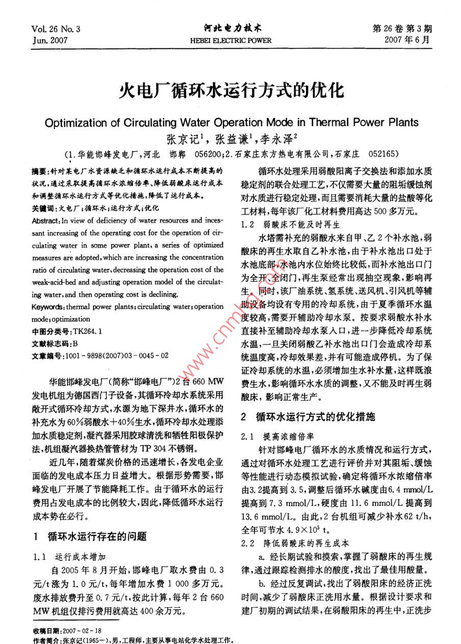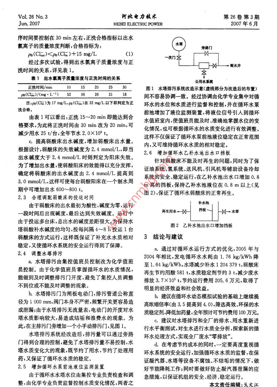 VoL 26 No. 3河北電力技術(shù)第26卷第3期Jun, 2007HEBEI ELECTRIC POWER2007年6月火電廠循環(huán)水運行方式的優(yōu)化Optimization of Circulating Water Operation Mode in Thermal Power Plants張京記',張益謙',李永澤2(1.華能邯峰發(fā)電廠,河北邯鄲056200;2. 石家莊東方熱電有限公司,石家莊052165)摘要:針對某電廠水資源缺乏和循環(huán)水運行成本不斷提高的循環(huán)水處理采用弱酸陽離子交換法和添加水質(zhì)狀況,通過采取提高循環(huán)水濃縮倍率、降低弱酸床運行成本穩(wěn)定劑的聯(lián)合處理工藝,不僅需要大量的阻垢緩蝕劑和調(diào)整循環(huán)水運行方式等優(yōu)化措施,降低了運行成本。對水質(zhì)進行穩(wěn)定處理,而且需要消耗大量的鹽酸等化關鍵詞:火電廠;循環(huán)水;運行方式;優(yōu)化工材料,每年該廠化工材料費用高達500多萬元。Abstract: In view of deficiency of water resources and inces-1.2 弱酸床不能及時再生sant increasing of the operating cost for the operation of cir水塔需補充的弱酸水來自甲,乙2個補水池,弱culating water in some power plant,a series of optimized酸床的再生水取自乙補水池,由于補水池出口處于measures are adopted, which are increasing the concentration水池底部,水池內(nèi)水位始終比較低,而補水池出口門ratio of circulating water , decreasing the operation cost of theweak-acid-bed and adjusting operation model of the circulat-為全開、全閉門,再生泵經(jīng)常出現(xiàn)抽空現(xiàn)象,影響再生。同時,該廠油系統(tǒng)、氫系統(tǒng)、送風機、引風機等輔ing water, and then operating cost is declining.Keywords: thermal power plants; circulating water; operation助設備均設有專用的冷卻系統(tǒng),由于夏季循環(huán)水溫mode;optimization度較高,需要開輔助冷卻水泵。按要求弱酸水補水中圖分類號:TK264.1直接補至輔助冷卻水泵人口,進一步降低冷卻系統(tǒng)文獻標志碼:B水溫,一且關閉弱酸乙補水池出口門會造成冷卻系文章編號:1001 - 9898(2007)03 - 0045 -02統(tǒng)溫度高,冷卻效果差,并有可能造成停機。為了保證冷卻系統(tǒng)的水溫,必須增加生水補水量,這樣既浪華能邯峰發(fā)電廠(簡稱“邯峰電廠”)2臺660 MW費生水,影響循環(huán)水水質(zhì)的調(diào)整,又不能及時再生弱發(fā)電機組為德國西門子設備,其循環(huán)冷卻水系統(tǒng)采用酸床,影響正常生產(chǎn)。敞開式循環(huán)冷卻方式,水源為地下深井水,循環(huán)水的2循環(huán)水運行方式的優(yōu)化措施補充水為60%弱酸水+40%生水,循環(huán)冷卻水處理添加水質(zhì)穩(wěn)定劑,凝汽器采用膠球清洗和犧牲陽極保護2.1提高濃縮倍率法,機組凝汽器換熱管管材為TP 304不銹鋼。針對邯峰電廠循環(huán)水的水質(zhì)情況和運行方式,近幾年,隨著煤炭價格的迅速增長,各發(fā)電企業(yè)通過對循環(huán)水處理工藝進行評價并對其阻垢、緩蝕面臨的發(fā)電成本壓力日益增大。根據(jù)形勢需要,邯等性能進行動態(tài)模擬試驗,確定將循環(huán)水濃縮倍率峰發(fā)電廠開展了節(jié)能降耗工作。由于循環(huán)水的運行由3.2提高到3.5,調(diào)整后循環(huán)水堿度由6.4mmol/L費用占發(fā)電成本的比例較大,因此,降低循環(huán)水運行提高到7.3 mmol/L,硬度由11. 6 mmol/L提高到成本勢在必行。13. 6 mmol/L。由此,2臺機組可減少補水62 t/h,全年可節(jié)水4.9X105 t。1循環(huán)水運行存在的問題2.2降低弱 酸床的再生成本1.1運行成本增加a經(jīng)長期試驗和摸索,掌握了弱酸床的再生規(guī)自2005年8月開始,邯峰電廠取水費由0.3律,通過跟蹤檢測排水的酸度 ,找出了最佳用酸量。元/t漲為1.0元/t,每年增加水費1 000 多萬元。b.經(jīng)過反復調(diào)試,找出了弱酸陽床的經(jīng)濟正洗廢水排放費升至0. 7元/t,按此計算,每年2臺660時間,減少了弱酸床正洗用水量。根據(jù)設計要求和MW機組僅排污費用就高達400余萬元。建廠初期的調(diào)試結(jié)果,在弱酸陽床的再生中,正洗步收稿日期:2007-02-18作者簡介:張京記(1965-),男,工程師,主要從事電站化學水處理工作。河北電力技術(shù)第26卷第3期Vol. 26 No. 32007年6月Jun. 2007HEBET ELECTRIC POWER序時間要控制在30 min左右,正洗合格指標以出水氯離子的質(zhì)量濃度判斷,合格指標為:旁路門pa(Clan)