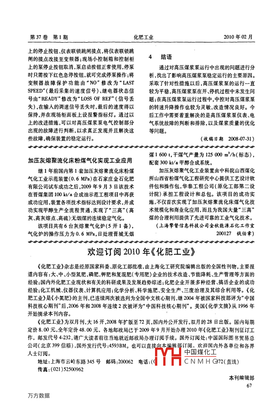 第37卷第1期化肥工業(yè)2010年02月德士古水煤漿氣化裝置高壓煤漿泵運(yùn)行探討黃劍平(中石化金陵分公司南京20033摘要闡逑了水煤漿氣化裝夏在試運(yùn)行過程中多次遇到的高壓煤漿系工作不正常問題對(duì)彩響高壓煤漿泵安仝、穩(wěn)定運(yùn)行的各種因素進(jìn)行分析。通過有針對(duì)性的技術(shù)改逵和優(yōu)化工藝操作,保證了高壓煤漿泵安全、穗定運(yùn)行。關(guān)鍵詞高壓煤漿泵分析措施Inquiry into Running of High-Pressure Coal Slurry Pumpfor Texaco Coal-Water Slurry Gasifier(Jinling Petrochemical Limited Corp SINOPEC Nanjing 210033)Abstract a description is given of the frequent irregular running of the high-pressure coal slurrypump in the trial operation of the coal-water slurry gasifier, so an analysis is carried out of the variousfactors that affect the safe and steady operation of the pump. Through appropriate technological trans-formation and optimization of process conditions, the safe and steady operation of the pump is assuredKeywords high-pressure coal slurry pump analysis measures中石化金陵分公司氣化裝置釆用美國德士古1),造成氣化爐運(yùn)行時(shí)間偏短,氣化裝置不能長(zhǎng)公司的水煤漿加壓氣化技術(shù),以煤、石油焦和純氧周期運(yùn)行,使裝置的非計(jì)劃停工次數(shù)過多。為原料,年產(chǎn)300kt合成氨和30kt氫氣。采用激冷流程,氣化壓力為4.0MPa(表壓),氣化溫度為2原因分析1400℃。系統(tǒng)配置3臺(tái)氣化爐、3臺(tái)洗滌塔,正2.1煤漿槽攪拌器故障致使煤漿質(zhì)量差常生產(chǎn)時(shí)均為2開1備;同時(shí)配置2套閃蒸系統(tǒng)。(1)高壓煤漿泵給料槽頂部攪拌器工作狀況氣化裝置的主要任務(wù)是把制漿崗位生產(chǎn)的煤漿通不好,包括攪拌電機(jī)在工作中會(huì)發(fā)燙攪拌器的軸過高壓煤漿泵加壓打入氣化爐,與空分生產(chǎn)的氧晃動(dòng)攪拌器的槳葉設(shè)計(jì)不夠合理等對(duì)煤漿槽內(nèi)氣在氣化爐內(nèi)進(jìn)行部分氧化反應(yīng),生產(chǎn)出以一氧的煤漿不能夠提供良好的攪拌效果,造成煤漿槽化碳和氫氣為主要成分的工藝氣,洗滌后送往凈內(nèi)的煤漿特性變差,從而在煤漿槽內(nèi)形成局部的化工段;同時(shí)回收、利用系統(tǒng)排出的黑水,并將粗死漿渣和細(xì)渣從系統(tǒng)中分離出去。(2)高壓煤漿泵給料槽頂部攪拌器多次發(fā)生1問題簡(jiǎn)述斷軸事故。3)因流動(dòng)的水煤漿對(duì)攪拌器槳葉有很強(qiáng)的自2005年9月26日煤氣化裝置開始投料試磨蝕作用,因此煤漿槽攪拌器槳葉表面包覆著一運(yùn)行以來,在1年的試運(yùn)行期間多次出現(xiàn)因高壓層塑但H息在水世漿攪拌器運(yùn)行了煤漿泵工作不正常而導(dǎo)致系統(tǒng)停車的事故(表THe中國煤化工性以及攪拌器CNMHG本文作者的聯(lián)系電話:0255897132第37卷第1期化肥工業(yè)2010年02月表12005年9月-2006年8月現(xiàn)攪拌器軸的壁厚不夠軸位移太大、設(shè)計(jì)扭距太氣化爐非計(jì)劃停車統(tǒng)計(jì)小,要求供貨廠商對(duì)攪拌器軸重新設(shè)計(jì)。更換后氣化爐連續(xù)運(yùn)行停車原因的攪拌器軸運(yùn)行情況很好。位號(hào)時(shí)間/d(3)將煤漿槽攪拌器上的保護(hù)內(nèi)襯材料去R8201A4.3煤漿流量低,聯(lián)鎖跳車除檢修中加強(qiáng)對(duì)攪拌器的檢測(cè)和檢查。在需要R8201B1.0煤漿流量低聯(lián)鎖跳車R8201B128煤漿泵出口流量低,手動(dòng)緊急停車更換攪拌器槳葉時(shí),向供貨廠商提出關(guān)于煤漿槽R8201C114煤漿泵出口流量低,手動(dòng)緊急停車攪拌器槳葉磨蝕強(qiáng)度的要求。R8201C8.0高壓煤漿泵不明原因跳車3.2提高操作技能R8201A63高壓煤漿泵不明原因跳車加強(qiáng)對(duì)操作人員的培訓(xùn),重新配備各個(gè)班組R8201A20.7高壓煤漿泵不明原因跳車的人員,力求各個(gè)班組操作人員的操作水平和操R820IB184高壓煤漿泵不明原因跳車作技能較為平均;嚴(yán)格制訂和控制煤漿制備過程R8201C1.4高壓煤漿泵不明原因跳車中的各項(xiàng)工藝指標(biāo)。經(jīng)過不斷地試驗(yàn),摸索出R8201A0.4高壓煤漿泵不明原因跳車套經(jīng)驗(yàn),即通過調(diào)整煤漿制備過程中添加劑的加R8201C3.0高壓煤漿泵不明原因跳車入量,優(yōu)化煤漿的濃度和黏度之間的關(guān)系,既保證槳葉內(nèi)襯材料強(qiáng)度不夠,造成攪拌器槳葉內(nèi)襯材了水煤漿的流動(dòng)特性又保證了水煤漿的濃度符料脫落,影響到高壓煤漿泵的運(yùn)行。合要求。2.2操作人員操作技能欠佳3.3儀表、電器系統(tǒng)故障因?yàn)樗簼{裝置是新裝置,操作人員的操作針對(duì)煤漿泵不明原因跳車問題,會(huì)同儀表、電水平和操作技能欠佳和分布不均,有時(shí)造成水煤氣的有關(guān)人員共同分析商討。鑒于高壓煤漿泵的漿的制備不能完全符合設(shè)計(jì)要求影響高壓煤漿驅(qū)動(dòng)電機(jī)的電氣柜工作環(huán)境惡劣變頻器易受到泵的穩(wěn)定運(yùn)行。外界因素干擾而失電、儀表和電氣接線接觸不良23儀表、電器系統(tǒng)故障以及供電線路引起的干擾問題,采取以下措施。煤漿泵電氣柜工作環(huán)境差,造成煤漿泵變頻(1)變頻器前加1個(gè)延時(shí)繼電器,延時(shí)時(shí)間器工作不正常,變頻器易受到外界因素干擾(電為0.5s。由于干擾信號(hào)是瞬間產(chǎn)生的這樣可以壓波動(dòng)及電磁信號(hào)等)失電而造成煤漿泵跳車,有效避免干擾信號(hào)對