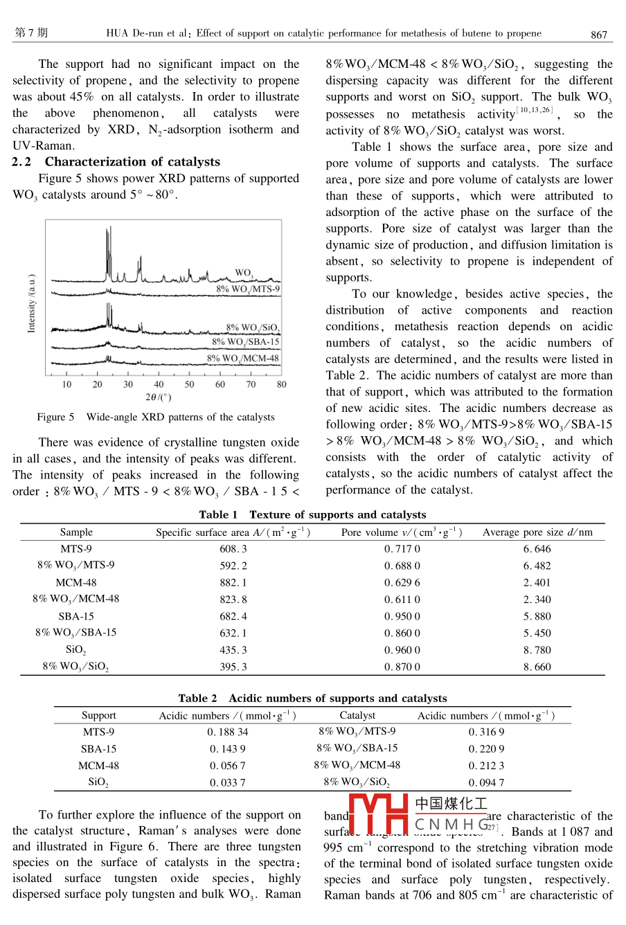 第42卷第7期燃料化學(xué)學(xué)報(bào)Vol 42 No. 7014年7月Journal of Fuel Chemistry and TechnologyJul.2014文章編號(hào):0253-2409(2014)070865-05Effect of support oncatalytic performance for metathesis of butene to propeneHUA De-run''-. Chen Sheng-Ii-. ZHOU-chenng, LIU Hong-bo, HUANG QingXin-ning(1. Gannan Normal University, Chemical Institute of Chemical Industry, Ganzhou 341000, China2. China University of Petroleum, State Key of Heavy Oil Processing, Beiying 102249, Chi3. Natural Gas Treating Plant, Sinopec Zhongyuan Oilfield Branch, Puyang 457001, ChinaAbstract: The catalysts with SBA-15, MCM-48, SiO,, and MTS-9 as supports were synthesized with 8% WO,, and theircatalytic performance for metathesis of butene to propene were carried out. The conversion of butene is 30%0-37% on the catalystswith SBA-15, MCM-48, and Sio, as supports, and that of butene is 37%0-42% on WO,/MTS 9 catalyst. The catalystcharacterization results show that the catalytic activities depend on the acidic numbers of catalysts prepared and the distribution oftungstens on the supports used. As a result, the performance of 8% WO,/MTS-9 catalyst for the titled reaction is bestKeywords: propene; metathesis; support; wO3CLC number: 0643. 3 Document code : Arec, Olefin metathesis is a catalytically induced attracted the most attentionComparedtion wherein olefins undergo bond reorganization, conventional catalyst supported molybdenum andresulting in a redistribution of alkylidene moietiesenumcatalysts supported tungstenwereOlefin metathesis was first reported by Eleuterio in thoroughly investigated for a long time due to19632, which has been regarded as an important considerable resistance to poison19.Bureaction for the conversion of low value olefin into few reports on an effect of support on metathesis ofdemanded olefinic substrates.,3-6. The reaction butene to propone 4, 5, Ipathways of olefin metathesis can be illustrated asThe highlight of the paper was to investigate theshowed in Figure 1effect of support on the activity of catalysts forthesis of butene toorts withR, CH: CHRRCHdifferent pore sizes and architectures had beenemployed in this study: conventional SiO,, SBA-15of hexagonal structure cubic mCm-48 with threeR CHECHRR CHR CHdimensional intersecting channels, MTS-9 containingFigure 1 Reaction of olefin metathesistitanium. The effect of support on catalyst activityand selectivity was investigatedThe catalytic activity was found to dependparticularly on the content of active component,8)Eexperimenthe state of active component 9, activation 1.1 Synthesis of supportsprepand theMCM-48 was hydrothermally synthesized fromproperties of the support 4, 5, 13. As concerns support, an assembly of surfactant micelle( CTAB ) withsupport often affected the dispersity and properties of silicate precursors in alkali media as described in thesupported metal oxide, which resulted in catalysts literatureexhibiting different catalytic activity. MoreoverMesoporous SBA-15 was synthesized in stronglyreducibility of catalyst was dependent on supportacidic mediaSo support was important to metathesis catalystMTS-9 was hydrothermally synthesized frorMesoporous materials have a unique characteristic, assembly of triblock polymers( P123)with preformedand are candidates for support. Mesoporous silica- titanosilicate precursors in strongly acidic media(pHbased catalysts exhibited higher activity, which was valud中國(guó)煤化工 ure. First, precursorsattributed to the better dispersion of the active phase cont,nanoclustersrfaceThe preplHCNMHsupported tungsten oxide catalysts had a high potential assembled with triblockcopolymers in a strong acidfor practical applications in metathesis 6. I and medium (ph value< 1). The synthesis procedure forReceived date. 2013-11-27: Received in revised form: 2014-03-1Correspondingauthor:CHENSheng-li,E-mail:slchen@cup.edu.cn.866燃料化學(xué)學(xué)報(bào)第42卷All catalysts were prepared by the wet 1.4 Test of catalysts 73MTS-9 was reported in detail in literature 2.used as the excitation sourcespectrum reso1. 2 Preparation of catalystswas estimated to be 4.0impregnation method. The WO, to support ratio( inCatalytic properties ofcatalysts wereweight)of catalyst was 8.0%. The impregnated evaluated by the metathesis of butene. The metathesisproducts were dried at 80C for 12 h, and then the was carried out in a down flow fixed bed stainlesscatalysts were thermally treated at 550 C for 4hsteel microreactd.C4 stream was1. 3 Characterization of catalyststreated through basf adsorbents selexsorb Cd andX-ray powder diffraction patterns of the catalycos for the removal ofwere recorded on a Bruker D8 ADVACe compounds and other trace contaminants, which candiffractometer, using Cu Ka (0. 15406 nm) cause catalyst deactivation. Before introduction of C4radiation in the 20 range of 10-60 with a scanning stream into the reactor, the catalyst was pretreatedrate of 1(o)/min. N, adsorption-desorption isotherms situ with a mixture flow of N, and H, for 30 min atat-196C were recorded with a Micromeritics ASAP 420C. Weight hour space velocity( WHSV of the2010 automatic sorption analyzer. The bet surface metathesis reaction was 6. 4 h. All products wereareas were calculated from the desorption isotherms in analyzed using a gas chromatograph equipped with athe relative pressure range of p/po=0.01-1.0. UV- flame ionization detector FID )and a 50 m PONARaman spectra were obtained on a Hr800 UV-Raman capillary column. The reaction pathways werespectrograph( Horiba Jobin Yvon Company, illustrated in Figure 2 in detailFrance). The 244.0 nm line from a He-Cd laser iscross-metathesisCH CH-CHCICH, CH=CH, +CH, CH=CHCH, CHelf-metathesisCHCH,+CHCH, CH=CHCH, CHcross-metathesis2CH CHECHH CH CHECHCHCHCH=CHFigure 2 Possible reaction pathways of 2-butene2 Results and discussionAmong all catalyst, 8% WO,/MTS-9 exhibited2.1 Test of catalyststhe highest activity. Activity of 8%WO,/SiO,wasFigure 3 shows the effect 