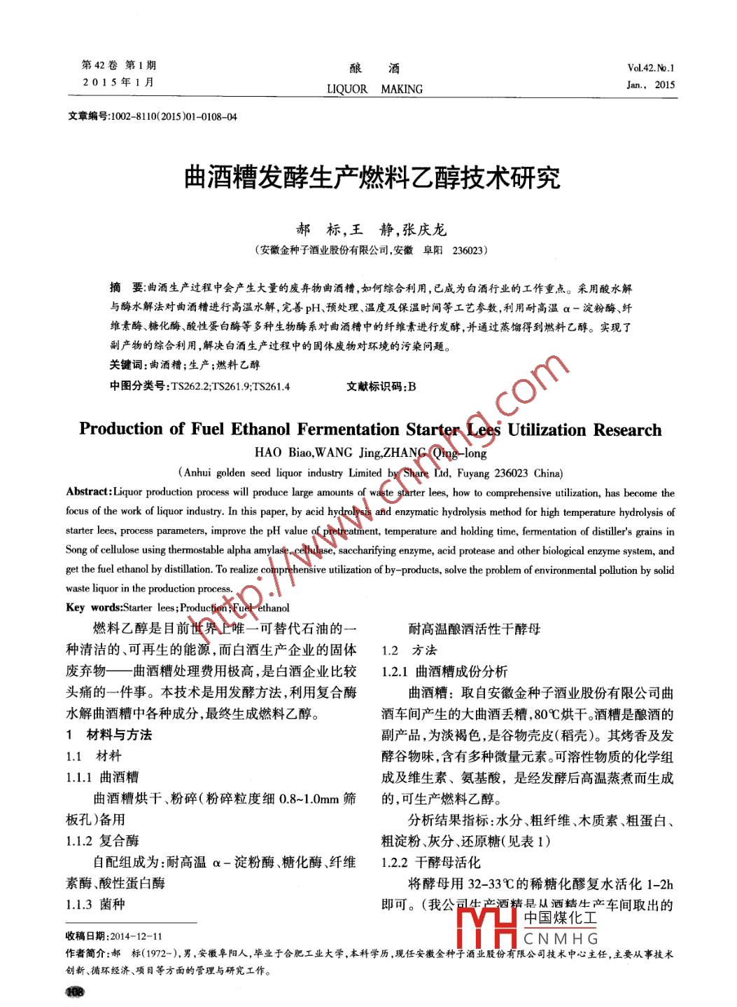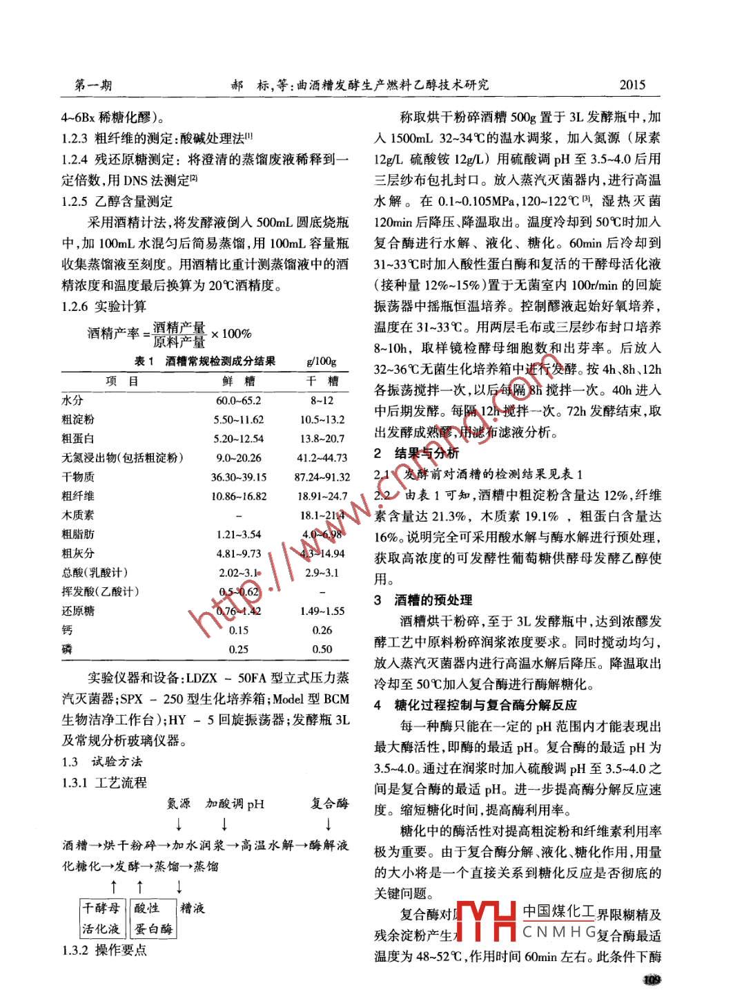 第42卷第1期釀酒vol42.№.12015年1月LIQUOR MAKINGJan.,2015文章編號(hào)1002-8110(2015)01-0108-04曲酒糟發(fā)酵生產(chǎn)燃料乙醇技術(shù)研究郝標(biāo),王靜,張慶龍(安徽金種子酒業(yè)股份有限公司,安徽阜陽(yáng)236023)摘要曲酒生產(chǎn)過(guò)程中會(huì)產(chǎn)生大量的廢棄物曲酒糟,如何綜合利用,已成為白酒行業(yè)的工作重點(diǎn)。采用酸水解與酶水解法對(duì)曲酒糟進(jìn)行高溫水解,完善pH、預(yù)處理、溫度及保溫時(shí)間等工藝參教,利用耐高溫α-淀粉酶、纖維煮酶、糖化酶、酸性蛋白酶等多種生物酶系對(duì)曲酒糟中的纖維素進(jìn)行發(fā)酵,并通過(guò)蒸餾得到燃料乙醇。實(shí)現(xiàn)了副產(chǎn)物的綜合利用,解決白酒生產(chǎn)過(guò)程中的固體廢物對(duì)環(huán)境的污染問(wèn)題關(guān)鍵詞:曲酒糟;生產(chǎn);燃料乙醇中圖分類號(hào):TS2622;TS2619TS2614文獻(xiàn)標(biāo)識(shí)碼:BProduction of Fuel Ethanol Fermentation Starter Lees Utilization ResearchHAo Biao, WANG Jing, ZHANG Qing(Anhui golden seed liquor industry Limited by Share Ltd, Fuyang 236023 ChinaAbstract: Liquor production process will produce large amounts of waste starter lees, how to comprehensive utilization, has become thefocus of the work of liquor industry. In this paper, by acid hydrolysis and enzymatic hydrolysis method for high temperature hydrolysis ofstarter lees, process parameters, improve the pH value of pretreatment, temperature and holding time, fermentation of distillers grains inSong of cellulose using thermostable alpha amylase, cellulase, saccharifying enzyme, acid protease and other biological enzyme system, andget the fuel ethanol by distillation. To realize comprehensive utilization of by-products, solve the problem of environmental pollution by solidwaste liquor in the production processKey words: Starter lees; Production; Fuel ethanol燃料乙醇是目前世界上唯一可替代石油的耐高溫釀酒活性干酵母種清潔的、可再生的能源,而白酒生產(chǎn)企業(yè)的固體1.2方法廢棄物——一曲酒糟處理費(fèi)用極高,是白酒企業(yè)比較1.21曲酒糟成份分析頭痛的一件事。本技術(shù)是用發(fā)酵方法,利用復(fù)合酶曲酒糟:取自安徽金種子酒業(yè)股份有限公司曲水解曲酒糟中各種成分,最終生成燃料乙醇。酒車間產(chǎn)生的大曲酒丟糟,80℃烘干。酒糟是釀酒的1材料與方法副產(chǎn)品,為淡褐色,是谷物殼皮(稻殼)。其烤香及發(fā)1.1材料酵谷物味,含有多種微量元素。可溶性物質(zhì)的化學(xué)組1.1.1曲酒糟成及維生素、氨基酸,是經(jīng)發(fā)酵后高溫蒸煮而生成曲酒糟烘干、粉碎(粉碎粒度細(xì)0.8-1.0mm篩的,可生產(chǎn)燃料乙醇。板孔)備用分析結(jié)果指標(biāo):水分、粗纖維、木質(zhì)素、粗蛋白、1.1.2復(fù)合酶粗淀粉、灰分、還原糖(見(jiàn)表1)自配組成為:耐高溫α-淀粉酶、糖化酶、纖維1.2.2千酵母活化素酶酸性蛋白酶將酵母用32-33℃的稀糖化醪復(fù)水活化1-2h1.1.3菌種即可。(我公司生產(chǎn)灑精是叢酒生產(chǎn)車間取出的中國(guó)煤化工收稿日期:2014-12-11CNMHG作者簡(jiǎn)介:郝標(biāo)(1972-),男,安徽阜陽(yáng)人,畢業(yè)于合肥工業(yè)大學(xué),本科學(xué)歷,現(xiàn)任安徽金種子酒業(yè)股份有限公司技術(shù)中心主任,主要從事技術(shù)創(chuàng)新、循環(huán)經(jīng)濟(jì)、項(xiàng)目等方面的管理與研究工作。第一期郝標(biāo),等:曲酒糟發(fā)酵生產(chǎn)燃料乙醇技術(shù)研究20154-6Bx稀糖化醪)。稱取烘干粉碎酒糟500g置于3L發(fā)酵瓶中,加123粗纖維的測(cè)定:酸堿處理法叫入1500mL32-34℃的溫水調(diào)漿,加入氮源(尿素1.24殘還原糖測(cè)定:將澄清的蒸餾廢液稀釋到一12g/L硫酸銨12g/L)用硫酸調(diào)pH至3.5-40后用定倍數(shù),用DNS法測(cè)定三層紗布包扎封口。放入蒸汽滅菌器內(nèi),進(jìn)行高溫1.2.5乙醇含量測(cè)定水解。在0.1~0.105MPa,120-12℃閂,濕熱滅菌采用酒精計(jì)法,將發(fā)酵液倒入500mL圓底燒瓶120min后降壓、降溫取出。溫度冷卻到50℃時(shí)加入中,加100mL水混勻后簡(jiǎn)易蒸餾,用100mL容量瓶復(fù)合酶進(jìn)行水解、液化、糖化。60min后冷卻到收集蒸餾液至刻度。用酒精比重計(jì)測(cè)蒸餾液中的酒31~33℃時(shí)加入酸性蛋白酶和復(fù)活的干酵母活化液精濃度和溫度最后換算為20℃酒精度。(接種量12%-15%)置于無(wú)菌室內(nèi)100r/min的回旋126實(shí)驗(yàn)計(jì)算振蕩器中搖瓶恒溫培養(yǎng)??刂契惨浩鹗己醚跖囵B(yǎng)酒精產(chǎn)率=酒精產(chǎn)量×100%溫度在31~33℃。用兩層毛布或三層紗布封口培養(yǎng)8-10h,取樣鏡檢酵母細(xì)胞數(shù)和出芽率。后放入表1酒糟常規(guī)檢測(cè)成分結(jié)果g100g32~36℃無(wú)菌生化培養(yǎng)箱中進(jìn)行發(fā)酵。按4h、8h、12h項(xiàng)目水分鮮糟千糟各振蕩攪拌一次,以后每隔8攪拌一次。40h進(jìn)入60.0-65.28-12粗淀粉5.50~11.62中后期發(fā)酵。每隔12h攪拌一次。72h發(fā)酵結(jié)束,取0.5-13.2粗蛋白5.20-12.5413.8~20.7出發(fā)酵成熟醪,用濾布濾液分析無(wú)氮浸出物(包括粗淀粉)90-2026412-44732結(jié)果與分析干物質(zhì)3630-39.587.24913221發(fā)酵前對(duì)酒糟的檢測(cè)結(jié)果見(jiàn)表1粗纖維10.86-16.821891-2472.2由表1可知,酒糟中粗淀粉含量達(dá)12%,纖維木質(zhì)素18.1-214素含量達(dá)21.3%,木質(zhì)素191%,粗蛋白含量達(dá)粗脂肪1.21~3.5440-6.9816%。說(shuō)明完全可采用酸水解與酶水解進(jìn)行預(yù)處理,
