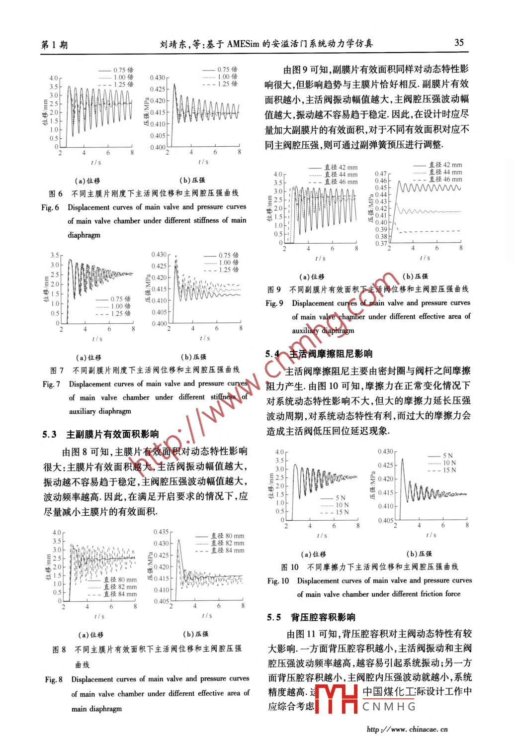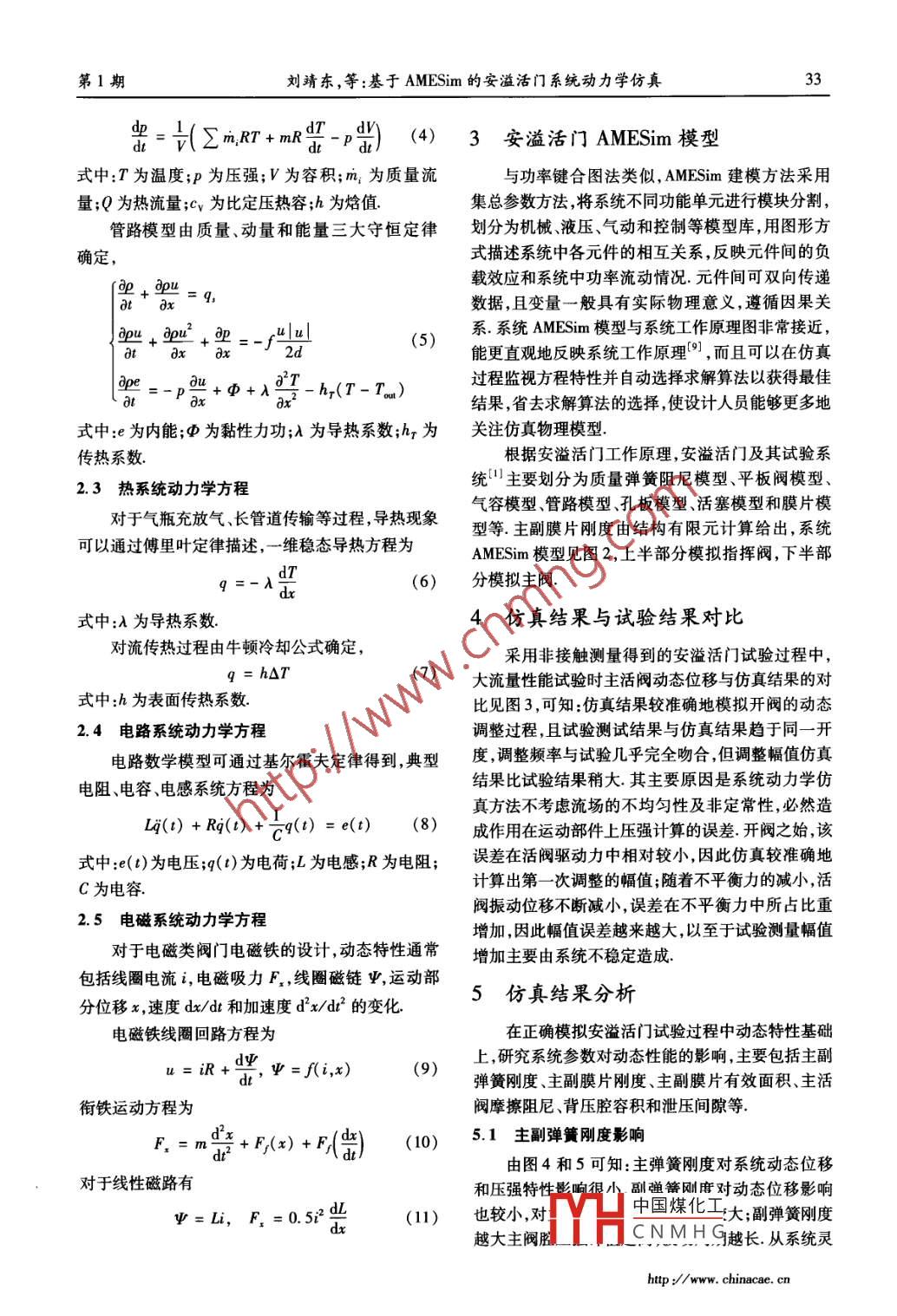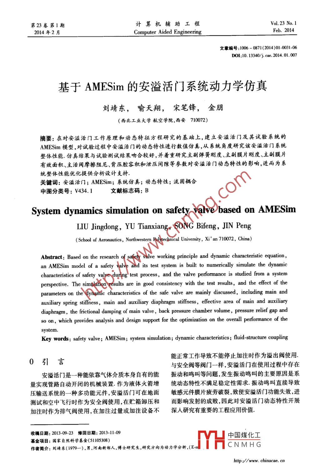 第23卷第Ⅰ期計(jì)算機(jī)輔助工程Vol 23 No. 12014年2月Computer Aided EngineeringFeb.2014文章編號:1006-0871(2014)01-0031-06DOI:10.13340/jcae.2014.01.007基于 AMESim的安溢活門系統(tǒng)動力學(xué)仿真劉靖東,喻天翔,宋筆鋒,金朋(西北工業(yè)大學(xué)航空學(xué)院,西安710072)摘要:在對安溢活門工作原理和動態(tài)特征方程研究的基礎(chǔ)上,建立安溢活門及其試驗(yàn)系統(tǒng)的AMESim模型,對試驗(yàn)過程中安溢活門的動態(tài)特性進(jìn)行數(shù)值仿真,從系統(tǒng)角度研究該安溢活門系統(tǒng)整體性能.仿真結(jié)果與試驗(yàn)測試結(jié)果吻合較妤,并著重研究主副彈簧剛度、主副膜片剛度、主副膜片有效面積、主活摩擦阻尼、背壓腔容積和泄壓間隙等參數(shù)對安溢活門動態(tài)特性的影響,進(jìn)而為系統(tǒng)整體性能優(yōu)化提供分析設(shè)計(jì)支持關(guān)鍵詞:安溢活門; AMESim;系統(tǒng)仿真;動態(tài)特性;流固耦合中圖分類號:V434.1文獻(xiàn)標(biāo)志碼:BSystem dynamics simulation on safety valve based on AMESimLIU Jingdong, YU Tianxiang, SONG Bifeng, JIN PengSchool of Aeronautics, Northwestern Polytechnical University, Xi'an 710072, China)Abstract: Based on the research of safety valve working principle and dynamic characteristic equationan AMESim model of a safety valve and its test system is built to numerically simulate the dynamiccharacteristics of safety valve during test process, and the valve performance is studied from a systemperspective. The simulation results are in good consistency with the test results, and the effect of theparameters on the dynamic characteristics of the safe valve are mainly discussed, including main anddauxiliary spring stiffness, main and auxiliary diaphragm stiffness, effective area of main and auxiliarydiaphragm, the frictional damping of main valve, back pressure chamber volume, pressure relief gap andso on, which provides analysis and design support for the optimization on the overall performance of theKey words: safety valve; AMESim; system simulation; dynamic characteristics; fluid-structure coupling能正常工作導(dǎo)致不能停止加注時作為溢出閥使用0引言與安全閥等閥門一樣,安溢活門在使用過程中存在安溢活門是一種能依靠氣體介質(zhì)本身自有的能振動和鳴叫等問題,發(fā)生振動鳴叫的主要原因是系量實(shí)現(xiàn)管路自動開閉的機(jī)械裝置,作為液體火箭增統(tǒng)動態(tài)特性不滿足穩(wěn)定性需求振動鳴叫直接導(dǎo)致壓輸送系統(tǒng)的一種多功能元件,安溢活門可在地面敏感元件膜片疲勞破裂致使安溢活門功能失效,進(jìn)測試和空中飛行時作為安全閥使用,在貯箱卸壓和而影響發(fā)射的成敗,因此對安溢活門動態(tài)特性開展加注時作為排氣閥使用,在加注過量或加注設(shè)備不深入研究有重要的工程應(yīng)用價值收稿日期:2013-09-23修回日期:2013-l1-09H中國煤化工基金項(xiàng)目:國家自然科學(xué)基金(51105308)作者簡介:劉靖東(1979一),男,河南新鄭人,博士研究生研究方向?yàn)閯恿W(xué)分析,(ECNMHGhttp://www.chinacae.cn計(jì)算機(jī)輔助工程2014年目前,研究活門動態(tài)特性主要采用試驗(yàn)和數(shù)值分析兩種方法試驗(yàn)方法直接、可靠,但費(fèi)用相對較高,數(shù)值分析方法經(jīng)濟(jì)、快捷,而且可以分析出試驗(yàn)難以考核的工況,有助于全面系統(tǒng)地了解產(chǎn)品特性數(shù)值分析方法主要包括流固耦合仿真和系統(tǒng)動力學(xué)仿真.流固耦合仿真偏重于從場的角度研究局部耦合的影響,可以精細(xì)地分析流固耦合作用,但是存在計(jì)算量大和分析周期長的弊端;系統(tǒng)動力學(xué)仿真主要對局部影響進(jìn)行簡化,著重從系統(tǒng)角度研究整體性能,可以方便地進(jìn)行大量的數(shù)值試驗(yàn),并進(jìn)行系統(tǒng)圖1安溢活門工作原理示意整體性能尋優(yōu)Fig 1 Schematic of safety valve working principle作為一種數(shù)值預(yù)測方法系統(tǒng)動力學(xué)仿真在很2閥門動力學(xué)特征方程多領(lǐng)域已取得很大發(fā)展國外學(xué)者采用數(shù)值仿真方法對彈(箭)體活門動態(tài)特性進(jìn)行過大量分析研究閥門動力學(xué)特征方程詳見文獻(xiàn)[7],主要包括工作SORI等對氣動壓力閥進(jìn)行仿真和試驗(yàn)研運(yùn)動系統(tǒng)動力學(xué)方程氣動系統(tǒng)動力學(xué)方程熱系統(tǒng)究; SCHALLHORN2對推進(jìn)系統(tǒng)多種瞬態(tài)變化下壓動力學(xué)方程、電路系統(tǒng)動力學(xué)方程和電磁系統(tǒng)動力力調(diào)節(jié)器的響應(yīng)機(jī)制進(jìn)行仿真分析;YANG等采學(xué)方程等用數(shù)值仿真方法分析主要設(shè)計(jì)參數(shù)變化對肼基燃料2.1運(yùn)動系統(tǒng)動力學(xué)方程衛(wèi)星推進(jìn)系統(tǒng)輸送行為的影響在國內(nèi),武唯強(qiáng)閥門產(chǎn)品涉及機(jī)械系統(tǒng)中的慣性元件、彈性元等“對恒壓加載式冷氦壓力調(diào)節(jié)器進(jìn)行仿真研究件和阻尼元件等.活門運(yùn)動可簡化為一維質(zhì)量彈簧張煒等對液體導(dǎo)彈動力系統(tǒng)過渡工作過程和動阻尼動力學(xué)方程態(tài)故障特性進(jìn)行數(shù)值仿真.Mi(t)+Ci(t)+kx(t= F(t)(1)AMeSim提供一個復(fù)雜多學(xué)科領(lǐng)域系統(tǒng)工程設(shè)式中x(t)為位移;F()為外力;M為質(zhì)量;C為黏性計(jì)平臺,采用集總參數(shù)方法建模將流體、機(jī)械液阻尼系數(shù);K為剛度壓氣動熱、電磁和控制等學(xué)科