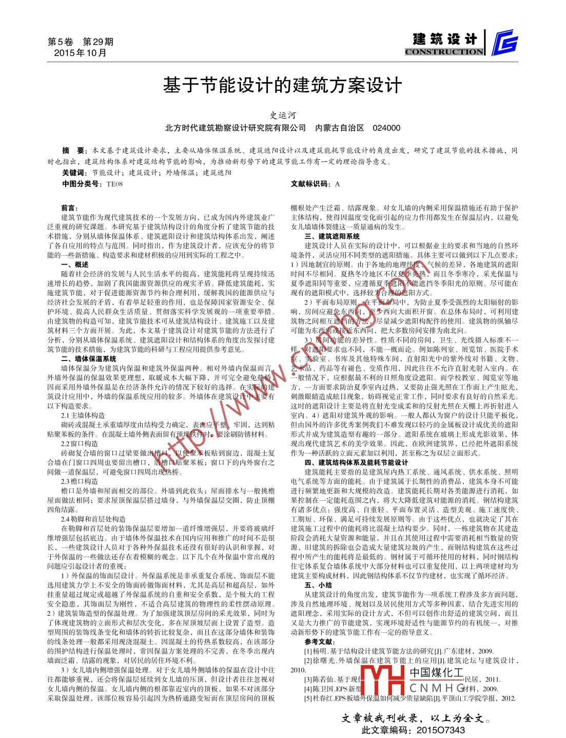 第5卷第29期建筑設(shè)計(jì)2015年10月CONSTRUCTIONI后基于節(jié)能設(shè)計(jì)的建筑方案設(shè)計(jì)史運(yùn)河北方時(shí)代建筑勘察設(shè)計(jì)研究院有限公司內(nèi)蒙古 自治區(qū)024000摘要:本文基于建筑設(shè)計(jì)要求,主要從墻體保溫系統(tǒng)、建筑遮陽(yáng)設(shè)計(jì)以及建筑能耗節(jié)能設(shè)計(jì)的角度出發(fā),研究了建筑節(jié)能的技術(shù)措施,同時(shí)也指出,建筑結(jié)構(gòu)體系對(duì)建筑結(jié)構(gòu)節(jié)能的影響,為推動(dòng)新形勢(shì)下的建筑節(jié)能工作有一定的理論指導(dǎo)意義。關(guān)鍵詞:節(jié)能設(shè)計(jì);建筑設(shè)計(jì);外墻保溫;建筑遮陽(yáng)中圖分類號(hào): TEO8文獻(xiàn)標(biāo)識(shí)碼: A棚根處產(chǎn)生泛霜、結(jié)露現(xiàn)象。對(duì)女兒墻的內(nèi)側(cè)采用保溫措施還有助于保護(hù)建筑節(jié)能作為現(xiàn)代建筑技術(shù)的一-個(gè)發(fā)展方向,已成為國(guó)內(nèi)外建筑業(yè)廣主體結(jié)構(gòu).使得因溫度變化而引起的應(yīng)力作用都發(fā)生視的研究課題。本研究基于建進(jìn)墻體劃繼這一質(zhì)盤通病的發(fā)生。力作用都發(fā)生在保溫層內(nèi),以避免泛重視的研究課題。本研究基于建筑結(jié)構(gòu)設(shè)計(jì)的角度分析了建筑節(jié)能的技女兒墻量通病的發(fā)生。術(shù)措施,分別從墻體保溫體系、建筑遮陽(yáng)設(shè)計(jì)和建筑結(jié)構(gòu)體系出發(fā),闡述三、建筑遮陽(yáng)系統(tǒng)了各自應(yīng)用的特點(diǎn)與范圍。同時(shí)指出,作為建筑設(shè)計(jì)者,應(yīng)該充分的將節(jié)建筑設(shè)計(jì)人員在實(shí)際的設(shè)計(jì)中,可以根據(jù)業(yè)主的要求和當(dāng)?shù)氐淖匀画h(huán)能的一些新措施、構(gòu)造要求和建材積極的應(yīng)用到實(shí)際的工程之中。境條件,靈活應(yīng)用不同類型的遮陽(yáng)措施。具體主要可以做到以下幾點(diǎn)要求:一、概述1)因地制宜的原則。由于各地的地理緯度、氣候的差異,各地建筑的遮陽(yáng)隨著社會(huì)經(jīng)濟(jì)的發(fā)展與人民生活水平的提高,建筑能耗將呈現(xiàn)持續(xù)迅時(shí)間不盡相同。 夏熱冬冷地區(qū)不僅夏季炎熱,而且冬季寒冷,采光保溫與速增長(zhǎng)的趨勢(shì),加劇了我國(guó)能源資源供應(yīng)的現(xiàn)實(shí)矛盾。降低建筑能耗,實(shí)夏季遮陽(yáng)同等重要,應(yīng)遵循夏季遮陽(yáng)不能遮擋冬季陽(yáng)光的原則。盡可能在施建筑節(jié)能,對(duì)于促進(jìn)能源資源節(jié)約和合理利用,緩解我國(guó)的能源供應(yīng)與現(xiàn)有 的遮陽(yáng)模式中,選擇較為合理的遮陽(yáng)方式。經(jīng)濟(jì)社會(huì)發(fā)展的矛盾,有著舉足輕重的作用,也是保障國(guó)家資源安全、保2)平面布局原則。在平面布局中,為防止夏季受強(qiáng)烈的太陽(yáng)輻射的影護(hù)環(huán)境、提高人民群眾生活質(zhì)量、貫徹落實(shí)科學(xué)發(fā)展觀的一項(xiàng)重要舉措。響, 房間應(yīng)避免東西向,至少西向大面積開窗。在總體布局時(shí),可利用建由建筑物的構(gòu)造可知,建筑節(jié)能技術(shù)可從建筑結(jié)構(gòu)設(shè)計(jì)、建筑施工以及建筑物之間相互遮擋的方法,盡量減少遮陽(yáng)構(gòu)配件的使用。建筑物的縱軸盡筑材料三個(gè)方面開展。為此,本文基于建筑設(shè)計(jì)對(duì)建筑節(jié)能的方法進(jìn)行了可 能為東西向或接近東西向,把大多數(shù)房間安排為南北向。分析,分別從墻體保溫系統(tǒng)、建筑遮陽(yáng)設(shè)計(jì)和結(jié)構(gòu)體系的角度出發(fā)探討建3)房間功能的差異性。性質(zhì)不同的房間,衛(wèi)生、光線攝人標(biāo)準(zhǔn)不一筑節(jié)能的技術(shù)措施,為建筑節(jié)能的科研與工程應(yīng)用提供參考意見。樣,對(duì)遮陽(yáng)要求也不同,不能一 概而論。例如陳列室、展覽館、醫(yī)院手術(shù)二、墻體保溫系統(tǒng)室、實(shí)驗(yàn)室、書庫(kù)及其他特殊車間,直射陽(yáng)光中的紫外線對(duì)書籍、文物、墻體保溫分為建筑內(nèi)保溫和建筑外保溫兩種。相對(duì)外墻內(nèi)保溫而言,藝術(shù)品 、藥品等有褪色、變質(zhì)作用,因此往往不允許直射光射入室內(nèi)。在外墻:外保溫的保溫效果更理想,取暖成本大幅下降,并可完全避免熱橋,-股情況下, 應(yīng)根據(jù)最不利的日照角度設(shè)遮陽(yáng)。而學(xué)校教室、閱覽室等地因而采用外墻外保溫是在經(jīng)濟(jì)條件允許的情況下較好的選擇。在實(shí)際的建方,一方面要求防治夏季室內(nèi)過熱,又要防止強(qiáng)光照在工作面上產(chǎn)生眩光,筑設(shè)計(jì)應(yīng)用中,外墻的保溫系統(tǒng)應(yīng)用的較多。外墻體在建筑設(shè)計(jì)中主要有刺激眼睛造 成眩目現(xiàn)象,妨礙視覺正常工作,同時(shí)要求有良好的自然采光。以下構(gòu)造要求。這時(shí)的遮陽(yáng)設(shè)計(jì)主要是將直射光變成柔和的反射光照在天棚上再折射進(jìn)人2.1主墻體構(gòu)造室內(nèi)。4)遮陽(yáng)對(duì)建筑外觀的影響。一般人都認(rèn)為窗戶的設(shè)計(jì)只能平板化,砌磚或混凝土承重墻厚度由結(jié)構(gòu)受力確定,表面應(yīng)平整、牢固,達(dá)到粘但 由國(guó)外的許多優(yōu)秀案例我們不難發(fā)現(xiàn)以輕巧的金屬板