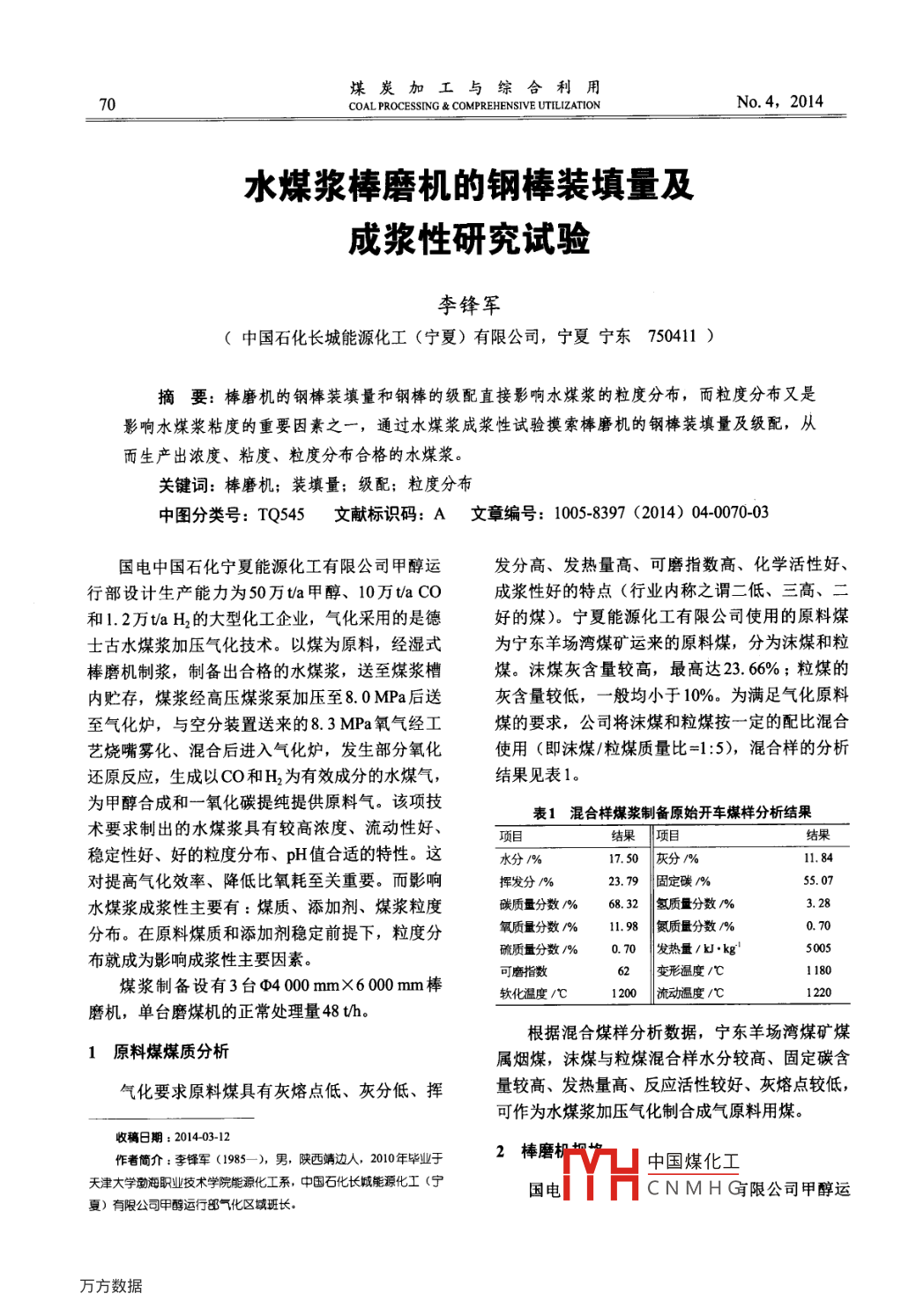 煤炭加工與綜合利用COAL PROCESSING COMPREHENSIVE UTILIZATIONNo.4,2014水煤漿棒磨機(jī)的鋼棒裝填量及成漿性研究試驗(yàn)李鋒軍(中國(guó)石化長(zhǎng)城能源化工(寧夏)有限公司,寧夏寧東750411)摘要:棒磨機(jī)的鋼棒裝填量和鋼棒的級(jí)配直接影響水煤漿的粒度分布,而粒度分布又是影響水煤漿粘度的重要因素之一,通過(guò)水煤漿成漿性試驗(yàn)摸索棒磨機(jī)的鋼棒裝填量及級(jí)配,從而生產(chǎn)出濃度、粘度、粒度分布合格的水煤漿關(guān)鍵詞:棒磨機(jī);裝填量;級(jí)配;粒度分布中圖分類(lèi)號(hào):TQ545文獻(xiàn)標(biāo)識(shí)碼:A文章編號(hào):1005-8397(2014040070-03國(guó)電中國(guó)石化寧夏能源化工有限公司甲醇運(yùn)發(fā)分高、發(fā)熱量高、可磨指數(shù)高、化學(xué)活性好、行部設(shè)計(jì)生產(chǎn)能力為50萬(wàn)ta甲醇、10萬(wàn)taCO成漿性好的特點(diǎn)(行業(yè)內(nèi)稱(chēng)之謂二低、三高、二和1.2萬(wàn)taH2的大型化工企業(yè),氣化采用的是德好的煤)。寧夏能源化工有限公司使用的原料煤士古水煤漿加壓氣化技術(shù)。以煤為原料,經(jīng)濕式為寧東羊場(chǎng)灣煤礦運(yùn)來(lái)的原料煤,分為沫煤和粒棒磨機(jī)制漿,制備出合格的水煤漿,送至煤漿槽煤。沫煤灰含量較高,最高達(dá)23.66%;粒煤的內(nèi)貯存,煤漿經(jīng)高壓煤漿泵加壓至8.0MPa后送灰含量較低,一般均小于10%。為滿(mǎn)足氣化原料至氣化爐,與空分裝置送來(lái)的8.3MPa氧氣經(jīng)工煤的要求,公司將沫煤和粒煤按一定的配比混合藝燒嘴霧化、混合后進(jìn)入氣化爐,發(fā)生部分氧化使用(即沫煤/粒煤質(zhì)量比=1:5),混合樣的分析還原反應(yīng),生成以CO和H2為有效成分的水煤氣結(jié)果見(jiàn)表1。為甲醇合成和一氧化碳提純提供原料氣。該項(xiàng)技表1混合樣煤漿制備原始開(kāi)車(chē)媒樣分析結(jié)果術(shù)要求制出的水煤漿具有較高濃度、流動(dòng)性好、結(jié)果項(xiàng)目日結(jié)果穩(wěn)定性好、好的粒度分布、pH值合適的特性。這17.50灰分/%對(duì)提高氣化效率、降低比氧耗至關(guān)重要。而影響揮發(fā)分/%23.79固定碳/%55.07水煤漿成漿性主要有:煤質(zhì)、添加劑、煤漿粒度碳質(zhì)量分?jǐn)?shù)%68.32氫質(zhì)量分?jǐn)?shù)%分布。在原料煤質(zhì)和添加劑穩(wěn)定前提下,粒度分氧質(zhì)量分?jǐn)?shù)%119氮質(zhì)量分?jǐn)?shù)/%0.70布就成為影響成漿性主要因素。硫質(zhì)量分?jǐn)?shù)發(fā)熱量/k→kg5005可磨指數(shù)62變形溫度/℃煤漿制備設(shè)有3臺(tái)Φ4000mm×6000mm棒軟化溫度/℃1200流動(dòng)溫度/℃磨機(jī),單臺(tái)磨煤機(jī)的正常處理量48th。根據(jù)混合煤樣分析數(shù)據(jù),寧東羊場(chǎng)灣煤礦煤1原料煤煤質(zhì)分析屬煙煤,沫煤與粒煤混合樣水分較髙、固定碳含氣化要求原料煤具有灰熔點(diǎn)低、灰分低、揮量較高、發(fā)熱量高、反應(yīng)活性較好、灰熔點(diǎn)較低,可作為水煤漿加壓氣化制合成氣原料用煤。收稿日期:201403-12作者簡(jiǎn)介:李鐸軍(1985),男,陜西靖邊人,2010年畢業(yè)于2棒磨中國(guó)煤化工天津大學(xué)勁海職業(yè)技術(shù)學(xué)院能源化工系,中國(guó)石化長(zhǎng)城斃源化工(寧國(guó)電CNMHG限公司甲醇運(yùn)夏)有限公司甲醇運(yùn)行氣化區(qū)域班長(zhǎng)2014年第4期李峰軍:水煤漿棒磨機(jī)的鋼棒裝填量及成漿性研究試驗(yàn)71行部采用的棒磨機(jī)為中信重工機(jī)械股份有限公司在一起時(shí),鋼棒之間縫隙較大,物料在其中的流制造的濕式溢流型棒磨機(jī);內(nèi)襯橡膠襯板。棒磨速較快,研磨時(shí)間變短。同時(shí),物料與磨煤機(jī)筒機(jī)的技術(shù)參數(shù)見(jiàn)表2。體之間接觸面較小,因而會(huì)出現(xiàn)研磨不充分的現(xiàn)表2棒磨機(jī)技術(shù)參數(shù)象。如果在粗棒之間添加細(xì)棒,鋼棒之間的縫隙數(shù)值就會(huì)變小。同時(shí),鋼棒與物料接觸面積會(huì)增大筒體內(nèi)徑/mm4000物料在磨煤機(jī)內(nèi)流速變慢,物料有較多的機(jī)會(huì)與筒體工作轉(zhuǎn)鋼棒接觸從而使煤漿被研磨更細(xì)2。入口粒度/mm≤10為滿(mǎn)足水煤漿氣化工藝要求的粒度分布,首推薦裝棒量/t先要解決的是棒磨機(jī)的鋼棒級(jí)配及裝填量。因此,磨棒直徑規(guī)格/mm在初次制漿時(shí),進(jìn)行了水煤漿成漿性試驗(yàn)(即粒筒體工作長(zhǎng)度/mm度分布與鋼棒級(jí)配及裝填量的工業(yè)試驗(yàn))。筒體有效容積/m369.81鋼棒最大裝填量/t5水煤漿成漿性試驗(yàn)最大處理能力68.20磨煤機(jī)鋼棒的型號(hào)分別為:q75mm×5800mm3氣化對(duì)水煤漿要求q65mm×5800mm、50mm×5800mm。使用的是德士古氣化工藝對(duì)原料要求較高,相應(yīng)地對(duì)寧夏南益化工有限公司的水煤漿添加劑,添加劑的水煤漿的性質(zhì)也有以下五方面的要求,即:較高加入量為干煤質(zhì)量的0.26%,三種鋼棒的添加量依的濃度、較好的流動(dòng)性、較好的穩(wěn)定性、適宜的據(jù)以往的生產(chǎn)經(jīng)驗(yàn)比例為343,磨煤機(jī)鋼棒的添加pH值、適宜的粒度分布。其中,粒度分布是影量需根據(jù)水煤漿特性做出調(diào)整。響水煤漿成漿的關(guān)鍵因素。若水煤漿中粗顆粒較根據(jù)寧煤甲醇項(xiàng)目生產(chǎn)情況,借鑒一些生產(chǎn)多,煤漿表觀粘度下降,流動(dòng)性變好,但粒子的方面經(j
