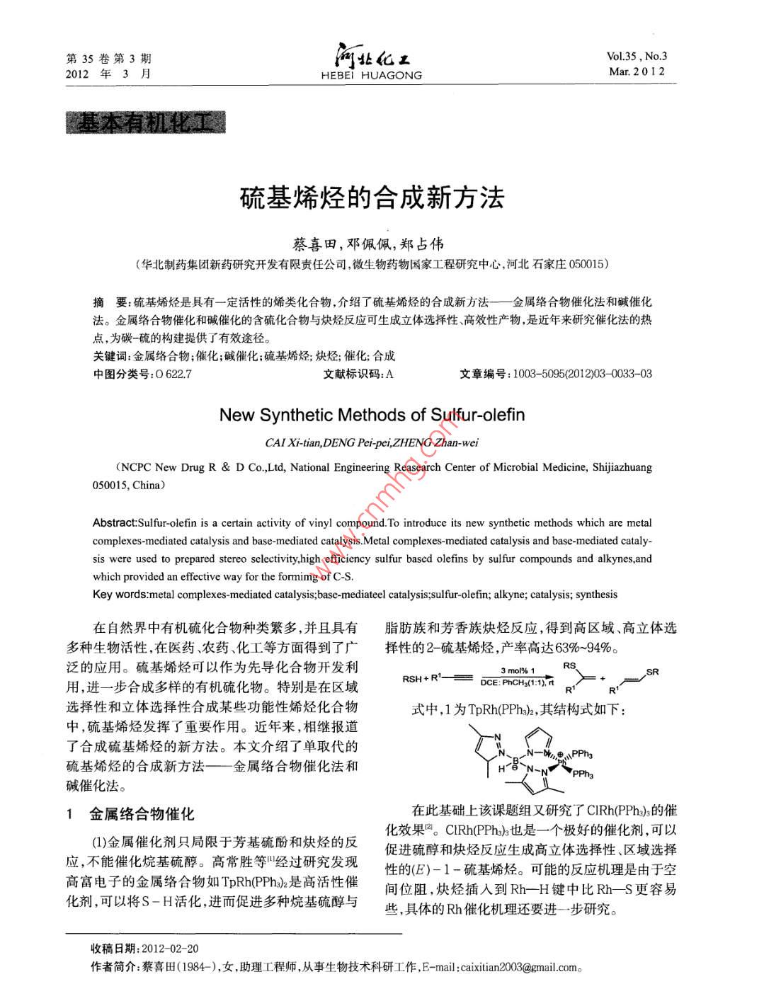 第35卷第3期河北化工Vol.35 , No.32012年3月HEBEi HUAGONGMar.20 12基本有機(jī)化工硫基烯烴的合成新方法蔡喜田,鄧佩佩,鄭占偉(華北制藥集團(tuán)新藥研究開(kāi)發(fā)有限責(zé)任公司,微生物藥物國(guó)家工程研究中心,河北石家莊050015)摘要:硫基烯烴是具有一定活性的烯類化合物,介紹了硫基烯烴的合成新方法一金屬絡(luò)合物催化法和堿催化法。金屬絡(luò)合物催化和堿催化的含硫化合物與炔烴反應(yīng)可生成立體選擇性、高效性產(chǎn)物,是近年來(lái)研究催化法的熱點(diǎn),為碳-硫的構(gòu)建提供了有效途徑。關(guān)鍵詞:金屬絡(luò)合物;催化;堿催化;硫基烯烴;炔烴;催化;合成中圖分類號(hào):0 622.7文獻(xiàn)標(biāo)識(shí)碼:A文章編號(hào): 1003- 5095(2012)03-0033-03New Synthetic Methods of Sulfur- olefinCAI Xi-tian,DENG Pei-pei,ZHENG Zhan-wei(NCPC New Drug R & D Co,Ltd, National Engineering Reasearch Center of Microbial Medicine, Shijiazhuang050015, China)Abstract:Sulfur-olefin is a certain activity of vinyI compound.To introduce its new synthetic methods which are metalcomplexes-mediated catalysis and base-mediated catalysis.Metal complexes-mediated catalysis and basc-mediated cataly-sis were used to prepared stereo selectivity,high efficiency sulfur based olefins by sulfur cormpounds and alkynes,andwhich provided an effective way for the formimg ofCS.Key words:metal complexes mediated catalysis;basc-mediateel catalysis;sulfur-olefin; alkyne; catalysis; synthesis在自然界中有機(jī)硫化合物種類繁多,并且具有脂肪族和芳香族炔烴反應(yīng),得到高區(qū)域、高立體選多種生物活性,在醫(yī)藥、農(nóng)藥、化工等方面得到了廣擇性的2-硫基烯烴,產(chǎn)率高達(dá)63%~94%。泛的應(yīng)用。硫基烯烴可以作為先導(dǎo)化合物開(kāi)發(fā)利3 mol% 1SRDCE: PhCH(1:1).年用,進(jìn)-步合成多樣的有機(jī)硫化物。特別是在區(qū)域選擇性和立體選擇性合成某些功能性烯烴化合物式中,1為TpRh(PPh)2,其結(jié)構(gòu)式如下:中,硫基烯烴發(fā)揮了重要作用。近年來(lái),相繼報(bào)道了合成硫基烯烴的新方法。本文介紹了單取代的硫基烯烴的合成新方法一-金屬絡(luò)合物催化法和H7百▼PPhs堿催化法。金屬絡(luò)合物催化在此基礎(chǔ)上該課題組又研究了CIRh(PPha)s的催(1)金屬催化劑只局限于芳基硫酚和炔烴的反化效果”。CIRh(PPhz)s也是- 一個(gè)極好的催化劑,可以應(yīng),不能催化烷基硫醇。高常勝等"經(jīng)過(guò)研究發(fā)現(xiàn)促進(jìn)硫醇和炔烴反應(yīng)生成高立體選擇性、區(qū)域選擇高富電子的金屬絡(luò)合物如TpRhPPh)z是高活性催性的(E)-1 -硫基烯烴??赡艿姆磻?yīng)機(jī)理是由于空間位阻,炔烴插人到Rh-H鍵中比Rh-S更容易化劑,可以將S-H活化,進(jìn)而促進(jìn)多種烷基硫醇與些,具體的Rh催化機(jī)理還要進(jìn)--步研究。收稿日期:2012-02-20作者簡(jiǎn)介:蔡喜田(1984-),女,助理工程師,從事生物技術(shù)科研工作,E-mail:caixitian2003@gmail.com。●34●河北化工Hebei Chemical Industry第35卷如果是二硫醇,兩邊都發(fā)生反式加成反應(yīng):.HS.3 mol%CIRh(PPhg)s(^SH◆MesSh=一DCEn24h MeySr(2)Malyshev研究了-種新型的均相催化體系OCH2SO2H"CpNi(IMes)Cl,可以催化單個(gè)的ArSH與端炔的反應(yīng),主要生成符合馬氏規(guī)則的產(chǎn)物2-硫基烯烴,D避免了1,2-二硫基烯烴的生成。此反應(yīng)副產(chǎn)物少,區(qū)域選擇性較高,加入6mol%的EtN后產(chǎn)率明Cs* +H2Q .顯提高,產(chǎn)率高達(dá)61%~87%。中間體CpNi(NHC)(SAr)已經(jīng)通過(guò)X射線分析確認(rèn),所以可以推測(cè)出(2)Silva等"研究了-種綠色催化體系A(chǔ)l2Os/該反應(yīng)主要經(jīng)過(guò)3個(gè)步驟完成:(1)LnNi-SAr鍵的KF,無(wú)溶劑條件下,Al2OJKF催化芳香族和脂肪族硫生成;(2)炔烴插人到Ni-S鍵中;(3Ni--C鍵的質(zhì)醇對(duì)端炔的加成反應(yīng)得到硫基烯烴。這是一個(gè)環(huán)子分解。反應(yīng)式如下:保型的催化劑,避免了使用有毒試劑,且反應(yīng)產(chǎn)物為無(wú)機(jī)鹽,易分離。反應(yīng)式如下:>-sH+ = RI CMMColCCOElsN, 80 c, 5hR1R-=-H + R'S-HA_OyKF(402)80.N sR:_sR'2堿催化R=CH2OH, C(CH)CzHgOH, CH2CH2OH, C(CH3)2OH, CeHs. CgH11(1)在有機(jī)合成中,一些反應(yīng)需要在堿性條件下R! =CHs, p -CICgHa. C1zH25才能快速有效進(jìn)行,但是如果底物含有對(duì)強(qiáng)堿比較3結(jié)論敏感的官能團(tuán),就會(huì)限制此底物在該體系中的反硫基烯烴是具有一定活性的烯類化合物。硫應(yīng)。碳酸銫作為堿可解決這--矛盾,其優(yōu)點(diǎn)主要表現(xiàn)在:碳酸銫堿性較弱,不會(huì)對(duì)那些對(duì)堿非常敏感基烯烴及其氧化衍生物是有機(jī)化學(xué)合成轉(zhuǎn)化中的的底物造成明顯的影響;碳酸銫引入到體系中能明重要中間體,如Diels-Alder反應(yīng)、交叉偶聯(lián)反應(yīng)、顯增強(qiáng)底物的親核性。碳酸銫促進(jìn)的有機(jī)反應(yīng)類型Heck反應(yīng)、單鍵重排反應(yīng)、Pauson-Khand反應(yīng)及主要包括碳碳鍵"以及碳雜鍵”的形成、不對(duì)稱合成Michael加成反應(yīng)。除了其在有機(jī)合成中的應(yīng)用之反應(yīng)間、開(kāi)環(huán)和成環(huán)反應(yīng)”保護(hù)和脫保護(hù)反應(yīng)凹等。外,最近報(bào)道了有機(jī)硫化物在藥物化學(xué)和毒理學(xué)中Kondoh!報(bào)道了在催化量的Cs2CO.和自由基抑的重要應(yīng)用,如一些酶轉(zhuǎn)化的抑制劑烴基(E)-乙烯制劑TEMPO(2,2,6,6-四甲基-1一哌