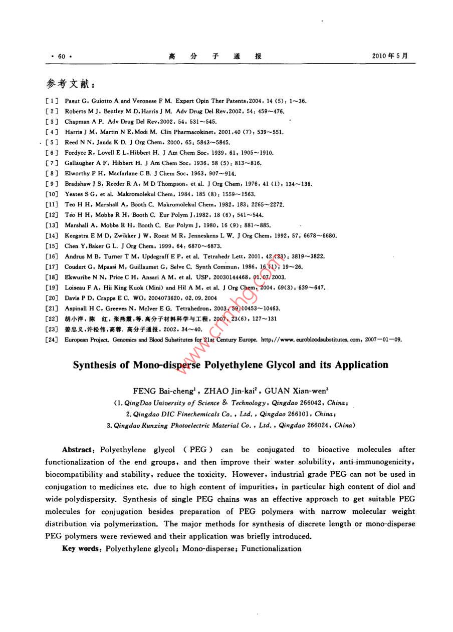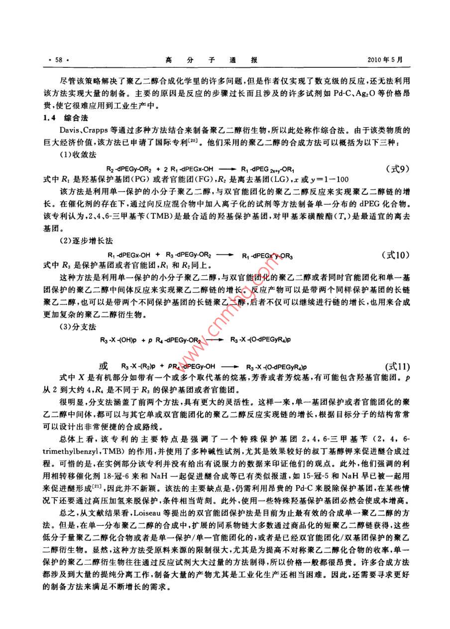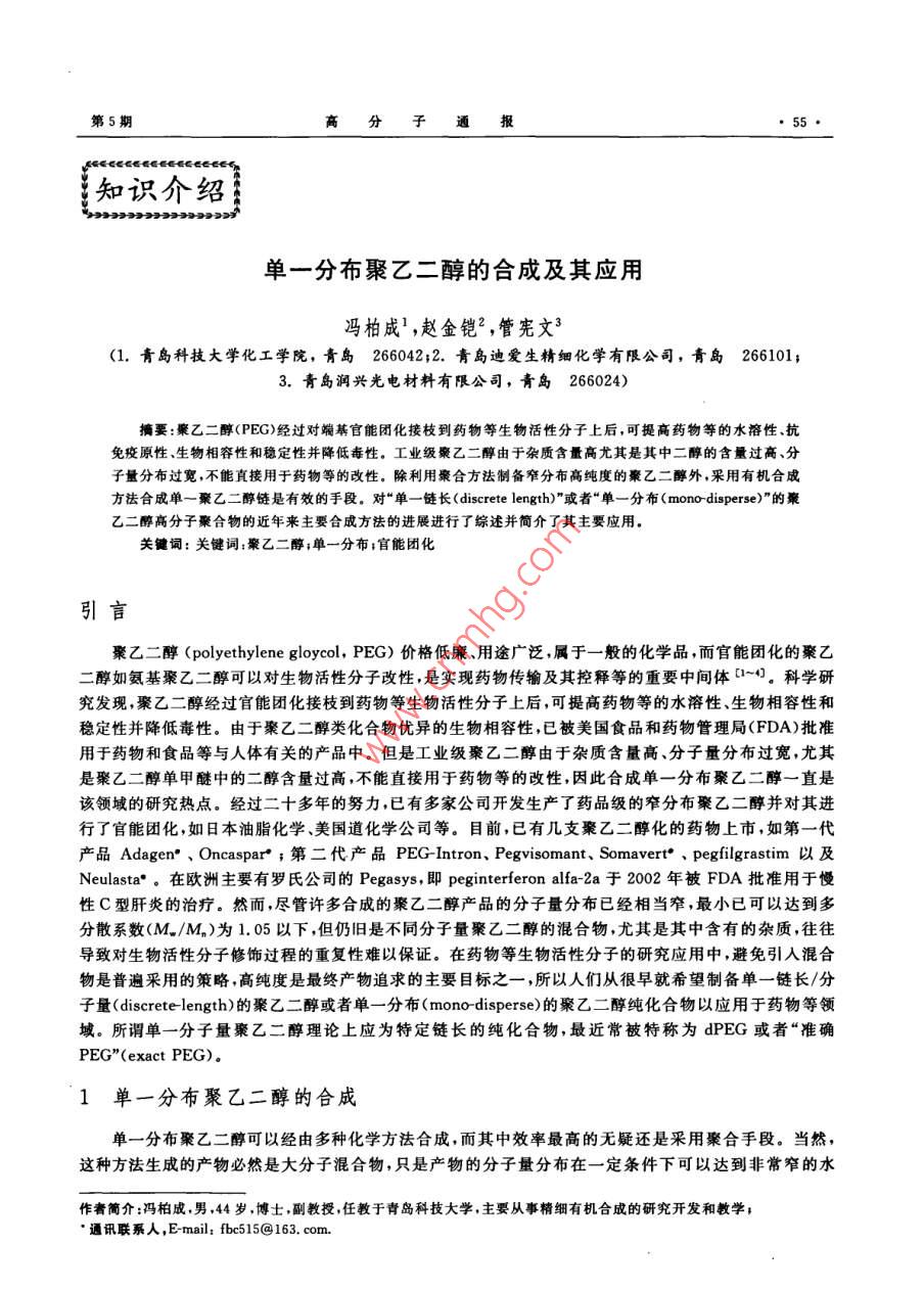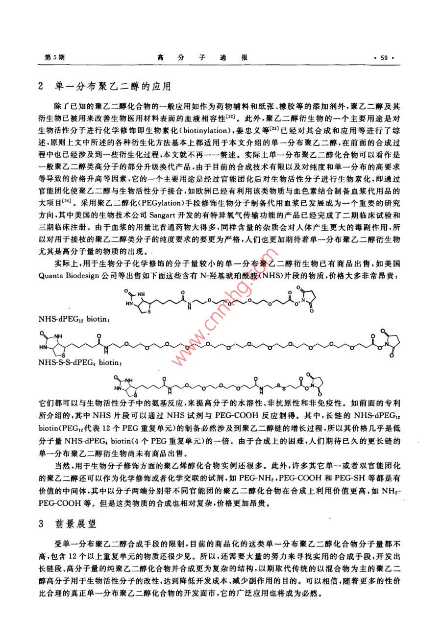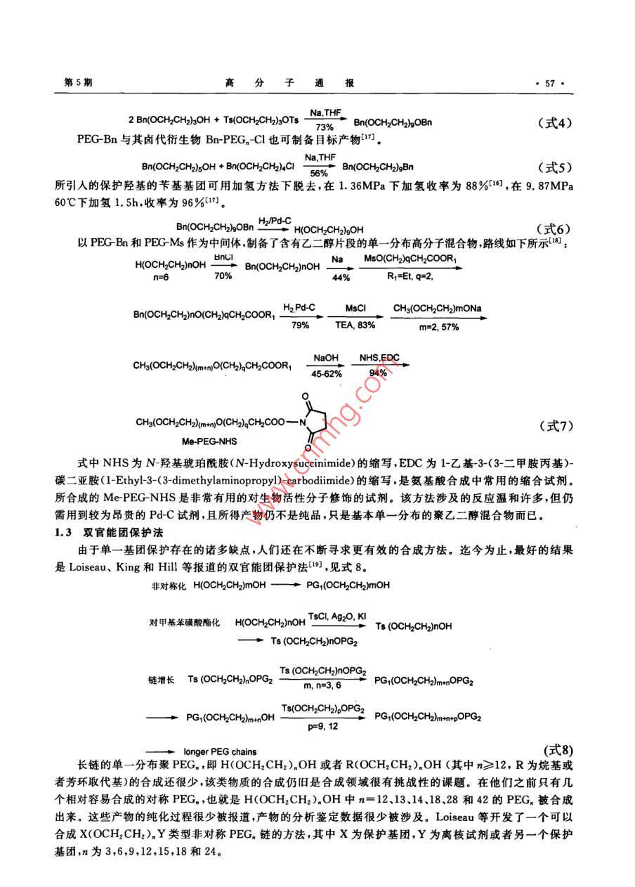 第5期高分子通報知識介紹單一分布聚乙二醇的合成及其應(yīng)用馮柏成',趙金鎧2,管憲文3(1.青島科技大學(xué)化工學(xué)院,青島266042;2.青島迪愛生精細(xì)化學(xué)有限公司,青島266101;3.青島潤興光電材料有限公司,青島266024)摘要:聚乙二醇(PEG)經(jīng)過對端基官能團(tuán)化接枝到藥物等生物活性分子上后,可提高藥物等的水溶性抗免疫原性、生物相容性和穩(wěn)定性并降低毒性。工業(yè)級聚乙二醇由于雜質(zhì)含量高尤其是其中二醇的含量過高、分子量分布過寬,不能直接用于藥物等的改性。除利用豪合方法制備窄分布高純度的聚乙二醇外,采用有機(jī)合成方法合成單一聚乙二醇鏈?zhǔn)怯行У氖侄?。對“單一鏈長( discrete length)”或者“單一分布( mono-disperse)”的聚乙二醇高分子聚合物的近年來主要合成方法的進(jìn)展進(jìn)行了綜述并簡介了其主要應(yīng)用。關(guān)鍵詞:關(guān)鍵詞:聚乙二醇;單一分布;官能團(tuán)化引言聚乙二醇( polyethylene glycol,PEG)價格低廉、用途廣泛,屬于一般的化學(xué)品,而官能團(tuán)化的聚乙二醇如氨基聚乙二醇可以對生物活性分子改性,是實現(xiàn)藥物傳輸及其控釋等的重要中間體-??茖W(xué)研究發(fā)現(xiàn),聚乙二醇經(jīng)過官能團(tuán)化接枝到藥物等生物活性分子上后,可提高藥物等的水溶性、生物相容性和穩(wěn)定性并降低毒性。由于聚乙二醇類化合物優(yōu)異的生物相容性,已被美國食品和藥物管理局(FDA)批準(zhǔn)用于藥物和食品等與人體有關(guān)的產(chǎn)品中。但是工業(yè)級聚乙二醇由于雜質(zhì)含量高、分子量分布過寬,尤其是聚乙二醇單甲醚中的二醇含量過高,不能直接用于藥物等的改性,因此合成單一分布聚乙二醇一直是該領(lǐng)域的研究熱點。經(jīng)過二十多年的努力,已有多家公司開發(fā)生產(chǎn)了藥品級的窄分布聚乙二醇并對其進(jìn)行了官能團(tuán)化,如日本油脂化學(xué)美國道化學(xué)公司等。目前,已有幾支聚乙二醇化的藥物上市,如第一代產(chǎn)品 Adage°、 Oncaspar;第二代產(chǎn)品 PEG-Intron、 Pegvisomant、 Somavert·、 pegfilgrastim以及Neulasta°。在歐洲主要有羅氏公司的 Pegasys,即 peginterferon alfa2a于2002年被FDA批準(zhǔn)用于慢性C型肝炎的治療。然而,盡管許多合成的聚乙二醇產(chǎn)品的分子量分布已經(jīng)相當(dāng)窄最小已可以達(dá)到多分散系數(shù)(M/Mn)為1.05以下,但仍舊是不同分子量聚乙二醇的混合物,尤其是其中含有的雜質(zhì),往往導(dǎo)致對生物活性分子修飾過程的重復(fù)性難以保證。在藥物等生物活性分子的研究應(yīng)用中,避免引入混合物是普遍釆用的策略高純度是最終產(chǎn)物追求的主要目標(biāo)之一,所以人們從很早就希望制備單一鏈長/分子量( discrete-length)的聚乙二醇或者單一分布( mono-disperse)的聚乙二醇純化合物以應(yīng)用于藥物等領(lǐng)域。所謂單一分子量聚乙二醇理論上應(yīng)為特定鏈長的純化合物,最近常被特稱為dPEG或者“準(zhǔn)確PEG”( exact PEG)。1單一分布聚乙二醇的合成單一分布聚乙二醇可以經(jīng)由多種化學(xué)方法合成,而其中效率最高的無疑還是采用聚合手段。當(dāng)然,這種方法生成的產(chǎn)物必然是大分子混合物,只是產(chǎn)物的分子量分布在一定條件下可以達(dá)到非常窄的水作者簡介:馮柏成,男,44歲,博士,副教授,任教于青島科技大學(xué),主要從事精細(xì)有機(jī)合成的研究開發(fā)和教學(xué);通訊聯(lián)系人,E-mail:fbc515@163.com.56高分子通報2010年5月平。例如,以2芐氧基乙醇為引發(fā)劑、氫化鉀為堿,通過環(huán)氧乙烷陰離子聚合反應(yīng),制備了分子量為1000、2000和4500的大分子,產(chǎn)物的多分散指數(shù)(M/M)僅為1.04,即產(chǎn)物分布相當(dāng)窄。但是,該方法的合成條件苛刻,對試劑和溶劑的純度要求極高,大規(guī)模生產(chǎn)不易實現(xiàn)。尤其是,該方法不可能制備出單一分子量的聚乙二醇大分子,即我們通常要求的純化合物。因此,采用有機(jī)合成手段制備大分子即化學(xué)接枝法制備單一分子量聚乙二醇成為常用的有效的手段。1.1早期工作在各種醚的合成方法中, Williamson醚合成法是最常用,最有效的方法,也是制備單一分子量的聚乙二醇的經(jīng)典手段。但是許多早期的合成工作沒有提供足夠的產(chǎn)物的鑒定分析證據(jù),推測得到的產(chǎn)物往往是低聚物或者雜質(zhì)含量極高。例如,早在1939年,按照下述路線合成了聚合度n=6的聚乙二醇,7:CH3ONa2HOCH2CH2OH+ 2CICH2 CH2OCH2CH2CIH(OCH2 CH2)BO(式1)3d產(chǎn)物截取200℃/300pa餾分,可得較純的六聚體,收率僅為45%。該法的主要副產(chǎn)物是單取代的聚乙二醇產(chǎn)物,也就是說,上述反應(yīng)很難進(jìn)行完全。H(OCH2CH2)OH+ CI(CH2 CH2 OCH2CH2)CIH(OCH2 CH2)4CI(式2按照同樣的方法,利用鉀鹽中間體H(OCH2CH2)OK合成了更高級的聚乙二醇包括H(OCH2CH2)18OH和H(OCH2CH2)42OH,但是為了得到純凈的產(chǎn)物必須進(jìn)行復(fù)雜的后處理。諸如對粗產(chǎn)物進(jìn)行數(shù)日的萃取后還要反復(fù)的重結(jié)晶。即使如此,所得的產(chǎn)物可能仍舊不純。類似地,其他作者以低聚的二溴聚乙二醇(如Br(CH2CH2OCH2CH2)5Br)作為主要中間體,合成了所需的單一分布聚乙二M*sm H(OCH2 CH2)OH[8. 9], H(OCH2 CH2), OH 10. 1], H(OCH2, CH2)1s OH [12J因此,這種方法的主要問題就是由于涉及的有關(guān)反應(y