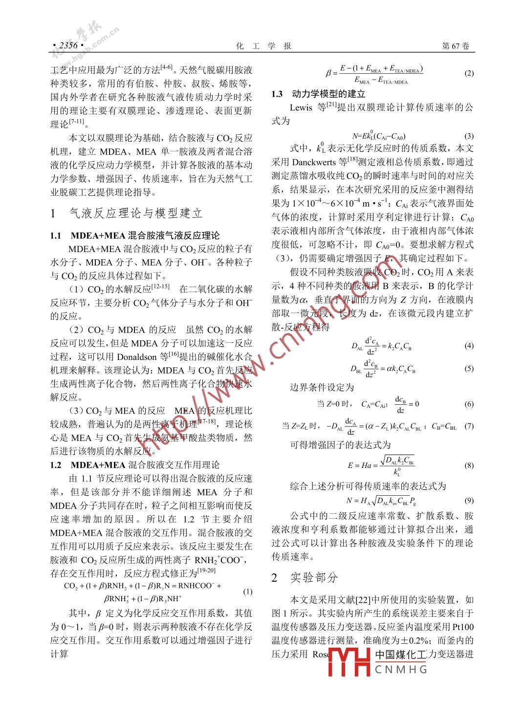 第67卷第6期化工學(xué)報(bào)VoL 67 No, 62016年6月CIESC JournalJune 2016研究論文DOl:10.11949/issn.0438-115720151480MDEA與MEA脫碳反應(yīng)動(dòng)力學(xué)唐建峰,張國君,史澤林1,黃彬1,王曰2,趙銘鈺(中國石油大學(xué)(華東)儲(chǔ)運(yùn)與建筑工程學(xué)院,山東青島266580:2中交煤氣熱力研究設(shè)計(jì)院有限公司,遼寧沈陽11000摘要:通過雙模理論及反應(yīng)釜吸收實(shí)驗(yàn)的方法,建立了胺液脫碳擬一級(jí)傳質(zhì)反應(yīng)模型,并對(duì)其進(jìn)行了實(shí)驗(yàn)驗(yàn)證通過模型中的增強(qiáng)因子、二級(jí)反應(yīng)速率常數(shù)及傳質(zhì)速率分析了伯胺MEA(乙醇胺)及叔胺MDEA(甲基二乙醇胺)的動(dòng)力學(xué)特性,以此為基礎(chǔ)進(jìn)一步分析了MDEA+MEA混合胺液的交互作用、動(dòng)力學(xué)特性,并得到了較優(yōu)的胺液配比。研究結(jié)果表明:伯胺MEA的增強(qiáng)因子及傳質(zhì)速率數(shù)值大于叔胺MDEA,隨著氣液傳質(zhì)過程進(jìn)行,傳質(zhì)速率逐漸減小;對(duì)于混合胺液,表觀反應(yīng)速率常數(shù)以及増強(qiáng)因子隨著MEA濃度的増加以及溫度的升高而逐漸增大;當(dāng)總胺濃度為3mol·L時(shí), MDEA+MEA(2mol·L-+1mol·L)的混合胺液增強(qiáng)因子數(shù)值為0.5,傳質(zhì)速率較大,為最優(yōu)混合胺液配比。關(guān)鍵詞:天然氣;脫碳;MDEA;MEA:動(dòng)力學(xué);傳質(zhì)中圖分類號(hào):TE644文獻(xiàn)標(biāo)志碼:A文章編號(hào):0438-1157(2016)06-2355-08Decarbonization reaction kinetics of mdea and meaTANG Jianfeng, ZHANG Guojun, SHI Zelin, HUANG Bin, WANG Yue, ZHAO MingyuCollege of Pipeline and Civil Engineering, China University of Petroleum, Qingdao 266580, Shandong, China; 2CCCC Gas &eHeat Research and Design Institute Co, Ltd, Shenyang 110000, Liaoning, China)Abstract: Based on the small reaction kettle experiment device, the data approximation could be adopt toestablish the kinetics model by two-film theory. Then the reaction kinetics of amine solutions of mea(monoethanolamine), MDEA(methyldiethanolamine) and both mixtures were analyzed by the model. Thereaction kinetics models of MEA and MDEA, which was established by pseudo-first-order reaction, could forecastgas-liquid mass transfer performance of them well after experimental verification. The result showed that theinteraction coefficient and mass transfer rate of mea was higher than that of mdea, the mass transfer ratesdecreased with the process of reaction. In addition, the apparent propagation rate constant and enhancement factorof mixed amine increased with the increasing temperature and the ratio of MEA. At last, it forecasted that themixed amine of MDEA+MEA (2 mol.L+I mol.L) had the better decarbonization performance, which hadhigher mass transfer rate with its enhancement factor of 0.5Key words: natural gas; decarbonization; MDEA; MEA; reaction kinetic; mass transfer天然氣脫碳工藝方法種類繁多,如化學(xué)吸收法、物理吸收法、膜分離法等3。目前醇胺法由于其吸收天然氣脫碳是天然氣預(yù)處理工藝的關(guān)鍵環(huán)節(jié),容量大、傳質(zhì)速率快、脫除率高等優(yōu)點(diǎn)仍然是脫碳2015-09-21收到初稿,201603-25收到修改稿。Received date: 2015-09-21聯(lián)系人及第一作者:唐建峰(1973—-),男,教授CorrespondingauthorProf.TangJianfeng,tangpapera126.com項(xiàng)目基金:天然氣預(yù)處理用大型塔器研制(工信部聯(lián)裝[2014]495Foundation item: supported by the Development of Large Tower for號(hào)):中央高?;究蒲袠I(yè)務(wù)費(fèi)專項(xiàng)資金項(xiàng)目(14CX05033A)。Natural Gas Pretreatantal Research Fundfor the Central unive中國煤化工CNMHG2356化工學(xué)報(bào)第67卷工藝中應(yīng)用最為廣泛的方法46。天然氣脫碳用胺液B=E-d+ EMEA ETEA MDEA)種類較多,常用的有伯胺、仲胺、叔胺、烯胺等,國內(nèi)外學(xué)者在研究各種胺液氣液傳質(zhì)動(dòng)力學(xué)時(shí)采1.3動(dòng)力學(xué)模型的建立用的理論主要有雙膜理論、滲透理論、表面更新Lewis等凹2提出雙膜理論計(jì)算傳質(zhì)速率的公理論71式為本文以雙膜理論為基礎(chǔ),結(jié)合胺液與CO2反應(yīng)N=EkL(CAiCAo機(jī)理,建立MDEA、MEA單一胺液及兩者混合溶式中,表示無化學(xué)反應(yīng)時(shí)的傳質(zhì)系數(shù),本文液的化學(xué)反應(yīng)動(dòng)力學(xué)模型,并計(jì)算各胺液的基本動(dòng)采用 Danckwerts等測定液相總傳質(zhì)系數(shù),即通過力學(xué)參數(shù)、增強(qiáng)因子、傳質(zhì)速率,旨在為天然氣工測定蒸餾水吸收純CO2的瞬時(shí)速率與時(shí)間的對(duì)應(yīng)關(guān)業(yè)脫碳工藝提供理論指導(dǎo)。系,結(jié)果顯示,在本次研究采用的反應(yīng)釜中測得結(jié)果為1×104~6×104m·s:CA表示氣液界面處1氣液反應(yīng)理論與模型建立氣體的濃度,計(jì)算時(shí)采用亨利定律進(jìn)行計(jì)算;CA1.1MDEA+MEA混合胺液氣液反應(yīng)理論表示液相內(nèi)部所含氣體濃度,由于液相內(nèi)部氣體濃MDEA+MEA混合胺液中與CO2反應(yīng)的粒子有度很低,可忽略不計(jì),即CA0=0。要想求解方程式水分子、MDEA分子、MEA分子、OH。各種粒子(3),仍需要確定增強(qiáng)因子E,其確定過程如下。與CO2的反應(yīng)具體過程如下。假設(shè)不同種類胺液吸收CO2時(shí),CO2用A來表(1)CO2的水解反應(yīng)21在二氧化碳的水解示,4種不同種類的胺液用B來表示,B的化學(xué)計(jì)反應(yīng)環(huán)節(jié),主要分析CO2氣體分子與水分子和OH量數(shù)為,垂直于界面的方向?yàn)?方向,在液膜內(nèi)的反