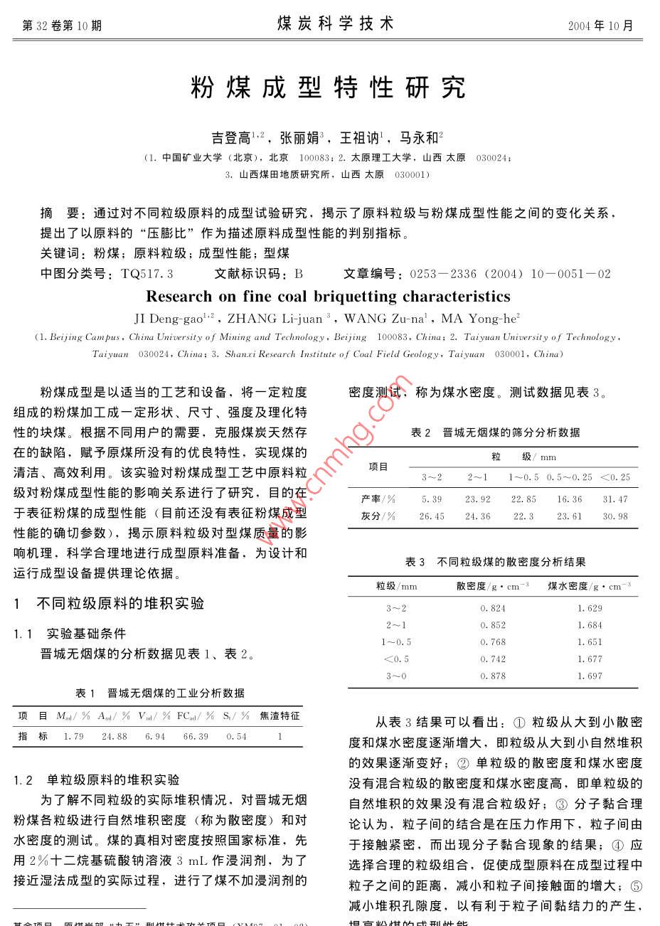 第32卷第10期煤炭科學技術2004年10月粉煤成型特性研究吉登高2,張麗娟,王祖訥,馬永和2(1.中國礦業(yè)大學(北京),北京10083;2.太原理工大學,山西太原0300243.山西煤田地質研究所,山西太原030001摘要:通過對不同粒級原料的成型試驗研究,揭示了原料粒級與粉煤成型性能之間的變化關系,提岀了以原料的“壓膨比”作為描述原料成型性能的判別指標。關鍵詞:粉煤;原料粒級;成型性能;型煤中圖分類號:TQ517.3文獻標識碼:B文章編號:0253-2336(2004)10-0051-02Research on fine coal briquetting characteristicsJI Deng-gao, ZHANG Li-juan, WANG Zu-na', MA Yong-he(1. Beijing Campus, China University of Mining and Technology, Beijing 100083, China; 2. Taiyuan University of TechnologyTaiyuan 030024, China: 3. Shanxi Research Institute of Coal Field Geology, Taiyuan 030001, China)粉煤成型是以適當的工藝和設備,將一定粒度密度測試,稱為煤水密度。測試數據見表3。組成的粉煤加工成一定形狀、尺寸、強度及理化特性的塊煤。根據不同用戶的需要,克服煤炭天然存表2晉城無煙煤的篩分分析數據在的缺陷,賦予原煤所沒有的優(yōu)良特性,實現(xiàn)煤的凊潔、高效利用。該實驗對粉煤成型工藝中原料粒項目3~22~11-0.50.5~0.25<0.25級對粉煤成型性能的影響關系進行了研究,目的在22.8516.36于表征粉煤的成型性能(目前還沒有表征粉煤成型灰分/%26.4524.3622.323.6130.98性能的確切參數),揭示原料粒級對型煤質量的影響機理,科學合理地進行成型原料準備,為設計和運行成型設備提供理論依據表3不同粒級煤的散密度分析結果粒級/mm散密度/g·cm-3煤水密度/g·cm-31不同粒級原料的堆積實驗1.6841.1實驗基礎條件0.7681.651晉城無煙煤的分析數據見表1、表2。<0.50,7420,8781,697表1晉城無煙煤的工業(yè)分析數據項目M。/%A/%Va/%FC/%S/%焦渣特征從表3結果可以看出:①粒級從大到小散密指標1.7924.886.9466.390.54度和煤水密度逐漸增大,即粒級從大到小自然堆積的效果逐漸變好;②單粒級的散密度和煤水密度1.2單粒級原料的堆積實驗沒有混合粒級的散密度和煤水密度高,即單粒級的為了解不同粒級的實際堆積情況,對晉城無煙自然堆積的效果沒有混合粒級好;③分子黏合理粉煤各粒級進行自然堆積密度(稱為散密度)和對論認為,粒子間的結合是在壓力作用下,粒子間由水密度的測試。煤的真相對密度按照國家標準,先于接觸緊密,而出現(xiàn)分子黏合現(xiàn)象的結果;④應用2%十二烷基硫酸鈉溶液3mL作浸潤劑,為了選擇合理的粒級組合,促使成型原料在成型過程中接近濕法成型的實際過程,進行了煤不加浸潤劑的粒子之間的距離,減小和粒子間接觸面的增大;⑤減小堆積孔隙度,以有利于粒子間黏結力的產生,第32卷第10期煤炭科學技術2004年10月1.3不同粒級的原料在外力作用下的堆積實驗見表5為了解不同粒級原料在成型壓力作用下的移位、充填和接觸情況.實驗進行了不同粒級原料在表5不同粒級原料的成型實驗結果外力作用下的密度測試與分析。實驗選用水分粒級/mm壓縮量/mm膨脹量/mm壓縮比壓膨比密度/g·cm-3(Ma)2.82%晉城無煙粉煤,成型壓力為50MPa,2.100.5540.0721.561成型模具為柱狀直徑3.20cm,裝料35g/個,成0.6010.0631.562型原料分別為晉城無煙粉煤(干料)和晉城無煙煤1~0.535.031.930,6610,0551.572外加8%水(濕料)。試驗結果見表4<0.533.00.6230.051.6691.690.6090.0521.647表4不同粒級的原料在外力作用下的堆積實驗結果粒級/mm干料密度/g·cm-3濕料密度/g·cm-8從表5的結果看出:①單粒級從大至小可壓縮性逐漸增大,膨脹量逐漸減小,壓縮密度逐漸增大,顆粒之間作用效果逐漸增強,這說明在同樣外1~0,51.4151.581力的條件下,粒級從大到小成型原料的可塑性逐漸<0.51.672變好;②從壓膨比的數值分析,粒級從大到小壓1.524膨比逐漸減小,壓縮密度逐漸增大,粉煤的成型性能逐漸變好。壓膨比能夠較好地反應原料的成型性從表4可以看出:①粒度從粗到細,在外力能,即成型原料的壓膨比越小其成型性能越好??勺饔孟律⒚芏戎饾u增大,細粒級在外力作用下充填為判別、優(yōu)化和提高粉煤成型性能提供理論依據和堆積效果好;②適當的成型水分可以減少顆粒之間的摩擦,有助于顆粒間的移位,提高顆粒之間結語的相互充填效果,從而提高物料散密度;③混合原料的成型特性是影響粉煤成型過程較為關鍵粒級在外力的作用下散密度比單粒級高,說明混合的內在因素,尤其是原料的彈性與塑性的影響更為粒級在外力作用下顆粒間的移位、堆積效果優(yōu)于單突岀。通過試驗研究,提出原料的“壓膨比”為原粒級,顆粒之間緊密接觸,能夠促使顆粒之間黏附料煤成型性能旳判別指標,為判別不同原料的成型力的產生,有利于提高粉煤成型性能性能提供了依據,為評價原料的成型性能提供了參2分級成型實驗照標準,即成型原料的壓膨比越小其成型性能越好。原料的成型特性不僅與煤種有關,而且與原料不同粒級原料的成型特性,一般采用型煤的抗的粒級及粒級組成、原料的成型水分有關。粒級從壓強度來表示。由于型煤的抗壓強度是一個綜合指大到小成型性能逐漸變好,合理的粒級組成,適當標,它不僅反應原料的成型性能,而且反應型煤黏的成型水分能夠提高原料成型性能。結劑的性能及原料與黏結劑的混合均勻性情況等,參考文獻:用抗壓強度來表示原料的成型性能不確切。為了尋找粉煤成型特性的表征參數,實驗進行了分級成型[1 JI D G. The coal size-composition resea