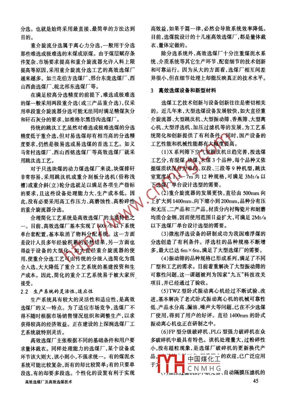 ★科技大觀.選煤新天地★高效選煤廠及高效選煤技術(shù)周少雷鄧曉陽(中煤國際工程集團平頂山選煤設(shè)計研究院,河南平頂山市,4670021)摘要根據(jù)我國煤炭資源的特點,因地制宜、因煤制宜,采用高效選煤技術(shù)可以求得選煤效益的最大化。闡述了我國高效選煤技術(shù)工藝的特點、成熟高效選煤技術(shù)的裝備和新型材料及其自動控制系統(tǒng),并介紹了與高效選煤技術(shù)配合的高效選煤廠設(shè)計上的創(chuàng)新及其優(yōu)勢。關(guān)鍵詞選煤高效選煤技術(shù)高效建煤廠 選煤工藝選謀設(shè)備 .為了縮短建設(shè)工期、降低基建投資,設(shè)計上采取“選煤新天地”是《中國煤炭》今年開辟的一了下列措施:簡化工藝系統(tǒng)、選用大型設(shè)備、降低廠個小專欄,旨在向煤炭及相關(guān)行業(yè)展示國內(nèi)外房高度、采用模塊化裝配結(jié)構(gòu)。為了降低運營成本,先進的洗選技術(shù)及設(shè)備、選煤廠建設(shè)方面的優(yōu)設(shè)計.上達到了下列要求:電力消耗少、材料(介質(zhì)、藥秀設(shè)計、領(lǐng)先的洗選工藝、科研成果以及國內(nèi)選劑)消耗少、設(shè)備故障點少、維修工作量少、備品備件煤廠技改成果,以促進我國選煤業(yè)的健康發(fā)展。少、勞動定員少。為了提高生產(chǎn)效率,通過設(shè)計創(chuàng)新,高效選煤廠20世紀90年代以來,隨著改革開放的進一步實現(xiàn)下列目標:工藝系統(tǒng)合理、設(shè)備運轉(zhuǎn)可靠、管道深人,我國的基本建設(shè)體制發(fā)生了很大的變化。多溜槽耐磨、系統(tǒng)控制自動化、生產(chǎn)過程穩(wěn)定。元化投資體系的建立、基建貸款償還制度的形成項目法人責任制的實施等--系列政策,都促使基本建2高效選煤的工藝 系統(tǒng)設(shè)向高技術(shù)、少投入、多產(chǎn)出的方向健康發(fā)展。“九.高效的概念首先體現(xiàn)在選煤工藝上。狹義地五”期間,國家把“大中型高效選煤廠”列人重點鼓勵講,高效選煤技術(shù)特指以重介旋流技術(shù)作為主要分發(fā)展的產(chǎn)業(yè)之一,高效選煤技術(shù)因而得到更加迅速選工藝的選煤技術(shù)。廣義地講,高效選煤技術(shù)泛指的發(fā)展。選煤設(shè)計研究院集40多年選煤廠設(shè)計和結(jié)合原煤性質(zhì)產(chǎn)品要求和其他一些約束條件而確選煤設(shè)備研究的經(jīng)驗,在吸收借鑒國外選煤廠設(shè)計定的最合理的選煤工藝系統(tǒng)技術(shù)。我們主張推廣以先進經(jīng)驗的基礎(chǔ)上,結(jié)合我國原煤煤質(zhì)和煤炭產(chǎn)品重介旋流技術(shù)為主的廣義高效選煤技術(shù)。市場特點,推出了適合我國國情的新型高效選煤廠。2.1 因地制宜、因煤制宜選擇合適的高效選煤工藝高效選煤廠匯集的眾多的高效選煤技術(shù),對選煤工我國原煤資源豐富,分布范圍廣, 煤質(zhì)差異大,業(yè)的發(fā)展具有重要影響。市場需求不同。面對不同的煤質(zhì)和市場,采用同一種選煤工藝顯然是無法適應(yīng)的。選煤工藝的多樣.1選煤廠 設(shè)計的創(chuàng)新--高效選煤廠化,有利于我們針對不同的煤質(zhì)和要求來合理地選新型高效選煤廠以“縮短建設(shè)工期、降低基建投擇相應(yīng)的工藝,以求選煤效益最高。資、降低運營成本、提高生產(chǎn)效率、提高經(jīng)濟效益”為中國煤化玉、因煤制宜。 該用跳目的,還從系統(tǒng)工程的角度出發(fā),研究、創(chuàng)新和集成G時則用重介選;若重了一系列高效選煤技術(shù),取得了良好效果。;DH.CNMHG選、浮選或其它方法44中國煤炭第28卷第1期2002年1月分選。也就是始終采用最直接、最簡單的方法達到高效益,如果千篇一律,必然會導致系統(tǒng)效率降低。.目的。目前,選煤院設(shè)計的十幾座高效選煤廠,都是量體裁重介旋流分選屬于離心力分選,一般用于分選衣量體定做的。那些難選或極難選的末煤或原煤。由于煤層賦存條除分選系統(tǒng)外,高效選煤廠十分注重煤泥水系件復(fù)雜、市場要求提高和重介旋流器允許入料上限統(tǒng)介質(zhì)系統(tǒng)等其它生產(chǎn)環(huán)節(jié)、配套細節(jié)的技術(shù)創(chuàng)新提高等原因,采用重介旋流分選工藝的高效選煤廠和可靠運行。因為從大的方面看,選煤廠相互間差越來越多。如蘭花伯方選煤廠、邢臺東龐選煤廠、西異很小,但在細節(jié)處理上卻能反映真正的技術(shù)水平。山西曲選煤廠、皖北祁東選煤廠等。在滿足較高分選精度的前提下,難選或極難選3高效選煤設(shè)備和新型材料的煤- -般采用兩段重介選(或三產(chǎn)品重介選),僅采選煤工藝技術(shù)創(chuàng)新與設(shè)備創(chuàng)新往往是密切相關(guān)用單段重介旋流器分選可能無法同時滿足精煤灰分的。近幾年來,大型選煤設(shè)備發(fā)展較快,如大直徑重和矸石灰分的要求,如準格爾黑岱溝選煤廠。介旋流器、大型跳汰機、大型振動篩、香蕉篩、大型離傳統(tǒng)的跳汰工藝雖然對難選或極難選煤的分選心機、大型浮選機、加壓過濾機等的發(fā)展,為工藝系精度低于重介選,但對易選煤卻有相當高的分選精統(tǒng)簡化和創(chuàng)新提供了有利條件。同時,國產(chǎn)設(shè)備的度要求,仍然是極易選或易選煤的首選工藝。如義工藝性能和機械性能都有大幅度提高。馬常村選煤廠、西山西銘選煤廠等高效選煤