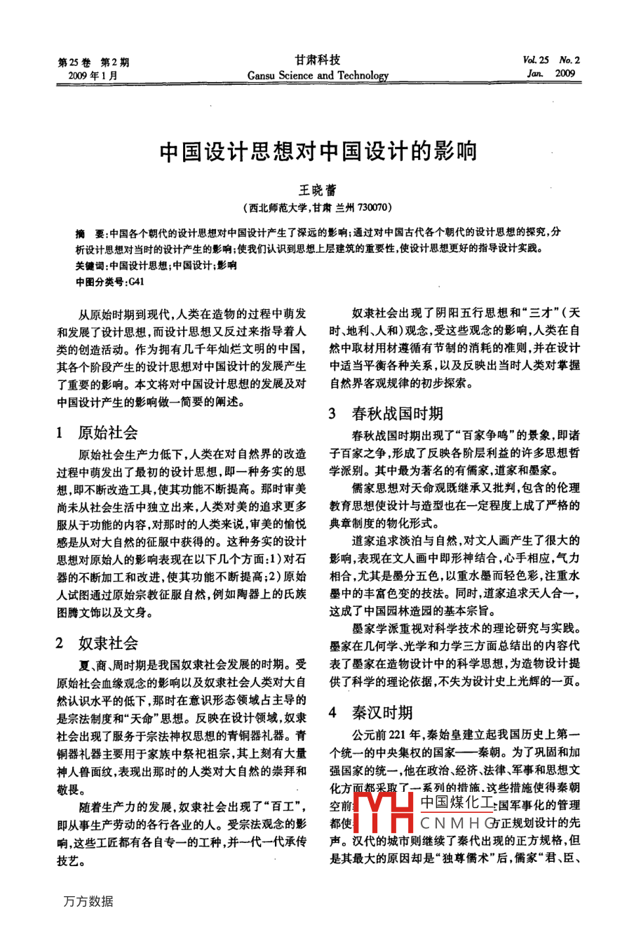 第25卷第2期甘肅科技V25N.200年1月Gansu Science and TechnologyJa.2009中國(guó)設(shè)計(jì)思想對(duì)中國(guó)設(shè)計(jì)的影響王曉蕾(西北師范大學(xué),甘肅蘭州730070)摘要:中國(guó)各個(gè)朝代的設(shè)計(jì)思想對(duì)中國(guó)設(shè)計(jì)產(chǎn)生了深遠(yuǎn)的影響;通過對(duì)中國(guó)古代各個(gè)朝代的設(shè)計(jì)思想的探究,分析設(shè)計(jì)思想對(duì)當(dāng)時(shí)的設(shè)計(jì)產(chǎn)生的影響;使我們認(rèn)識(shí)到思想上層建筑的重要性使設(shè)計(jì)思想更好的指導(dǎo)設(shè)計(jì)實(shí)踐鍵詞:中國(guó)設(shè)計(jì)思想;中國(guó)設(shè)計(jì);影響中圖分類號(hào):C41從原始時(shí)期到現(xiàn)代,人類在造物的過程中萌發(fā)奴隸社會(huì)出現(xiàn)了陰陽五行思想和“三才”(天和發(fā)展了設(shè)計(jì)思想,而設(shè)計(jì)思想又反過來指導(dǎo)著人時(shí)地利人和)觀念,受這些觀念的影響,人類在自類的創(chuàng)造活動(dòng)。作為擁有幾千年?duì)N爛文明的中國(guó),然中取材用材遵循有節(jié)制的消耗的準(zhǔn)則,并在設(shè)計(jì)其各個(gè)階段產(chǎn)生的設(shè)計(jì)思想對(duì)中國(guó)設(shè)計(jì)的發(fā)展產(chǎn)生中適當(dāng)平衡各種關(guān)系,以及反映出當(dāng)時(shí)人類對(duì)掌握了重要的影響。本文將對(duì)中國(guó)設(shè)計(jì)思想的發(fā)展及對(duì)自然界客觀規(guī)律的初步探索。中國(guó)設(shè)計(jì)產(chǎn)生的影響做一簡(jiǎn)要的闡述3春秋戰(zhàn)國(guó)時(shí)期1原始社會(huì)春秋戰(zhàn)國(guó)時(shí)期出現(xiàn)了“百家爭(zhēng)鳴”的景象,即諸原始社會(huì)生產(chǎn)力低下,人類在對(duì)自然界的改造子百家之爭(zhēng),形成了反映各階層利益的許多思想哲過程中萌發(fā)出了最初的設(shè)計(jì)思想,即一種務(wù)實(shí)的思學(xué)派別。其中最為著名的有儒家,道家和墨家想,即不斷改造工具使其功能不斷提高。那時(shí)審美儒家思想對(duì)天命觀既繼承又批判,包含的倫理尚未從社會(huì)生活中獨(dú)立出來人類對(duì)美的追求更多教育思想使設(shè)計(jì)與造型也在一定程度上成了嚴(yán)格的服從于功能的內(nèi)容,對(duì)那時(shí)的人類來說審美的愉悅典章制度的物化形式。感是從對(duì)大自然的征服中獲得的。這種務(wù)實(shí)的設(shè)計(jì)道家追求淡泊與自然,對(duì)文人畫產(chǎn)生了很大的思想對(duì)原始人的影響表現(xiàn)在以下幾個(gè)方面:1)對(duì)石影響表現(xiàn)在文人畫中即形神結(jié)合,心手相應(yīng)氣力器的不斷加工和改進(jìn)使其功能不斷提高;2)原始相合尤其是墨分五色以重水墨而輕色彩注重水人試圖通過原始宗教征服自然例如陶器上的氏族墨中的豐富色變的技法。同時(shí),道家追求天人合一,圖騰文飾以及文身。這成了中國(guó)園林造園的基本宗旨。墨家學(xué)派重視對(duì)科學(xué)技術(shù)的理論研究與實(shí)踐。2奴隸社會(huì)墨家在幾何學(xué)、光學(xué)和力學(xué)三方面總結(jié)出的內(nèi)容代夏、商周時(shí)期是我國(guó)奴隸社會(huì)發(fā)展的時(shí)期。受表了墨家在造物設(shè)計(jì)中的科學(xué)思想為造物設(shè)計(jì)提原始社會(huì)血緣觀念的影響以及奴隸社會(huì)人類對(duì)大自供了科學(xué)的理論依據(jù)不失為設(shè)計(jì)史上光輝的一頁。然認(rèn)識(shí)水平的低下那時(shí)在意識(shí)形態(tài)領(lǐng)域占主導(dǎo)的是宗法制度和"天命”思想。反映在設(shè)計(jì)領(lǐng)域,奴隸4秦漢時(shí)期社會(huì)出現(xiàn)了服務(wù)于宗法神權(quán)思想的青銅器禮器。青公元前221年,秦始皇建立起我國(guó)歷史上第銅器禮器主要用于家族中祭祀祖宗其上刻有大量個(gè)統(tǒng)一的中央集權(quán)的國(guó)家—秦朝。為了鞏固和加神人獸面紋,表現(xiàn)出那時(shí)的人類對(duì)大自然的崇拜和強(qiáng)國(guó)家的統(tǒng)一,他在政治、經(jīng)濟(jì)、法律、軍事和思想文敬畏?;矫娑疾上盗械拇胧┻@些措施使得秦朝隨著生產(chǎn)力的發(fā)展,奴隸社會(huì)出現(xiàn)了“百工”,空前中國(guó)煤化工國(guó)軍事化的管理即從事生產(chǎn)勞動(dòng)的各行各業(yè)的人。受宗法觀念的影都使CNMHG正規(guī)劃設(shè)計(jì)的先響這些工匠都有各自專一的工種,并一代一代承傳聲。漢代的城市則繼續(xù)了秦代出現(xiàn)的正方規(guī)格,但技藝是其最大的原因卻是“獨(dú)尊儒術(shù)”后,儒家“君、臣、甘肅科技第25卷父、子”均齊、有序等級(jí)觀念的體現(xiàn)。同時(shí),由于秦系,加強(qiáng)對(duì)農(nóng)民與其他階級(jí)的統(tǒng)治,以強(qiáng)化鞏固其統(tǒng)漢時(shí)期政權(quán)高度統(tǒng)一,人對(duì)自然的認(rèn)識(shí)水平有限皇治地位的需要,理學(xué)應(yīng)運(yùn)而生。它是宋儒根據(jù)儒家權(quán)、集權(quán)和天學(xué)結(jié)合為一體,皇帝被謂為天子,因此經(jīng)典,研究自然與社會(huì)的起源與構(gòu)成,區(qū)別于儒學(xué)初秦漢時(shí)期的造物風(fēng)格宏大統(tǒng)一、有序而且神圣。衷和漢唐經(jīng)學(xué)的新的學(xué)術(shù)體系。理學(xué)的形成為科學(xué)發(fā)展奠定了社會(huì)思想基礎(chǔ),成為我國(guó)歷史上科學(xué)發(fā)5魏晉南北朝時(shí)期展黃金時(shí)代到來的前