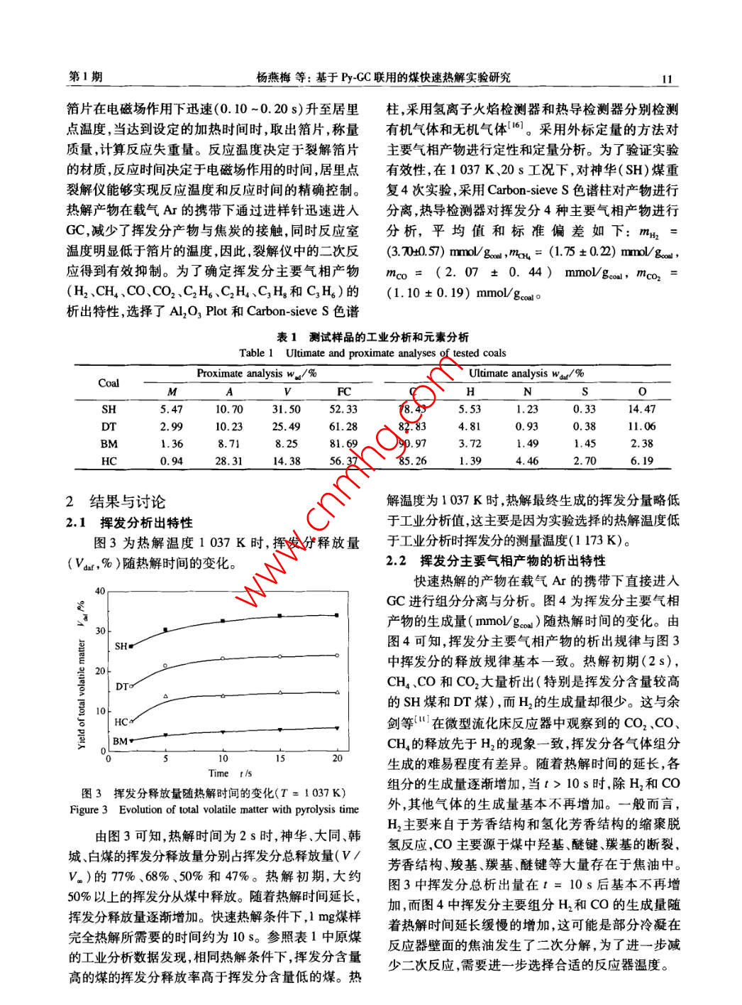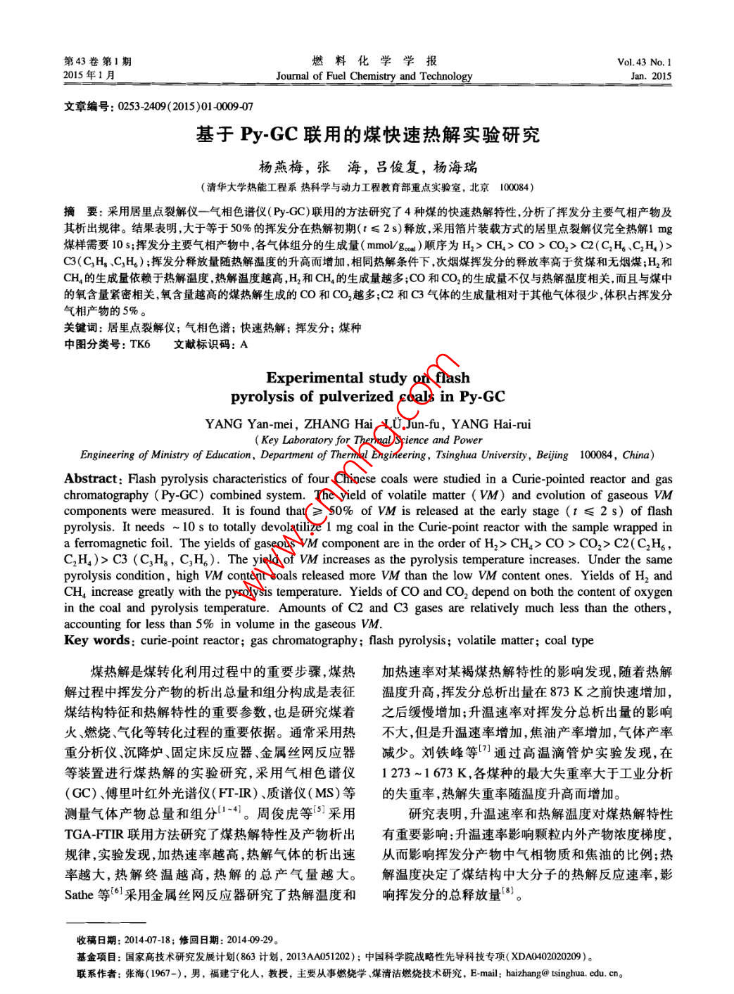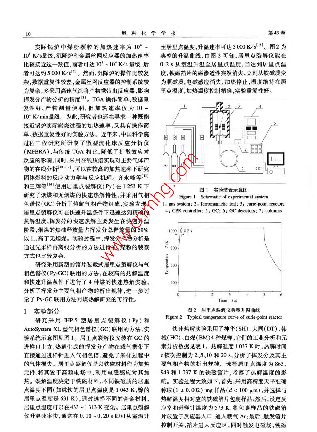 第43卷第1期燃料化學學報Vol. 43 No.12015年1月Joumal of Fuel Chemistry and TechnologyJan. 2015文章編號: 0253 2409(2015)01 000907基于Py.GC聯(lián)用的煤快速熱解實驗研究楊燕梅,張海,呂俊復,楊海瑞.(清華大學熱能工程系熱科學與動力工程教育部重點實驗室,北京1008摘要: 采用居里點裂解儀一氣相色譜儀( Py-GC)聯(lián)用的方法研究了4種煤的快速熱解特性,分析了揮發(fā)分主要氣相產(chǎn)物及其析出規(guī)律。結(jié)果表明,大于等于50%的揮發(fā)分在熱解初期(t≤2s)釋放,采用箔片裝載方式的居里點裂解儀完全熱解1 mg煤樣需要10s;揮發(fā)分主要氣相產(chǎn)物中,各氣體組分的生成量( mmolVgaw )順序為Hh> CH.> co > CO2> C2(CH、CH)>C3(CH,、CjH6);揮發(fā)分釋放量隨熱解溫度的升高而增加,相同熱解條件下,次煙煤揮發(fā)分的釋故率高于貧煤和無煙煤;H和CH,的生成量依賴于熱解溫度,熱解溫度越高,H2和CH,的生成量越多;CO和CO,的生成量不僅與熱解溫度相關(guān),而且與煤中的氧含量緊密相關(guān),氧含量越高的煤熱解生成的CO和CO,越多;C2和C3氣體的生成量相對于其他氣體很少,體積占揮發(fā)分氣相產(chǎn)物的5%。關(guān)鍵詞:居里點裂解儀;氣相色譜;快速熱解;揮發(fā)分;煤種中圖分類號: TK6文獻標識碼: AExperimental study on flashpyrolysis of pulverized coals in Py-GCYANG Yan-mei, ZHANG Hai, LU Jun-fu, YANG Hai-rui( Key Laboratory for Thermal Science and PowerEngineering of Ministry of Education, Department of Thermal Engineering ,Tsinghua University, Beijing 100084, China)Abstract: Flash pyrolysis characteristics of four Chinese coals were studied in a Curie-pointed reactor and gaschromatography ( Py-GC) combined system. The yield of volatile matter ( VM) and evolution of gaseous VMcomponents were measured. It is found that≥50% of VM is released at the early stage (I≤2 s) of flashpyrolysis. It needs ~ 10 s to totally devolatilize 1 mg coal in the Curie-point reactor with the sample wrapped ina ferromagnetic foil. The yields of gaseous VM component are in the order of H2> CH4> CO> CO2> C2(C2H6,C2H)> C3 (C,Hg, C,H6). The yield of VM increases as the pyrolysis temperature increases. Under the samepyrolysis condition, high VM content coals released more VM than the low VM content ones. Yields of H2 andCH, increase greatly with the pyrolysis temperature. Yields of CO and CO2 depend on both the content of oxygenin the coal and pyrolysis temperature. Amounts of C2 and C3 gases are relatively much less than the others,accounting for less than 5% in volume in the gaseous VM.Key words: curie-point reactor; gas chromatography; flash pyrolysis; volatile matter; coal type煤熱解是煤轉(zhuǎn)化利用過程中的重要步驟,煤熱加熱速率對某褐煤熱解特性的影響發(fā)現(xiàn),隨著熱解解過程中揮發(fā)分產(chǎn)物的析出總量和組分構(gòu)成是表征溫度升高,揮發(fā)分總析出量在873 K之前快速增加,煤結(jié)構(gòu)特征和熱解特性的重要參數(shù),也是研究煤著之后緩慢增加;升溫速率對揮發(fā)分總析出量的影響火燃燒氣化等轉(zhuǎn)化過程的重要依據(jù)。通常采用熱不大,但是升溫速率增加,焦油產(chǎn)率增加,氣體產(chǎn)率重分析儀、沉降爐、固定床反應器、金屬絲網(wǎng)反應器減少。劉鐵峰等[7]通過高溫滴管爐實驗發(fā)現(xiàn),在等裝置進行煤熱解的實驗研究,采用氣相色譜儀1 273 ~1 673 K,各煤種的最大失重率大于工業(yè)分析( GC)、傅里葉紅外光譜儀(FT-IR)、質(zhì)譜儀(MS)等的失重率,熱解失重率隨溫度升高而增加。測量氣體產(chǎn)物總量和組分(1-4]。周俊虎等[5]采用研究表明,升溫速率和熱解溫度對煤熱解特性TGA-FTIR聯(lián)用方法研究了煤熱解特性及產(chǎn)物析出有重要影響:升溫速率影響顆粒內(nèi)外產(chǎn)物濃度梯度,規(guī)律,實驗發(fā)現(xiàn),加熱速率越高,熱解氣體的析出速從而影響揮發(fā)分產(chǎn)物中氣相物質(zhì)和焦油的比例;熱率越大,熱解終溫越高,熱解的總產(chǎn)氣量越大。解溫度決定了煤結(jié)構(gòu)中大分子的熱解反應速率,影Sathe等[6采用金屬絲網(wǎng)反應器研究了熱解溫度和響揮發(fā)分的總釋放量[8)。收稿日期: 201407-18;修回日期: 201409-29?;痦椖?國家高技術(shù)研究發(fā)展計劃(863計劃,2013AA051202);中國科學院戰(zhàn)略性先導科技專項( XDA0402020209)。聯(lián)系作者:張海(1967-),男,福建寧化人,教授,主要從事燃燒學、煤清沽燃燒技術(shù)研究, E-mail: haizhang@ tsinghua. edu. cn。燃料化學學報第43卷實際鍋爐中煤粉顆粒的加熱速率為10* ~至居里點溫度,升溫速率可達3000K/sl15]。圖2為10K/s量級,沉降爐和金屬絲網(wǎng)反應器的加熱速率典型的升溫曲線,由圖2可知,居里點裂解儀能在比較接近這一-數(shù)值,前者可達103 ~ 10* K/s量級,后0.2s從室溫升溫至居里點溫度,當達到居里點溫者可達約5 000 K/s(9。然而,沉降爐的操作比較復度,鐵磁箔片的磁滲透性突然消失,立刻從鐵磁質(zhì)變雜,數(shù)據(jù)重復性較差,金屬絲網(wǎng)反應器的控制系統(tǒng)較為順磁質(zhì),電磁感應消失,加熱停止,溫度維持在居為復雜,多采用高速氣流將產(chǎn)物攜帶出反應器,影響里點溫度,加熱溫度控制精確,實驗重復性好。揮發(fā)分產(chǎn)物分析的精度[8]。TGA操作簡單、數(shù)據(jù)重復性好、產(chǎn)物測量便利,但加熱速率僅為10 ~102 K/min量級。為此,研究者也還在尋求- -種既能接近鍋爐實際燃燒過程的加熱速率,又具有操作簡單、數(shù)據(jù)重復性好的實驗方法。近年來,中國科學院過程工程