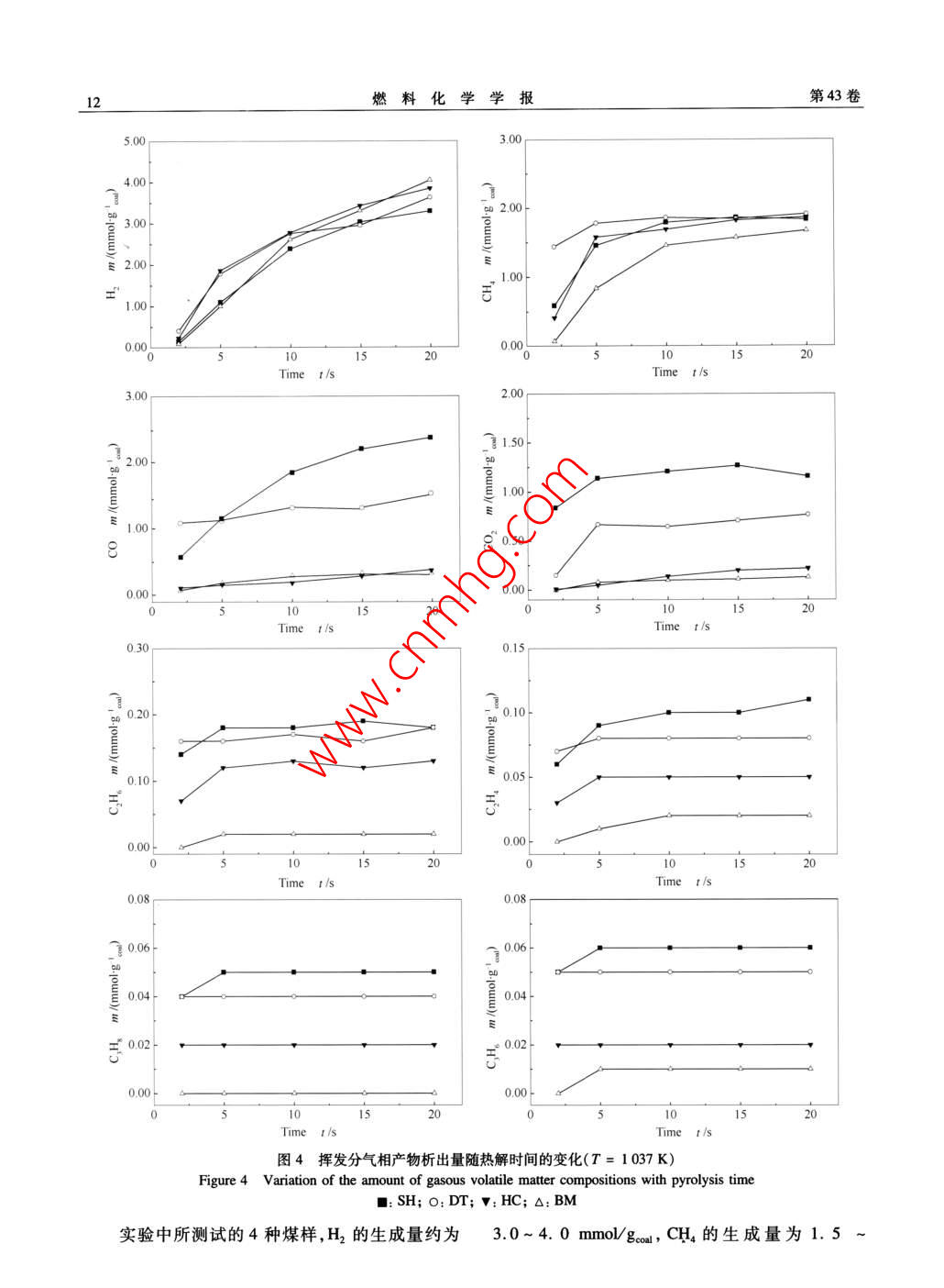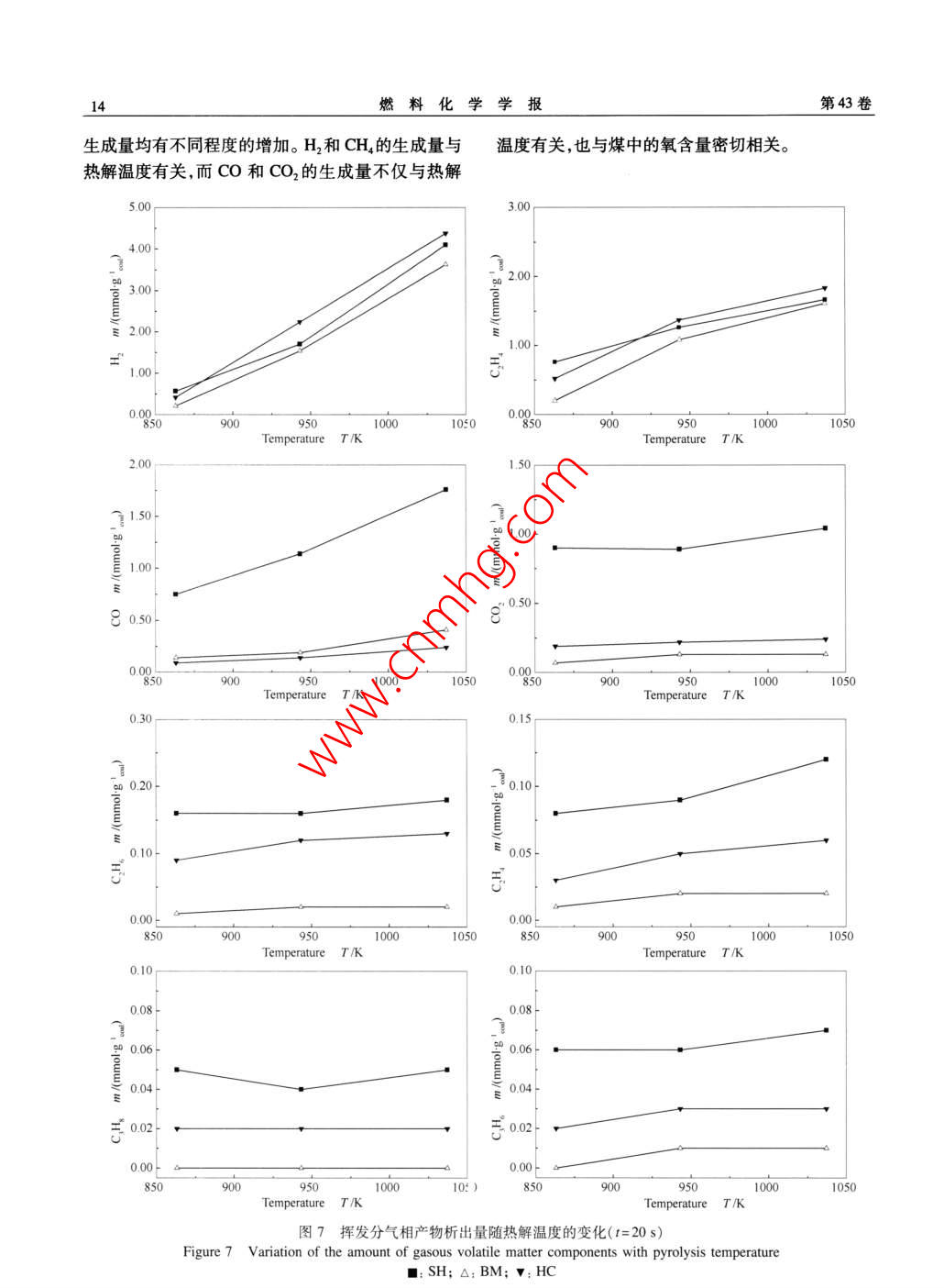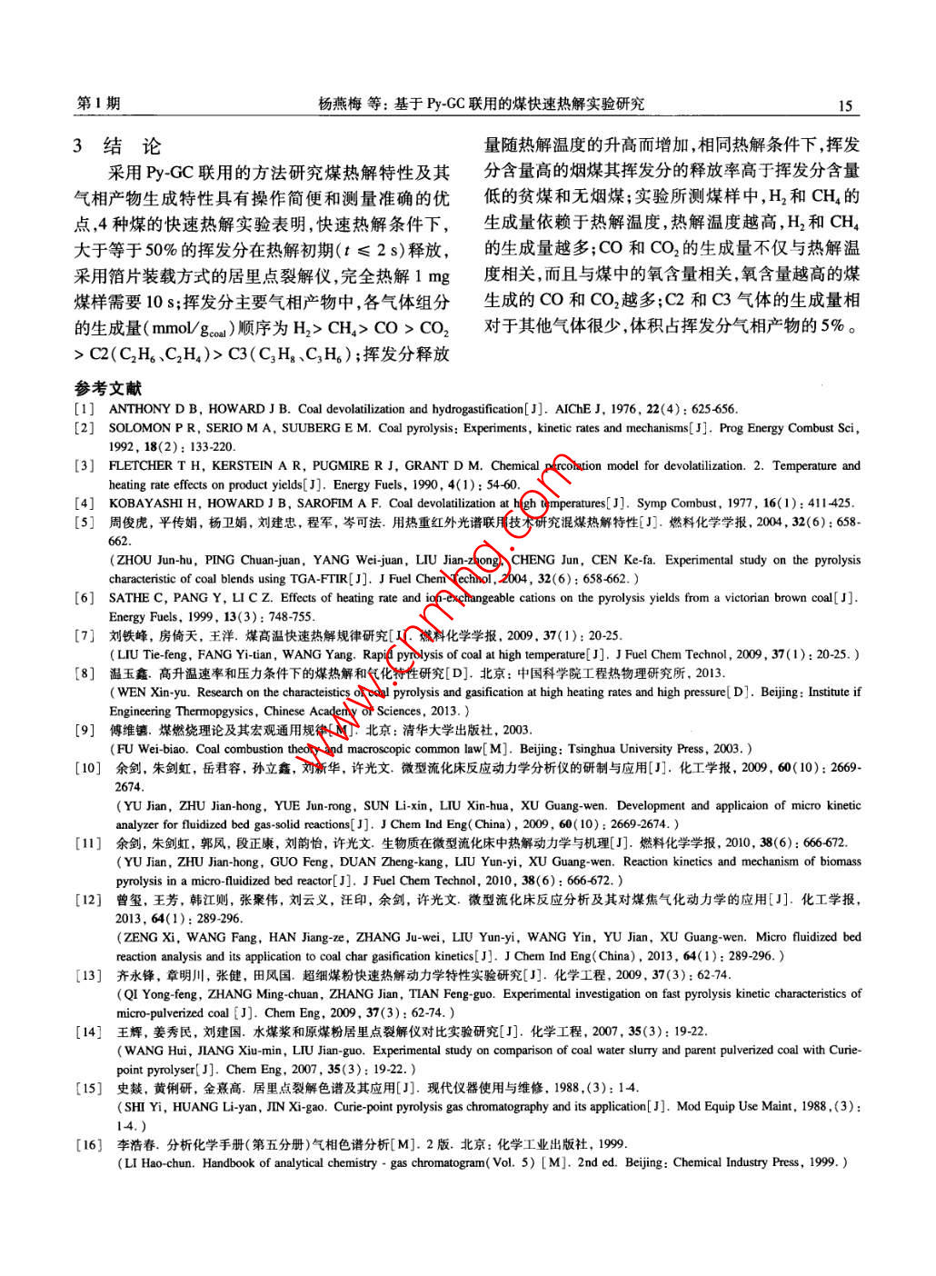第43卷第1期燃料化學學報Vol. 43 No.12015年1月Joumal of Fuel Chemistry and TechnologyJan. 2015文章編號: 0253 2409(2015)01 000907基于Py.GC聯(lián)用的煤快速熱解實驗研究楊燕梅,張海,呂俊復,楊海瑞.(清華大學熱能工程系熱科學與動力工程教育部重點實驗室,北京1008摘要: 采用居里點裂解儀一氣相色譜儀( Py-GC)聯(lián)用的方法研究了4種煤的快速熱解特性,分析了揮發(fā)分主要氣相產(chǎn)物及其析出規(guī)律。結(jié)果表明,大于等于50%的揮發(fā)分在熱解初期(t≤2s)釋放,采用箔片裝載方式的居里點裂解儀完全熱解1 mg煤樣需要10s;揮發(fā)分主要氣相產(chǎn)物中,各氣體組分的生成量( mmolVgaw )順序為Hh> CH.> co > CO2> C2(CH、CH)>C3(CH,、CjH6);揮發(fā)分釋放量隨熱解溫度的升高而增加,相同熱解條件下,次煙煤揮發(fā)分的釋故率高于貧煤和無煙煤;H和CH,的生成量依賴于熱解溫度,熱解溫度越高,H2和CH,的生成量越多;CO和CO,的生成量不僅與熱解溫度相關(guān),而且與煤中的氧含量緊密相關(guān),氧含量越高的煤熱解生成的CO和CO,越多;C2和C3氣體的生成量相對于其他氣體很少,體積占揮發(fā)分氣相產(chǎn)物的5%。關(guān)鍵詞:居里點裂解儀;氣相色譜;快速熱解;揮發(fā)分;煤種中圖分類號: TK6文獻標識碼: AExperimental study on flashpyrolysis of pulverized coals in Py-GCYANG Yan-mei, ZHANG Hai, LU Jun-fu, YANG Hai-rui( Key Laboratory for Thermal Science and PowerEngineering of Ministry of Education, Department of Thermal Engineering ,Tsinghua University, Beijing 100084, China)Abstract: Flash pyrolysis characteristics of four Chinese coals were studied in a Curie-pointed reactor and gaschromatography ( Py-GC) combined system. The yield of volatile matter ( VM) and evolution of gaseous VMcomponents were measured. It is found that≥50% of VM is released at the early stage (I≤2 s) of flashpyrolysis. It needs ~ 10 s to totally devolatilize 1 mg coal in the Curie-point reactor with the sample wrapped ina ferromagnetic foil. The yields of gaseous VM component are in the order of H2> CH4> CO> CO2> C2(C2H6,C2H)> C3 (C,Hg, C,H6). The yield of VM increases as the pyrolysis temperature increases. Under the samepyrolysis condition, high VM content coals released more VM than the low VM content ones. Yields of H2 andCH, increase greatly with the pyrolysis temperature. Yields of CO and CO2 depend on both the content of oxygenin the coal and pyrolysis temperature. Amounts of C2 and C3 gases are relatively much less than the others,accounting for less than 5% in volume in the gaseous VM.Key words: curie-point reactor; gas chromatography; flash pyrolysis; volatile matter; coal type煤熱解是煤轉(zhuǎn)化利用過程中的重要步驟,煤熱加熱速率對某褐煤熱解特性的影響發(fā)現(xiàn),隨著熱解解過程中揮發(fā)分產(chǎn)物的析出總量和組分構(gòu)成是表征溫度升高,揮發(fā)分總析出量在873 K之前快速增加,煤結(jié)構(gòu)特征和熱解特性的重要參數(shù),也是研究煤著之后緩慢增加;升溫速率對揮發(fā)分總析出量的影響火燃燒氣化等轉(zhuǎn)化過程的重要依據(jù)。通常采用熱不大,但是升溫速率增加,焦油產(chǎn)率增加,氣體產(chǎn)率重分析儀、沉降爐、固定床反應器、金屬絲網(wǎng)反應器減少。劉鐵峰等[7]通過高溫滴管爐實驗發(fā)現(xiàn),在等裝置進行煤熱解的實驗研究,采用氣相色譜儀1 273 ~1 673 K,各煤種的最大失重率大于工業(yè)分析( GC)、傅里葉紅外光譜儀(FT-IR)、質(zhì)譜儀(MS)等的失重率,熱解失重率隨溫度升高而增加。測量氣體產(chǎn)物總量和組分(1-4]。周俊虎等[5]采用研究表明,升溫速率和熱解溫度對煤熱解特性TGA-FTIR聯(lián)用方法研究了煤熱解特性及產(chǎn)物析出有重要影響:升溫速率影響顆粒內(nèi)外產(chǎn)物濃度梯度,規(guī)律,實驗發(fā)現(xiàn),加熱速率越高,熱解氣體的析出速從而影響揮發(fā)分產(chǎn)物中氣相物質(zhì)和焦油的比例;熱率越大,熱解終溫越高,熱解的總產(chǎn)氣量越大。解溫度決定了煤結(jié)構(gòu)中大分子的熱解反應速率,影Sathe等[6采用金屬絲網(wǎng)反應器研究了熱解溫度和響揮發(fā)分的總釋放量[8)。收稿日期: 201407-18;修回日期: 201409-29?;痦椖?國家高技術(shù)研究發(fā)展計劃(863計劃,2013AA051202);中國科學院戰(zhàn)略性先導科技專項( XDA0402020209)。聯(lián)系作者:張海(1967-),男,福建寧化人,教授,主要從事燃燒學、煤清沽燃燒技術(shù)研究, E-mail: haizhang@ tsinghua. edu. cn。燃料化學學報第43卷實際鍋爐中煤粉顆粒的加熱速率為10* ~至居里點溫度,升溫速率可達3000K/sl15]。圖2為10K/s量級,沉降爐和金屬絲網(wǎng)反應器的加熱速率典型的升溫曲線,由圖2可知,居里點裂解儀能在比較接近這一-數(shù)值,前者可達103 ~ 10* K/s量級,后0.2s從室溫升溫至居里點溫度,當達到居里點溫者可達約5 000 K/s(9。然而,沉降爐的操作比較復度,鐵磁箔片的磁滲透性突然消失,立刻從鐵磁質(zhì)變雜,數(shù)據(jù)重復性較差,金屬絲網(wǎng)反應器的控制系統(tǒng)較為順磁質(zhì),電磁感應消失,加熱停止,溫度維持在居為復雜,多采用高速氣流將產(chǎn)物攜帶出反應器,影響里點溫度,加熱溫度控制精確,實驗重復性好。揮發(fā)分產(chǎn)物分析的精度[8]。TGA操作簡單、數(shù)據(jù)重復性好、產(chǎn)物測量便利,但加熱速率僅為10 ~102 K/min量級。為此,研究者也還在尋求- -種既能接近鍋爐實際燃燒過程的加熱速率,又具有操作簡單、數(shù)據(jù)重復性好的實驗方法。近年來,中國科學院過程工程