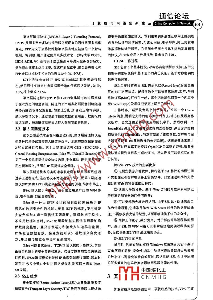 通信論壇( 52China Computer&Network計(jì)算機(jī)與網(wǎng)絡(luò)創(chuàng)新生活VPN安全管理技術(shù)張淑青1高海龍2(1保定市智能電腦有限公司河北保定071000)(2華北電力大學(xué)計(jì)算機(jī)科學(xué)與技術(shù)學(xué)院河北保定071000)[摘要]VPN技術(shù)具有較高的安全性并且實(shí)現(xiàn)較簡單,費(fèi)用低廉。本文闡述了VPN中采用的隧道技術(shù)加解密技術(shù),身份認(rèn)證,使用者與設(shè)備身份認(rèn)證技術(shù)等安全技術(shù)的實(shí)現(xiàn),著重介紹了VPN中應(yīng)用的第2層隧道協(xié)議、第3層隧道協(xié)議及SSL等協(xié)議,分析了ssL VPN技術(shù)的主要優(yōu)點(diǎn)及其不足之處。簡單介紹了現(xiàn)行的SKIP與ISAKMP/OAKLEY密鑰管理技術(shù)和常用的身份認(rèn)證技術(shù)。[關(guān)鍵詞]VPN安全管理 隧道協(xié)議 SSL保證數(shù)據(jù)的安全。1引言隧道技術(shù)在傳輸過程中,首先由客戶端給負(fù)載數(shù)據(jù)加上一個(gè)隧道數(shù)據(jù)傳送協(xié)議包頭,然后把封裝的數(shù)據(jù)通過互聯(lián)網(wǎng)Internet和電子商務(wù)的蓬勃發(fā)展,促使各企業(yè)的局域網(wǎng)絡(luò)發(fā)送,并由互聯(lián)網(wǎng)絡(luò)將數(shù)據(jù)路由到隧道的服務(wù)器端。隧道服日益向外界開放,從而也給網(wǎng)絡(luò)的管理和安全帶來很多問題。務(wù)器端收到數(shù)據(jù)包之后,去除隧道數(shù)據(jù)傳輸協(xié)議包頭,然后將Intemet 是基于TCP/IP技術(shù)的、不可管理的開放性國際互聯(lián)負(fù)載數(shù)據(jù)轉(zhuǎn)發(fā)到目標(biāo)網(wǎng)絡(luò)。網(wǎng)絡(luò),基于Intenet的商務(wù)活動(dòng)面臨著惡意的信息威脅和安全隧道是由隧道協(xié)議形成的,分為第2層隧遒協(xié)議、第3層隱患。另外,企業(yè)分支機(jī)構(gòu)相互間的網(wǎng)絡(luò)基礎(chǔ)設(shè)施互不兼容也隧道協(xié)議及Ssl協(xié)議等。更為普遍,難于實(shí)現(xiàn)分支機(jī)構(gòu)的互聯(lián)。企業(yè)異地局域網(wǎng)之間租2.1第2層隧道技術(shù)用數(shù)字?jǐn)?shù)據(jù)網(wǎng)(DDN)專線或幀中繼實(shí)現(xiàn)互聯(lián)將導(dǎo)致高昂的網(wǎng)第2層隧道技術(shù)是在數(shù)據(jù)鏈路層進(jìn)行的,第2層隧道協(xié)議是先把各種網(wǎng)絡(luò)協(xié)議封裝到PPP中,再把整個(gè)數(shù)據(jù)包裝入絡(luò)通信/維護(hù)費(fèi)用。虛擬專用網(wǎng)(VPN)的出現(xiàn)則較好的解決了上述問題:通隧道協(xié)議中。這種雙層封裝方法形成的數(shù)據(jù)包靠第2層協(xié)議過公用網(wǎng)來建立VPN,節(jié)省了大量的通信及維護(hù)費(fèi)用;VPN進(jìn)行傳輸。第2層隧道協(xié)議有PPTP、L2F、L2TP等。L2TP協(xié)可保證連接用戶的可靠性及傳輸數(shù)據(jù)的安全和保密性;不需議是目前ETF的標(biāo)準(zhǔn),由ietF融合PPTP與L2F而形成。第建立租用線路或幀中繼線路,連接方便靈活;虛擬專用網(wǎng)使用2層隧道協(xié)議具有簡單易行的優(yōu)點(diǎn),但是他們的可擴(kuò)展性都不好。戶可以利用ISP的設(shè)施和服務(wù),同時(shí)又完全掌握著自己網(wǎng)絡(luò)也沒有提供內(nèi)在的安全機(jī)制,不能滿足會(huì)話的保密性需求。的控制權(quán),用戶只利用ISP提供的網(wǎng)絡(luò)資源,對(duì)于其它的安全點(diǎn)對(duì)點(diǎn)隧道協(xié)議(RFC2637 ,Point-to -Point TunnelingProtocol,PPTP)是- -種支持多協(xié)議虛擬專用網(wǎng)絡(luò)的網(wǎng)絡(luò)技術(shù)。設(shè)置、網(wǎng)絡(luò)管理變化可由自己管理。數(shù)據(jù)安全性是VPN的核心向題,也是用戶最關(guān)心的問通過該協(xié)議,遠(yuǎn)程用戶能夠通過Microsoft Windows NT工作題。目前VPN主要采用4項(xiàng)技術(shù)來保證安全,這4項(xiàng)技術(shù)分站、Windows 95和Windows 98操作系統(tǒng)以及其它裝有點(diǎn)對(duì)別是隧道技術(shù)(Tuneling)、加解密技術(shù)(Encrypion & Decrp-點(diǎn)協(xié)議的系統(tǒng)安全訪向公司網(wǎng)絡(luò),并能撥號(hào)連人本地ISP,通tion) 、密鑰管理技術(shù)(Key Managenent)、使用者與設(shè)備身份認(rèn)過Internet安全鏈接到公司網(wǎng)絡(luò)。證技術(shù)(Authentication)。PPTP協(xié)議允許對(duì)P , IPX或NetBEUI數(shù)據(jù)流進(jìn)行加密,然后封裝在IP包頭中通過企業(yè)IP網(wǎng)絡(luò)或公共互聯(lián)網(wǎng)絡(luò)發(fā)送。2隧道技術(shù)第2層轉(zhuǎn)發(fā)協(xié)議(RFC2342,Layer 2 Forwarding prool,隧道技術(shù)(Tunneling)是VPN的基本技術(shù),類似于L2R用中國煤化工的安全隧道來將ISP點(diǎn)對(duì)點(diǎn)連接技術(shù),它首先在公共網(wǎng)絡(luò)上建立一條數(shù)據(jù)通pop連!Y片C N M H G立了一個(gè)用戶與企業(yè)道(隧道),然后把封裝后的數(shù)據(jù)包通過這條隧道傳輸來客戶網(wǎng)絡(luò)間的虛擬點(diǎn)對(duì)點(diǎn)連接。定稿日期:2008-01-22《計(jì)算機(jī)與網(wǎng)絡(luò)》2008年第05期通信論壇計(jì)算機(jī)與網(wǎng)絡(luò)創(chuàng)新生活China Computer & Network(53)第2層隧道協(xié)議(RFC2661,Layer 2 Tuneling Protocol,密安全通道的加密協(xié)議, 它利用密鑰算法在互聯(lián)網(wǎng)上提供端L2TP)是用來整合多協(xié)議撥號(hào)服務(wù)至現(xiàn)有的因特網(wǎng)服務(wù)提供點(diǎn)身份認(rèn)證與通信保密,為諸如網(wǎng)站、電子郵件、網(wǎng)上傳真等商點(diǎn)。PPP 定義了多協(xié)議跨