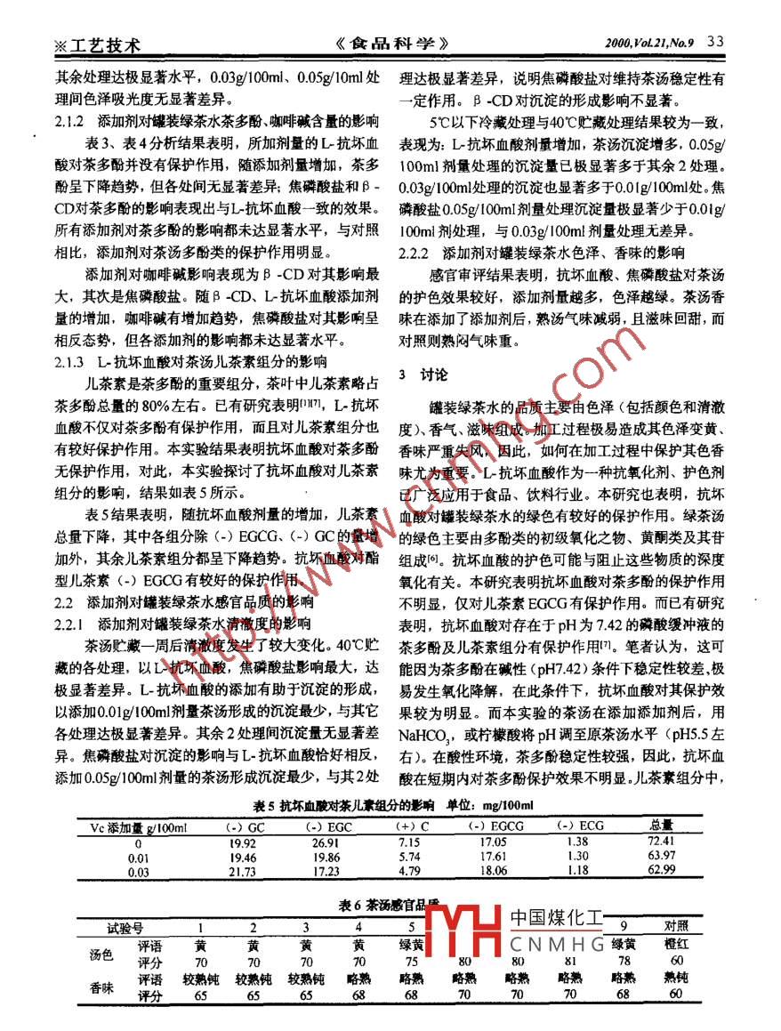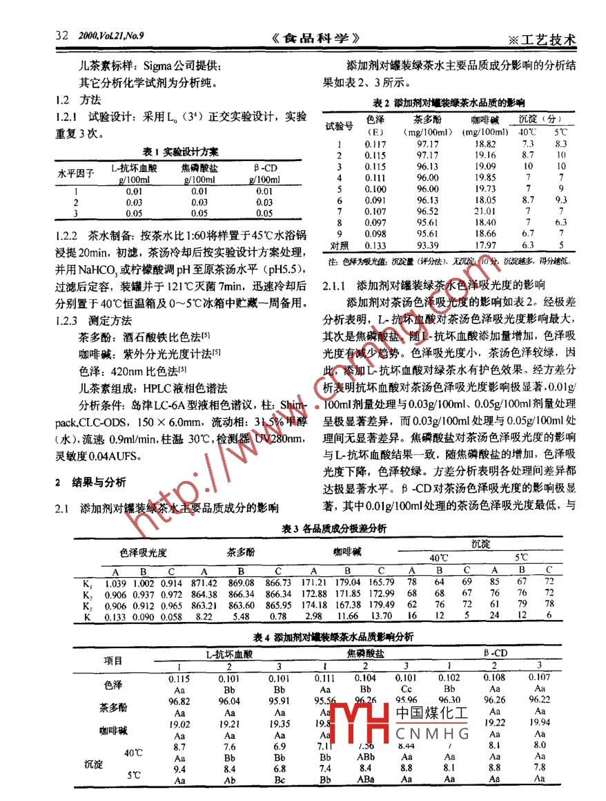 添加劑對(duì)罐裝綠茶水品質(zhì)的影響陳玉瓊倪德江張家年 .華中農(nóng)業(yè)大學(xué)林學(xué)系武漢430070摘娶采用正交設(shè)計(jì),探討了L-抗壞血酸、焦磷酸鹽、Bβ -CD對(duì)鱧裝綠茶水品質(zhì)的影響。結(jié)果表明,L-抗壞血酸和焦磷酸鹽對(duì)罐裝綠茶水的色澤具有明顯的保護(hù)作用。焦磷酸鹽能有效阻止沉淀的形成,而β -CD對(duì)阻止沉淀形成無(wú)明顯效果,相反L-抗壞血酸還有反作用。品質(zhì)成分分析表明,三種添加劑對(duì)茶多酚、咖啡堿總量無(wú)顯著影響,但添加L抗壞血酸可有效阻止主要兒茶素L-EGCG的降解。關(guān)鍵詞罐裝綠茶水 添加劑品質(zhì)Abstract The efets of I-ascorbic acid (LA),polyphosphate (PP) and β -CD on the quality of canned green tea wasstudied by way of orthogonal design .The results showed that the destroy of infusion color could be efectively preventedby LA or pp. The formation of lea cream could be also stopped by PP except β -CD.On the contraryLA could acleratethe formation of tea cream.t also revealed that the contents of polyphenol and caffeine were not afected by the threecompounds.but the decomposition ofL-EGCG,a main kind of catcchins.Could be protected by LA.Key wordsCanned green teaAdditive Qualities茶飲料是- -種天然飲料并具有營(yíng)養(yǎng)、保健等多種形成叫 β -CD-方 面能沉清茶湯,另- -方面對(duì)茶湯功能,因此,倍受消費(fèi)者歡迎?,F(xiàn)今,茶飲料已成為香氣有 較好的保護(hù)作用4。對(duì)此,本文就三者采取正飲料業(yè)中-顆耀眼新星。盡管茶飲料呈強(qiáng)勁發(fā)展勢(shì)頭,交試驗(yàn)方式, 研究其對(duì)罐裝綠茶水品質(zhì)的影響,以期但生產(chǎn)上仍存在-些難題,如茶湯的色、香、味的保中國(guó)煤化工護(hù)及沉淀的有效去除,綠茶飲料表現(xiàn)得尤為突出。針YHCNMH G對(duì)這些問(wèn)題,以紅茶、烏龍茶為研究對(duì)象較多,以綠茶為對(duì)象研究較少。已有研究認(rèn)為,L- 抗壞血酸(或1.1 材料其鈉鹽)作為抗氧化劑對(duì)茶多酚有較好保護(hù)作用,護(hù)茶葉:華農(nóng)春綠茶-級(jí):色效果好1.2]。多聚磷酸鹽作為分散劑能阻止茶乳絡(luò)的L-抗壞血酸,焦磷酸鹽,β -CD均為分析純;32 200V0L21,Na.9《食品科學(xué)》※工藝技術(shù)兒茶素標(biāo)樣: Sigma 公司提供:添加劑對(duì)罐裝綠茶水主要品質(zhì)成分影響的分析結(jié)其它分析化學(xué)試劑為分析純。果如表2、3所示。1.2 方法表2添加劑對(duì)儲(chǔ)裝綠茶水品質(zhì)的影響1.2.1試驗(yàn)設(shè)計(jì): 采用L。(3)正交實(shí)驗(yàn)設(shè)計(jì),實(shí)驗(yàn)色澤茶多酚如啡堿 沉淀(分)重復(fù)3次。試驗(yàn)號(hào)E)(mg/100ml) (mg/100ml) 40C 5C0.11797.1718.827.3表1實(shí)驗(yàn)設(shè)計(jì)方案0.11519.168.7水平因子L抗壞血酸焦磷酸鹽β-CD96.1319.0910g/100ml0.11196.0019.850.010.10019.730.030.0918.058.0.050.10796.52 .21.010.09795.6118.401.2.2茶水制備: 按茶水比1:60將樣置于45C水浴鍋0.09818.66浸提20min,初濾,茶湯冷卻后按實(shí)驗(yàn)設(shè)計(jì)方案處理,生色擇為吸光值:沉淀量(評(píng)分法),無(wú)沉定: 10 分沉淀越多,得分趣低對(duì)照0.13393.3917.97并用NaHCO,或檸檬酸調(diào)pH至原茶湯水平(pH5.5),過(guò)濾后定容,裝罐并于121C滅菌7min,迅速冷卻后2.1.1 添加劑對(duì)罐裝綠茶水色澤吸光度的影響分別置于40'C恒溫箱及0~5C冰箱中貯藏- -周備用。忝加劑對(duì)茶湯色澤吸光度的影響如表2。經(jīng)極差1.2.3測(cè)定方法 .分析表明,L-抗壞血酸對(duì)茶湯色澤吸光度影響最大,茶多酚:酒石酸鐵比色法[)其次是焦磷酸鹽。隨L-抗壞血酸添加量增加,色澤吸咖啡堿:紫外分光光度計(jì)法[5]光度有減少趨勢(shì)。色澤吸光度小,茶湯色澤較綠,因色澤: 420nm比色法[S]此,添加L抗壞血酸對(duì)綠茶水有護(hù)色效果。經(jīng)方差分兒茶素組成: HPLC 液相色譜法析表明抗壞血酸對(duì)茶湯色澤吸光度影響極顯著,0.01g分析條件:島津LC-6A 型液相色譜議,柱: Shim-100mlI劑量處理與0.03g/100ml、0.05g100ml 劑量處理pack,CLC-ODS,150 x 6.0mm,流動(dòng)相: 31.5% 甲醇呈極顯著差異,而0.03g/100ml處理與0.05g/100ml處(水),流速0.9m/min,柱溫30C ,檢測(cè)器UV280nm,理間無(wú)顯著差異。焦磷酸鹽對(duì)茶湯色澤吸光度的影響靈敏度0.04AUFS.與[-抗壞血酸結(jié)果-致,隨焦磷酸鹽的增加,色澤吸光度下降,色澤較綠。方差分析表明各處理間差異都2結(jié)果與分析達(dá)極顯著水平。β _CD對(duì)茶湯色澤吸光度的影響極顯2.1 添加劑對(duì)罐裝綠 茶水主要品質(zhì)成分的影響著,其中0.01g/100ml處理的茶湯色澤吸光度最低,與表3各晶質(zhì)成分極差分析沉淀色澤吸光度咖啡堿40C5_ABcBC_BCABCA__B_ CK, 1.039 1.002 0.914 871.42 869.08866.73 171.21 179.04 165.797854698567720.906 0.937 0.972 864.38 866.34 866.34 172.88 171.85 172.99 683776 76 72K; 0.906 0.912 0.965 863.21 863.60865.95174.18 167.38 179.49 6261K 0.133 0.090 0.058 8.22__ 5 480.72.98 _ 11.66 .13.70 I1224表4添加劑對(duì)鰳啵綠茶水品質(zhì)影響分析B-CD項(xiàng)目20.1010.1040.1020.108BbBtAa,CcAa96.8296.0495.995.56 96.2695.9696.3096.2696.22中國(guó)煤化工19.029.2119.3519.2219.94 .YHCNMHG..98.44A3bABb\aSC9.4.87.8.48.88.1b_ABaa_a※工藝技術(shù)《食品科學(xué)》2000,VoL21,No.9 33其余處理達(dá)極顯著水平,0.03/100ml、 0.05g/10ml 處理達(dá)極 顯著差異,說(shuō)明焦磷酸鹽對(duì)維持茶湯穩(wěn)定性有理間色澤吸光度無(wú)顯著差異。- -定作用。β -CD對(duì)沉淀的形成影響不顯著。2.1.2添加劑對(d