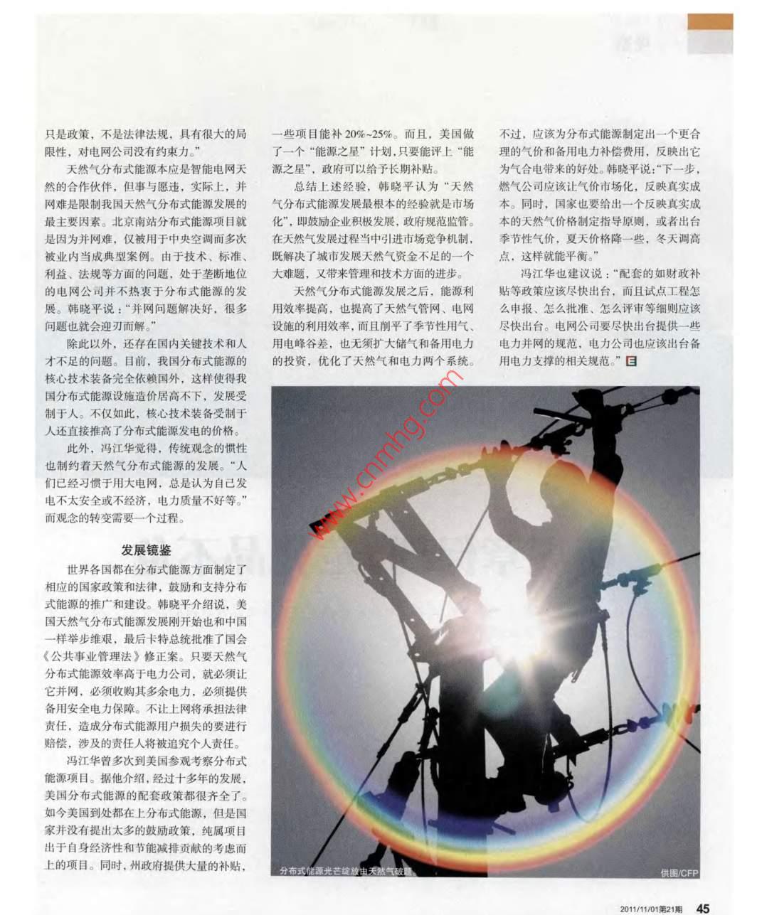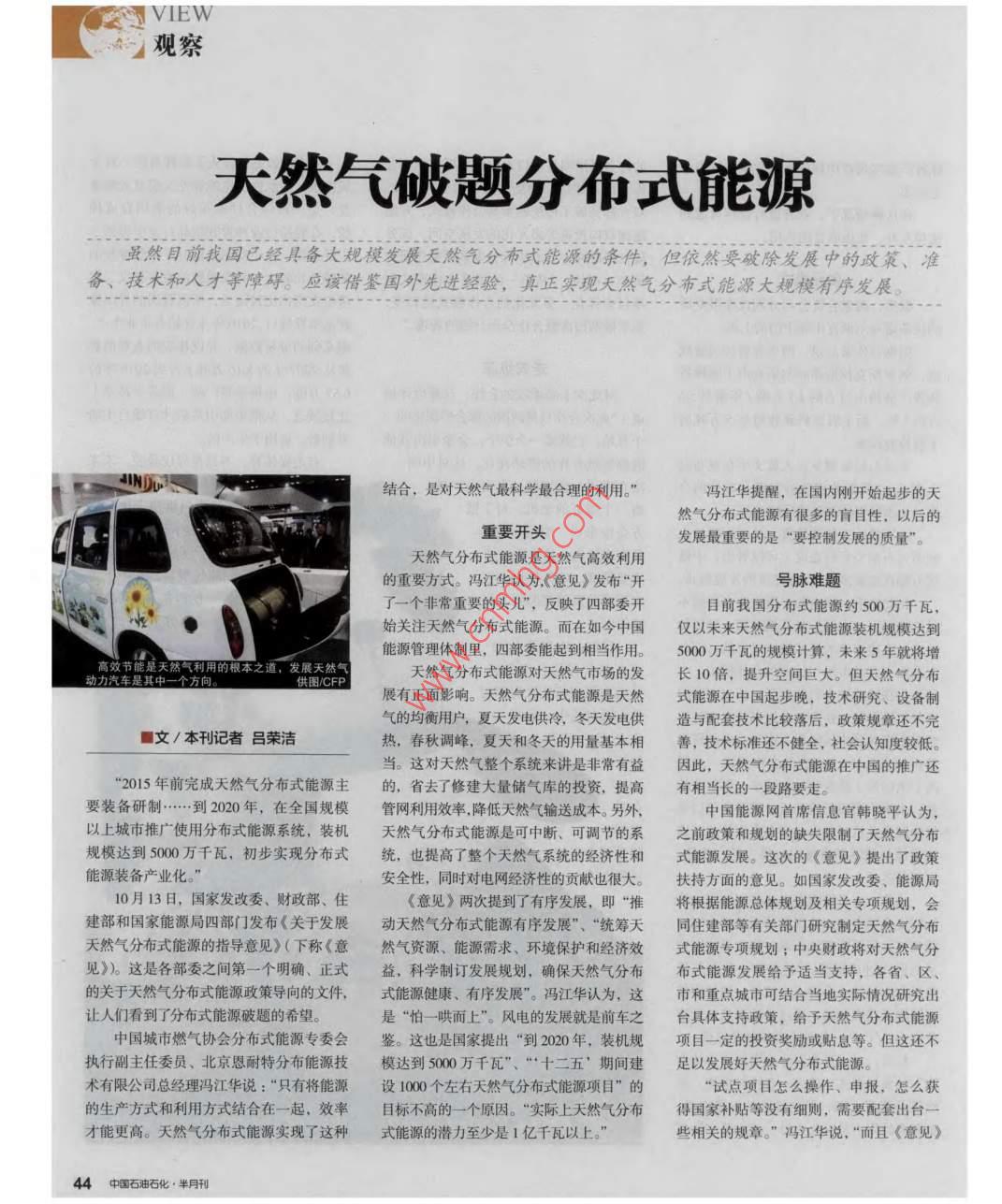 K VIEWA觀察天然氣破題分布式能源雖然目前我國(guó)已經(jīng)具備大規(guī)模發(fā)展天然氣分市式能源的條件,但依然要破除發(fā)展中的政策、準(zhǔn)備、技術(shù)和人才等障礙。應(yīng)該借鑒國(guó)外先進(jìn)經(jīng)驗(yàn),真正實(shí)現(xiàn)天然氣分布式能源大規(guī)模有序發(fā)展結(jié)合,是對(duì)天然氣最科學(xué)最合理的利用?!瘪T江華提醒,在國(guó)內(nèi)剛開(kāi)始起步的天然氣分布式能源有很多的盲目性,以后的重要開(kāi)頭發(fā)展最重要的是“要控制發(fā)展的質(zhì)量”。天然氣分布式能源是天然氣高效利用的重要方式。馮江華認(rèn)為,《意見(jiàn)》發(fā)布“開(kāi)號(hào)脈難題了一個(gè)非常重要的頭兒”,反映了四部委開(kāi)目前我國(guó)分布式能源約500萬(wàn)千瓦始關(guān)注天然氣分布式能源。而在如今中國(guó)僅以未來(lái)天然氣分布式能源裝機(jī)規(guī)模達(dá)到高效節(jié)能是夫因氣利用的根本之道,發(fā)展天然能源管理體制里,四部委能起到相當(dāng)作用。5000萬(wàn)千瓦的規(guī)模計(jì)算,未來(lái)5年就將增供圖CFP天然氣分布式能源對(duì)天然氣市場(chǎng)的發(fā)長(zhǎng)10倍,提升空間巨大。但天然氣分布展有正面影響。天然氣分布式能源是天然式能源在中國(guó)起步晚,技術(shù)研究、設(shè)備制氣的均衡用戶,夏天發(fā)電供冷,冬天發(fā)電供造與配套技術(shù)比較落后,政策規(guī)章還不完■文/本刊記者呂榮潔熱,春秋調(diào)峰,夏天和冬天的用量基本相善,技術(shù)標(biāo)準(zhǔn)還不健全,社會(huì)認(rèn)知度較低當(dāng)。這對(duì)天然氣整個(gè)系統(tǒng)來(lái)講是非常有益因此,天然氣分布式能源在中國(guó)的推廣還“2015年前完成天然氣分布式能源主的,省去了修建大量?jī)?chǔ)氣庫(kù)的投資,提高有相當(dāng)長(zhǎng)的一段路要走。要裝備研制……到2020年,在全國(guó)規(guī)模管網(wǎng)利用效率,降低天然氣輸送成本。另外中國(guó)能源網(wǎng)首席信息官韓曉平認(rèn)為,以上城市推廣使用分布式能源系統(tǒng),裝機(jī)天然氣分布式能源是可中斷、可調(diào)節(jié)的系之前政策和規(guī)劃的缺失限制了天然氣分布規(guī)模達(dá)到5000萬(wàn)千瓦,初步實(shí)現(xiàn)分布式統(tǒng),也提高了整個(gè)天然氣系統(tǒng)的經(jīng)濟(jì)性和式能源發(fā)展。這次的《意見(jiàn)》提出了政策能源裝備產(chǎn)業(yè)化?!卑踩?同時(shí)對(duì)電網(wǎng)經(jīng)濟(jì)性的貢獻(xiàn)也很大。扶持方面的意見(jiàn)。如國(guó)家發(fā)改委、能源局10月13日,國(guó)家發(fā)改委、財(cái)政部、住《意見(jiàn)》兩次提到了有序發(fā)展,即“推將根據(jù)能源總體規(guī)劃及相關(guān)專項(xiàng)規(guī)劃,會(huì)建部和國(guó)家能源局四部門(mén)發(fā)布《關(guān)于發(fā)展動(dòng)天然氣分布式能源有序發(fā)展”、“統(tǒng)籌天同住建部等有關(guān)部門(mén)研究制定天然氣分布天然氣分布式能源的指導(dǎo)意見(jiàn)》(下稱《意然氣資源、能源需求、環(huán)境保護(hù)和經(jīng)濟(jì)效式能源專項(xiàng)規(guī)劃;中央財(cái)政將對(duì)天然氣分見(jiàn)》)。這是各部委之間第一個(gè)明確、正式益,科學(xué)制訂發(fā)展規(guī)劃,確保天然氣分布布式能源發(fā)展給予適當(dāng)支持,各省、區(qū)的關(guān)于天然氣分布式能源政策導(dǎo)向的文件,式能源健康、有序發(fā)展”。馮江華認(rèn)為,這市和重點(diǎn)城市可結(jié)合當(dāng)?shù)貙?shí)際情況研究出讓人們看到了分布式能源破題的希望是“怕一哄而上”。風(fēng)電的發(fā)展就是前車(chē)之臺(tái)具體支持政策,給予天然氣分布式能源中國(guó)城市燃?xì)鈪f(xié)會(huì)分布式能源專委會(huì)鑒。這也是國(guó)家提出“到200年,裝機(jī)規(guī)項(xiàng)目一定的投資獎(jiǎng)勵(lì)或貼息等。但這還不執(zhí)行副主任委員、北京恩耐特分布能源技模達(dá)到500萬(wàn)千瓦”、“十二五’期間建足以發(fā)展好天然氣分布式能源。術(shù)有限公司總經(jīng)理馮江華說(shuō):“只有將能源設(shè)1000個(gè)左右天然氣分布式能源項(xiàng)目”的“試點(diǎn)項(xiàng)目怎么操作、申報(bào),怎么獲的生產(chǎn)方式和利用方式結(jié)合在一起,效率目標(biāo)不高的一個(gè)原因。“實(shí)際上天然氣分布得國(guó)家補(bǔ)貼等沒(méi)有細(xì)則,需要配套出臺(tái)才能更高。天然氣分布式能源實(shí)現(xiàn)了這種式能源的潛力至少是1億千瓦以上。”些相關(guān)的規(guī)章。”馮江華說(shuō),“而且《意見(jiàn)》44中國(guó)石油石化·半月刊只是政策,不是法律法規(guī),具有很大的局些項(xiàng)目能補(bǔ)20%-25%。而且,美國(guó)做不過(guò),應(yīng)該為分布式能源制定出一個(gè)更合限性,對(duì)電網(wǎng)公司沒(méi)有約束力?!绷艘粋€(gè)“能源之星”計(jì)劃,只要能評(píng)上“能理的氣價(jià)和備用電力補(bǔ)償費(fèi)用,反映出它天然氣分布式能源本應(yīng)是智能電網(wǎng)天源之星”,政府可以給予長(zhǎng)期補(bǔ)貼為氣合電帶來(lái)的好處。韓曉平說(shuō):“下一步,然的合作伙伴,但事與愿違,實(shí)際上,并總結(jié)上述經(jīng)驗(yàn),韓曉平認(rèn)為“天然燃?xì)夤緫?yīng)該讓氣價(jià)市場(chǎng)化,反映真實(