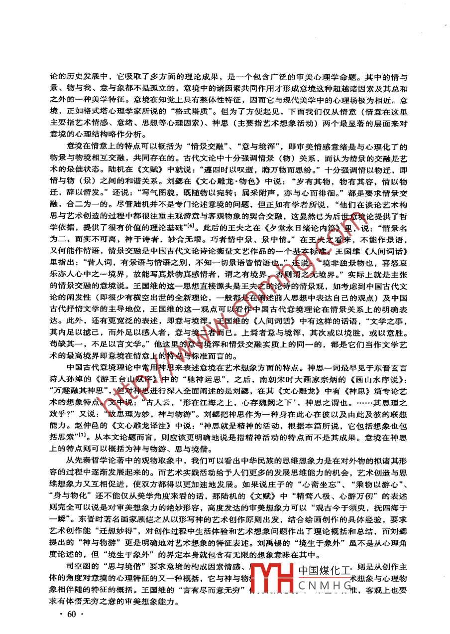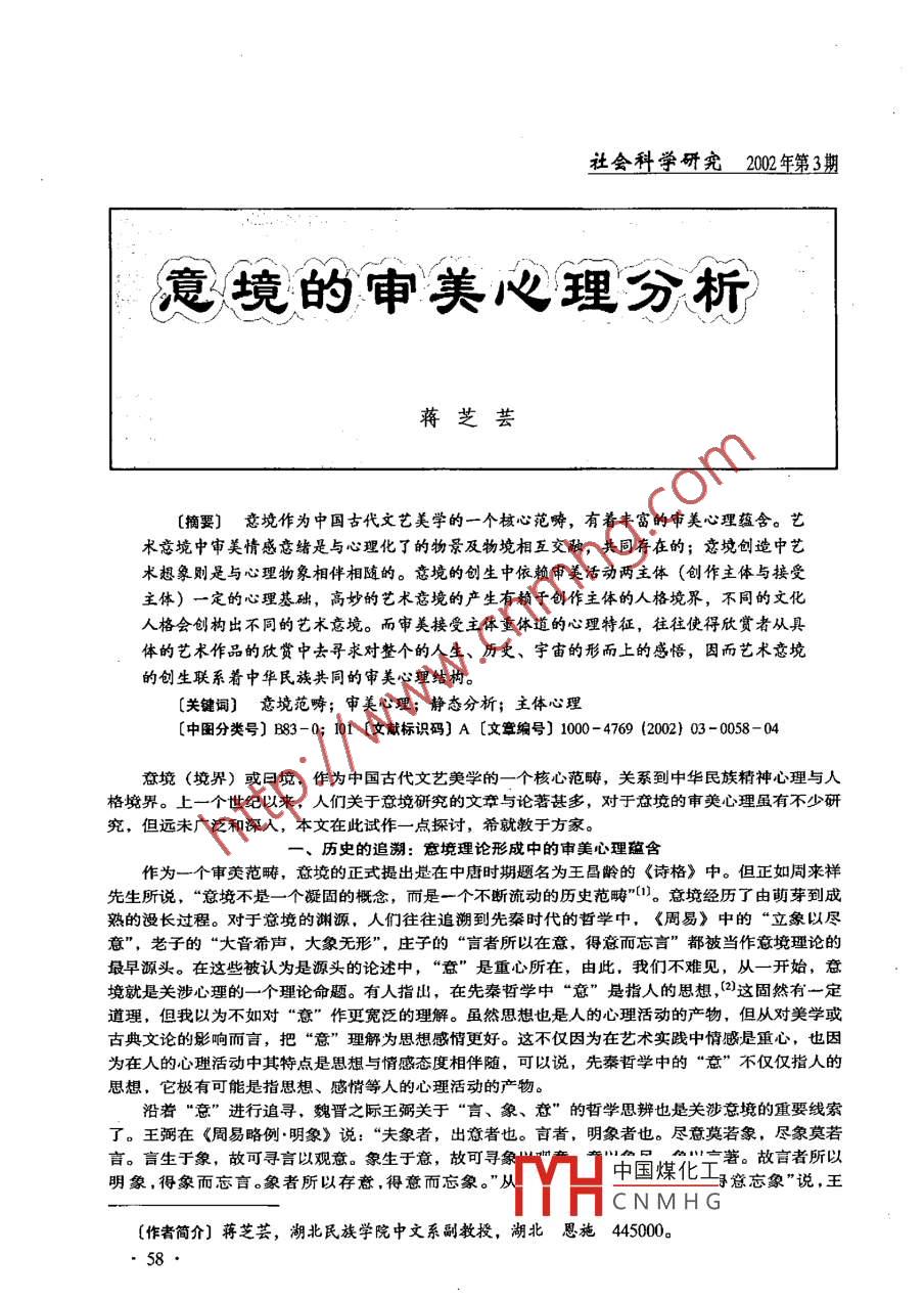 社會(huì)科學(xué)研究2002 年第3期意{境的審美心理分析蔣芝蕓[摘要]意境作為中國 古代文藝美學(xué)的一個(gè)核心范疇,有著豐富的審美心理蘊(yùn)含。藝術(shù)意境中審美情感意緒是與心理化了的物景及物境相互交融,共同存在的;意境創(chuàng)造中藝術(shù)想象則是與心理物象相伴相隨的。意境的創(chuàng)生中依賴審美活動(dòng)兩主體(創(chuàng)作主體與接受主體)一定的心理基礎(chǔ),高妙的藝術(shù)意境的產(chǎn)生有賴于創(chuàng)作主體的人格境界,不同的文化人格會(huì)創(chuàng)構(gòu)出不同的藝術(shù)意境。而審美接受主體重體道的心理特征,往往使得欣賞者從具體的藝術(shù)作品的欣賞中去尋求對(duì)整個(gè)的人生、歷史、宇宙的形而上的感悟,因而藝術(shù)意境的創(chuàng)生聯(lián)系著中華民族共同的審美心理結(jié)構(gòu)。[關(guān)鍵詞]意境范疇;審美心理;靜態(tài)分析;主體心理[中圖分類號(hào)] B83-0; 101 [文獻(xiàn)標(biāo)識(shí)碼] A [文章編號(hào)] 1000-4769 (2002) 03 -0058- 04意境(境界)或曰境,作為中國古代文藝美學(xué)的-個(gè)核心范疇,關(guān)系到中華民族精神心理與人格境界。上-個(gè)世紀(jì)以來,人們關(guān)于意境研究的文章與論著甚多,對(duì)于意境的審美心理雖有不少研究,但遠(yuǎn)未廣泛和深人,本文在此試作- -點(diǎn)探討,希就教于方家。一、歷史的追溯:意境理論形成中的審美心理蘊(yùn)含作為- -個(gè)審熒范疇,意境的正式提出是在中唐時(shí)期題名為王昌齡的《詩格》中。但正如周來祥先生所說,“意境不是-個(gè)凝固的概念,而是一個(gè)不斷流動(dòng)的歷史范疇”[1]。意境經(jīng)歷了由萌芽到成熟的漫長過程。對(duì)于意境的淵源,人們往往追溯到先秦時(shí)代的哲學(xué)中,《周易》中的“立象以盡意”,老子的“大音希聲,大象無形”,莊子的“言者所以在意,得意而忘言”都被當(dāng)作意境理論的最早源頭。在這些被認(rèn)為是源頭的論述中,“意” 是重心所在,由此,我們不難見,從- -開始,意境就是關(guān)涉心理的一一個(gè)理論命題。有人指出,在先秦哲學(xué)中“意” 是指人的思想, (2)這固然有一定道理,但我以為不如對(duì)“意”作更寬泛的理解。雖然思想也是人的心理活動(dòng)的產(chǎn)物,但從對(duì)美學(xué)或古典文論的影響而言,把“意”理解為思想感情更好。這不僅因?yàn)樵谒囆g(shù)實(shí)踐中情感是重心,也因?yàn)樵谌说男睦砘顒?dòng)中其特點(diǎn)是思想與情感態(tài)度相伴隨,可以說,先秦哲學(xué)中的“意”不僅僅指人的思想,它極有可能是指思想、感情等人的心理活動(dòng)的產(chǎn)物。沿著“意”進(jìn)行追尋,魏晉之際王弼關(guān)于“言、象、意”的哲學(xué)思辨也是關(guān)涉意境的重要線索了。王弼在《周易略例明象》說:“夫象者,出意者也。言者,明象者也。盡意莫若象,盡象莫若言。盲生于象,故可尋言以觀意。象生于意,故可尋象辛著。故言者所以明象,得象而忘言。象者所以存意,得意而忘象?!睆闹袊夯ひ馔蟆闭f,王YHCNMHG[作者簡介]蔣芝蕓,湖北民族學(xué)院中文系副教授,湖北恩施445000。弼把莊子的“得意忘言”發(fā)展為“得意忘象”, 使言外之意發(fā)展為象外之意,此處的“意”除了指語言與形象所表示的思想情意之外,還有一種不能用形象和語言直接表明的意味,即言外、象外之意。這言說不盡的“意", 就與文藝的特征相通,因而王弼的學(xué)說為文論家們普遍接受。正如夏之放先生說,“這就為后天的意象論、意境論提供了基礎(chǔ)”(3]。到了人們對(duì)文學(xué)藝術(shù)進(jìn)行自覺探討的魏晉時(shí)期,“意” 便成為文藝審美心理學(xué)的重要命題了。陸機(jī)《文賦》中說“恒患意不稱物,文不逮意”,就在言與意的困感與矛盾中,提出了創(chuàng)作心理的一個(gè)幾乎可以說是永恒的問題。鐘嶸的《詩品序》中提出了“文已盡而意有余”的看法,為意境說的形成奠定了理論基礎(chǔ),因?yàn)椤拔囊驯M而意有余”正是意境的美學(xué)特征。在劉勰《文心雕龍》中,“意”的內(nèi)涵進(jìn)一步得以成為意境論的基礎(chǔ), 在《隱秀》篇中他提出以隱秀表現(xiàn)“文外重旨”的藝術(shù)方法,使言意之辨進(jìn)- -步向“言外之意”的方面深人,也使哲學(xué)上的言、意漸漸轉(zhuǎn)向了審美,“其核心是文學(xué)審美應(yīng)該追尋和表現(xiàn)語言的表層符號(hào)之外的意蘊(yùn)”[4)。劉勰的《文心雕龍》是從創(chuàng)作與欣貫兩方面來論文的,因而他實(shí)際上已涉及到審美的兩主體,即創(chuàng)作主體與欣賞主體的審美心理問題。如在《知音》中說“夫綴文者情動(dòng)而辭發(fā),觀文者披文以人情,沿波討源,雖幽必顯”。釗此時(shí),沿自先秦哲學(xué)的言意論便實(shí)現(xiàn)了向中國文藝美學(xué)的“情”、 “辭”論了、“意象”論了。意境范疇可謂已呼之欲出了,此時(shí),又正值佛教興盛,在佛經(jīng)翻譯中人們用“境”一詞來示宗教化的心靈空間。受佛教的“境界”說的影響,人們開始借用佛學(xué)中“境”的概念來論文藝問題。如劉勰《文心雕龍.論說》中“動(dòng)極神源,其般若之絕境乎!”可見,境在美學(xué)上也是作為心理認(rèn)識(shí)的對(duì)象概念而使用的。到唐代,詩僧皎然便將佛家禪境與詩境合而為一