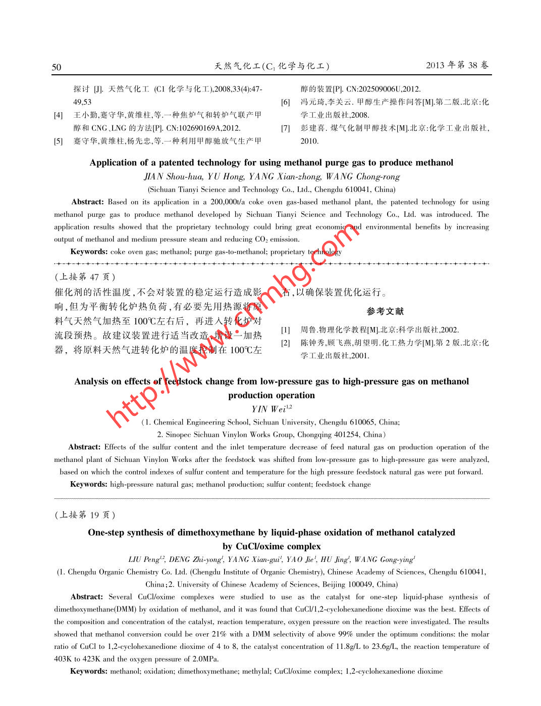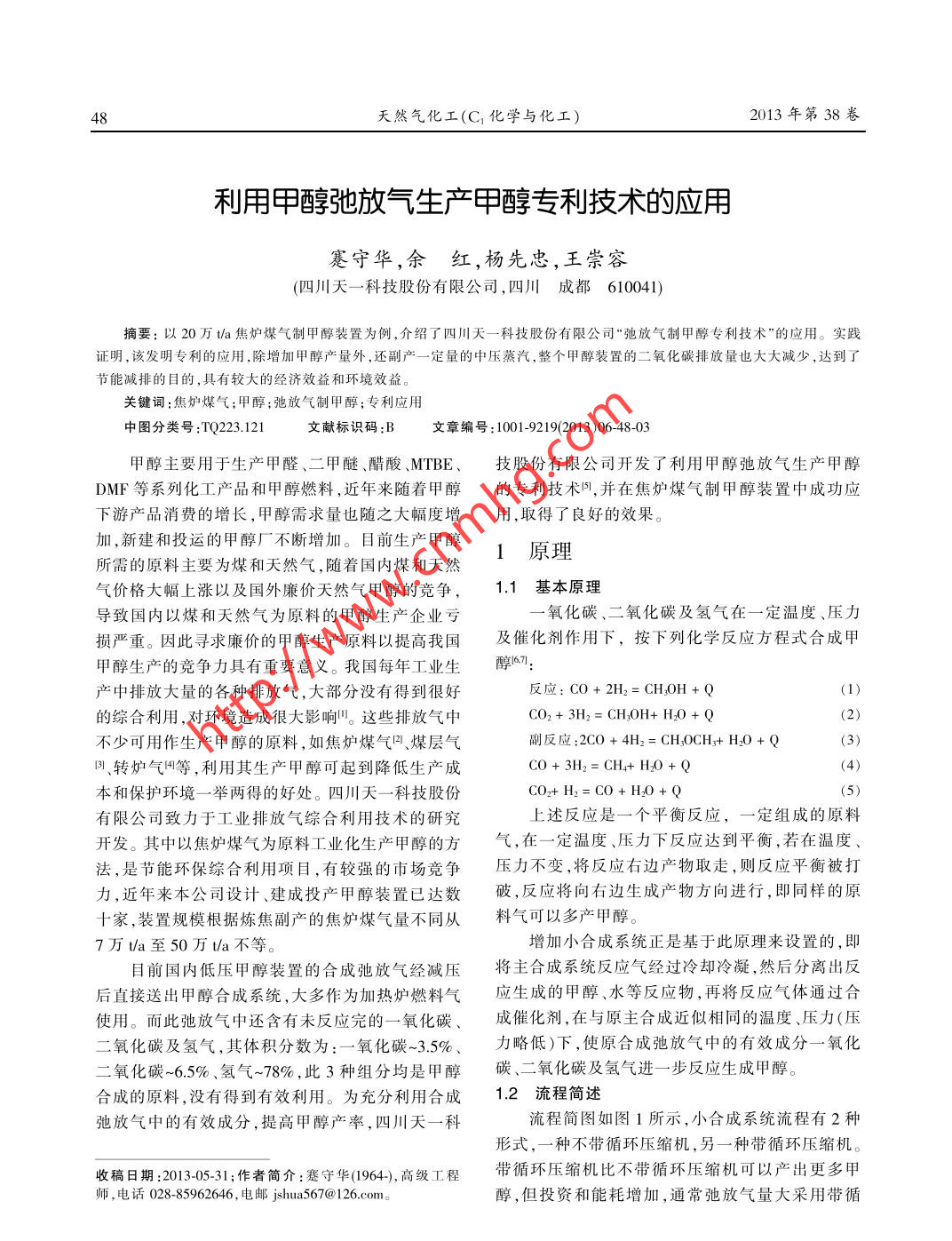 48天然氣化工(C1化學與化工)2013年第38卷利用甲醇弛放氣氣生產(chǎn)甲醇專利技術的應用蹇守華,余紅,楊先忠,王崇容(四川天- -科技股份有限公司,四川成都610041)摘要:以20萬ta焦爐煤氣制甲醇裝置為例,介紹了四川天一科技股份有限公司“弛放氣制甲醇專利技術”的應用。實踐證明,該發(fā)明專利的應用,除增加甲醇產(chǎn)量外,還副產(chǎn)一定量的中壓蒸汽,整個甲醇裝置的二氧化碳排放量也大大減少,達到了節(jié)能減排的目的,具有較大的經(jīng)濟效益和環(huán)境效益。關鍵詞:焦爐煤氣;甲醇;弛放氣制甲醇;專利應用中圖分類號:TQ223.121文獻標識碼:B文章編號: 1001-9219(2013 )06-48-03甲醇主要用于生產(chǎn)甲醛、二甲醚、醋酸、MTBE、技股份有限公司開發(fā)了利用甲醇弛放氣生產(chǎn)甲醇DMF等系列化工產(chǎn)品和甲醇燃料,近年來隨著甲醇的專利技術問,并在焦爐煤氣制甲醇裝置中成功應下游產(chǎn)品消費的增長,甲醇需求量也隨之大幅度增用,取得了良好的效果。加,新建和投運的甲醇廠不斷增加。目前生產(chǎn)甲醇1原理所需的原料主要為煤和天然氣,隨著國內(nèi)煤和天然氣價格大幅上漲以及國外廉價天然氣甲醇的競爭,1.1 基本原理導致國內(nèi)以煤和天然氣為原料的甲醇生產(chǎn)企業(yè)虧-氧化碳、二氧化碳及氫氣在一定溫度、壓力損嚴重。因此尋求廉價的甲醇生產(chǎn)原料以提高我國及催化劑作用下,按下列化學反應方程式合成甲甲醇生產(chǎn)的競爭力具有重要意義。我國每年工業(yè)生醇6]1產(chǎn)中排放大量的各種排放氣,大部分沒有得到很好反應: CO + 2H2= CH20H +Q .(1)的綜合利用,對環(huán)境造成很大影響"。這些排放氣中CO2+ 3H2= CH20H+ H20+Q(2)不少可用作生產(chǎn)甲醇的原料,如焦爐煤氣2煤層氣副反應:2C0 + 4H2= CH,OCH,+ H20+Q(3)B、轉(zhuǎn)爐氣④等,利用其生產(chǎn)甲醇可起到降低生產(chǎn)成CO + 3H2= CH4+ H2O +Q本和保護環(huán)境一舉兩得的好處。四川天-科技股份CO2+ H2=C0+ HO +Q(5)有限公司致力于工業(yè)排放氣綜合利用技術的研究上述反應是一個平衡反應,一定組成的原料開發(fā)。其中以焦爐煤氣為原料工業(yè)化生產(chǎn)甲醇的方氣,在一定溫度、壓力下反應達到平衡,若在溫度、法,是節(jié)能環(huán)保綜合利用項目,有較強的市場競爭壓力不變,將反應右邊產(chǎn)物取走,則反應平衡被打力,近年來本公司設計、建成投產(chǎn)甲醇裝置已達數(shù)破,反應將向右邊生成產(chǎn)物方向進行,即同樣的原十家,裝置規(guī)模根據(jù)煉焦副產(chǎn)的焦爐煤氣量不同從料氣可以多產(chǎn)甲醇。7萬t/a 至50萬t/a不等。增加小合成系統(tǒng)正是基于此原理來設置的,即目前國內(nèi)低壓甲醇裝置的合成弛放氣經(jīng)減壓將主合成系統(tǒng)反應氣經(jīng)過冷卻冷凝,然后分離出反后直接送出甲醇合成系統(tǒng),大多作為加熱爐燃料氣應生成的甲醇、水等反應物,再將反應氣體通過合使用。而此弛放氣中還含有未反應完的一氧化碳、成催化劑,在與原主合成近似相同的溫度、壓力(壓二氧化碳及氫氣,其體積分數(shù)為:一氧化碳~3.5%、力略低)下,使原合成弛放氣中的有效成分一氧化二氧化碳~6.5%、氫氣~78%,此3種組分均是甲醇碳、二氧化碳及氫氣進-步反應生成甲醇。合成的原料,沒有得到有效利用。為充分利用合成1.2 流程簡述弛放氣中的有效成分,提高甲醇產(chǎn)率,四川天一科流程簡圖如圖1所示,小合成系統(tǒng)流程有2種形式,一種不帶循環(huán)壓縮機,另一種帶循環(huán)壓縮機。收稿日期:2013-05-31;作者簡介:蹇守華(1964-),高級工程帶循環(huán)壓縮機比不帶循環(huán)壓縮機可以產(chǎn)出更多甲師,電話028-85962646,電郵jshua567@ 126.com。醇,但投資和能耗增加,通常弛放氣量大采用帶循第6期蹇守華等:利用甲醇弛放氣生產(chǎn)甲醇專利技術的應用.49瞧氣氣換熬暴一+ 合戚反虛暴t氣換戴器一-合成反應微去原甲峰發(fā)置網(wǎng)蒸精去廈甲畔裝置閃藏本爆一-甲鵬分耦L甲降分壽路非放氣去原能料氣管同| 循環(huán)伍綰機5循環(huán)士源燃料氣管阿著放氣(a)不帶循環(huán)出縮機(b) 帶循樸壓縮杠圖1弛放氣制甲醇技術流程圖環(huán)壓縮機流程。以下是不帶循環(huán)壓縮機流程簡述:示,其平均分子質(zhì)量29.03kg/kmol。從原甲醇裝置來的的弛放氣,壓力為原甲醇裝表3系統(tǒng)改造后增加的粗甲醇流量及組成置弛放氣壓力,溫度~40C,進入氣氣換熱器,與從細令C0CO:H CH4 N卻CH:0H HO HC0CHCH:OH總汁弛放氣合成出塔氣換熱,換熱后溫度為190~Qkmoh' 0.39 15.24 0.:7 0.76 1.01 0.01 913.55 2381.74.15 1206.59220C,然后進入弛放氣合成塔,合成氣出口溫度為i% 0.03 1.26 0.01 0.06 0.08 0.00 75.71 22.6? 0.14 0.01 10.0210C~250C,進人氣氣換熱器與弛放氣換熱,換熱后合成氣溫度為709C~100C,再經(jīng)水冷器冷卻到由表3可見,增加小合成后,粗甲醇產(chǎn)量增加40C,然后進人氣液分離器,分離出的含醇液體去原了1206.6kg/h, 經(jīng)精餾后可得精甲醇產(chǎn)品約895kg/h,甲醇裝置閃蒸槽,尾氣經(jīng)壓力控制后送出界外。年生產(chǎn)時間按8000h計,則每年可多產(chǎn)精甲醇產(chǎn)品約7160t。精甲醇按2500元/t計,年新增產(chǎn)值約2應用情況介紹1790萬元。本專利技術在某20萬t/a 以焦爐煤氣為原料新增合成塔副產(chǎn)飽和蒸汽流量~300kg/h,并人的甲醇裝置上進行了應用,應用情況如下。到原甲醇裝置副產(chǎn)蒸汽管網(wǎ