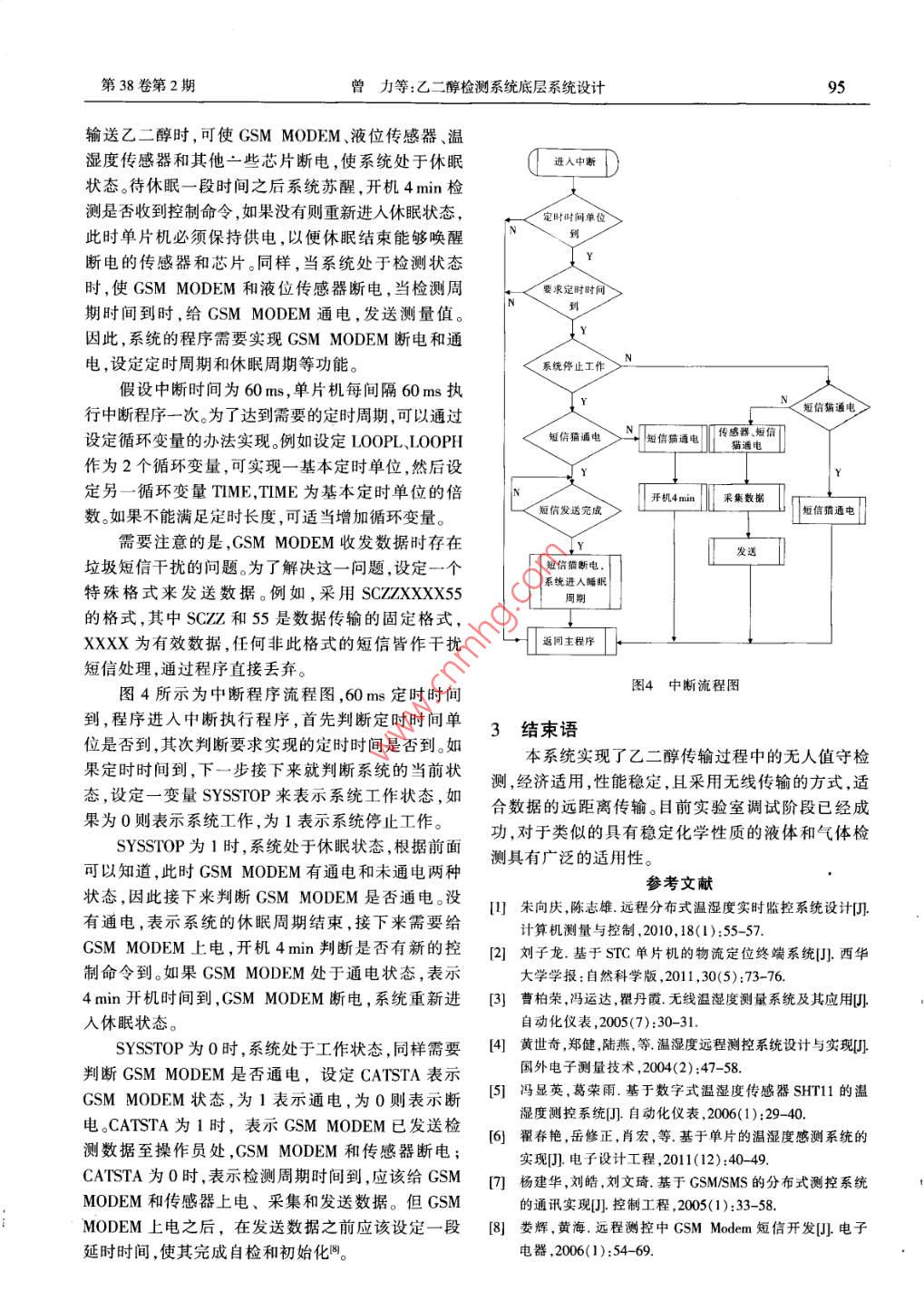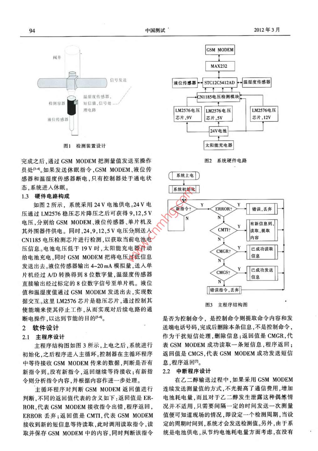第38卷第2期中國測試 Vol.38 No.22012年3月 CHINA MEASUREMENT TEST March,2012乙醇檢測系統(tǒng)底層系統(tǒng)設(shè)計曾力,黃劼,楊艷(四川大學制造學院,四川成都610065)摘要:管道輸送乙二醇時,需要檢測其是否泄露。采用液位傳感器測量乙二醇液位,同時根據(jù)乙二醇影響空氣溫度和濕度的性質(zhì),輔以溫濕度傳感器測量周圍空氣的溫度和濕度,采用 GSM MODEM進行無線傳輸實現(xiàn)數(shù)據(jù)交互,采用STC12C5412AD單片機作為系統(tǒng)的控制單元。實驗表明系統(tǒng)工作準確可靠,操作方便,對于檢測具有穩(wěn)定化學性質(zhì)的液體和氣體具有參考價值關(guān)鍵詞:傳感器;乙二醇泄漏檢測;溫濕度;管道運輸;系統(tǒng)休眠中圖分類號:TQ223162TM930.12文獻標志碼:A文章編號:1674-5124(2012)02-0093-03 Design underlying-system software for ethylene glycol detection system ZENG Li, HUANG Jie, YANG Yan (Manufacturing Science and Engineering School, Sichuan University, Chengdu 610065, China) Abstract: As it conveyed by the tunnel there needs to check whether it is leaking or not.In order to achieve the goal, it should be detected the level of ethylene glycol with level sensors. Then, as the humidity and temperature in air are influenced by ethylene glycol, they should be detected with corresponding sensors as an auxiliary way. The GSM MODEM is used to exchange data wirelessly and the microcomputer STCI2C5412AD is used as the controller for the system. Experimental results show that the system is accurate, reliable and convenient with reference value in detecting some kinds of liquid or gas with stable properties Key words: sensor; ethylene glycol-leaking detection; humidity and temperature; tunnel-transporting; system dormancy0引言溫濕度的測量采用SHT71型傳感器,該型號傳乙二醇是一種化學性質(zhì)穩(wěn)定的液體,要直接進感器輸出經(jīng)過標定的數(shù)字信號,通過PC總線與單片行檢測,手段比較復雜,費用較高,目前市面上的傳機實現(xiàn)通信液位傳感器采用LMP633系列纜式靜感器均難以滿足檢測需求,在無人值守的現(xiàn)場實現(xiàn)壓傳感器,測量范圍是0~1m,供電電壓12.5~36V,起來比較困難。因此,采用測量乙二醇液位的辦法,輸出信號4~20mA。同時針對乙二醇吸收水分和對溫度有影響的性質(zhì),1.2檢測裝置設(shè)計可以采用檢測乙二醇周圍空氣的溫度和濕度的辦法通常在管道的連接處發(fā)生泄露的幾率大于管道進行檢測,測量值通過 GSM MODEM實現(xiàn)傳輸-2其他部位,因此液位傳感器應該安裝在此處如圖1這種方式免去了鋪設(shè)大量通信電纜的工序,成本低所示,檢測容器與管道的連接處通過漏斗相連,一旦廉,穩(wěn)定性好,可節(jié)約大量人力物力資源。發(fā)生泄露,乙二醇通過漏斗進入容器內(nèi)。檢測容器應1硬件設(shè)計該盡量做到密封,防止其他液體進入容器影響測1.1硬件選擇量。液位傳感器安裝在檢測容器底部,溫濕度傳感系統(tǒng)控制器采用STC12C5410AD型單片機, GSM該器、 MODEM信號處理電路安裝在檢測容器壁型號帶有8路10位精度的ADC。上。系統(tǒng)上電之后,首先進行系統(tǒng)初始化,之后系統(tǒng)收稿日期:2011-08-29;收到修改稿日期:2011-11-04處于等待狀態(tài),此時可以發(fā)送檢測命令或者休眠命作者簡介:曾力(1982-),男,四川江油市人,碩士研究生,令。如果發(fā)送檢測命令,系統(tǒng)把液位傳感器和溫濕度專業(yè)方向為測試計量技術(shù)及儀器。傳感器測量值通過 GSM MODEM送至控制器,處理94中國測試2012年3月 GSM MODEM閥井 MAX232信號發(fā)送液位傳感器12C5412溫濕度傳感器溫濕度傳感器N1185電壓檢測模塊檢測容器短信貓信號處理電路LM2576電壓LM2576電壓LM2576電壓液位傳感器芯片,9V芯片,5V芯片,12V24V電池圖檢測裝置設(shè)計太陽能充電器完成之后,通過 GSM MODEM把測量值發(fā)送至操作圖2系統(tǒng)硬件電路員處13-4如果發(fā)送休眠指令, GSM MODEM、液位傳感器和溫濕度傳感器斷電,只有控制器處于通電狀系統(tǒng)上電態(tài),系統(tǒng)進入休眠。系統(tǒng)初始化1.3硬件電路構(gòu)成如圖2所示,系統(tǒng)采用24V電池供電。24V電新指令 ERROR?錯誤,丟棄壓通過LM2576穩(wěn)壓芯片降壓之后可獲得9,12,5V電壓,分別給 GSM MODEM、液位傳感器、單片機及有新信息到其外圍器件供電。同時,24,9,12,5V電壓分別送入mti?讀取提取CN1185電壓檢測芯片進行檢測,以獲取當前電池電內(nèi)容壓信息。電池電壓低于19V時,太陽能充電器自動c?成功讀取給電池充電,同時 GSM MODEM把將電壓過低信息信息發(fā)送出去。液位傳感器輸出4~20mA模擬量,送入單片機經(jīng)過A/D轉(zhuǎn)換得到8位數(shù)字量,溫濕度傳感器mS?成功發(fā)送信息直接輸出經(jīng)過標定的8位數(shù)字信號至單片機。液位值和溫濕度值通過 GSM MODEM發(fā)送出去,實現(xiàn)數(shù)錯誤指令丟棄據(jù)交互。這里LM2576芯片是穩(wěn)壓芯片,通過控制其圖3主程序結(jié)構(gòu)圖使能端來使其停止工作,從而實現(xiàn)對后續(xù)電路的通斷電操作,以達到節(jié)能的目的5是否為控制命令,是控制命令則提取命令內(nèi)容和發(fā)2軟件設(shè)計送端電話號碼,完成后刪除本條信息,不是控制命令,2.1主程序設(shè)計作為干擾短信處理,刪除信息;返回值是CMGR,代主程序結(jié)構(gòu)圖如圖3所示,上電之后,系統(tǒng)進行表 GSM MODEM成功讀取一條短信息,程序返回;初始化之后程序進入主循環(huán)控制器在主循環(huán)程序返回值是CMGS,代表 GSM MODEM成功發