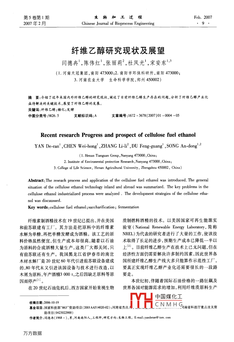 第5卷第1期生物加工過程Feb.20072007年2月Chinese Journal of Bioprocess Engineerin纖維乙醇研究現(xiàn)狀及展望閆德冉,陳偉紅,張麗莉2,杜風(fēng)光!,宋安東(1.河南天冠集團(tuán),南陽(yáng)473000;2.南陽(yáng)市環(huán)??蒲兴?南陽(yáng)473000;3.河南農(nóng)業(yè)大學(xué)生命科學(xué)學(xué)院,鄭州450002)摘要:介紹了近年來國(guó)內(nèi)外纖維乙醇的研究現(xiàn)狀,闡述了目前纖維乙醇生產(chǎn)存在的問題,分析了纖維乙醇產(chǎn)業(yè)化亟待解決的關(guān)鍵技術(shù),展望了纖維乙醇的發(fā)展關(guān)鍵詞:纖維乙醇;糖化;發(fā)酵中圖分類號(hào):S826.5文獻(xiàn)標(biāo)識(shí)碼:A文章編號(hào):1672-3678(2007)01-0004-05Recent research Progress and prospect of cellulose fuel ethanolYAN De-ran', CHEN Wei-hong, ZHANG Li-1i, DU Feng-guang, SONG An-dong(1. Henan Tianguan Group, Nanyang 473000, China2. Institute of Enviromental protection Research, Nanyang 473000, China;3. College of Life Science, Henan Agricultural University, Zhengzhou 450002, China)Abstract The reseach process and application of the cellulose fuel ethanol was introduced. The generalsituation of the cellulose ethanol technology inland and abroad was summarized. The key problems in thecellulose ethanol industrialized process were analyzed. The development strategies of the cellulose ethawasKey words: cellulose fuel ethanol; saccharification; fermentation纖維素制酒精技術(shù)在19世紀(jì)已提出,并在美國(guó)質(zhì)制燃料酒精的技術(shù)。以美國(guó)國(guó)家可再生能源實(shí)和前蘇聯(lián)建有工廠。其方法是把原料中的纖維素驗(yàn)室( National Renewable Energy Laboratory,簡(jiǎn)稱水解為單糖,再把單糖發(fā)酵成為酒精。該工藝的原NREL)為代表的研究者進(jìn)行了大量的工作,使該技料價(jià)格雖然便宜,但生產(chǎn)成本卻很高,隨著以石油術(shù)取得了長(zhǎng)足的進(jìn)步,預(yù)期生產(chǎn)成本已降低一半以為原料的合成酒精大量生產(chǎn),這類廠大都關(guān)閉,只上(。目前纖維乙醇生產(chǎn)在技術(shù)上已無問題,但在有前蘇聯(lián)還有生產(chǎn)。我國(guó)黑龍江省伊春市的南岔經(jīng)濟(jì)性方面仍需要解決許多制約因素因此世界各木材水解廠是20世紀(jì)60年代引進(jìn)前蘇聯(lián)設(shè)備建成國(guó)所建纖維乙醇生產(chǎn)線大多只能算作示范性工廠,的80年代末又引進(jìn)該國(guó)設(shè)備與技術(shù)進(jìn)行改造,以要真正實(shí)現(xiàn)纖維乙醇產(chǎn)業(yè)化還需要很長(zhǎng)的一段路木屑為原料,年產(chǎn)酒精3000t,之后因缺乏原料等原要走。因而停產(chǎn)。本世紀(jì)初,伴隨著國(guó)際石油價(jià)格的一路狂飆及在20世紀(jì)石油危機(jī)后,西方國(guó)家開始重視生物世界各國(guó)對(duì)能源需求的增加,利用纖維質(zhì)原料生產(chǎn)中國(guó)煤化工收稿日期:2006-1019THSCNMH基金項(xiàng)目:國(guó)家科技部“863”資助項(xiàng)目(200AA5140202);河南省杰出可南省科技廳重點(diǎn)攻關(guān)資助項(xiàng)目(0423022900)作者簡(jiǎn)介:閏德冉(1968-),男,河南南陽(yáng)人,工程師,研究方向:生物工程。E-mail;bandera@uom.com·10生物加工過程第5卷第1期乙醇工藝的研究和開發(fā)成為目前國(guó)內(nèi)外研究的重蒸發(fā)器濃縮至糖質(zhì)量分?jǐn)?shù)為11%再進(jìn)行發(fā)酵。點(diǎn),如何開發(fā)高效廉價(jià)的纖維質(zhì)原料預(yù)處理技術(shù)、為了降低纖維酒精的生產(chǎn)成本,美國(guó) Novozymes選育誘變產(chǎn)高酶活的纖維素酶生產(chǎn)菌株、構(gòu)筑能同公司和美國(guó)NREL合作開發(fā)的生物基乙醇燃料項(xiàng)目化五碳糖的酵母菌株以及實(shí)現(xiàn)相對(duì)高濃度發(fā)酵等獲重大進(jìn)展,將生產(chǎn)1L燃料乙醇所需纖維素酶的是降低纖維乙醇成本的關(guān)鍵。國(guó)外在這方面做成本從最初超過1.32美元的水平大幅減少至當(dāng)前了大量的研究工作,并建起了一定規(guī)模的中試生產(chǎn)的低于13.2美分。 Novozymes公司和NREL下一步廠。我國(guó)在“十五”期間已將纖維乙醇研究工作提將努力降低纖維素酶的生產(chǎn)成本,目標(biāo)是在未來的上日程,并在國(guó)家“863”計(jì)劃中作為研究課題進(jìn)行兩年中把生產(chǎn)1L燃料乙醇所需纖維素酶的成本降重點(diǎn)攻關(guān),國(guó)內(nèi)的河南天冠、安徽豐原和河北唐山低至265美分6。另外,美國(guó)普度大學(xué)的何汪媛教的太博爾等企業(yè)也在進(jìn)行這方面的研究工作。授利用基因工程技術(shù)構(gòu)建了可發(fā)酵戊碳糖的酵母菌株,為半纖維素的酒精轉(zhuǎn)化奠定了基礎(chǔ)1國(guó)外纖維乙醇研究的現(xiàn)狀近年來,隨著纖維乙醇技術(shù)的快速發(fā)展,歐美國(guó)家的一些大公司已決定建造較大規(guī)模的工廠纖維乙醇的生產(chǎn)包括酸水解和酶水解兩種工 BC International公司計(jì)劃投資9000萬(wàn)美元(其中能藝。酸水解生產(chǎn)工藝最具代表性的是前蘇聯(lián)的連源部投資1100萬(wàn)美元),將一個(gè)閑置的煉油廠改造續(xù)滲濾水解流程、美國(guó) Vulcan化工公司與加拿大的成年產(chǎn)燃料酒精7600萬(wàn)L的生產(chǎn)廠。該廠以甘蔗Stake公司聯(lián)合研制的 Vulcan- Stake流程。連續(xù)滲殘?jiān)鼮樵?釆用稀硫酸水解,其核心技術(shù)是轉(zhuǎn)基濾水解流程是前蘇聯(lián)木材水解制造酒精的主要工因的E.coli(由佛羅里達(dá)大學(xué)開發(fā)),該菌