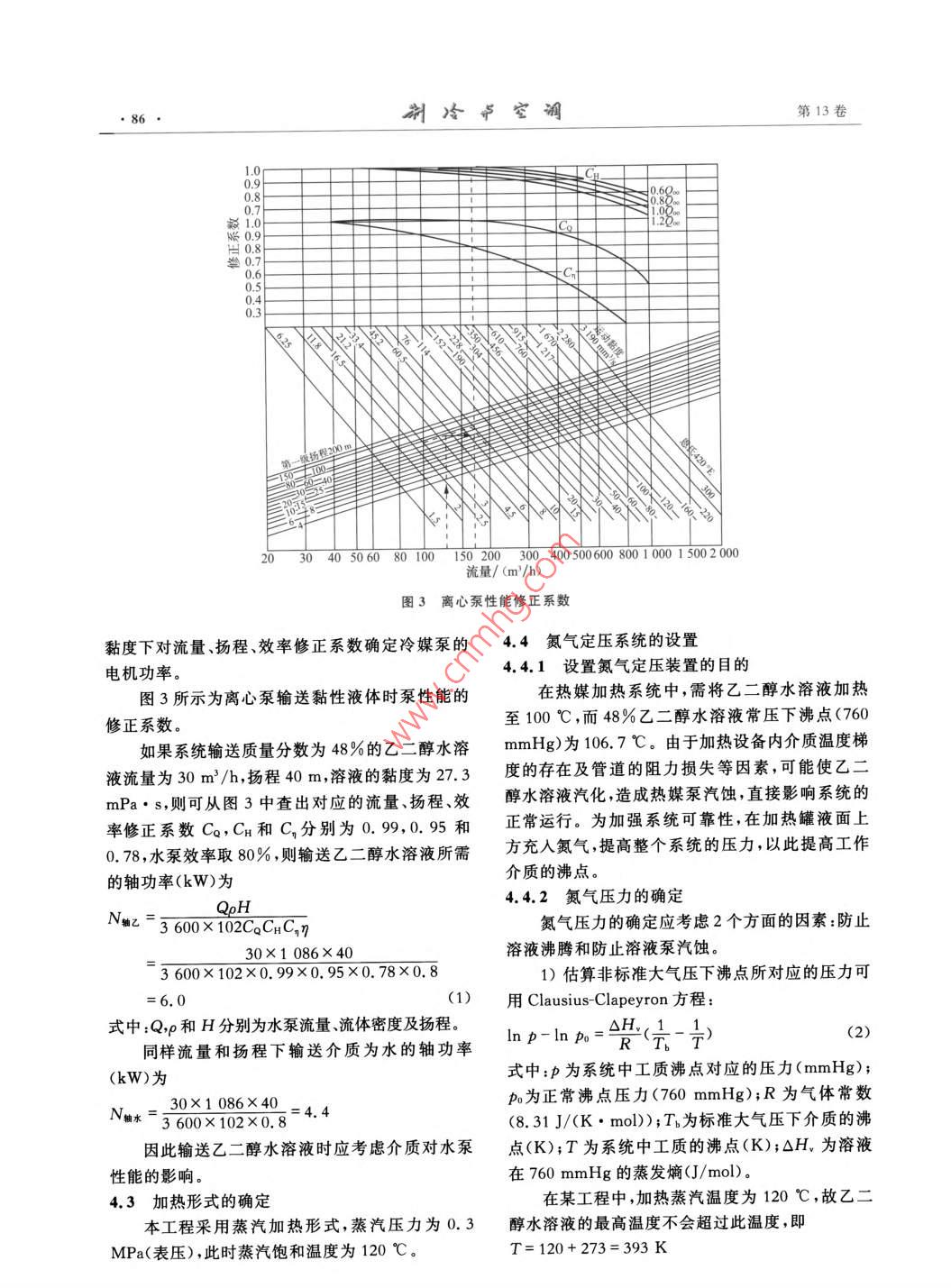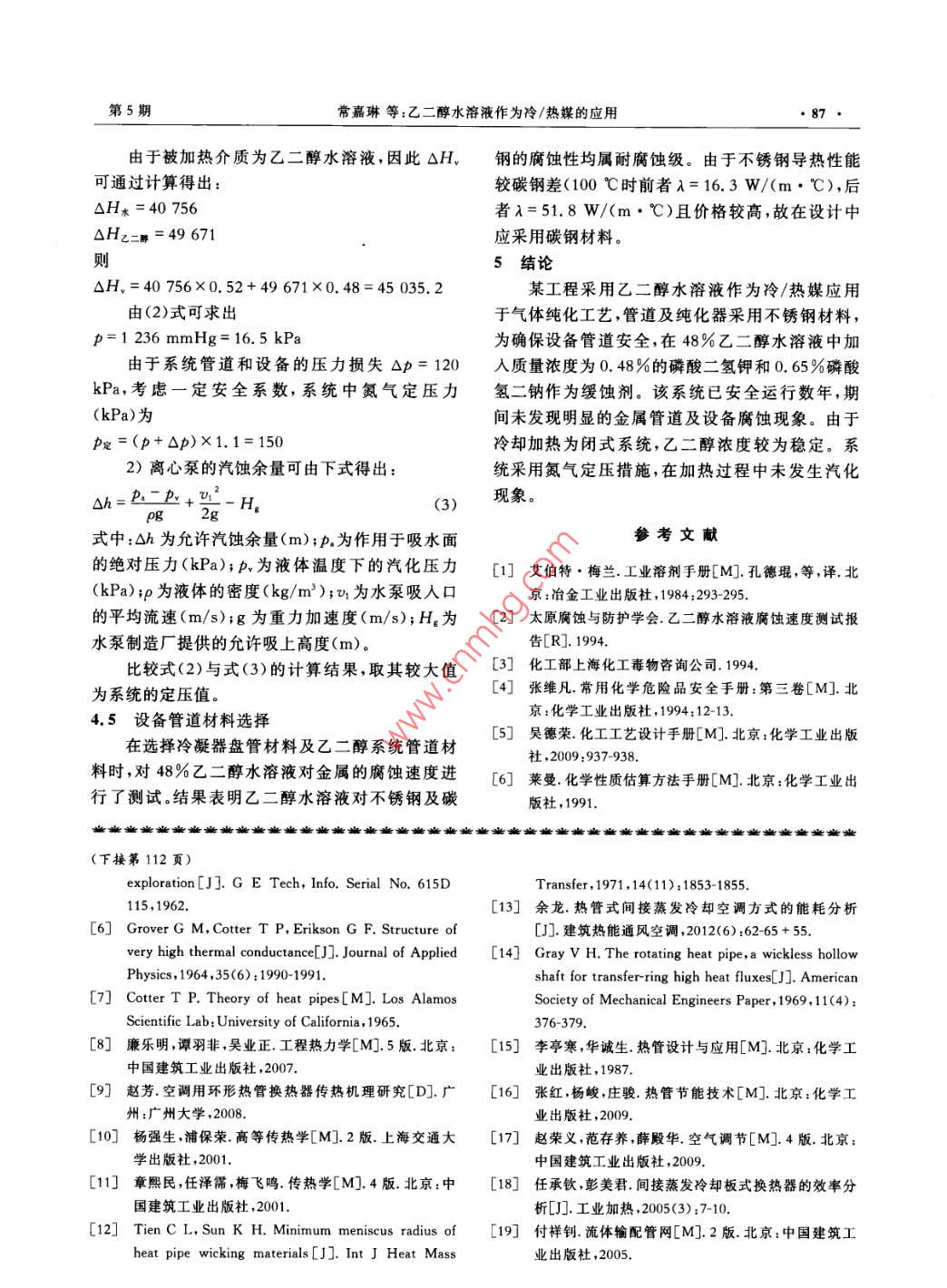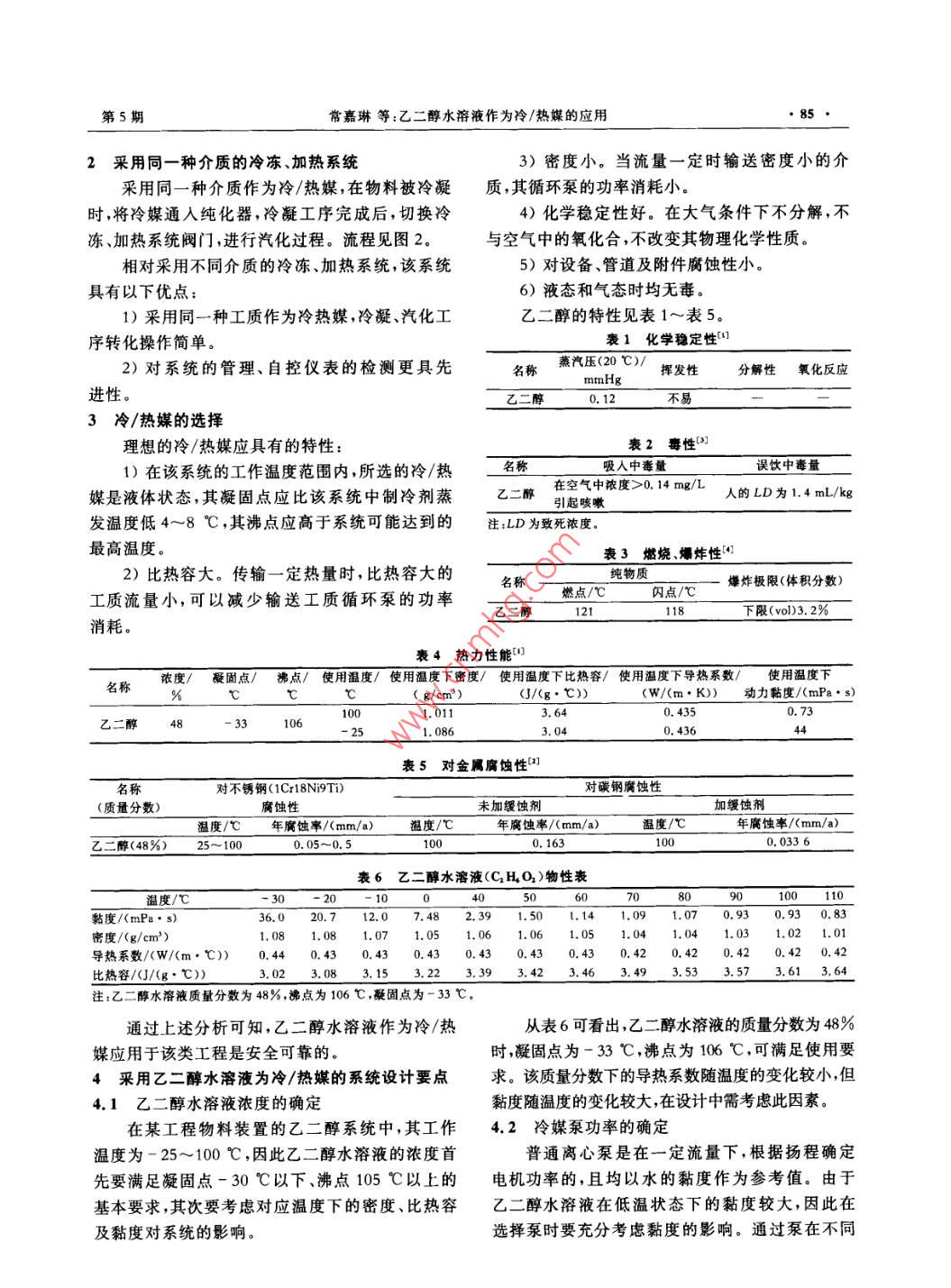 第13卷第5期2013年6月REFRIGERATION AND AIR-CONDITIONING84-87乙二醇水溶液作為冷/熱媒的應(yīng)用常嘉琳唐培亮(深圳市建筑設(shè)計研究總院有限公司)摘要化工生產(chǎn)物料純化工藝需采用冷/熱媒分階段對物料進(jìn)行冷凝、汽化。采用安全可靠、熱力性能滿足使用要求的介質(zhì)是提高生產(chǎn)效率、保證物料質(zhì)量的重要環(huán)節(jié)。本文介紹乙二醇水溶液作為冷/熱媒在物料純化過程中的應(yīng)用關(guān)鍵詞乙二醇水溶液;冷/熱媒;物料純化Application of glycol solution as cooling heating mediumChang Jialin Tang Peiliang(Shenzhen Architecture Design and Research Institute Co. LtdaBSTRact The cooling heating medium is adopted for condensation and gasificationin the material purification process. The medium with safety, reliability and required ther-mal performance is important to improve the productivity and secure the quality. The ap-plication of the glycol solution as cooling heating medium in the material purification isdescribedKEY WORDS glycol solution; cooling heating medium; material purification1我國現(xiàn)有物料純化工藝的冷凍、加熱系統(tǒng)蒸汽在我國一些化工企業(yè)中,物料純化工藝通常采用鹽水冷卻、蒸汽加熱流程(見圖1)。純化器)冷媒網(wǎng))物料冷凝時,將鹽水通人純化器,不斷循環(huán)冷媒泵壓縮待冷凝工序完成后,為將冷凝器盤管內(nèi)殘留的鹽空氣水排人冷凍系統(tǒng),須用壓縮空氣將鹽水排入排液制冷機(jī)組箱,再經(jīng)排液泵注入系統(tǒng)排液箱當(dāng)物料被汽化時,將蒸汽通入純化器盤管,待排液泵汽化過程完成后,再用壓縮空氣將盤管中的凝結(jié)排入下水管水吹掃干凈,以防止鹽水通入時濃度變化引起凝圖1蕪汽(熱媒)鹽水(冷媒)系統(tǒng)流程固點改變。該流程存在以下不足:1)由于冷卻介質(zhì)(冷媒)采用了鹽水,而鹽水對金屬的腐蝕性較強(qiáng)(溫度≤80℃,年腐蝕率為純化器)口(冷媒罐)0.05~0.5mm/a),因此設(shè)備和管道有被腐蝕而發(fā)冷媒泵生泄漏事故的可能性。為防止事故發(fā)生,必須增加設(shè)備和管道的壁厚,工程造價提高。2)由于加熱和冷卻采用不同工質(zhì),在冷熱媒罐)⊙制冷機(jī)組)熱媒泵凝、汽化工序轉(zhuǎn)換時操作程序復(fù)雜,工作周期圖2冷/熱媒采用同一介質(zhì)的系統(tǒng)流程圖延長。收稿日期:2012-10-30作者簡介:常嘉琳,本科,高級工程師,副總工程師,主要研究方向為制冷和暖通第5期常嘉琳等:乙二醇水溶液作為冷/熱媒的應(yīng)用852采用同一種介質(zhì)的冷凍、加熱系統(tǒng)3)密度小。當(dāng)流量一定時輸送密度小的介釆用同一種介質(zhì)作為冷/熱媒,在物料被冷凝質(zhì),其循環(huán)泵的功率消耗小時,將冷媒通入純化器,冷凝工序完成后,切換冷4)化學(xué)穩(wěn)定性好。在大氣條件下不分解,不凍、加熱系統(tǒng)閥門,進(jìn)行汽化過程。流程見圖2。與空氣中的氧化合,不改變其物理化學(xué)性質(zhì)相對采用不同介質(zhì)的冷凍、加熱系統(tǒng),該系統(tǒng)5)對設(shè)備、管道及附件腐蝕性小。具有以下優(yōu)點6)液態(tài)和氣態(tài)時均無毒1)采用同一種工質(zhì)作為冷熱媒,冷凝、汽化工乙二醇的特性見表1~表5。序轉(zhuǎn)化操作簡單。表1化學(xué)穩(wěn)定性2)對系統(tǒng)的管理、自控儀表的檢測更具先名稱燕汽壓(20℃)/揮發(fā)性分解性氧化反應(yīng)進(jìn)性。乙二醇不易3冷/熱媒的選擇1)在該系統(tǒng)的工作溫度范圍內(nèi),所選的冷/熱名稱吸人理想的冷/熱媒應(yīng)具有的特性:誤飲中毒量在空氣中濃度>0.14mg幾L媒是液體狀態(tài),其凝固點應(yīng)比該系統(tǒng)中制冷劑蒸乙醉引起咳嗽人的LD為1.4mL/kg最高溫度。表3燃燒爆炸性2)比熱容大。傳輸一定熱量時,比熱容大的名稱純物質(zhì)爆炸極限(體積分?jǐn)?shù))工質(zhì)流量小,可以減少輸送工質(zhì)循環(huán)泵的功率燃點/℃閃點/℃乙二醇118下限(vol)3.2%消耗表4熱力性能,濃度/凝固點/沸點/使用溫度/使用溫度下密度/使用溫度下比熱容/使用溫度下導(dǎo)熱系數(shù)/使用溫度下%(J/(g·℃))(W/(m·K))動力黏度/(mPa·s)3.640.435乙二醇481061.0863.040.436表5對金屬腐蝕性名稱對不銹鋼(1C18N9T對碳鋼腐蝕性(質(zhì)量分?jǐn)?shù))腐蝕性未加緩蝕劑加緩蝕劑溫度/℃年腐蝕率/(mm/a)溫度/℃年腐蝕率/(mm/a)溫度/℃年腐蝕率/(mm/a二醇(48%)25~1000.05~0.50.1631000.0336表6乙二醇水溶液(C1HO2)物性表溫度/℃10黏度/(mPa·s)20.712.07.482.391.501.141.091.07密度/(g/cm3)1.081.081.071.051.061.061.051.041.041.031.021.01導(dǎo)熱系數(shù)/(W/(m·℃))0.440.430.430.43430.430.430.420.420.420.420.42比熱容/(J/(g·℃))3.023.083.153.223.393.423.463.493.533.573.613.64注:乙二醇水溶液質(zhì)量分?jǐn)?shù)為48%,沸點為106℃,凝固點為-33℃通過上述分析可知,乙二醇水溶液作為冷/熱從表6可看出,乙二醇水溶液的質(zhì)量分?jǐn)?shù)為48%媒應(yīng)用于該類工程是安全可靠的。時,凝固點為-33℃,沸點為106℃,可滿足使用要4采用乙二醇水溶液為冷/熱媒的系統(tǒng)設(shè)計要點求。該質(zhì)量分?jǐn)?shù)下的導(dǎo)熱系數(shù)隨溫度的變化較小,但4.1乙二醇水溶液濃度的確定黏度隨溫度的變化較大,在設(shè)計中需考慮此因素。在某工程物料裝置的乙二醇系統(tǒng)中,其工作4.2冷媒泵功率的確定溫度為-25~100℃,因此乙二醇水溶液的濃度首普通離心泵是在一定流量下,根據(jù)揚程確定先要滿足凝固點-30℃以下、沸點105℃以上的電