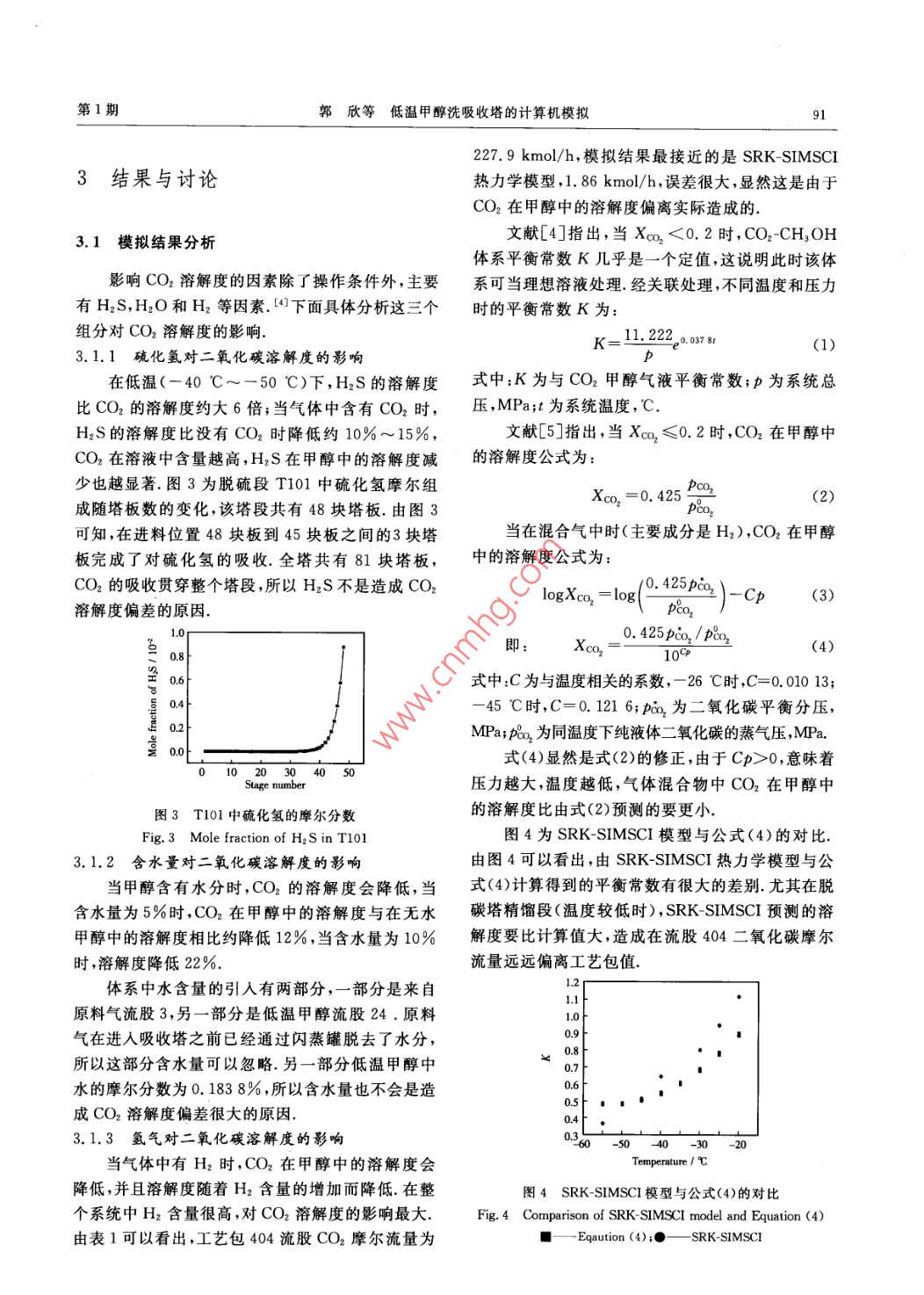 第36卷第1期煤炭轉(zhuǎn)化Vol 36 No. 12013年1月COAL CONVERSIONJan.2013低溫甲醇洗吸收塔的計(jì)算機(jī)模擬郭欣)李金來(lái)?)李士雨3)韓艷霞)摘要應(yīng)用PRO/Ⅱ工程模擬軟件對(duì)某60萬(wàn)t/a煤氣化制甲醇項(xiàng)目低溫甲醇洗酸性氣體吸收塔進(jìn)行了模擬,通過(guò)對(duì)比不同熱力學(xué)模型的模擬結(jié)果,明確了H2CO2℃H3OH三元體系偏離高壓和低溫條件下的氣液平衡是模擬誤差較大的原因.將修正后的 SRK-SIMSCI熱力學(xué)模型用于吸收塔的計(jì)算,結(jié)果表明,該模型能夠較好地反映該工藝裝置的實(shí)際操作狀況關(guān)鍵詞煤氣凈化,低溫甲醇洗,過(guò)程模擬中圖分類號(hào)TQ546.5,TQ223.12+1,TQ0180引言低溫甲醇洗( rectisol)是一種典型的酸性氣體凈化工藝,利用甲醇在低溫下對(duì)CO2和H2S有很大E100溶解度的特性,可以脫除系統(tǒng)中的酸性氣體,具有選T擇性好溶劑消耗少和能耗低等顯著特點(diǎn).但由于該體系各組分沸點(diǎn)差距較大,壓力變化較大,又同時(shí)含有非極性和極性締合組分和量子氣體氫,一般工程模擬軟件內(nèi)置熱力學(xué)模型如果不加修正,都不能得到令人滿意的模擬結(jié)果.本研究以國(guó)內(nèi)某60萬(wàn)t/a煤氣化制甲醇項(xiàng)目為背景,采用修正后圖1酸性氣體吸收塔流程的 SRK-SIMSCI熱力學(xué)模型,建立了低溫甲醇洗Fig. 1 Flowsheet of acidic gas absorption column吸收塔的過(guò)程模型,模擬結(jié)果與工藝包數(shù)據(jù)吻合低溫甲醇洗是一種典型的物理吸收過(guò)程,分子較好,可以為低溫甲醇洗的擴(kuò)產(chǎn)、改造和節(jié)能潛力間的作用力為范德華力在吸收過(guò)程中氣液平衡開(kāi)分析提供數(shù)據(jù)支持始時(shí)符合亨利定律,溶液中被吸收組分的含量與其氣相分壓成正比酸性氣體在甲醇中的吸收與有用氣體1低溫甲醇洗流程的解析都是以各種氣體在甲醇中的溶解度為基礎(chǔ).來(lái)自變換工段的變換氣,經(jīng)過(guò)冷卻、干燥之后低溫甲醇洗體系可以同時(shí)脫除原料氣中的(流股3)進(jìn)入吸收塔T100吸收塔分為上、下兩部H2S,COS,RSH,CO2,HCN,NH3和NO以及石蠟分,下塔主要用于脫硫,上塔主要用于脫碳.由于烴、芳香烴和粗汽油等組分,并且可以脫水使氣體O2在甲醇中的溶解度遠(yuǎn)小于H2S的溶解度,故下徹底干燥;所損耗的有用組分可以在甲醇再生過(guò)塔僅需上塔已經(jīng)吸收了部分CO2的甲醇液總量的程中回收;凈化程度高,凈化氣中總硫含量可以脫48%(流股28)不含硫的甲醇富液(流股25)去往解至0.1×10-6以下;H2S和CO2可以在同一個(gè)設(shè)備析塔頂部,確保離開(kāi)塔的產(chǎn)品中總硫含量≤5×的不同部位分別吸收,在不同設(shè)備和不同條件下10-6·上塔又分為三段:頂段為精吸段,用低溫甲醇解析(流股24)吸收氣體中尚存的CO2和H2S,確保下游低溫甲醇洗酸性氣體吸收塔流程見(jiàn)圖1的凈化氣中CO2的摩爾分?jǐn)?shù)≤3%,總硫的摩爾分1)碩士生;2)教授級(jí)高級(jí)工程師、碩士生導(dǎo)師河北工業(yè)大學(xué),300130天津;新奧科技發(fā)展有限公司,065001河北廊坊;3)教授、碩士生導(dǎo)師,天津大學(xué)化工學(xué)院,300072天津;4)工程師,新奧科技發(fā)展有限公司,065001河北廊坊收稿日期:2012-06-06;修回日期:2012-09-07煤炭轉(zhuǎn)化2013年數(shù)<0.1×10-6;中間兩段為CO2主吸段和粗吸段,性和非極性混合物以及輕氣體圖2為低溫甲醇洗甲醇吸收CO2需要放出大量的熱,為了移除這部分酸性氣體吸收塔模擬流程.溶解熱,在上塔中部抽出甲醇富液(流股30,流股31),經(jīng)過(guò)甲醇激冷器E100和循環(huán)甲醇冷卻器E108進(jìn)行換熱和氨冷,使甲醇維持較大的吸收能力2物性方程T103低溫甲醇洗體系同時(shí)包含非極性極性締合組分和量子氣體氫氣等十幾個(gè)組分,溶質(zhì)之間相互影響較復(fù)雜,且在一定操作條件下一部分組分處于超臨界狀T102態(tài),所以熱力學(xué)模型的選擇成為了流程模擬中的關(guān)鍵張述偉等口專為低溫甲醇洗開(kāi)發(fā)出了流程模擬上軟件RPS( rectisol process simulator).熱力學(xué)模型庫(kù)中存放了包括計(jì)算汽液相逸度與焓的PR方程馬丁侯方程和 Lee-Kesler狀態(tài)方程.肖珍平等3從圖2酸性氣體吸收塔模擬流程氣體溶解度和氣液平衡數(shù)據(jù)回歸了所有組分的相互Fig 2 Flowsheet of acidic gas absorption column作用參數(shù),擬合獲得了45對(duì)活度系數(shù)模型參數(shù),利用不同熱力學(xué)模型對(duì)酸性氣體吸收塔進(jìn)行模用SRK立方型狀態(tài)方程,結(jié)合 Huron-Vidal混合規(guī)擬在T101脫硫段SRK- SIMSCI與PSRK模型的則和非隨機(jī)流雙流體 Non- Random- Two- Liquid活度模擬結(jié)果與工藝包數(shù)據(jù)比較接近,摩爾流量、摩爾組系數(shù)模型建立了低溫甲醇洗脫碳工藝的過(guò)程模型成、溫度和壓力的預(yù)測(cè)相對(duì)誤差都在1%內(nèi).但在脫本研究選擇了 Aspen Plus工程模擬軟件中的碳段(T102,T103和T104)對(duì)流股402,流股403和熱力學(xué)模型:PSRK, RK-ASPEN, SR-POLAR,流股404的預(yù)測(cè)相對(duì)誤差逐漸擴(kuò)大.表1為吸收塔PRMHV2和PRO/I軟件中的 SRK-SIMSCI對(duì)低熱力學(xué)模型的篩選結(jié)果由表1可知,五種熱力學(xué)模溫甲醇洗吸收塔進(jìn)行了模擬 SRK-SIMSCI熱力學(xué)型對(duì)于二氧化碳溶解度的預(yù)測(cè)誤差都比較大,而對(duì)模型彌補(bǔ)了PR型狀態(tài)方程混合規(guī)則的